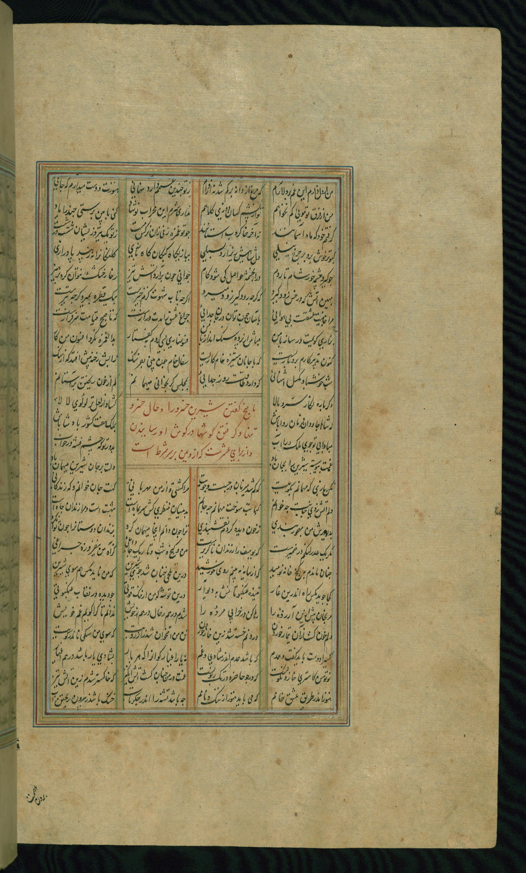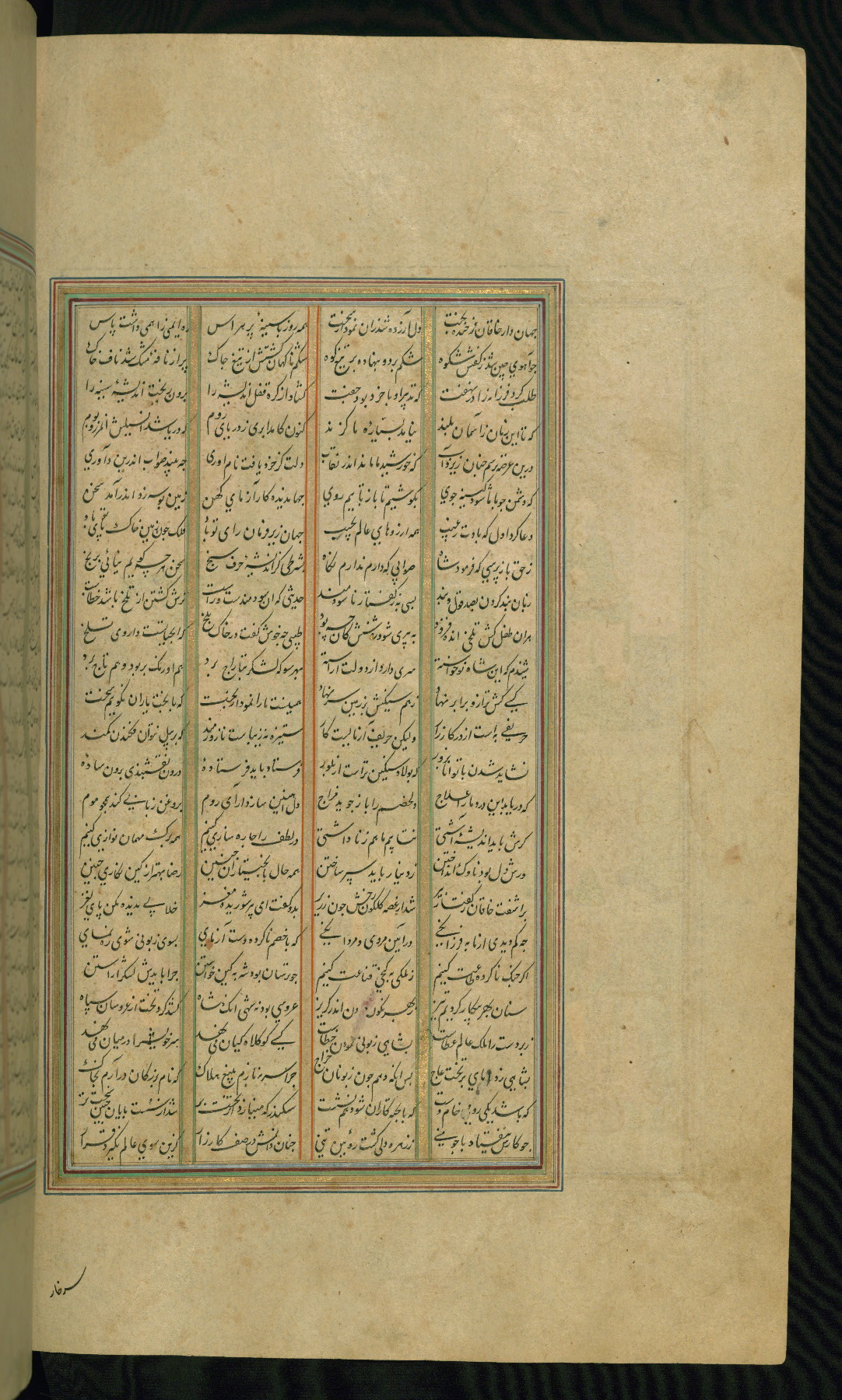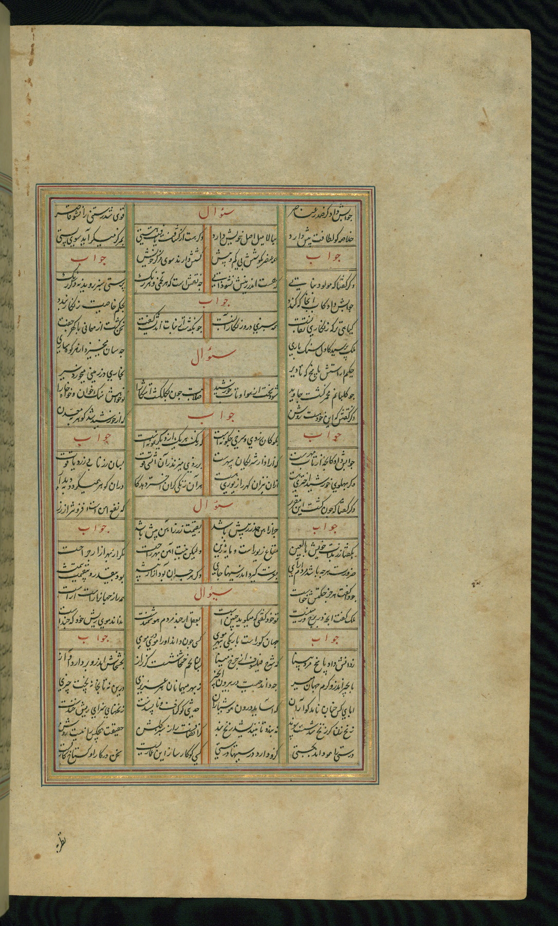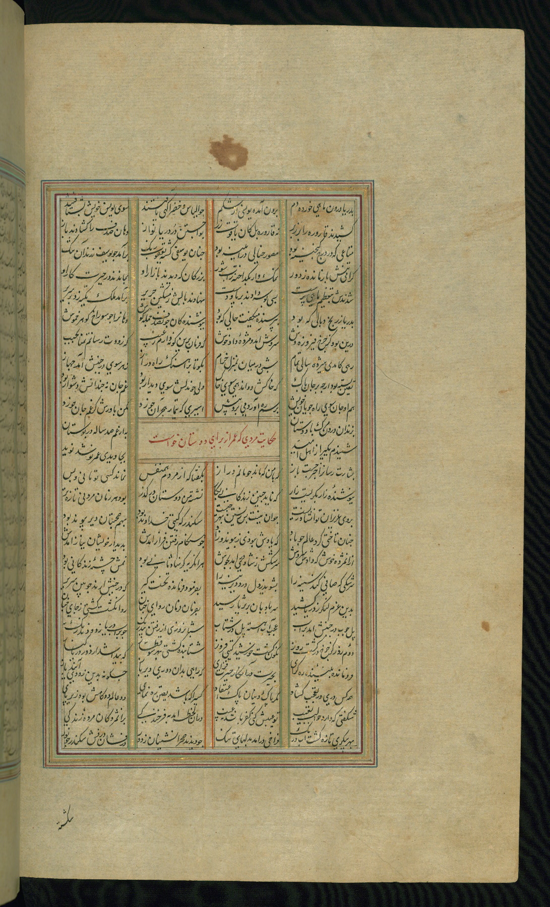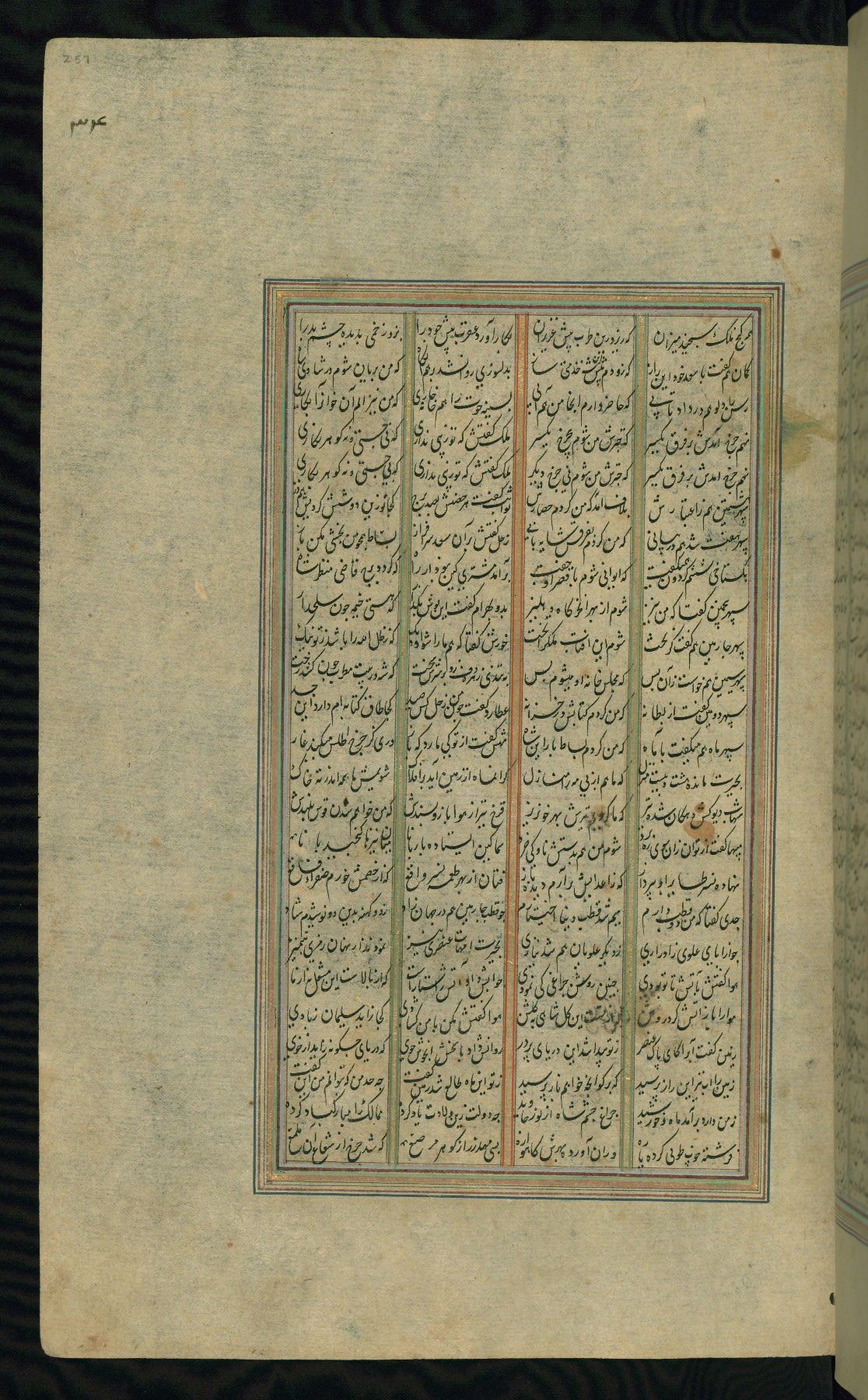 This illuminated and illustrated manuscript contains the Khamsah (quintet) and two historical poems (masnavi), Qirān-i saʿdayn and Nuh sipihr, by Amīr Khusraw Dihlavī (d. 725 AH / 1325 CE). The codex is dated 1017 AH / 1609 CE and was produced in Safavid Iran. All texts are written in black nastaʿlīq script with chapter headings in red. The manuscript opens with an illuminated and illustrated frontispiece of a hunting and court scene in the early Safavid style (fols. 1b-2a). The first text is Khamsah-i Dihlavī (fols. 2b-192a), which is introduced by an illuminated incipit and titlepiece with the title of the first poem of the quintet and the author's name. The second text is Qirān-i saʿdayn, a historical poem (masnavi) about the meeting of Sultan Muʿizz al-Dīn Kayqubād and his father, Nāṣir al-Din Bughrā Khān, on the banks of the Sarjū in Oudh. It is also introduced with an illuminated incipit and titlepiece (fol. 193b). The third text is Nuh sipihr, a historical poem (masnavi) describing the glories of Sultan Quṭb al-Dīn Mubārak Shāh Khaljī’s time, introduced with an illuminated incipit and headpiece (fol. 223b). The dark brown leather binding is original to the manuscript.