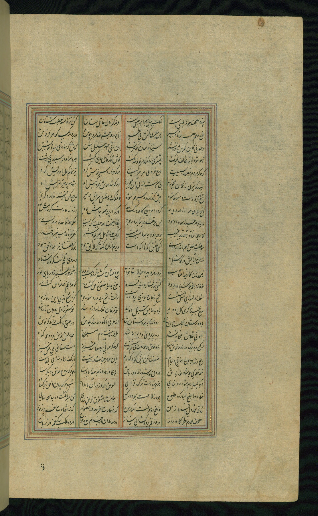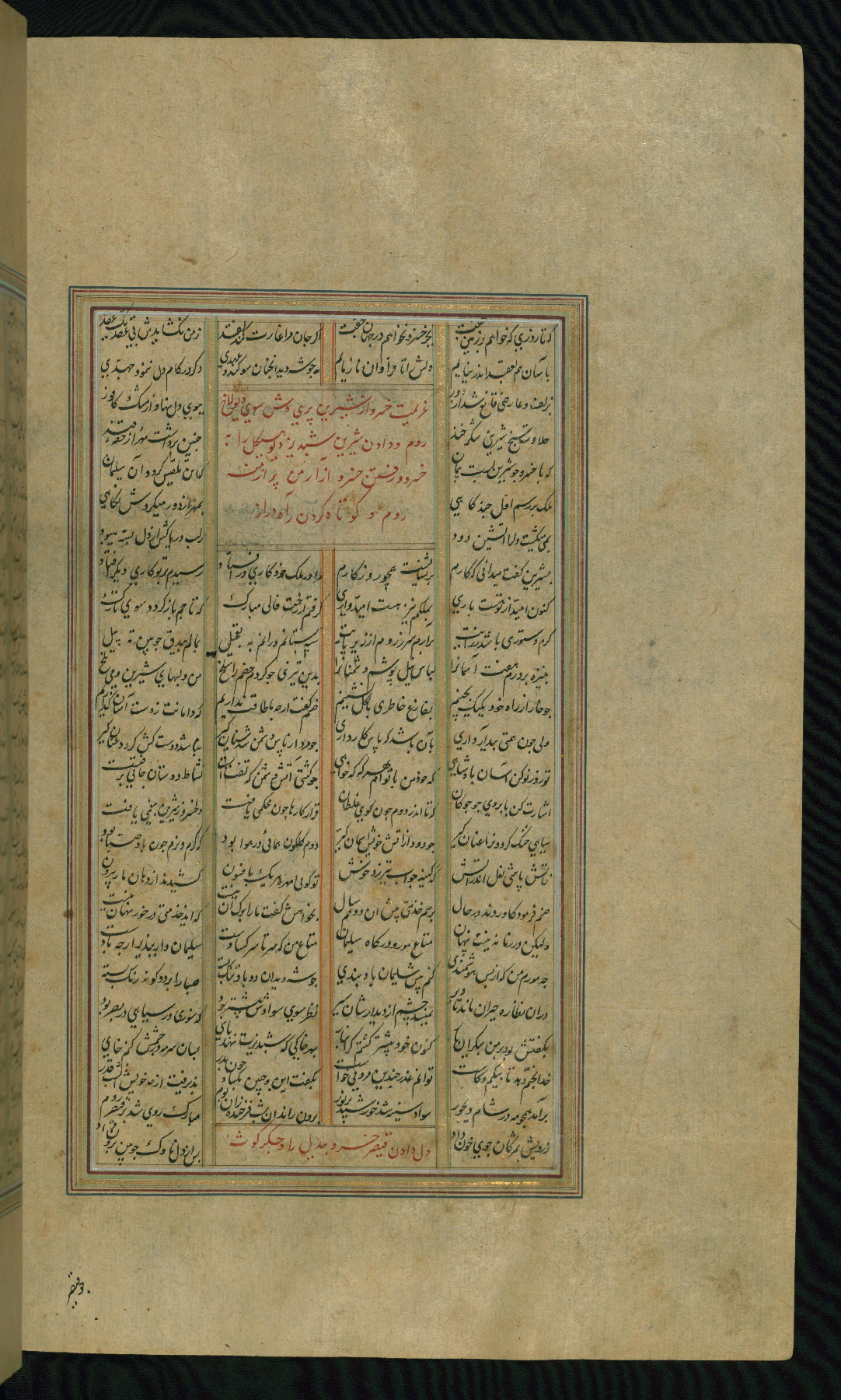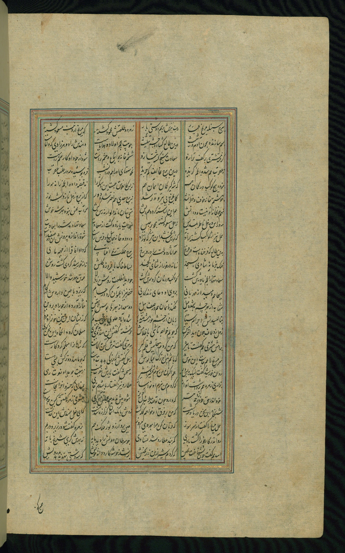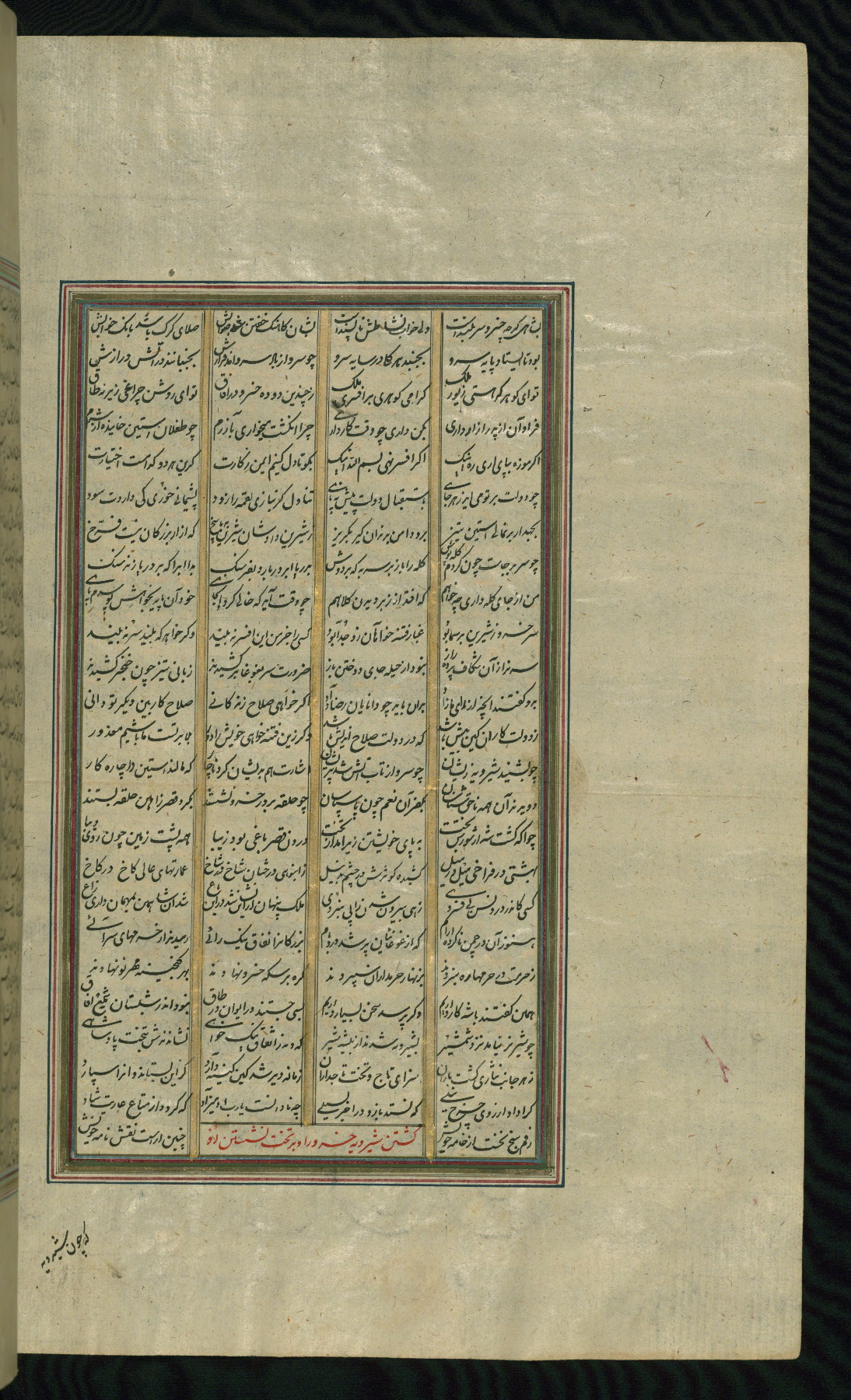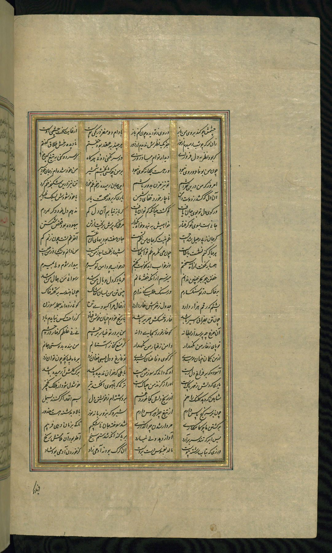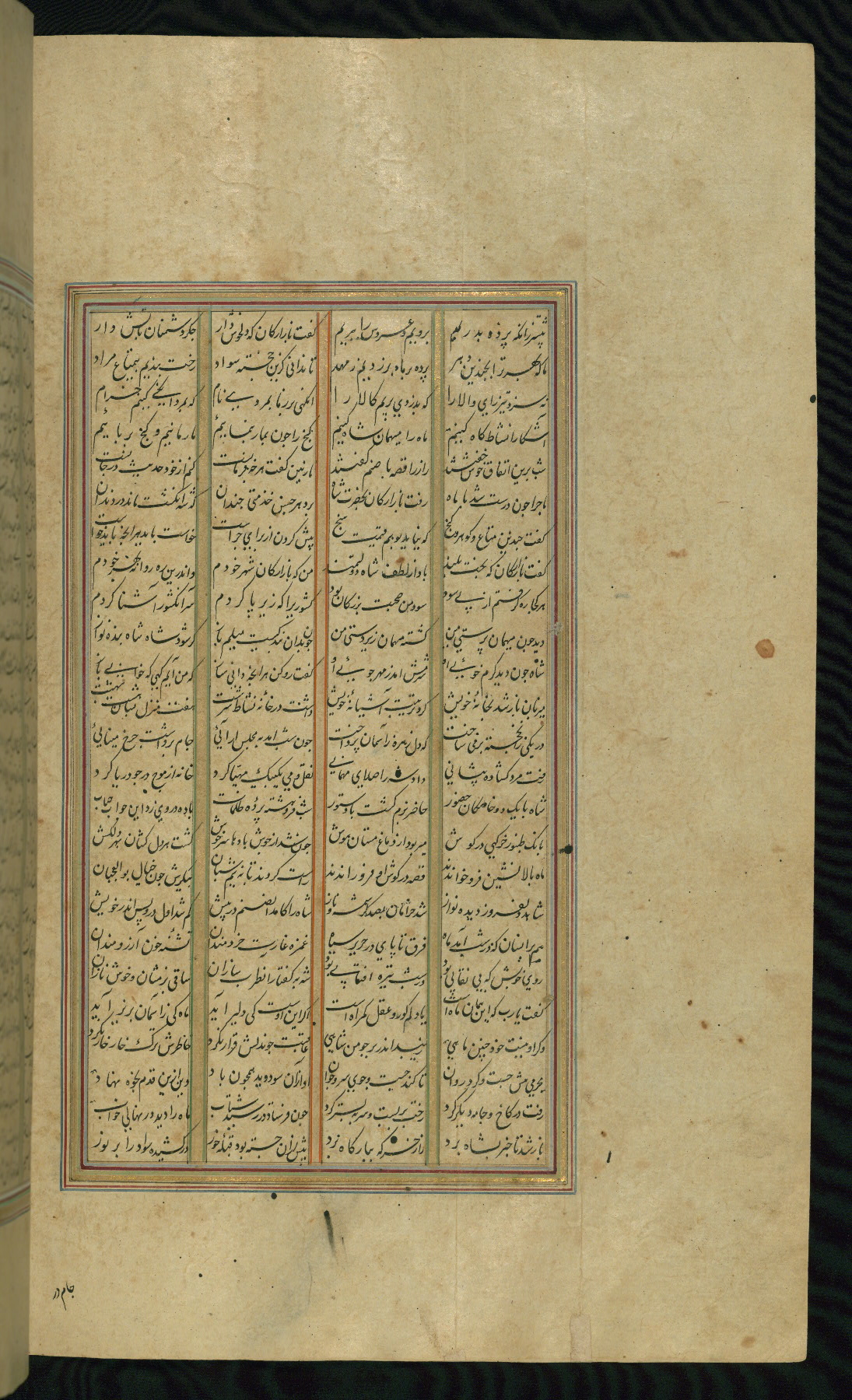 This illuminated and illustrated manuscript contains the Khamsah (quintet) and two historical poems (masnavi), Qirān-i saʿdayn and Nuh sipihr, by Amīr Khusraw Dihlavī (d. 725 AH / 1325 CE). The codex is dated 1017 AH / 1609 CE and was produced in Safavid Iran. All texts are written in black nastaʿlīq script with chapter headings in red. The manuscript opens with an illuminated and illustrated frontispiece of a hunting and court scene in the early Safavid style (fols. 1b-2a). The first text is Khamsah-i Dihlavī (fols. 2b-192a), which is introduced by an illuminated incipit and titlepiece with the title of the first poem of the quintet and the author's name. The second text is Qirān-i saʿdayn, a historical poem (masnavi) about the meeting of Sultan Muʿizz al-Dīn Kayqubād and his father, Nāṣir al-Din Bughrā Khān, on the banks of the Sarjū in Oudh. It is also introduced with an illuminated incipit and titlepiece (fol. 193b). The third text is Nuh sipihr, a historical poem (masnavi) describing the glories of Sultan Quṭb al-Dīn Mubārak Shāh Khaljī’s time, introduced with an illuminated incipit and headpiece (fol. 223b). The dark brown leather binding is original to the manuscript.