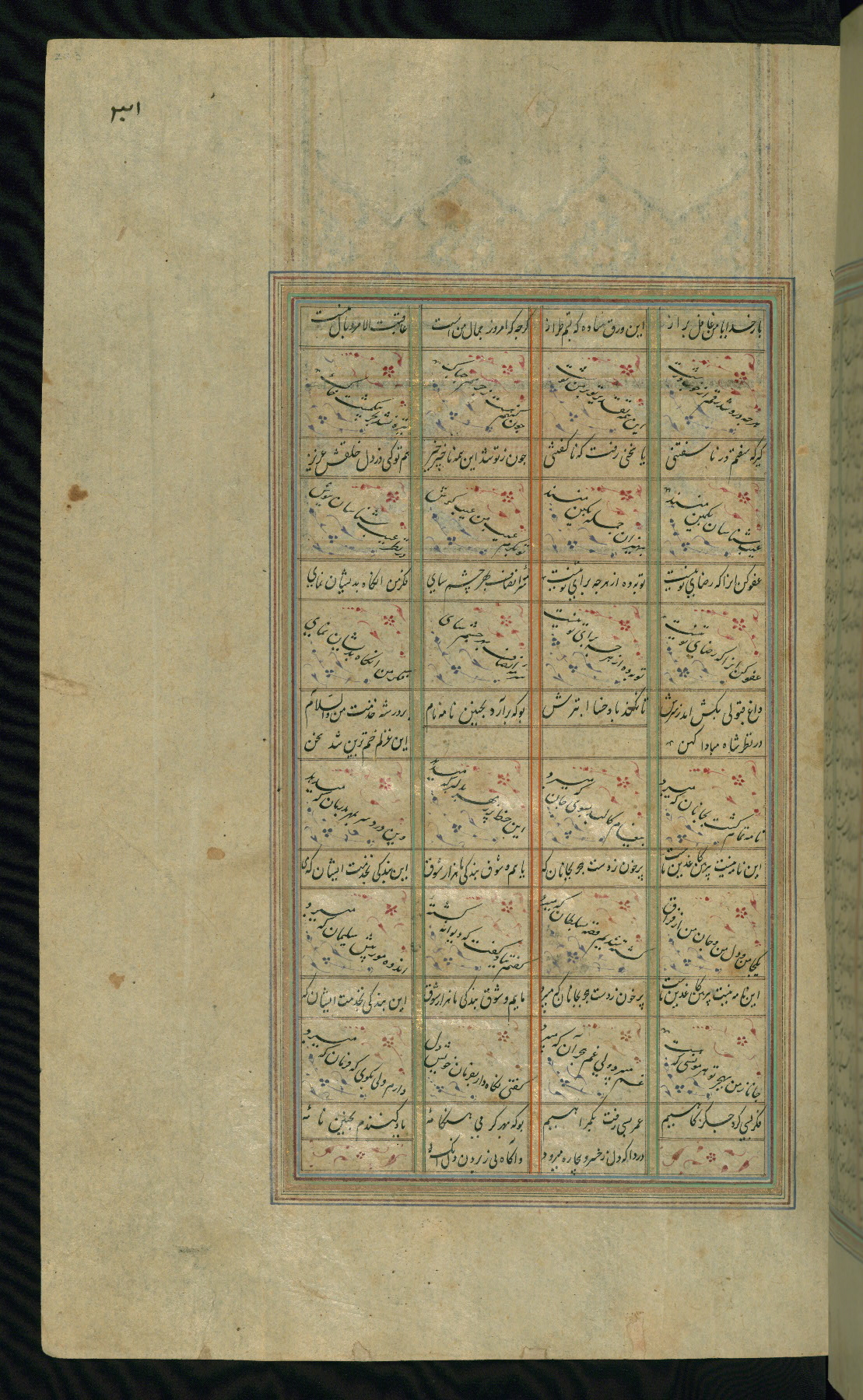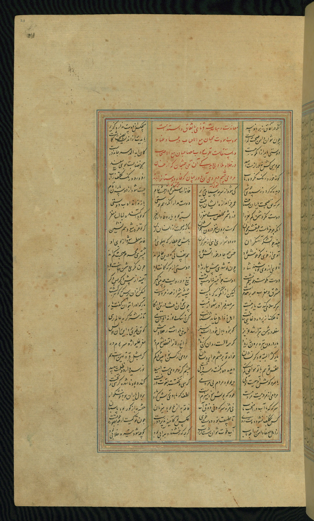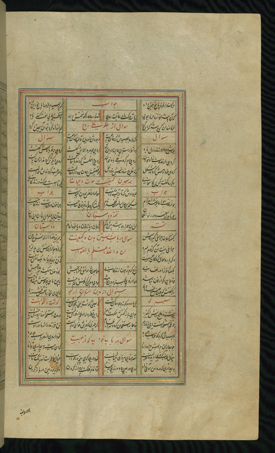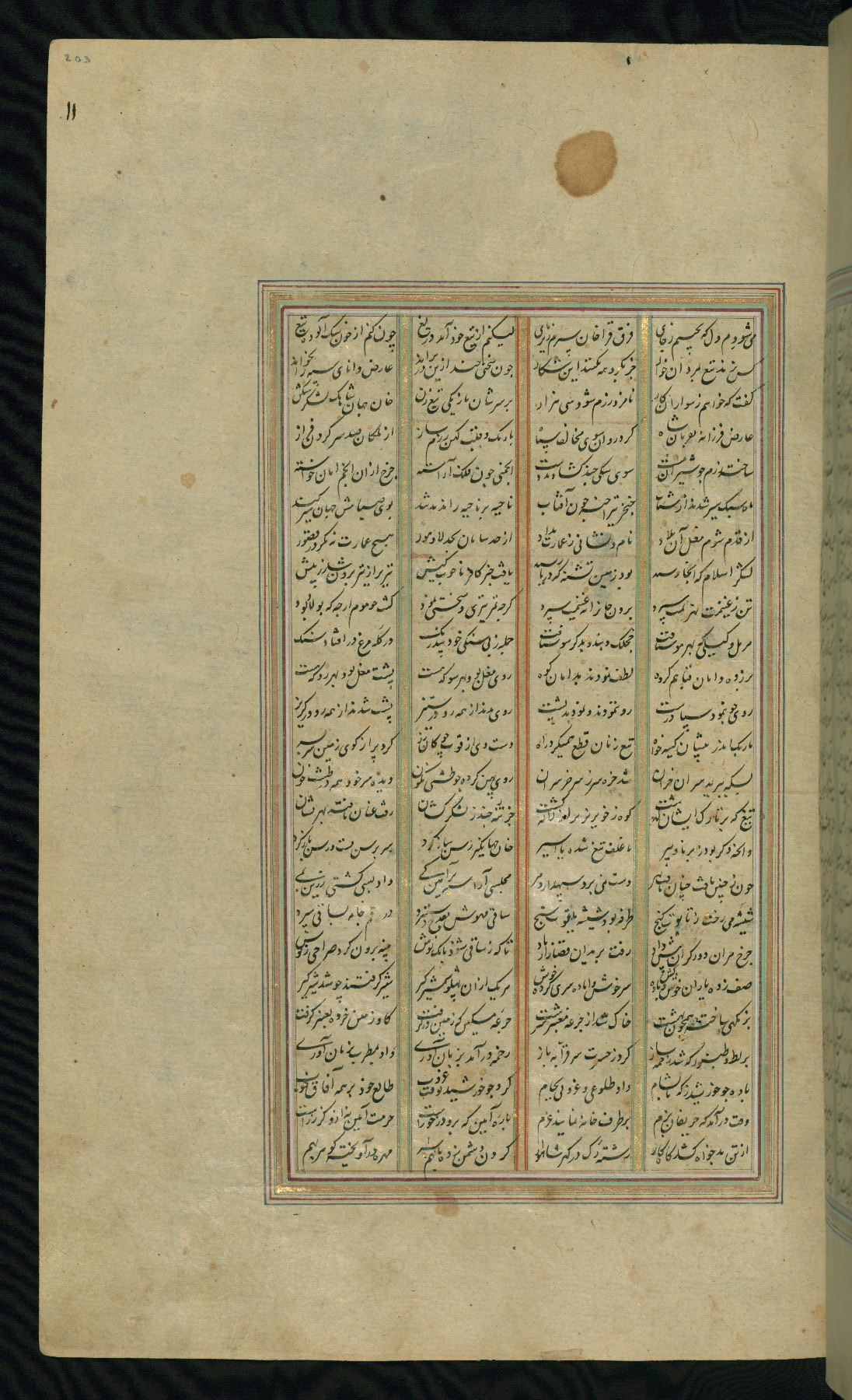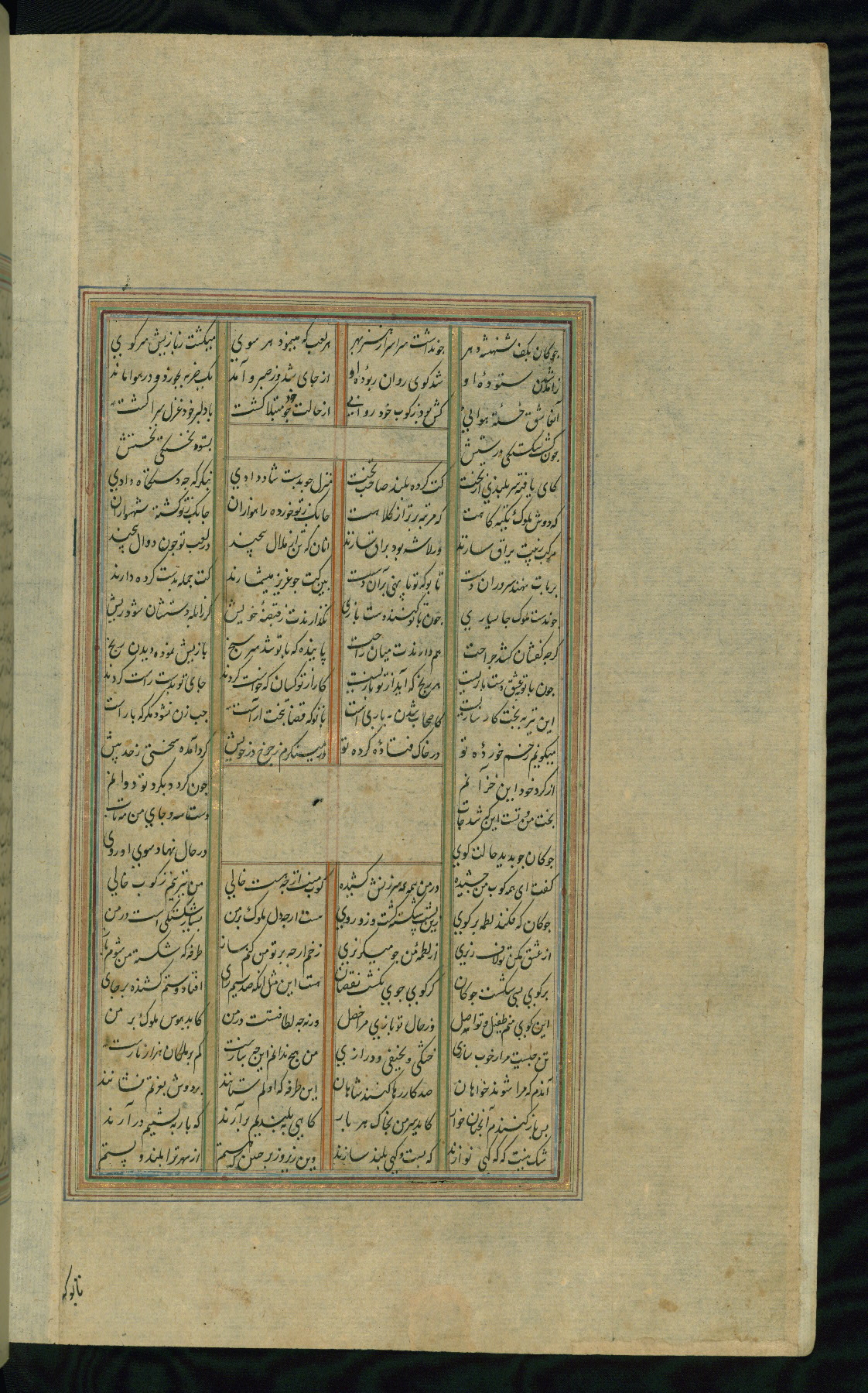 This illuminated and illustrated manuscript contains the Khamsah (quintet) and two historical poems (masnavi), Qirān-i saʿdayn and Nuh sipihr, by Amīr Khusraw Dihlavī (d. 725 AH / 1325 CE). The codex is dated 1017 AH / 1609 CE and was produced in Safavid Iran. All texts are written in black nastaʿlīq script with chapter headings in red. The manuscript opens with an illuminated and illustrated frontispiece of a hunting and court scene in the early Safavid style (fols. 1b-2a). The first text is Khamsah-i Dihlavī (fols. 2b-192a), which is introduced by an illuminated incipit and titlepiece with the title of the first poem of the quintet and the author's name. The second text is Qirān-i saʿdayn, a historical poem (masnavi) about the meeting of Sultan Muʿizz al-Dīn Kayqubād and his father, Nāṣir al-Din Bughrā Khān, on the banks of the Sarjū in Oudh. It is also introduced with an illuminated incipit and titlepiece (fol. 193b). The third text is Nuh sipihr, a historical poem (masnavi) describing the glories of Sultan Quṭb al-Dīn Mubārak Shāh Khaljī’s time, introduced with an illuminated incipit and headpiece (fol. 223b). The dark brown leather binding is original to the manuscript.