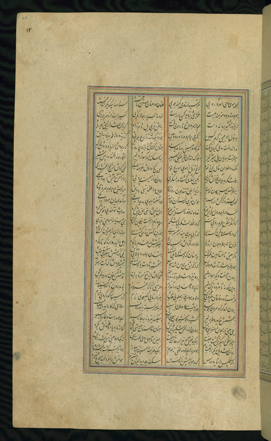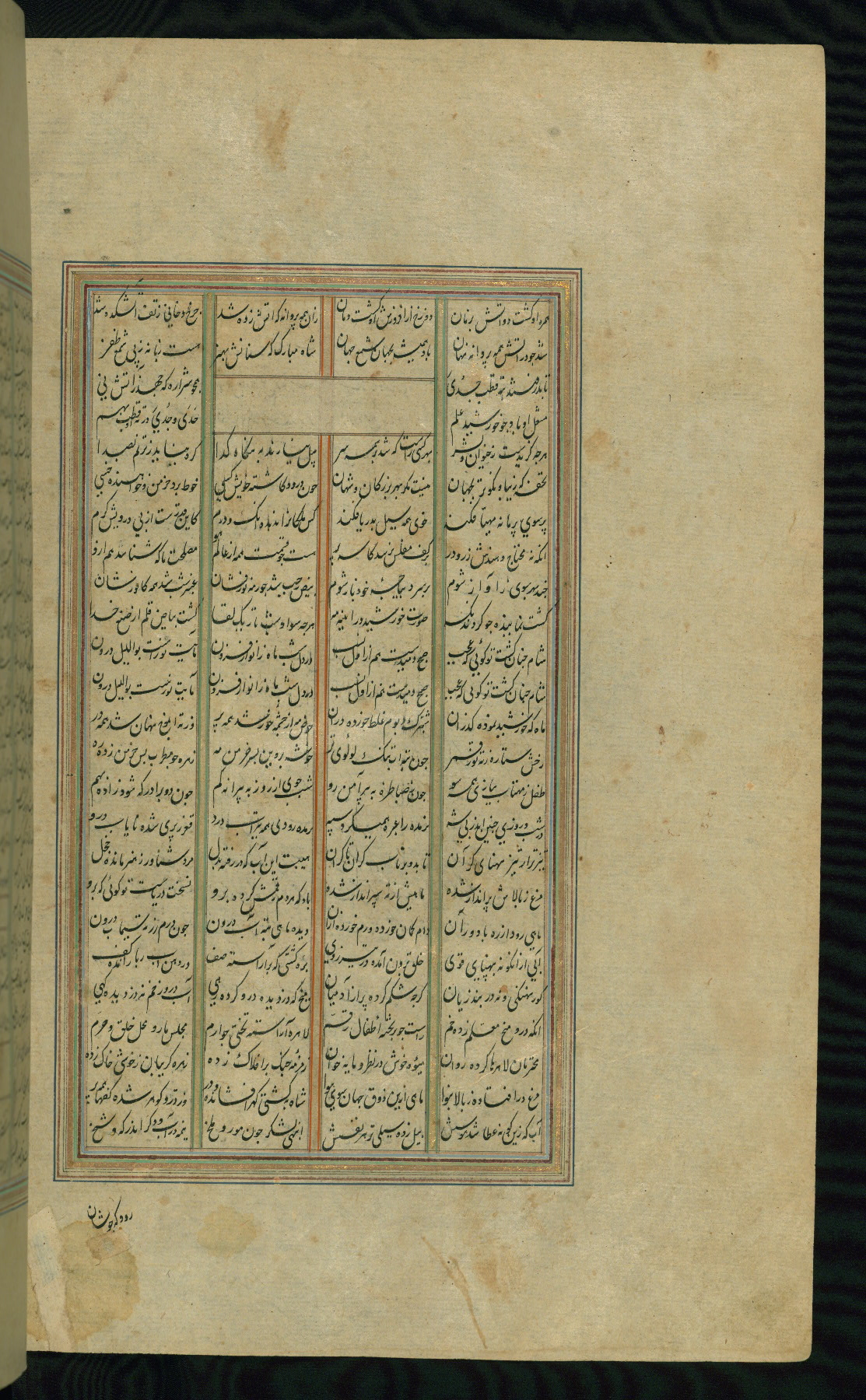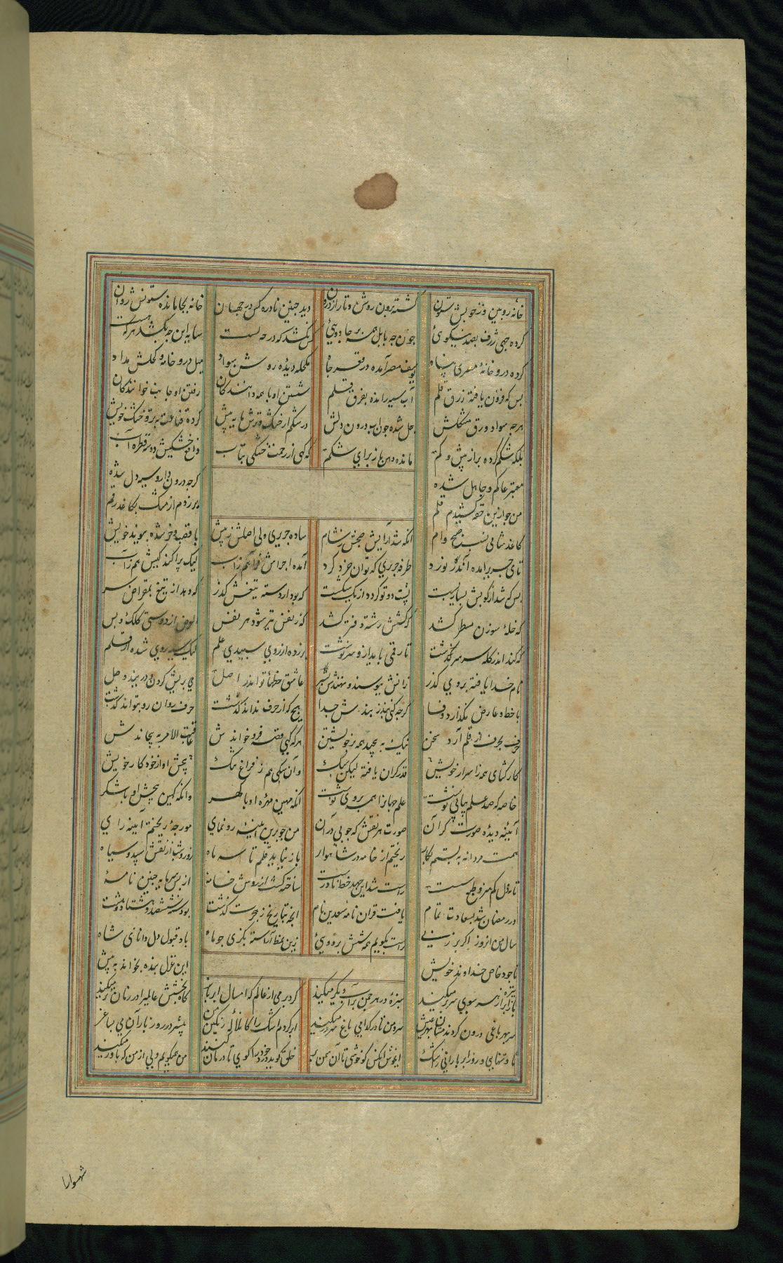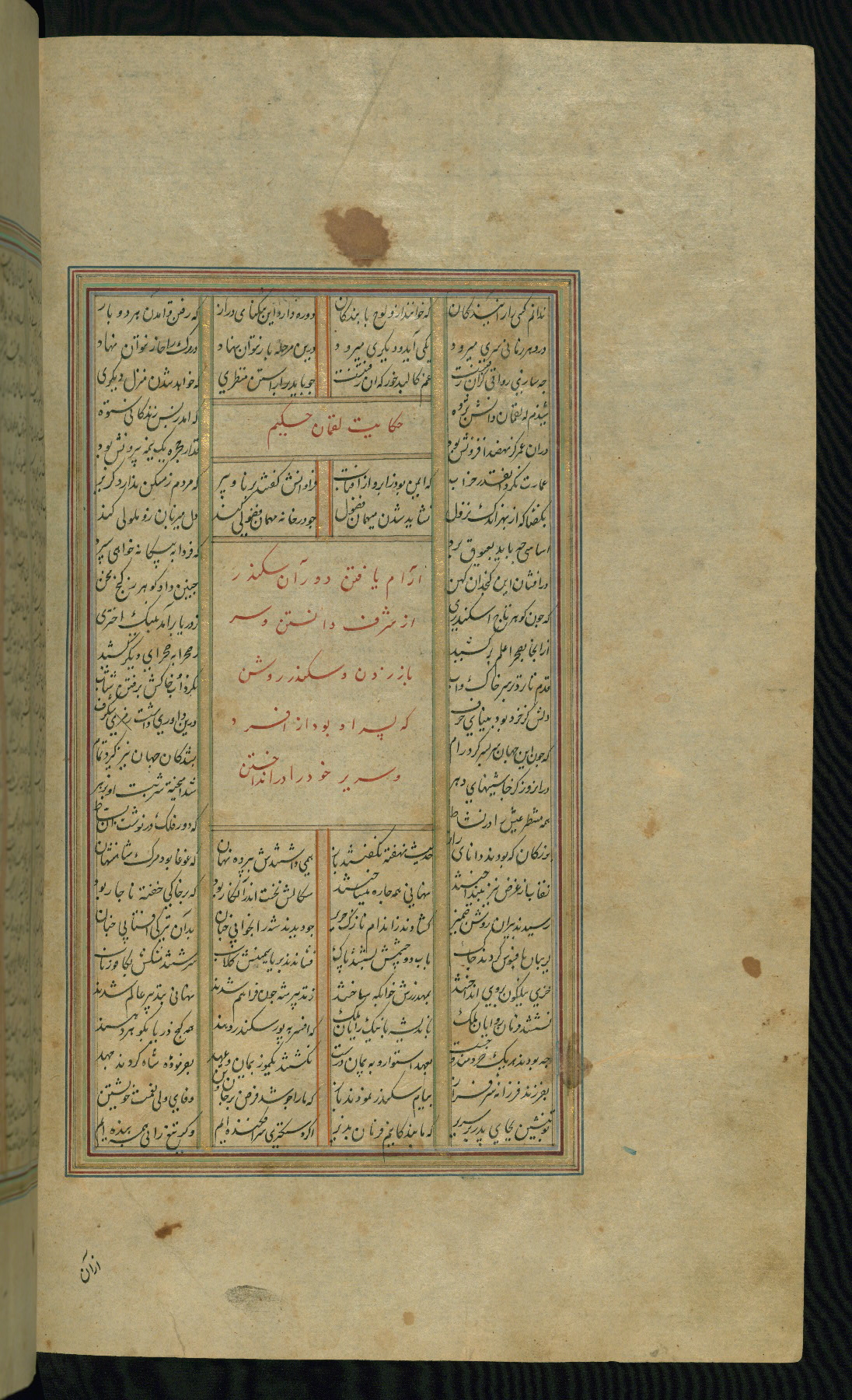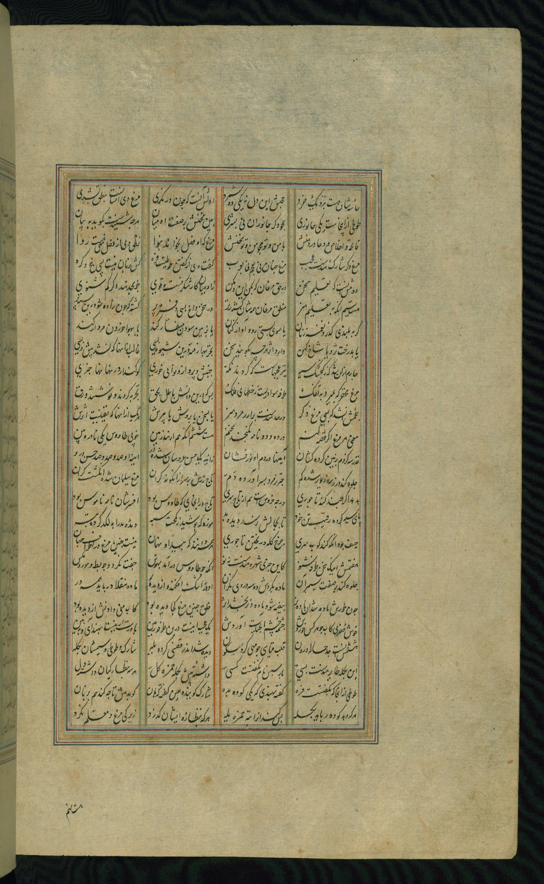 This illuminated and illustrated manuscript contains the Khamsah (quintet) and two historical poems (masnavi), Qirān-i saʿdayn and Nuh sipihr, by Amīr Khusraw Dihlavī (d. 725 AH / 1325 CE). The codex is dated 1017 AH / 1609 CE and was produced in Safavid Iran. All texts are written in black nastaʿlīq script with chapter headings in red. The manuscript opens with an illuminated and illustrated frontispiece of a hunting and court scene in the early Safavid style (fols. 1b-2a). The first text is Khamsah-i Dihlavī (fols. 2b-192a), which is introduced by an illuminated incipit and titlepiece with the title of the first poem of the quintet and the author's name. The second text is Qirān-i saʿdayn, a historical poem (masnavi) about the meeting of Sultan Muʿizz al-Dīn Kayqubād and his father, Nāṣir al-Din Bughrā Khān, on the banks of the Sarjū in Oudh. It is also introduced with an illuminated incipit and titlepiece (fol. 193b). The third text is Nuh sipihr, a historical poem (masnavi) describing the glories of Sultan Quṭb al-Dīn Mubārak Shāh Khaljī’s time, introduced with an illuminated incipit and headpiece (fol. 223b). The dark brown leather binding is original to the manuscript.