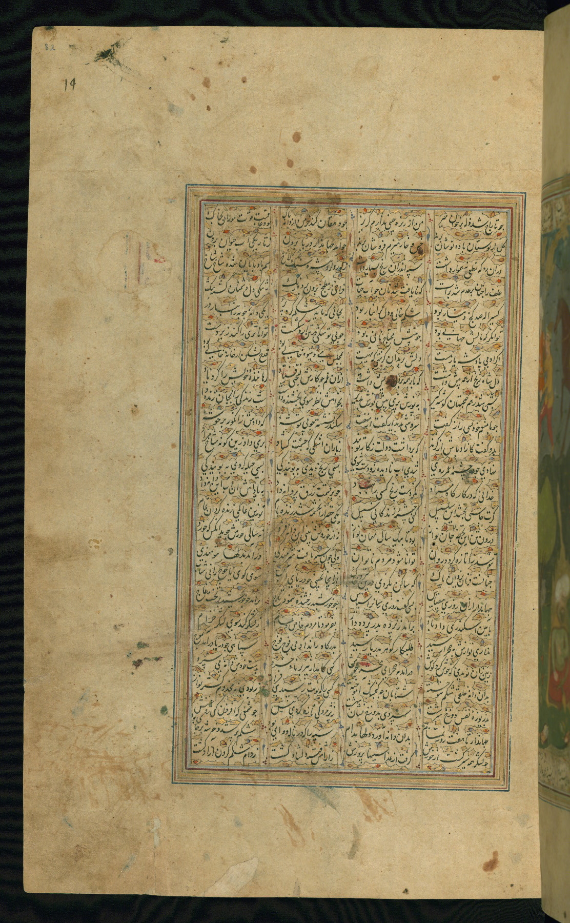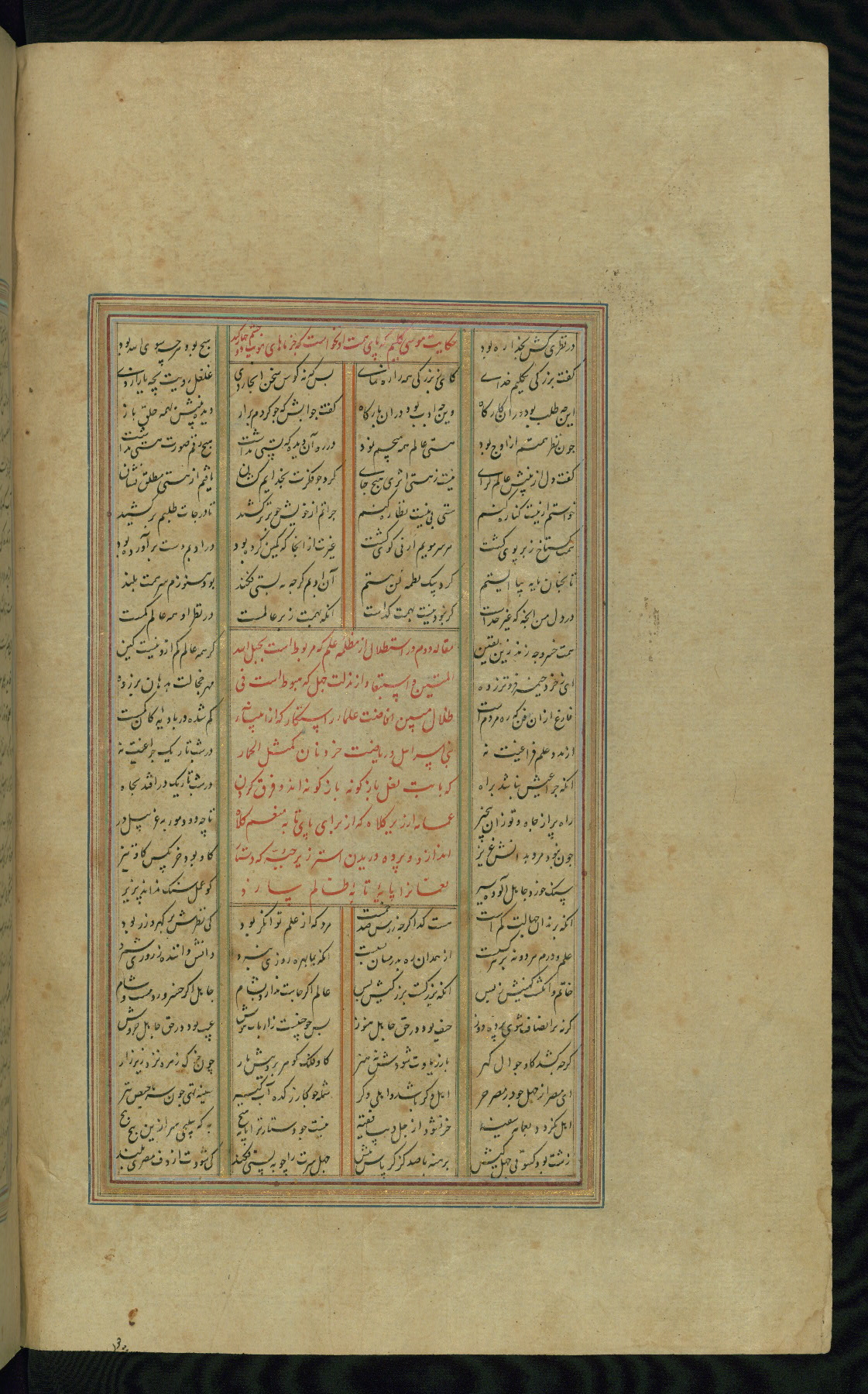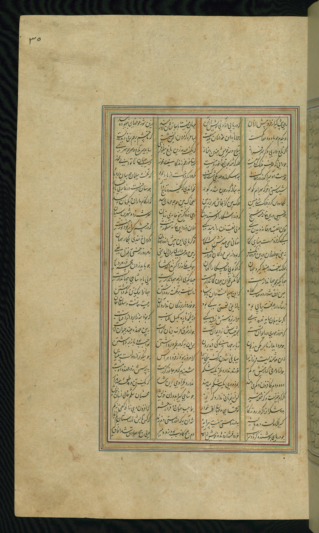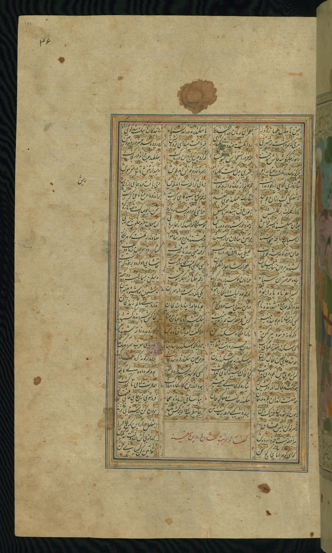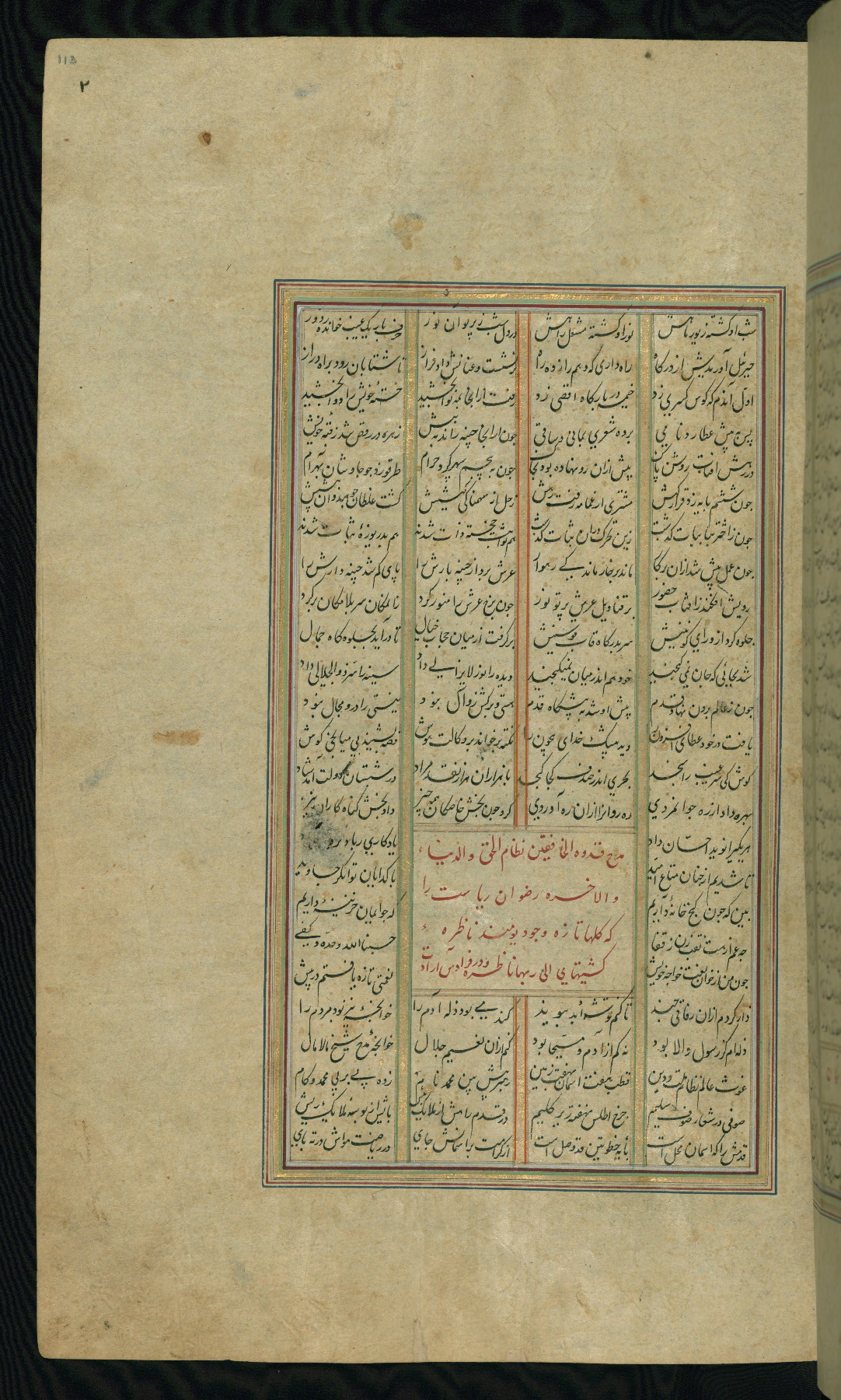 This illuminated and illustrated manuscript contains the Khamsah (quintet) and two historical poems (masnavi), Qirān-i saʿdayn and Nuh sipihr, by Amīr Khusraw Dihlavī (d. 725 AH / 1325 CE). The codex is dated 1017 AH / 1609 CE and was produced in Safavid Iran. All texts are written in black nastaʿlīq script with chapter headings in red. The manuscript opens with an illuminated and illustrated frontispiece of a hunting and court scene in the early Safavid style (fols. 1b-2a). The first text is Khamsah-i Dihlavī (fols. 2b-192a), which is introduced by an illuminated incipit and titlepiece with the title of the first poem of the quintet and the author's name. The second text is Qirān-i saʿdayn, a historical poem (masnavi) about the meeting of Sultan Muʿizz al-Dīn Kayqubād and his father, Nāṣir al-Din Bughrā Khān, on the banks of the Sarjū in Oudh. It is also introduced with an illuminated incipit and titlepiece (fol. 193b). The third text is Nuh sipihr, a historical poem (masnavi) describing the glories of Sultan Quṭb al-Dīn Mubārak Shāh Khaljī’s time, introduced with an illuminated incipit and headpiece (fol. 223b). The dark brown leather binding is original to the manuscript.