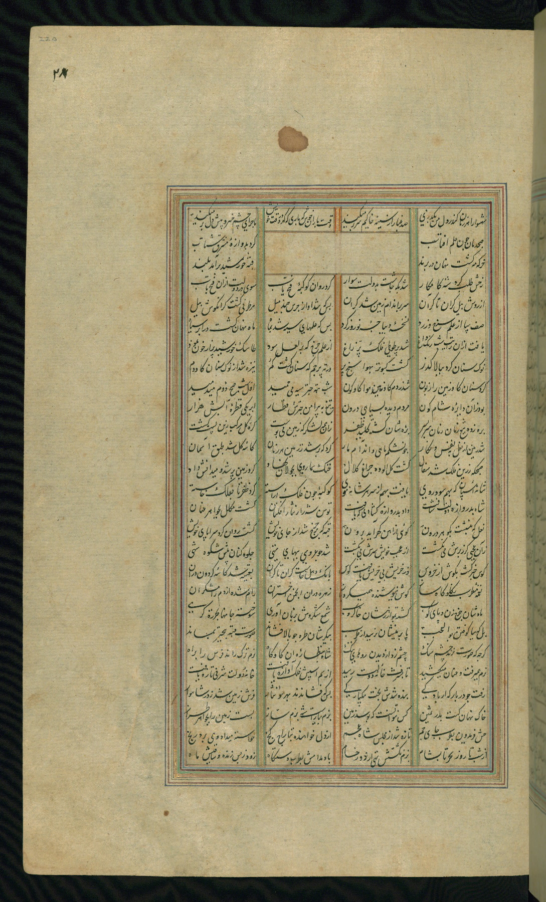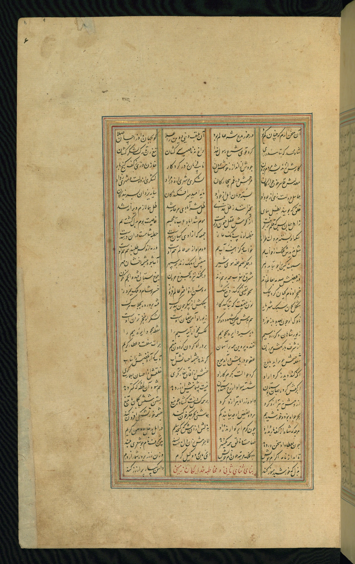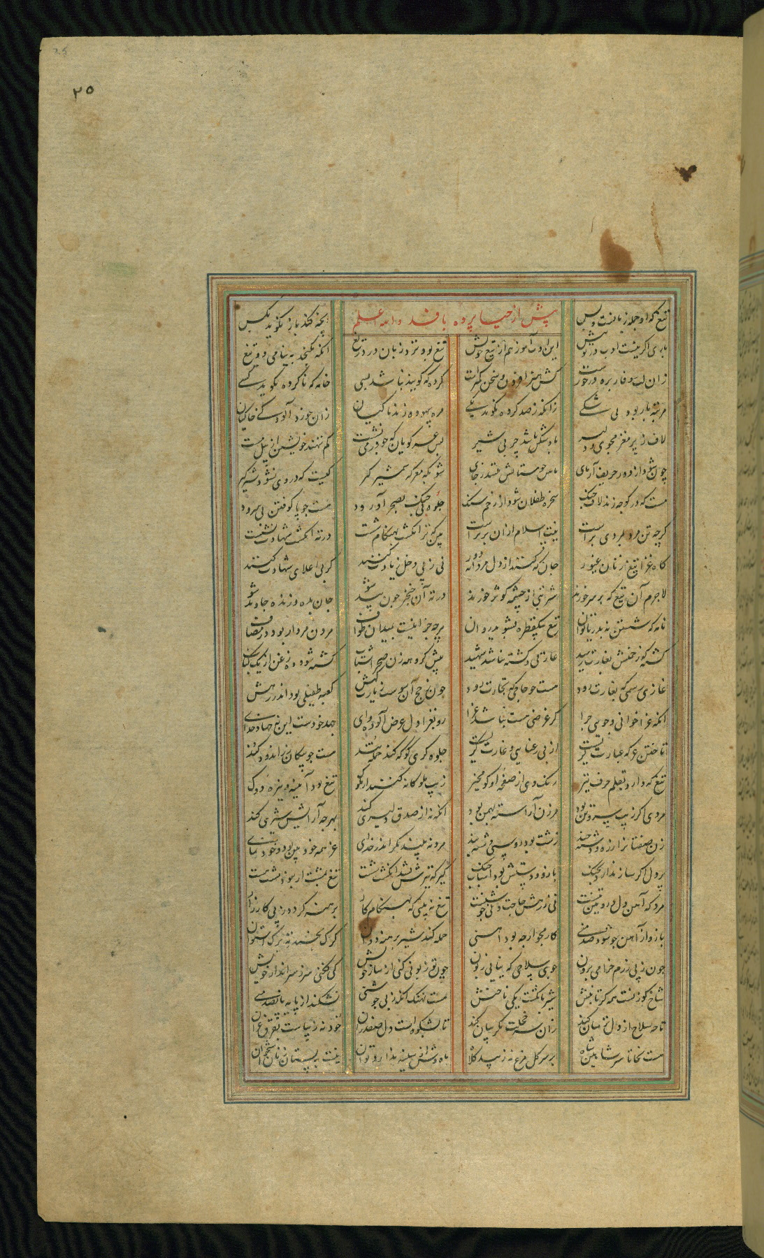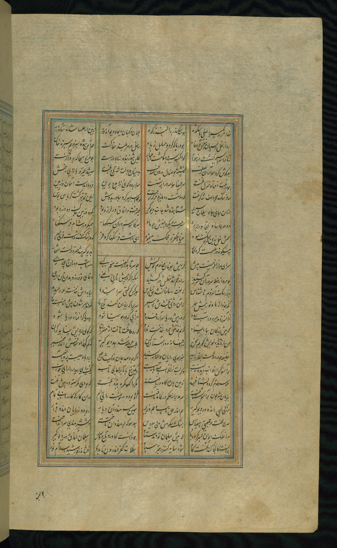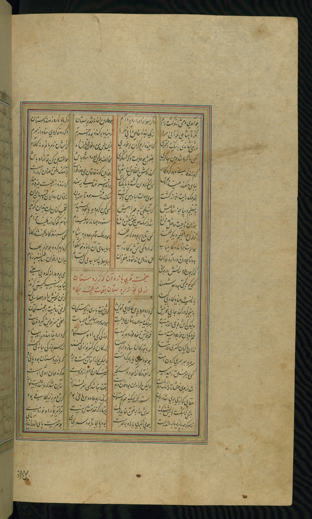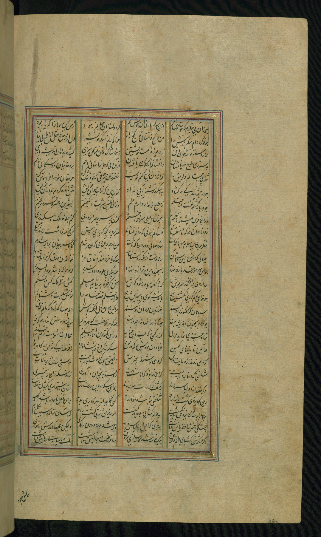 This illuminated and illustrated manuscript contains the Khamsah (quintet) and two historical poems (masnavi), Qirān-i saʿdayn and Nuh sipihr, by Amīr Khusraw Dihlavī (d. 725 AH / 1325 CE). The codex is dated 1017 AH / 1609 CE and was produced in Safavid Iran. All texts are written in black nastaʿlīq script with chapter headings in red. The manuscript opens with an illuminated and illustrated frontispiece of a hunting and court scene in the early Safavid style (fols. 1b-2a). The first text is Khamsah-i Dihlavī (fols. 2b-192a), which is introduced by an illuminated incipit and titlepiece with the title of the first poem of the quintet and the author's name. The second text is Qirān-i saʿdayn, a historical poem (masnavi) about the meeting of Sultan Muʿizz al-Dīn Kayqubād and his father, Nāṣir al-Din Bughrā Khān, on the banks of the Sarjū in Oudh. It is also introduced with an illuminated incipit and titlepiece (fol. 193b). The third text is Nuh sipihr, a historical poem (masnavi) describing the glories of Sultan Quṭb al-Dīn Mubārak Shāh Khaljī’s time, introduced with an illuminated incipit and headpiece (fol. 223b). The dark brown leather binding is original to the manuscript.