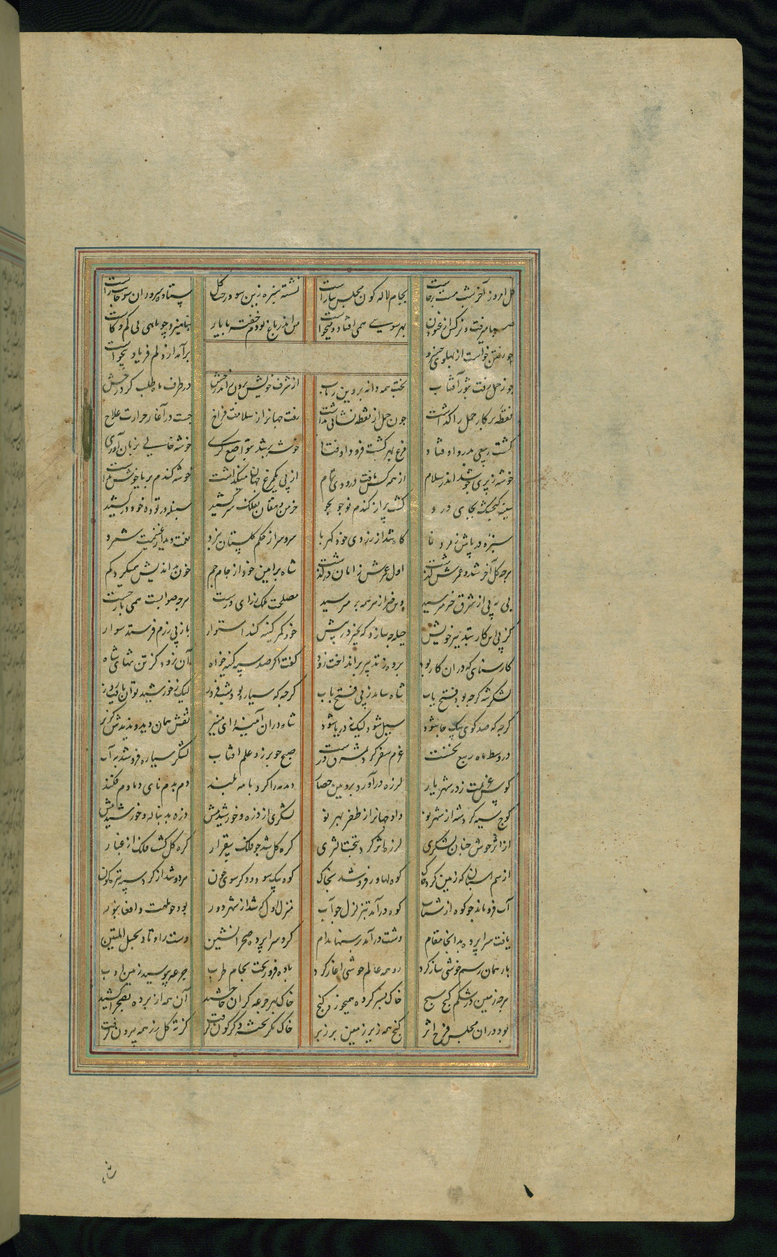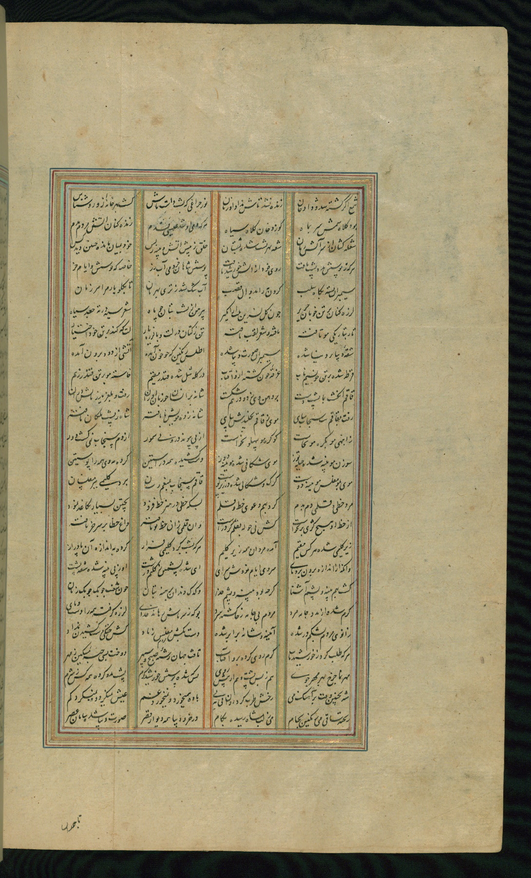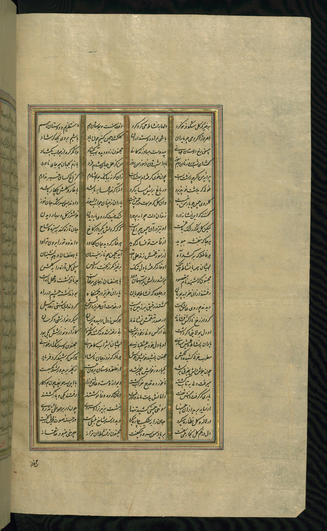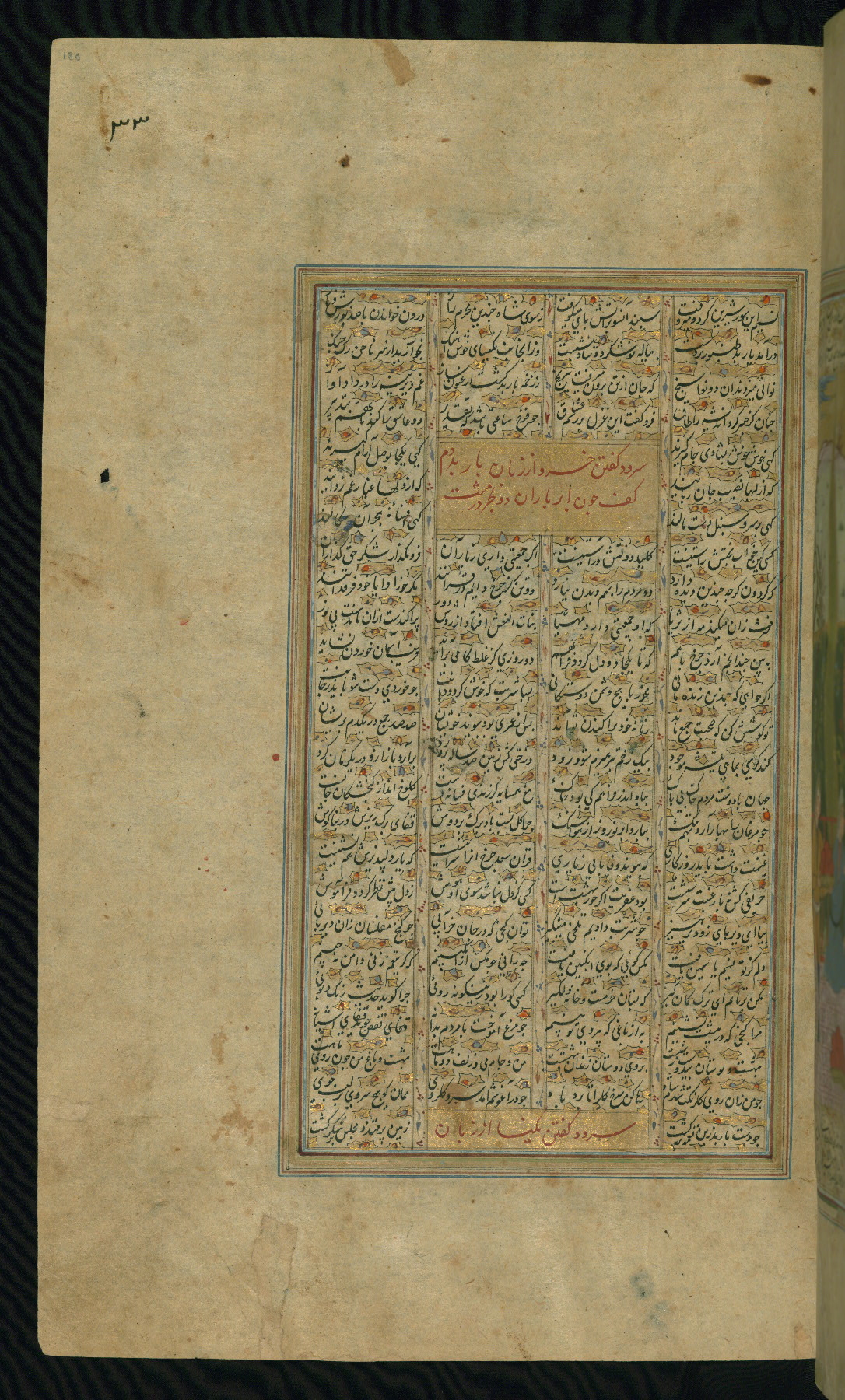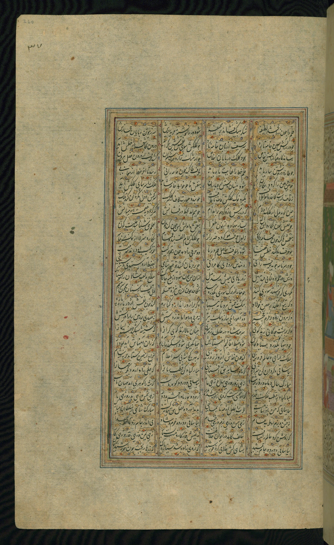 This illuminated and illustrated manuscript contains the Khamsah (quintet) and two historical poems (masnavi), Qirān-i saʿdayn and Nuh sipihr, by Amīr Khusraw Dihlavī (d. 725 AH / 1325 CE). The codex is dated 1017 AH / 1609 CE and was produced in Safavid Iran. All texts are written in black nastaʿlīq script with chapter headings in red. The manuscript opens with an illuminated and illustrated frontispiece of a hunting and court scene in the early Safavid style (fols. 1b-2a). The first text is Khamsah-i Dihlavī (fols. 2b-192a), which is introduced by an illuminated incipit and titlepiece with the title of the first poem of the quintet and the author's name. The second text is Qirān-i saʿdayn, a historical poem (masnavi) about the meeting of Sultan Muʿizz al-Dīn Kayqubād and his father, Nāṣir al-Din Bughrā Khān, on the banks of the Sarjū in Oudh. It is also introduced with an illuminated incipit and titlepiece (fol. 193b). The third text is Nuh sipihr, a historical poem (masnavi) describing the glories of Sultan Quṭb al-Dīn Mubārak Shāh Khaljī’s time, introduced with an illuminated incipit and headpiece (fol. 223b). The dark brown leather binding is original to the manuscript.