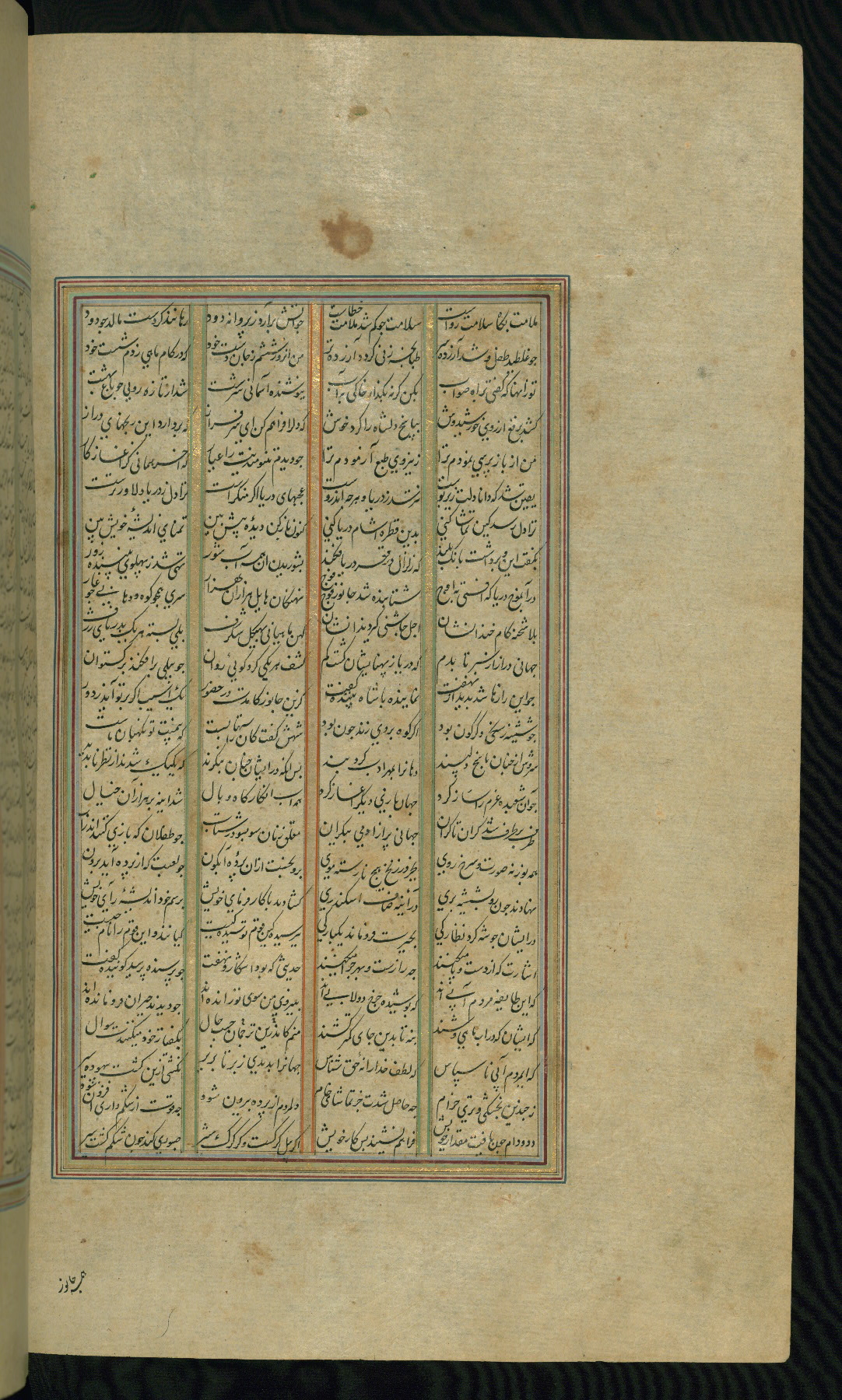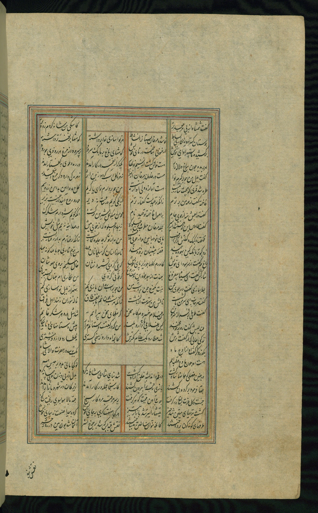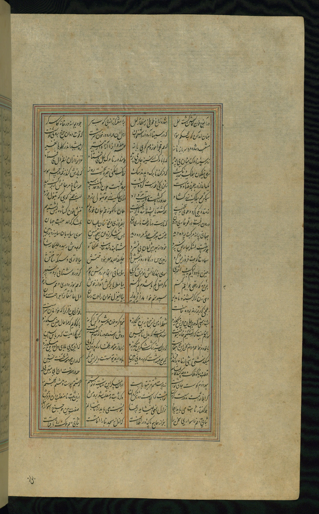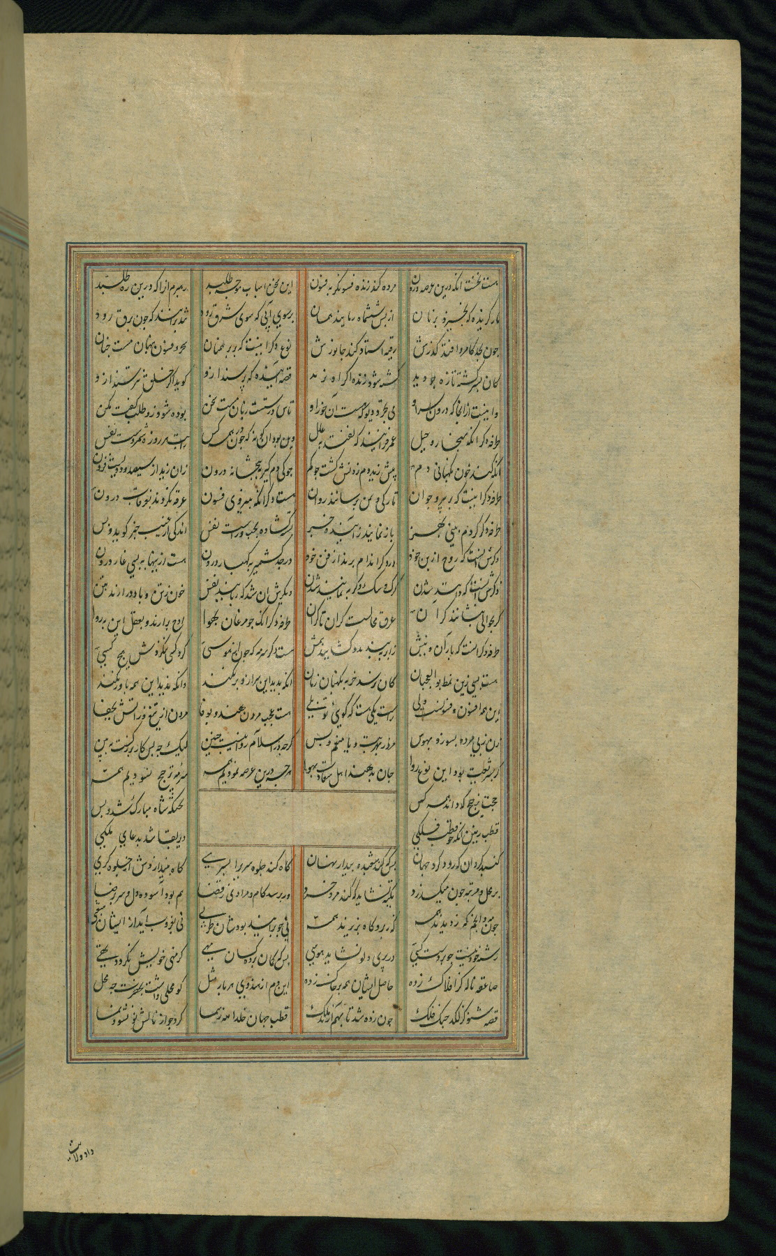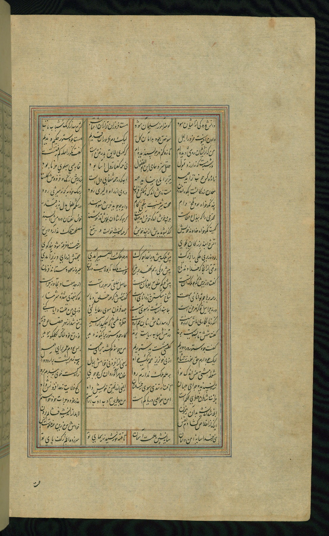 This illuminated and illustrated manuscript contains the Khamsah (quintet) and two historical poems (masnavi), Qirān-i saʿdayn and Nuh sipihr, by Amīr Khusraw Dihlavī (d. 725 AH / 1325 CE). The codex is dated 1017 AH / 1609 CE and was produced in Safavid Iran. All texts are written in black nastaʿlīq script with chapter headings in red. The manuscript opens with an illuminated and illustrated frontispiece of a hunting and court scene in the early Safavid style (fols. 1b-2a). The first text is Khamsah-i Dihlavī (fols. 2b-192a), which is introduced by an illuminated incipit and titlepiece with the title of the first poem of the quintet and the author's name. The second text is Qirān-i saʿdayn, a historical poem (masnavi) about the meeting of Sultan Muʿizz al-Dīn Kayqubād and his father, Nāṣir al-Din Bughrā Khān, on the banks of the Sarjū in Oudh. It is also introduced with an illuminated incipit and titlepiece (fol. 193b). The third text is Nuh sipihr, a historical poem (masnavi) describing the glories of Sultan Quṭb al-Dīn Mubārak Shāh Khaljī’s time, introduced with an illuminated incipit and headpiece (fol. 223b). The dark brown leather binding is original to the manuscript.