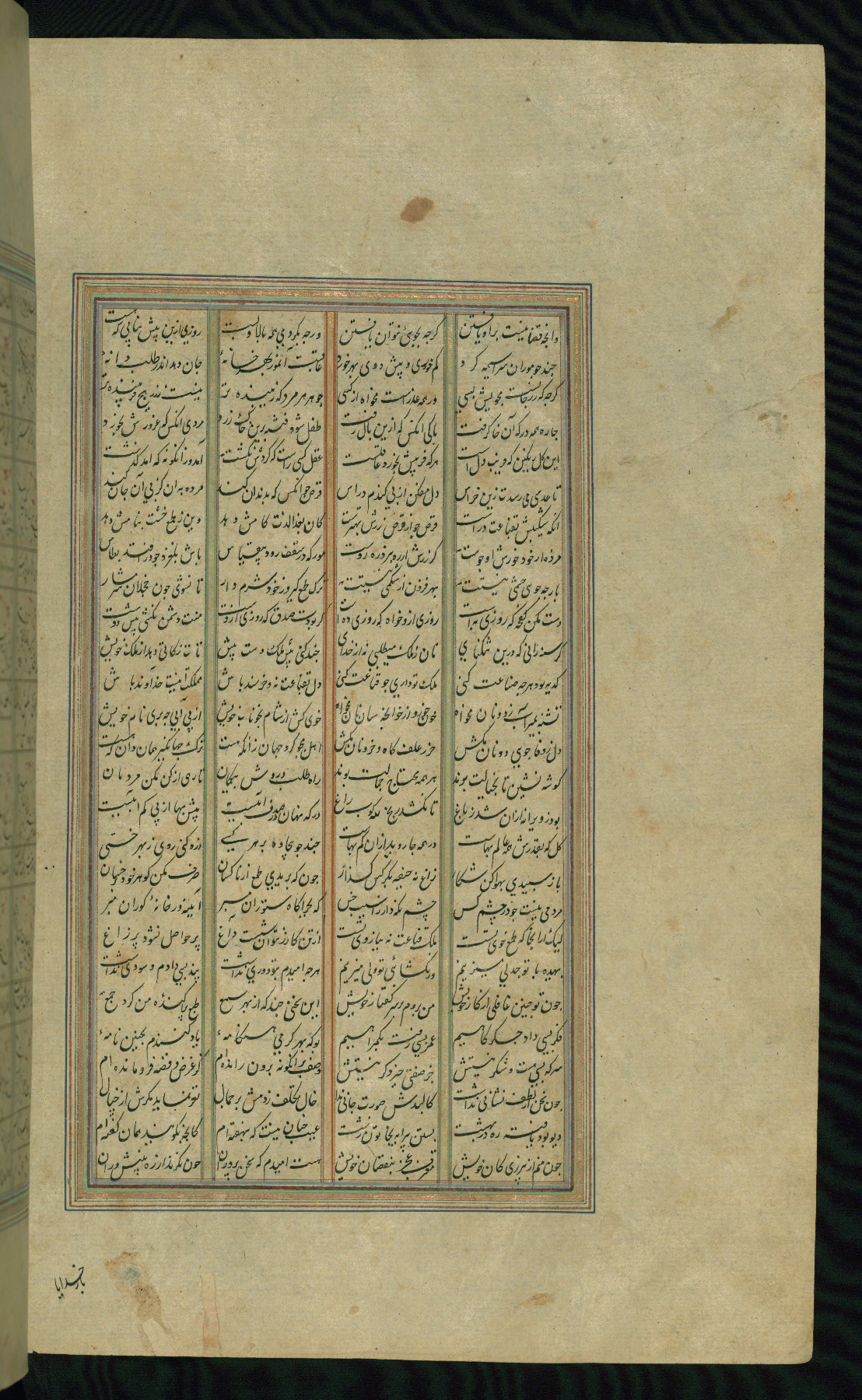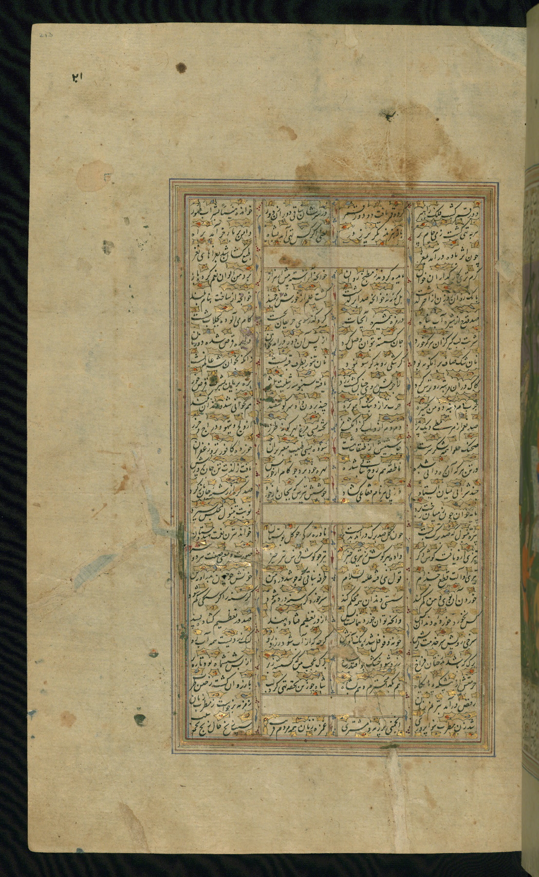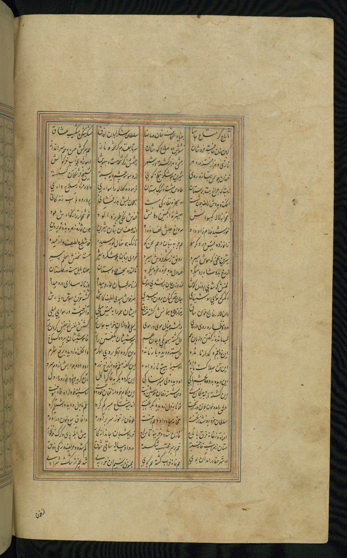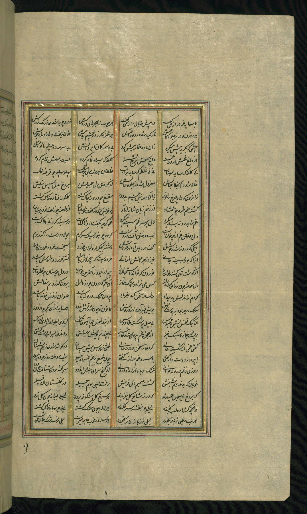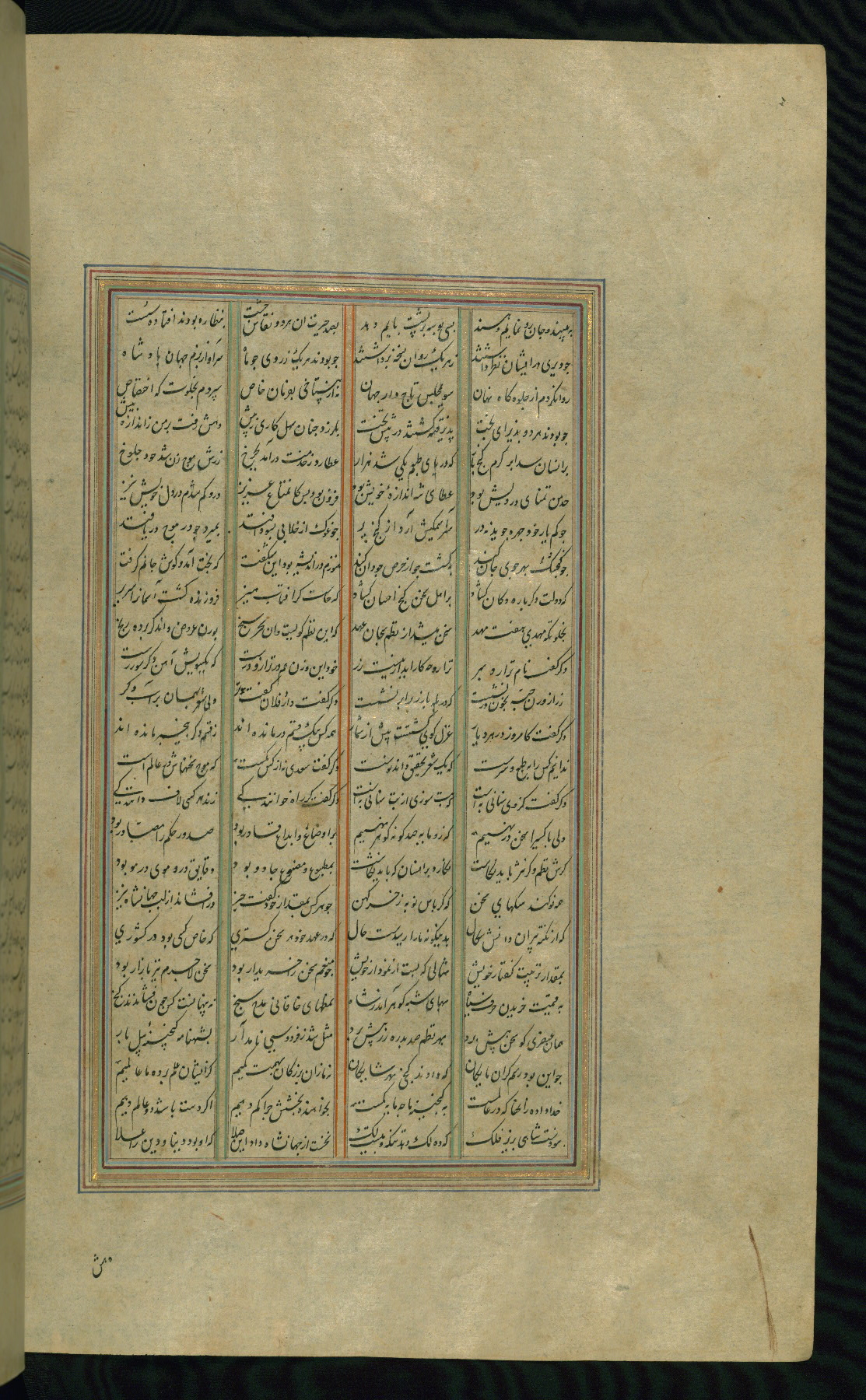 This illuminated and illustrated manuscript contains the Khamsah (quintet) and two historical poems (masnavi), Qirān-i saʿdayn and Nuh sipihr, by Amīr Khusraw Dihlavī (d. 725 AH / 1325 CE). The codex is dated 1017 AH / 1609 CE and was produced in Safavid Iran. All texts are written in black nastaʿlīq script with chapter headings in red. The manuscript opens with an illuminated and illustrated frontispiece of a hunting and court scene in the early Safavid style (fols. 1b-2a). The first text is Khamsah-i Dihlavī (fols. 2b-192a), which is introduced by an illuminated incipit and titlepiece with the title of the first poem of the quintet and the author's name. The second text is Qirān-i saʿdayn, a historical poem (masnavi) about the meeting of Sultan Muʿizz al-Dīn Kayqubād and his father, Nāṣir al-Din Bughrā Khān, on the banks of the Sarjū in Oudh. It is also introduced with an illuminated incipit and titlepiece (fol. 193b). The third text is Nuh sipihr, a historical poem (masnavi) describing the glories of Sultan Quṭb al-Dīn Mubārak Shāh Khaljī’s time, introduced with an illuminated incipit and headpiece (fol. 223b). The dark brown leather binding is original to the manuscript.