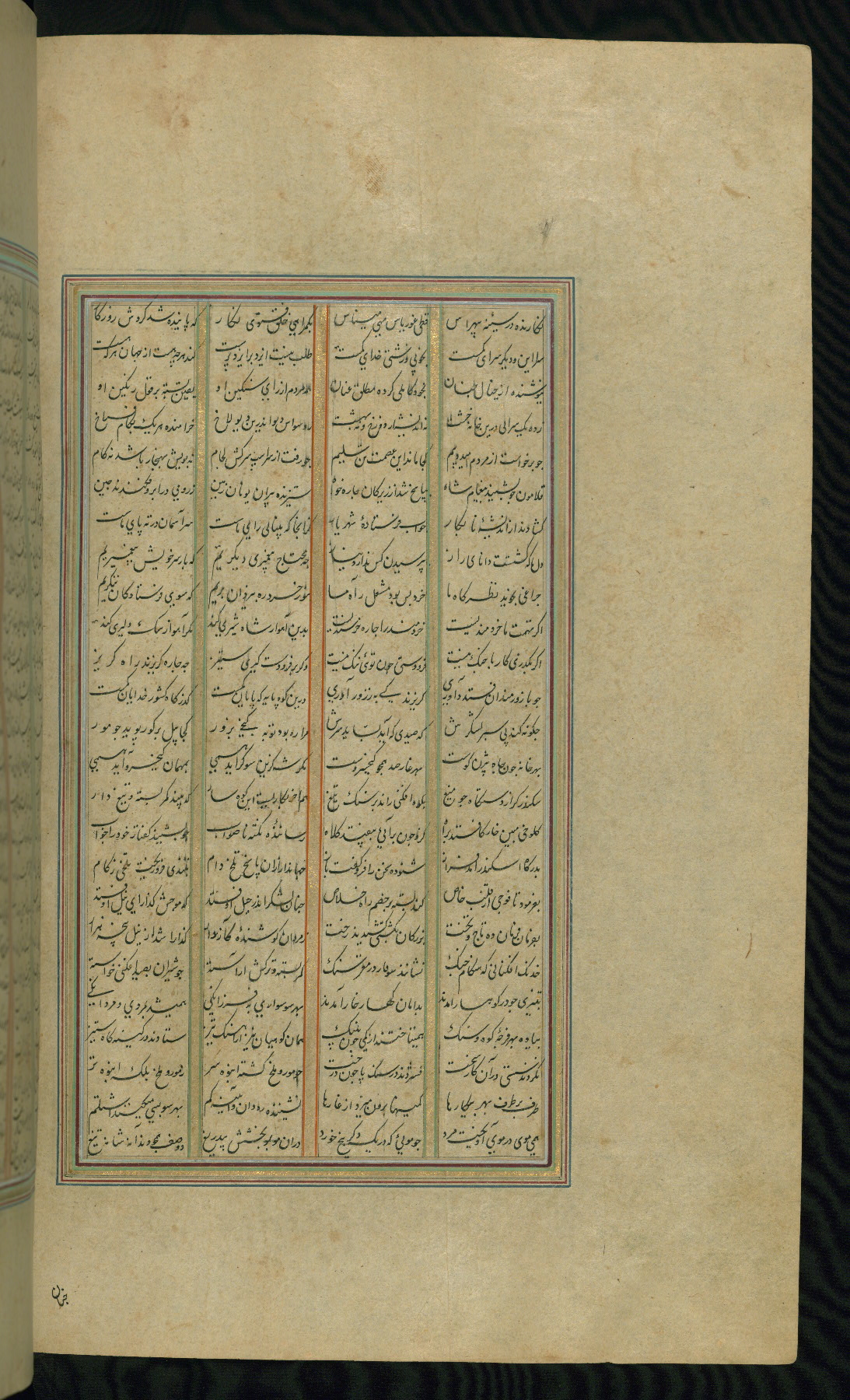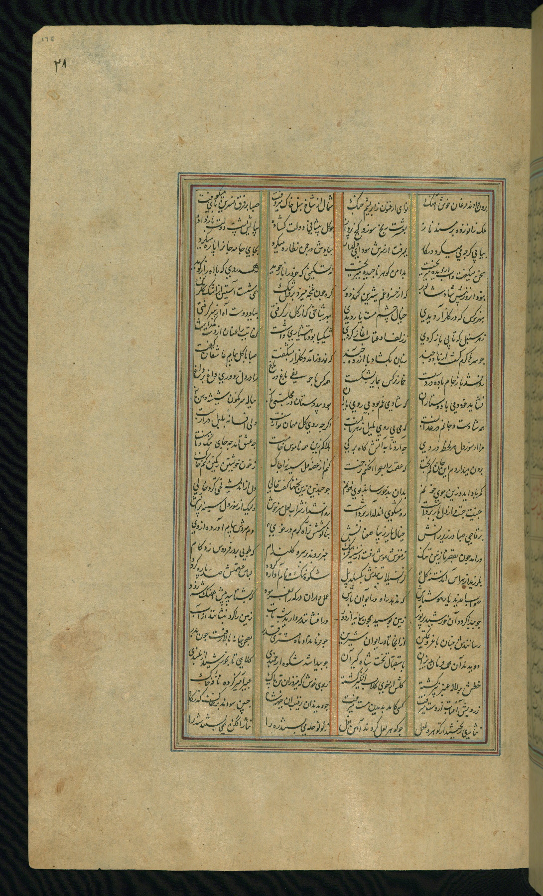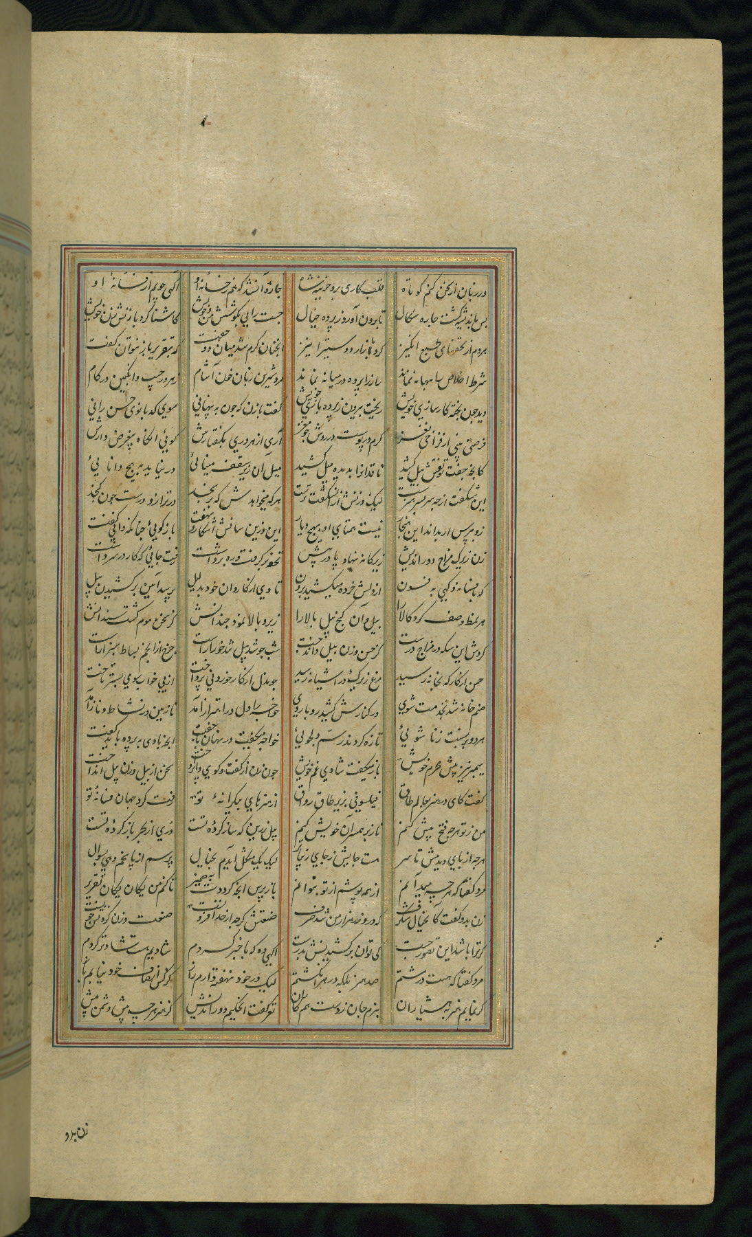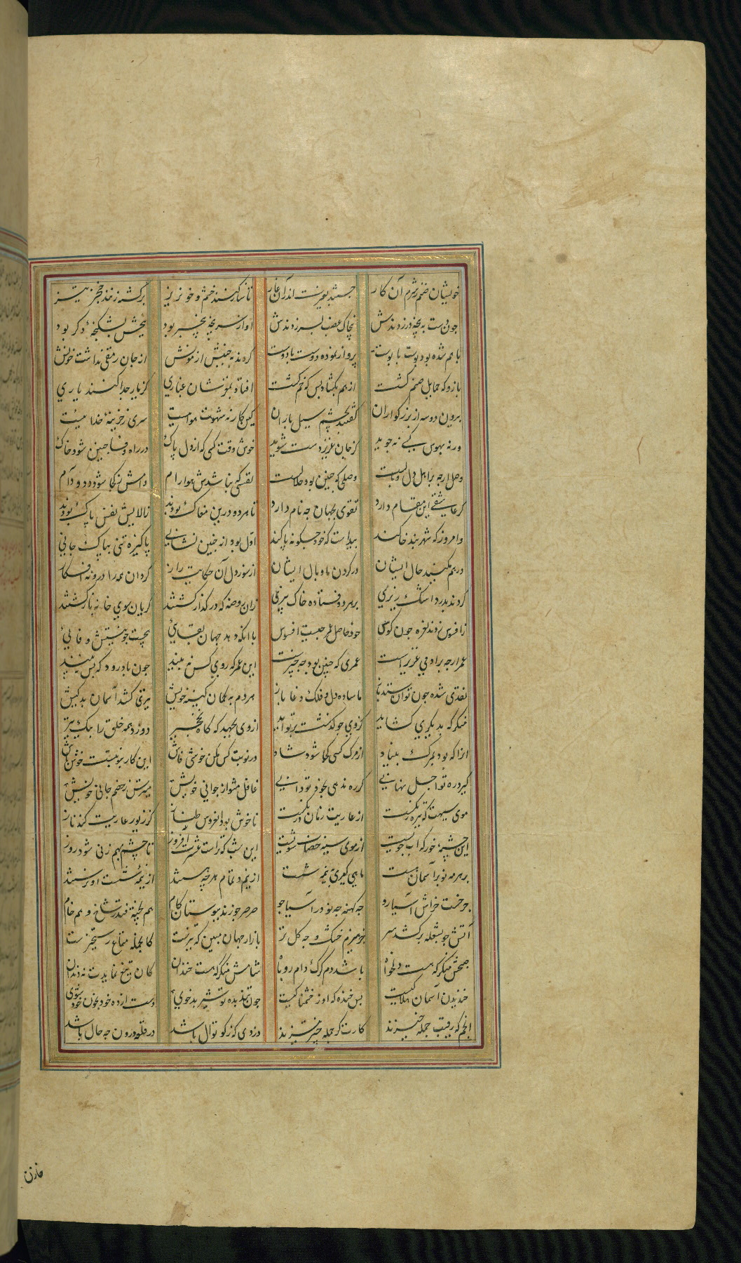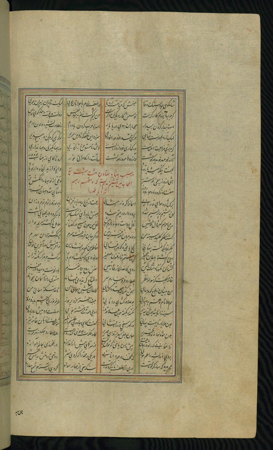 This illuminated and illustrated manuscript contains the Khamsah (quintet) and two historical poems (masnavi), Qirān-i saʿdayn and Nuh sipihr, by Amīr Khusraw Dihlavī (d. 725 AH / 1325 CE). The codex is dated 1017 AH / 1609 CE and was produced in Safavid Iran. All texts are written in black nastaʿlīq script with chapter headings in red. The manuscript opens with an illuminated and illustrated frontispiece of a hunting and court scene in the early Safavid style (fols. 1b-2a). The first text is Khamsah-i Dihlavī (fols. 2b-192a), which is introduced by an illuminated incipit and titlepiece with the title of the first poem of the quintet and the author's name. The second text is Qirān-i saʿdayn, a historical poem (masnavi) about the meeting of Sultan Muʿizz al-Dīn Kayqubād and his father, Nāṣir al-Din Bughrā Khān, on the banks of the Sarjū in Oudh. It is also introduced with an illuminated incipit and titlepiece (fol. 193b). The third text is Nuh sipihr, a historical poem (masnavi) describing the glories of Sultan Quṭb al-Dīn Mubārak Shāh Khaljī’s time, introduced with an illuminated incipit and headpiece (fol. 223b). The dark brown leather binding is original to the manuscript.