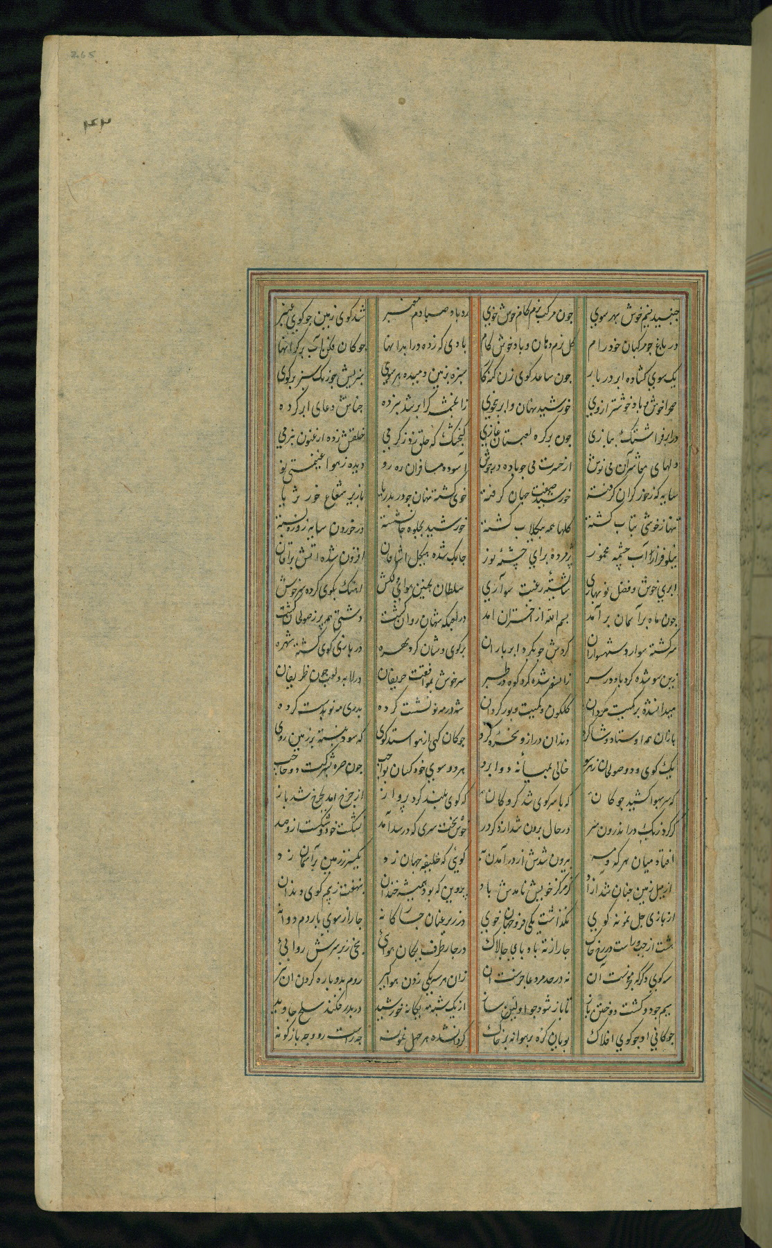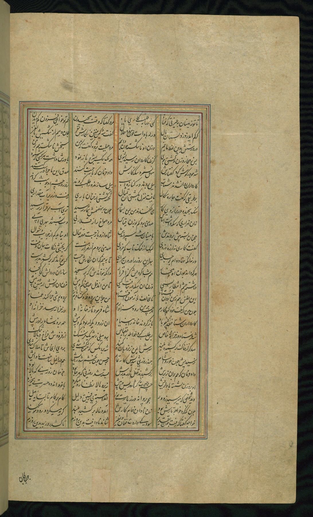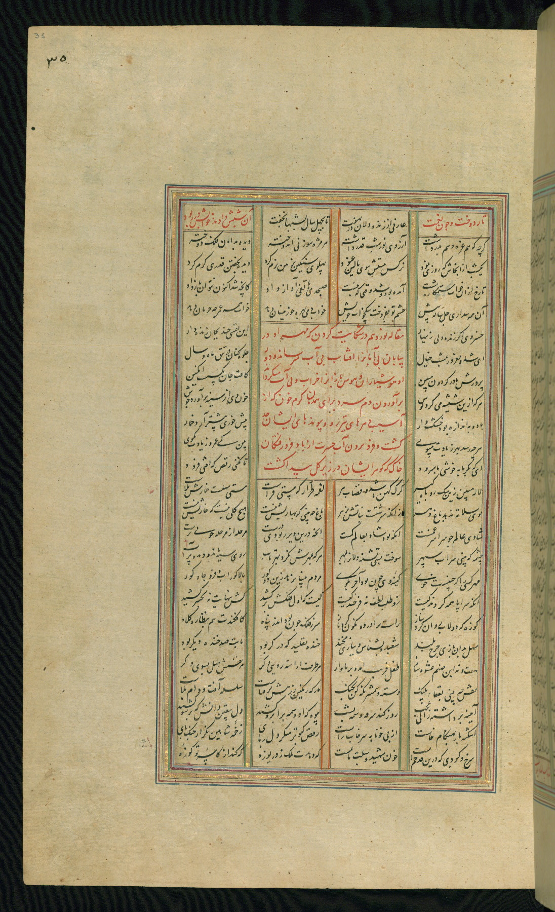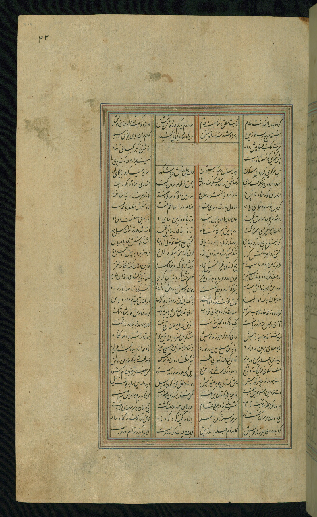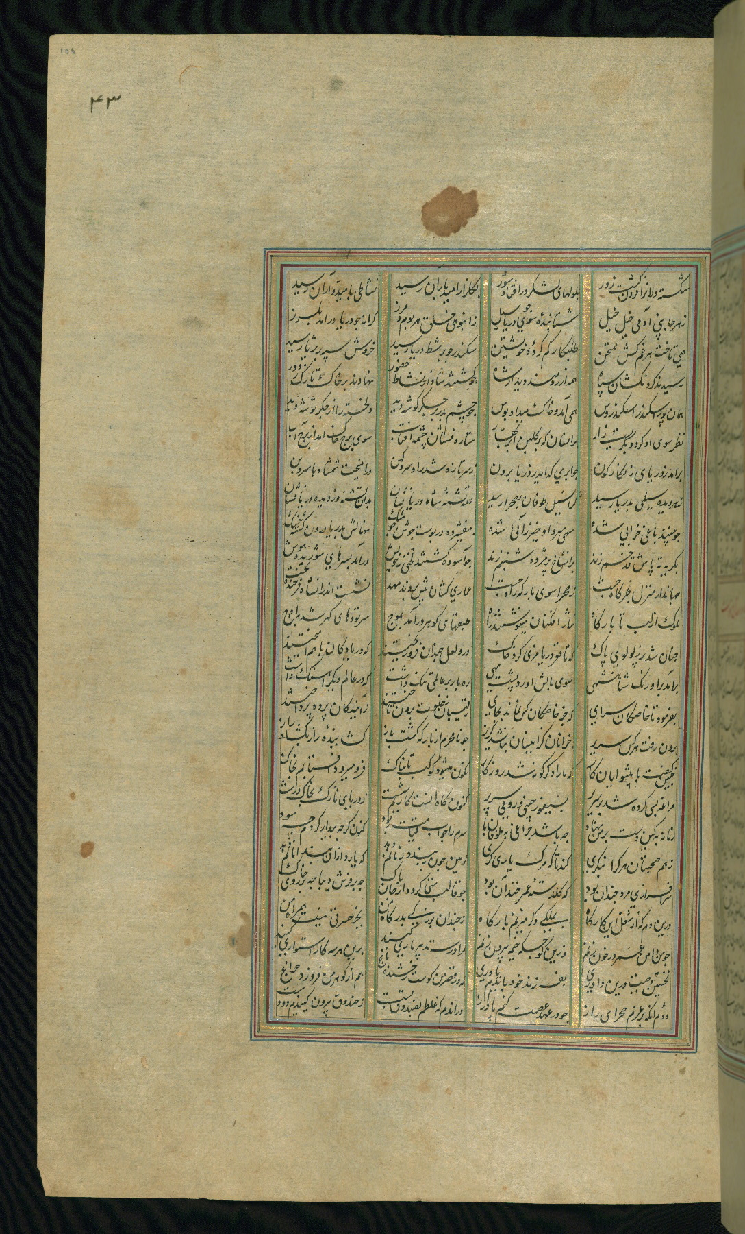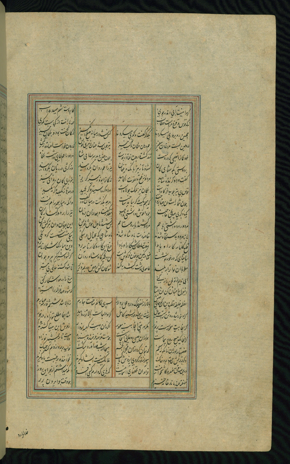 This illuminated and illustrated manuscript contains the Khamsah (quintet) and two historical poems (masnavi), Qirān-i saʿdayn and Nuh sipihr, by Amīr Khusraw Dihlavī (d. 725 AH / 1325 CE). The codex is dated 1017 AH / 1609 CE and was produced in Safavid Iran. All texts are written in black nastaʿlīq script with chapter headings in red. The manuscript opens with an illuminated and illustrated frontispiece of a hunting and court scene in the early Safavid style (fols. 1b-2a). The first text is Khamsah-i Dihlavī (fols. 2b-192a), which is introduced by an illuminated incipit and titlepiece with the title of the first poem of the quintet and the author's name. The second text is Qirān-i saʿdayn, a historical poem (masnavi) about the meeting of Sultan Muʿizz al-Dīn Kayqubād and his father, Nāṣir al-Din Bughrā Khān, on the banks of the Sarjū in Oudh. It is also introduced with an illuminated incipit and titlepiece (fol. 193b). The third text is Nuh sipihr, a historical poem (masnavi) describing the glories of Sultan Quṭb al-Dīn Mubārak Shāh Khaljī’s time, introduced with an illuminated incipit and headpiece (fol. 223b). The dark brown leather binding is original to the manuscript.
