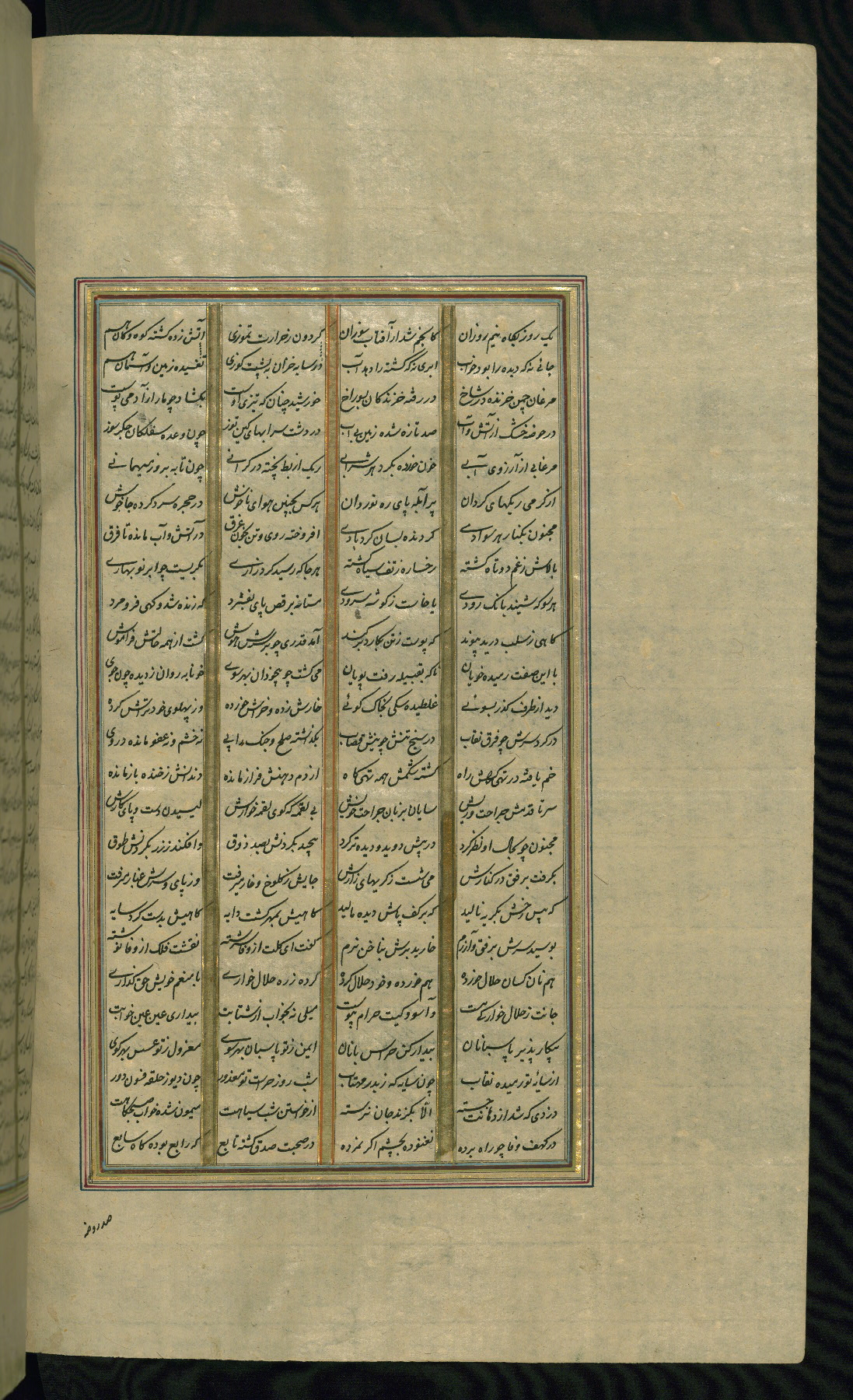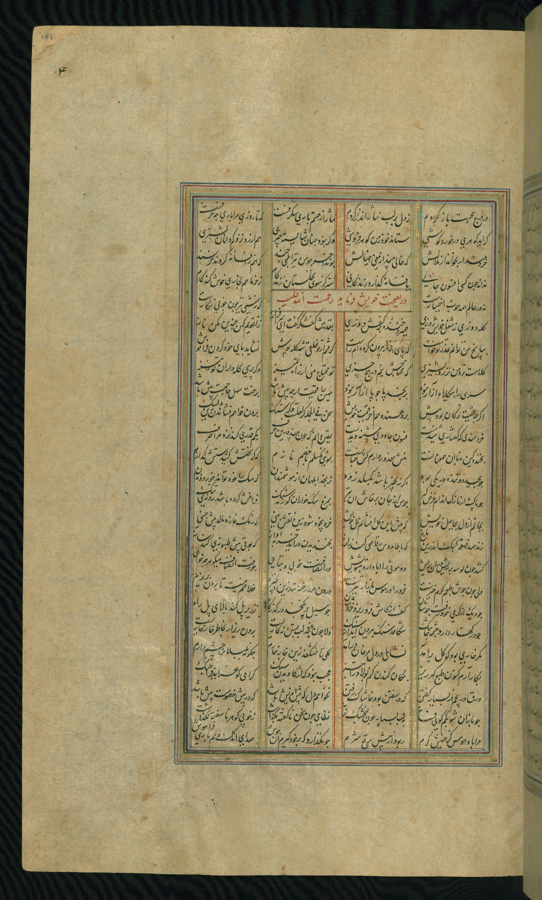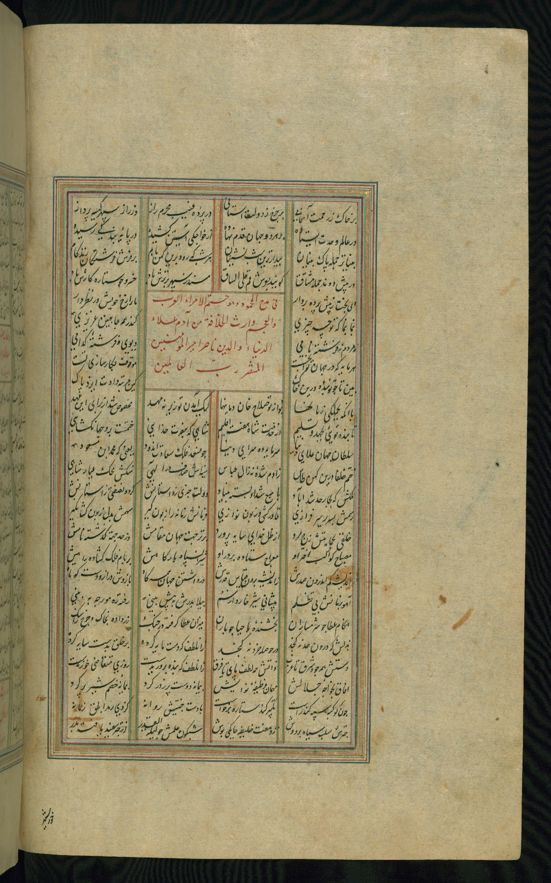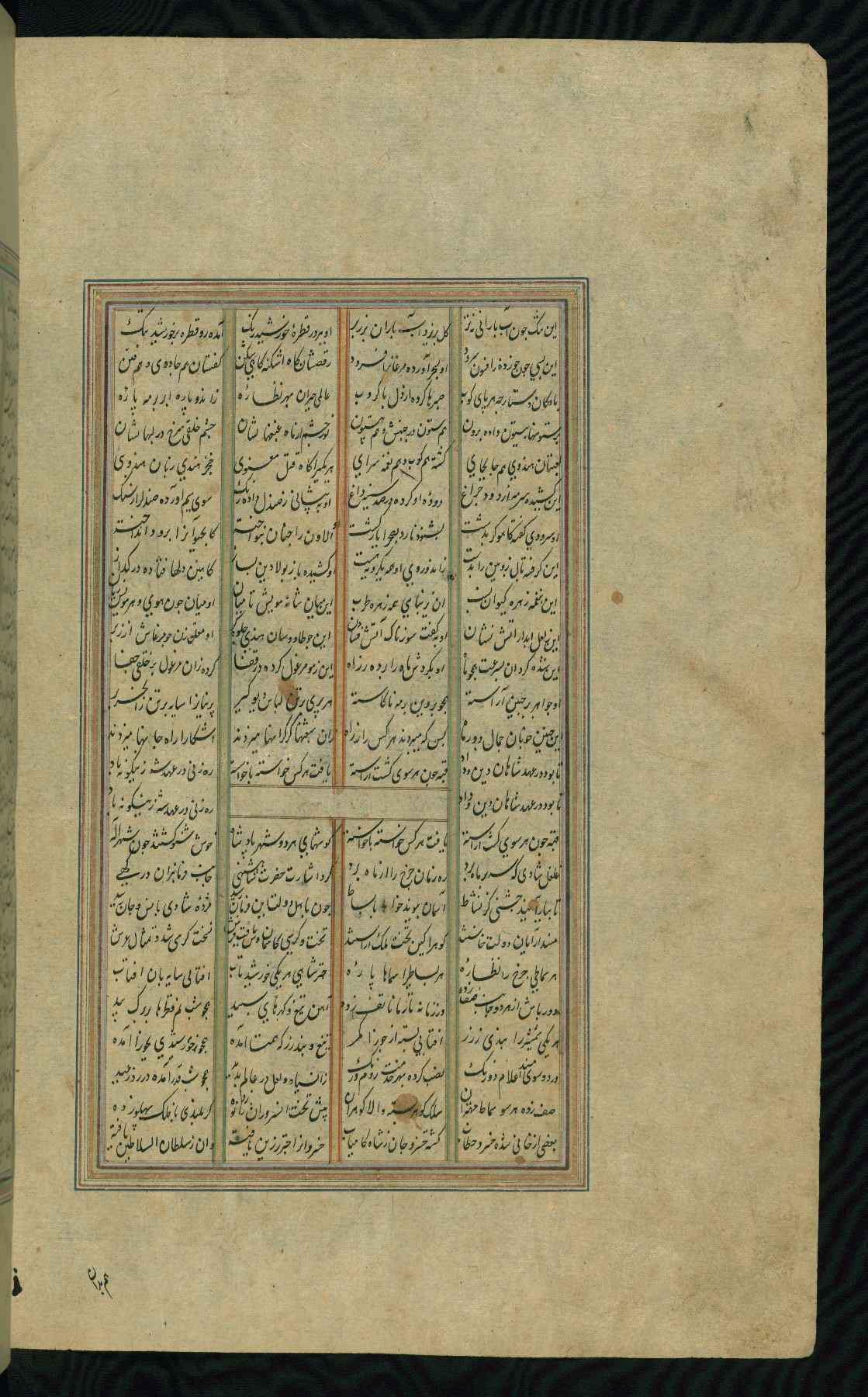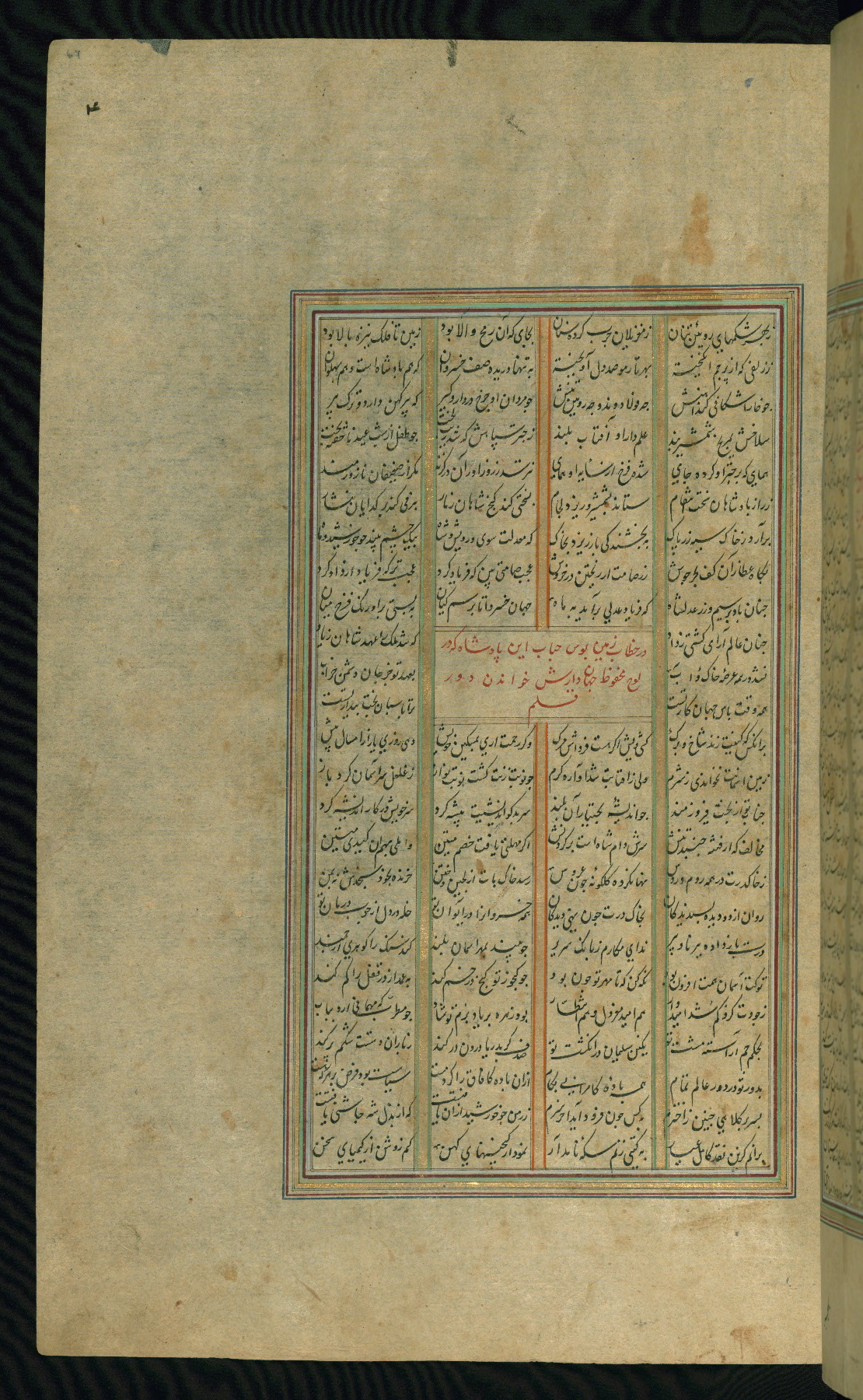 This illuminated and illustrated manuscript contains the Khamsah (quintet) and two historical poems (masnavi), Qirān-i saʿdayn and Nuh sipihr, by Amīr Khusraw Dihlavī (d. 725 AH / 1325 CE). The codex is dated 1017 AH / 1609 CE and was produced in Safavid Iran. All texts are written in black nastaʿlīq script with chapter headings in red. The manuscript opens with an illuminated and illustrated frontispiece of a hunting and court scene in the early Safavid style (fols. 1b-2a). The first text is Khamsah-i Dihlavī (fols. 2b-192a), which is introduced by an illuminated incipit and titlepiece with the title of the first poem of the quintet and the author's name. The second text is Qirān-i saʿdayn, a historical poem (masnavi) about the meeting of Sultan Muʿizz al-Dīn Kayqubād and his father, Nāṣir al-Din Bughrā Khān, on the banks of the Sarjū in Oudh. It is also introduced with an illuminated incipit and titlepiece (fol. 193b). The third text is Nuh sipihr, a historical poem (masnavi) describing the glories of Sultan Quṭb al-Dīn Mubārak Shāh Khaljī’s time, introduced with an illuminated incipit and headpiece (fol. 223b). The dark brown leather binding is original to the manuscript.