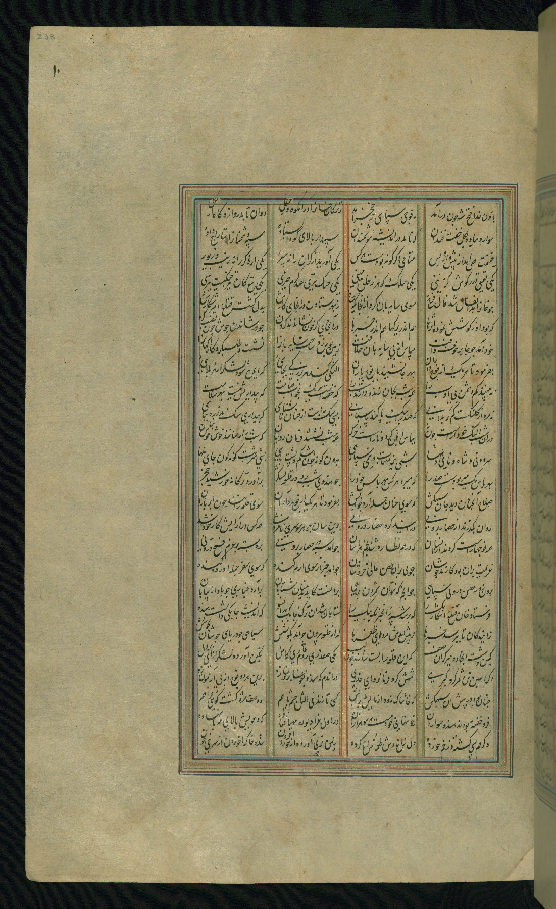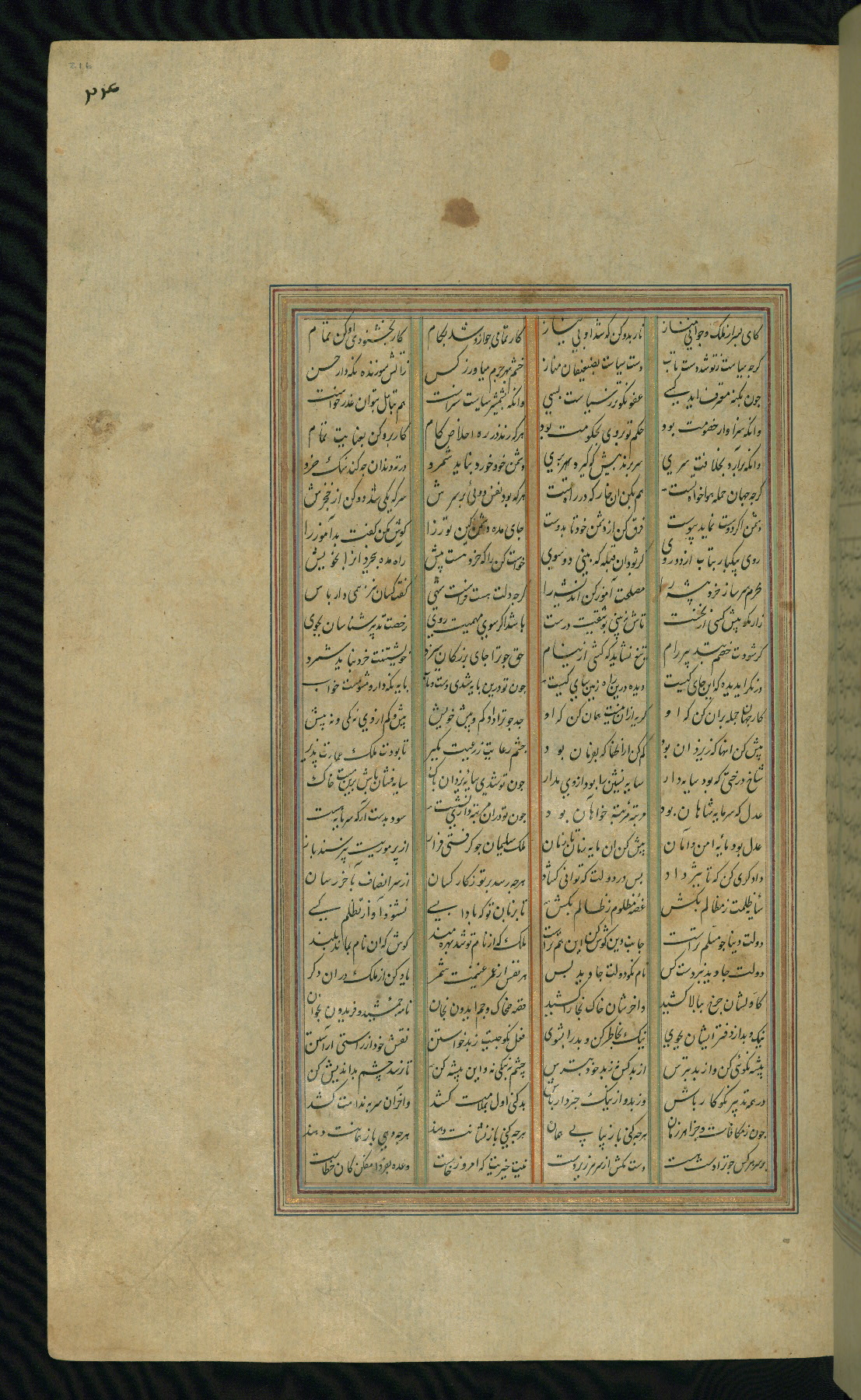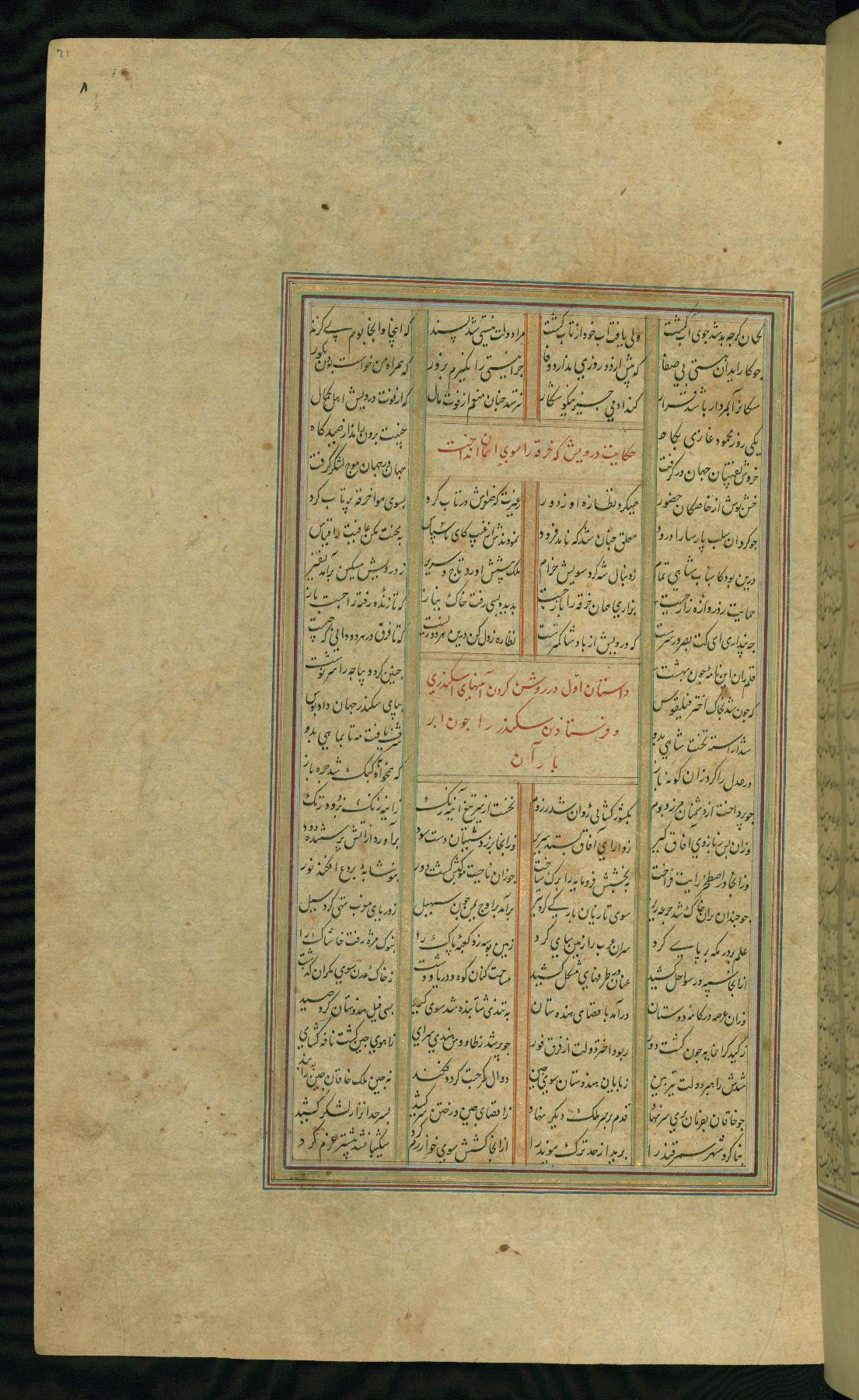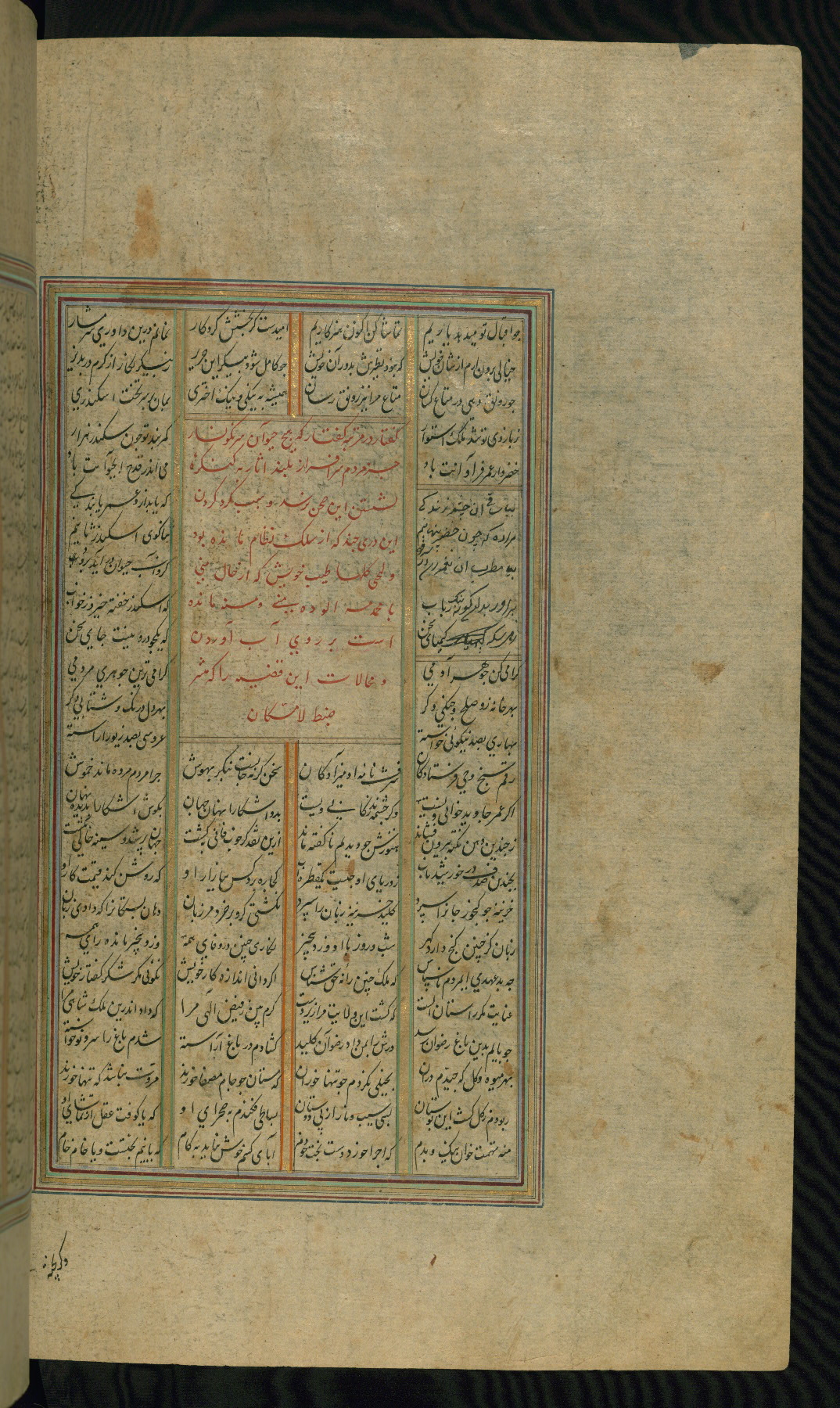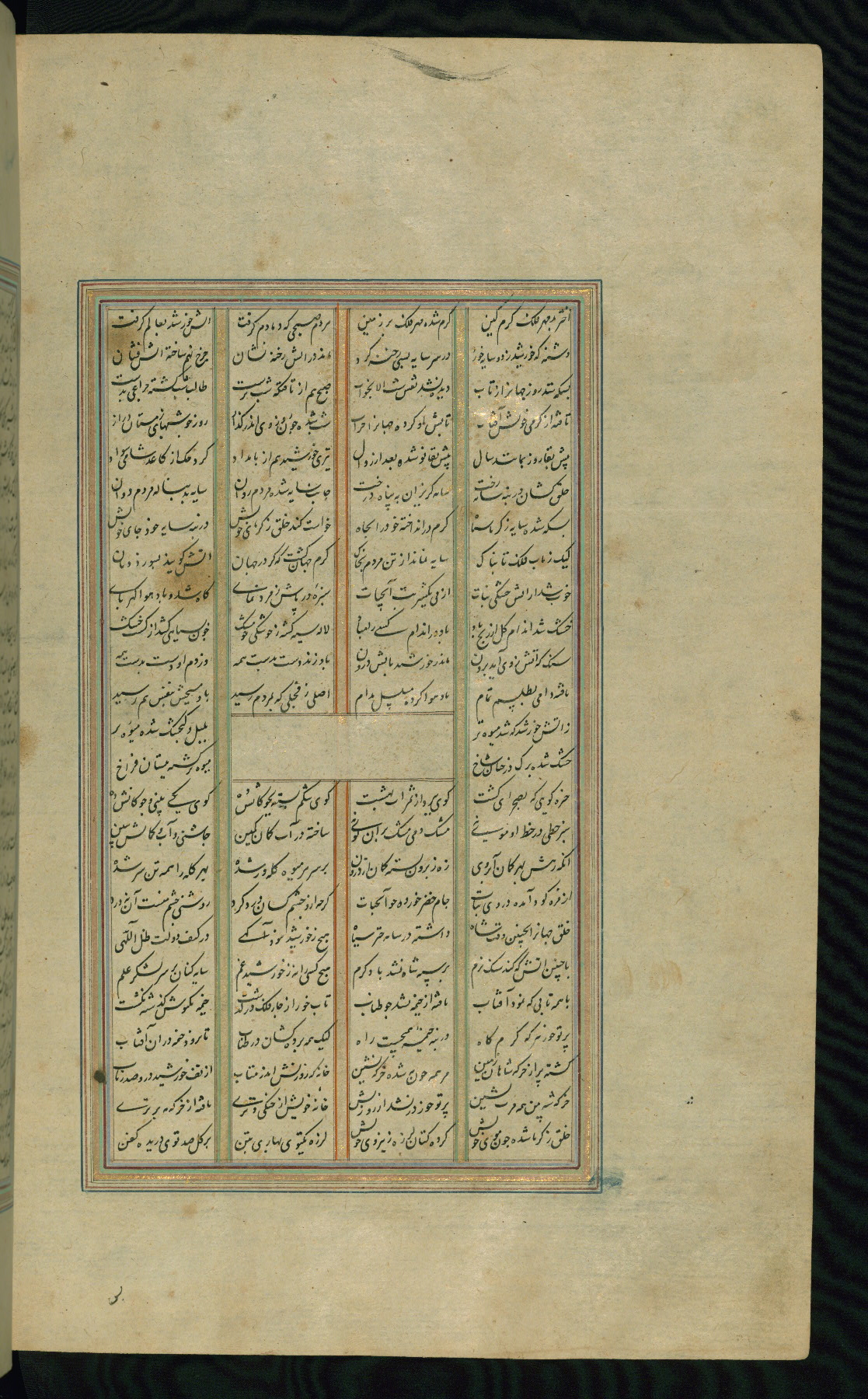 This illuminated and illustrated manuscript contains the Khamsah (quintet) and two historical poems (masnavi), Qirān-i saʿdayn and Nuh sipihr, by Amīr Khusraw Dihlavī (d. 725 AH / 1325 CE). The codex is dated 1017 AH / 1609 CE and was produced in Safavid Iran. All texts are written in black nastaʿlīq script with chapter headings in red. The manuscript opens with an illuminated and illustrated frontispiece of a hunting and court scene in the early Safavid style (fols. 1b-2a). The first text is Khamsah-i Dihlavī (fols. 2b-192a), which is introduced by an illuminated incipit and titlepiece with the title of the first poem of the quintet and the author's name. The second text is Qirān-i saʿdayn, a historical poem (masnavi) about the meeting of Sultan Muʿizz al-Dīn Kayqubād and his father, Nāṣir al-Din Bughrā Khān, on the banks of the Sarjū in Oudh. It is also introduced with an illuminated incipit and titlepiece (fol. 193b). The third text is Nuh sipihr, a historical poem (masnavi) describing the glories of Sultan Quṭb al-Dīn Mubārak Shāh Khaljī’s time, introduced with an illuminated incipit and headpiece (fol. 223b). The dark brown leather binding is original to the manuscript.