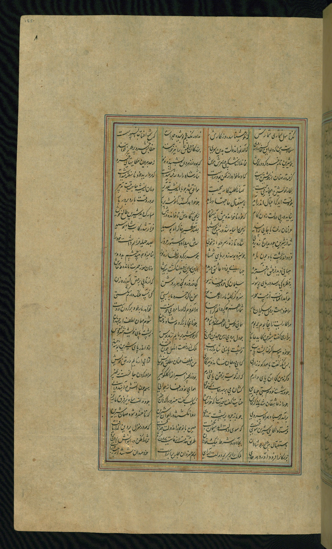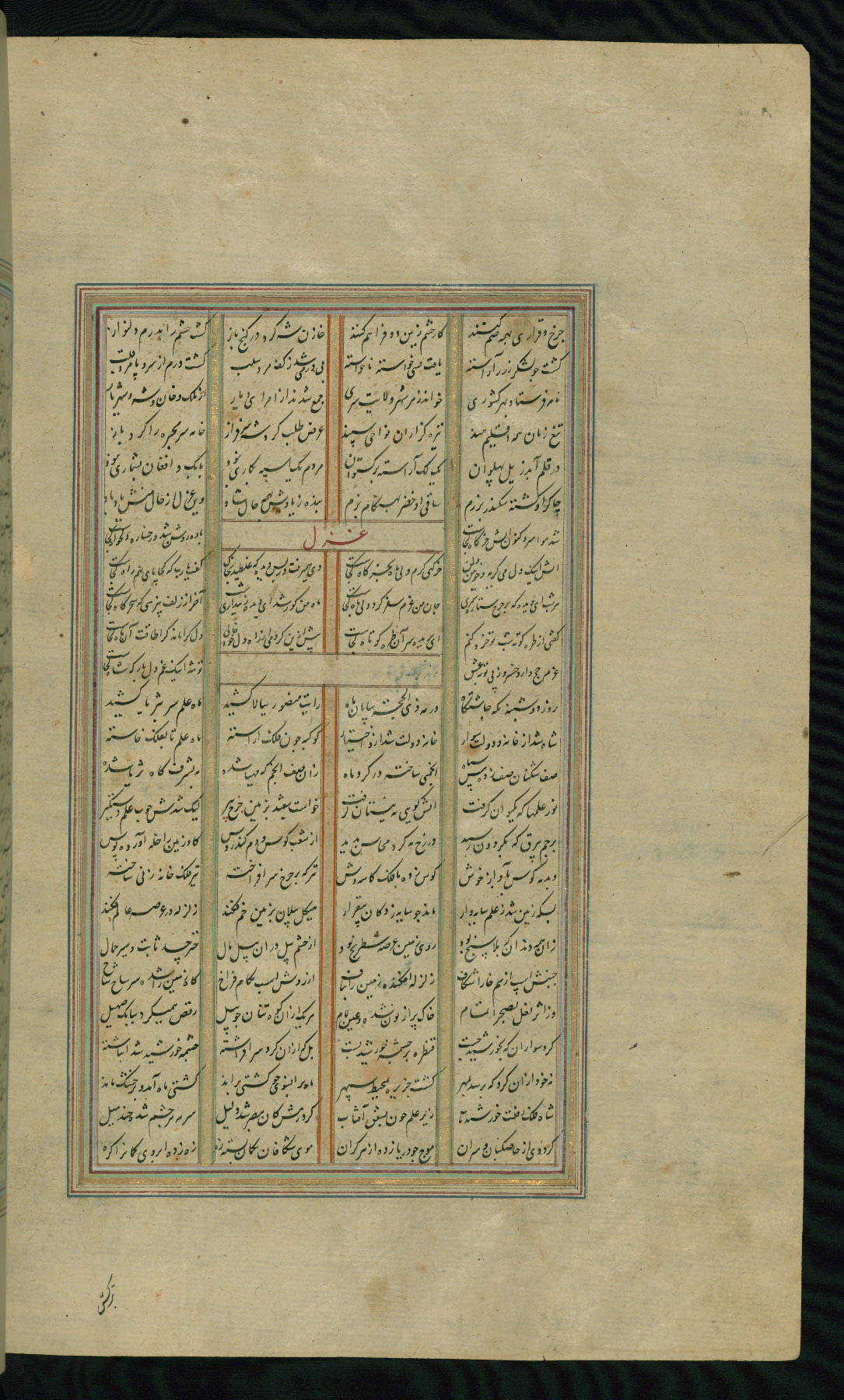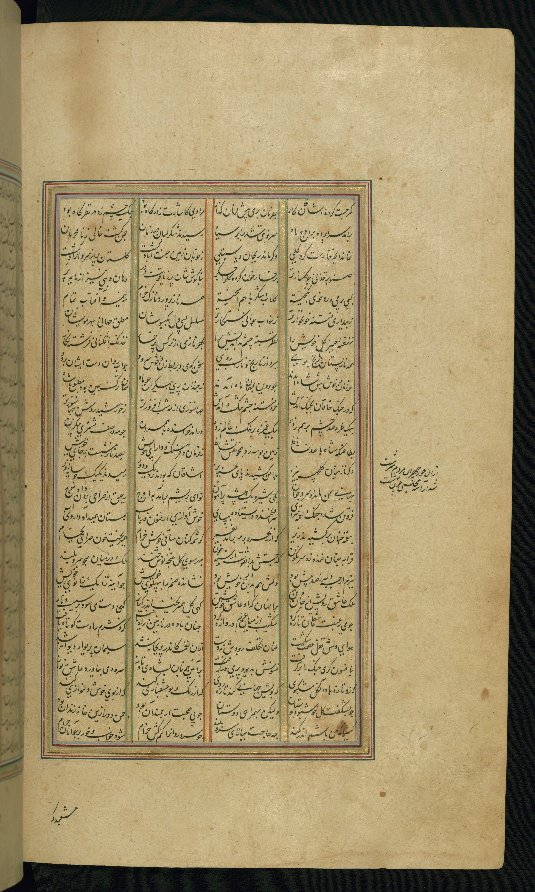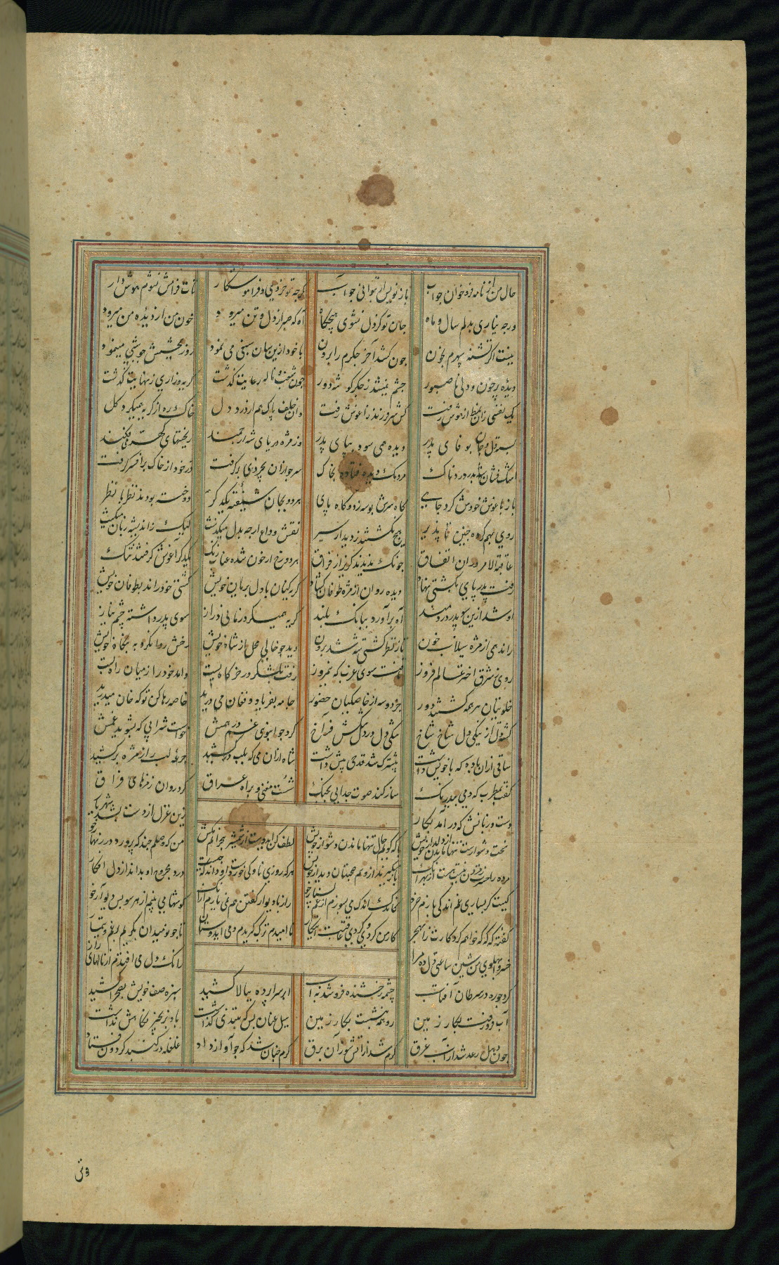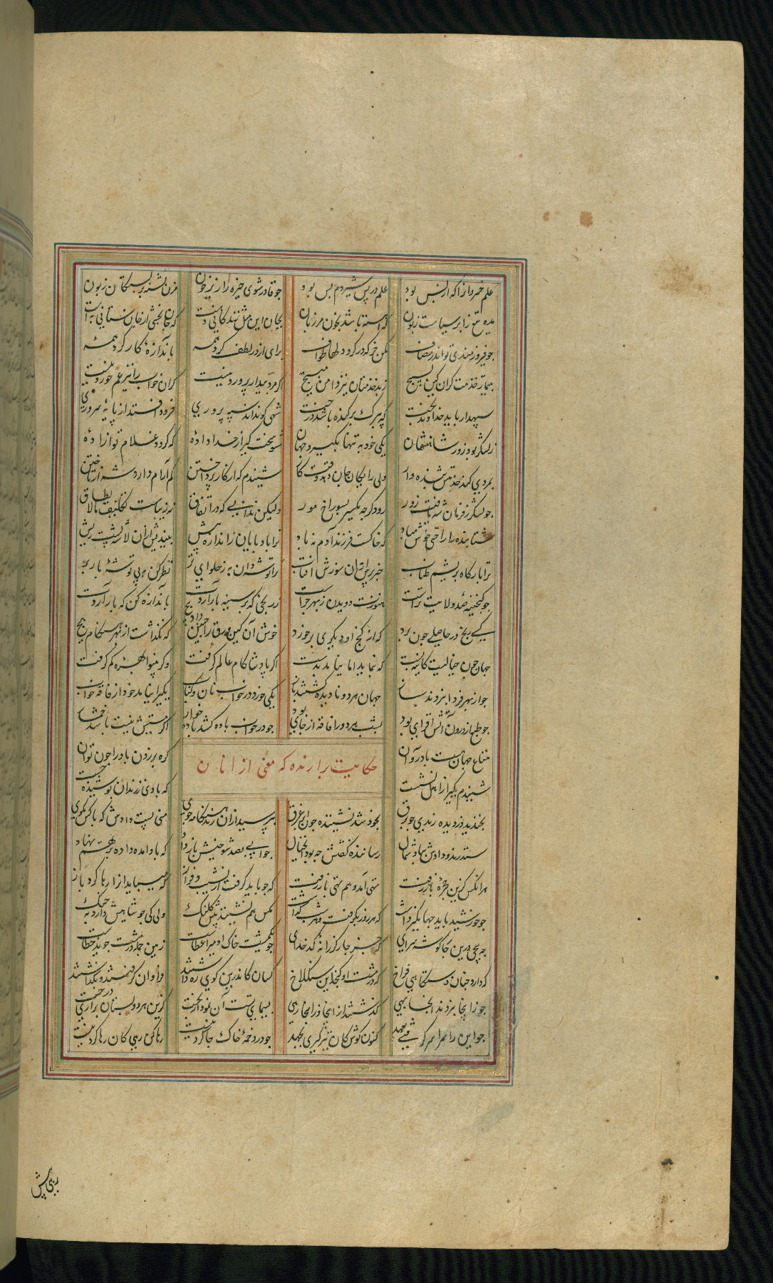 This illuminated and illustrated manuscript contains the Khamsah (quintet) and two historical poems (masnavi), Qirān-i saʿdayn and Nuh sipihr, by Amīr Khusraw Dihlavī (d. 725 AH / 1325 CE). The codex is dated 1017 AH / 1609 CE and was produced in Safavid Iran. All texts are written in black nastaʿlīq script with chapter headings in red. The manuscript opens with an illuminated and illustrated frontispiece of a hunting and court scene in the early Safavid style (fols. 1b-2a). The first text is Khamsah-i Dihlavī (fols. 2b-192a), which is introduced by an illuminated incipit and titlepiece with the title of the first poem of the quintet and the author's name. The second text is Qirān-i saʿdayn, a historical poem (masnavi) about the meeting of Sultan Muʿizz al-Dīn Kayqubād and his father, Nāṣir al-Din Bughrā Khān, on the banks of the Sarjū in Oudh. It is also introduced with an illuminated incipit and titlepiece (fol. 193b). The third text is Nuh sipihr, a historical poem (masnavi) describing the glories of Sultan Quṭb al-Dīn Mubārak Shāh Khaljī’s time, introduced with an illuminated incipit and headpiece (fol. 223b). The dark brown leather binding is original to the manuscript.