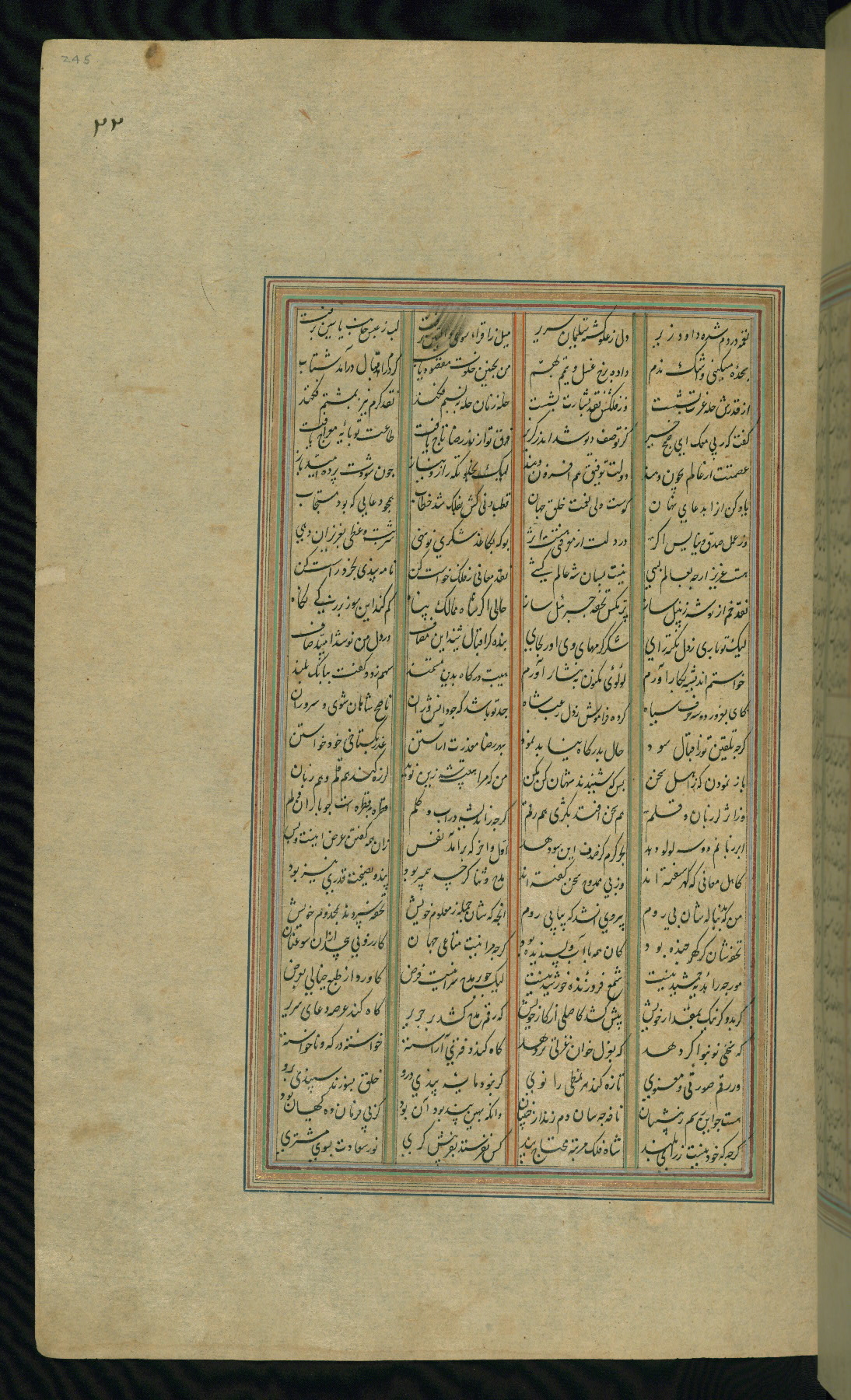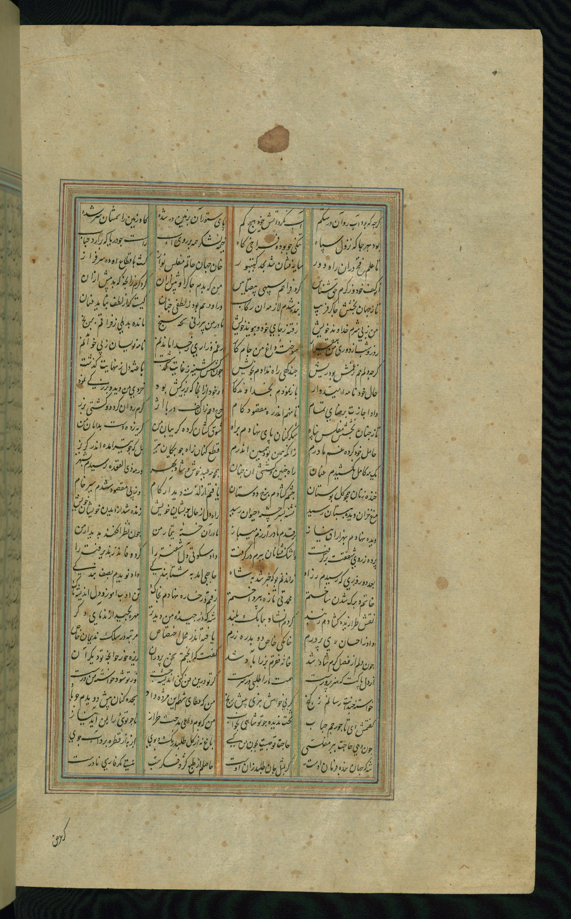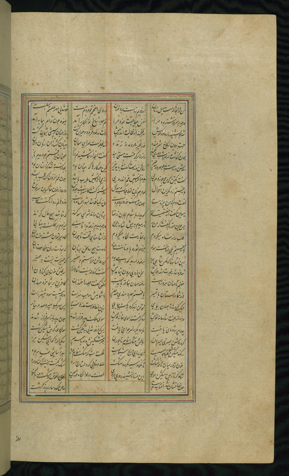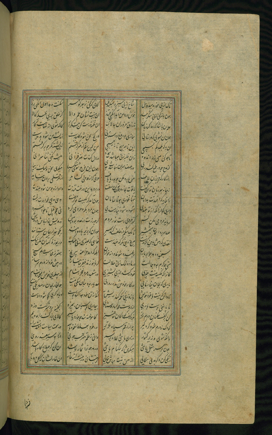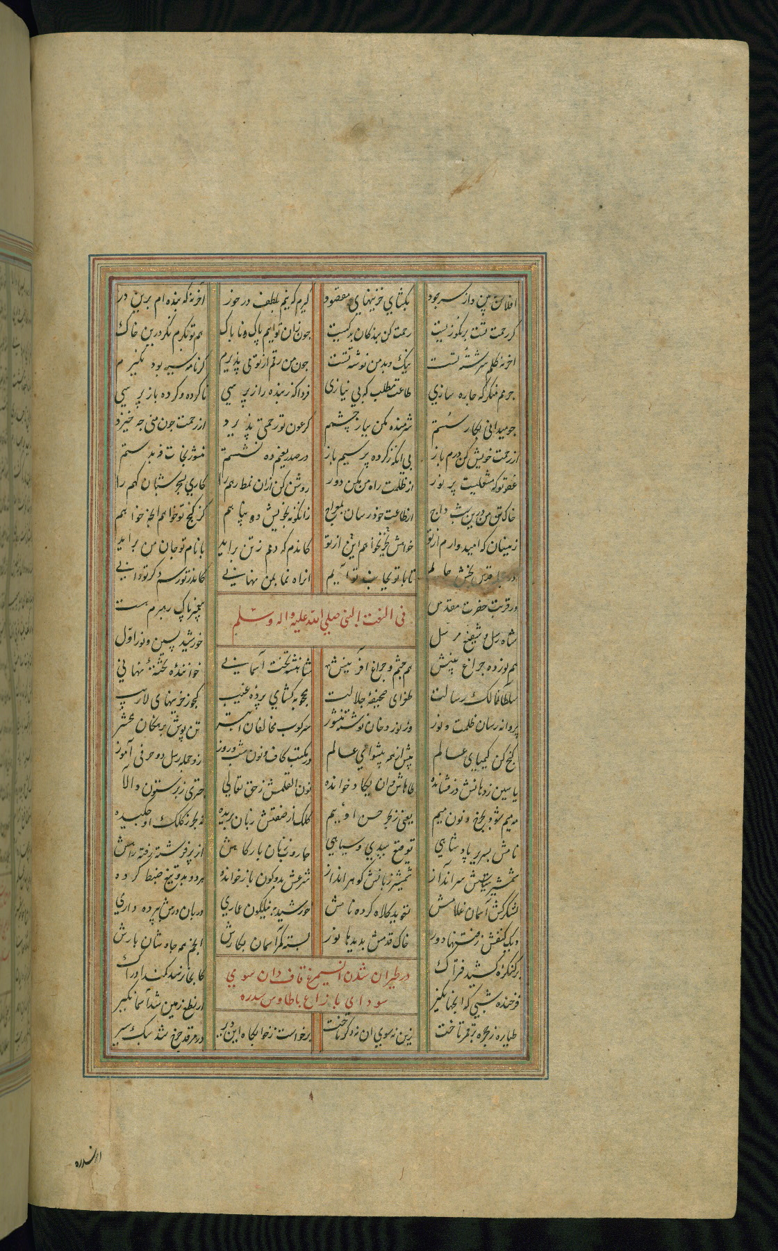This illuminated and illustrated manuscript contains the Khamsah (quintet) and two historical poems (masnavi), Qirān-i saʿdayn and Nuh sipihr, by Amīr Khusraw Dihlavī (d. 725 AH / 1325 CE). The codex is dated 1017 AH / 1609 CE and was produced in Safavid Iran. All texts are written in black nastaʿlīq script with chapter headings in red. The manuscript opens with an illuminated and illustrated frontispiece of a hunting and court scene in the early Safavid style (fols. 1b-2a). The first text is Khamsah-i Dihlavī (fols. 2b-192a), which is introduced by an illuminated incipit and titlepiece with the title of the first poem of the quintet and the author's name. The second text is Qirān-i saʿdayn, a historical poem (masnavi) about the meeting of Sultan Muʿizz al-Dīn Kayqubād and his father, Nāṣir al-Din Bughrā Khān, on the banks of the Sarjū in Oudh. It is also introduced with an illuminated incipit and titlepiece (fol. 193b). The third text is Nuh sipihr, a historical poem (masnavi) describing the glories of Sultan Quṭb al-Dīn Mubārak Shāh Khaljī’s time, introduced with an illuminated incipit and headpiece (fol. 223b). The dark brown leather binding is original to the manuscript.