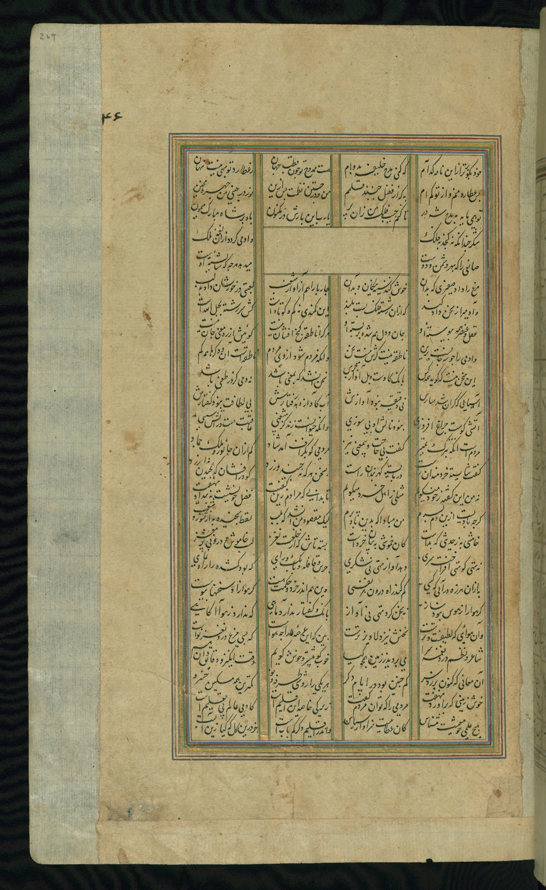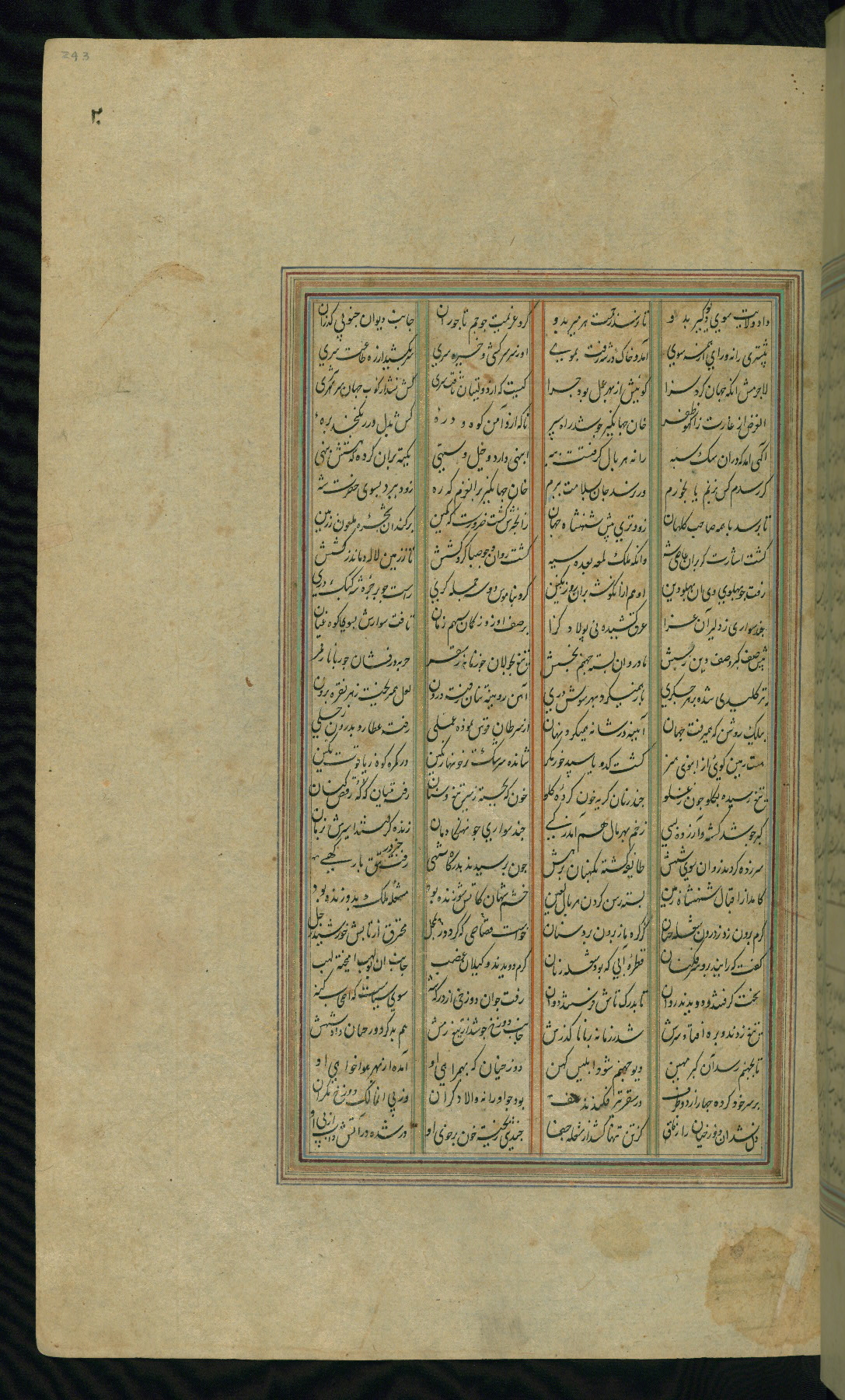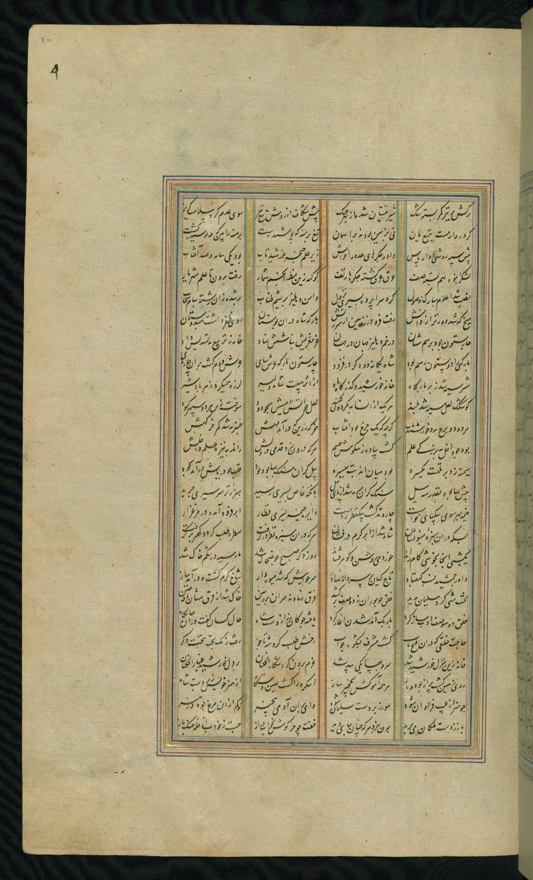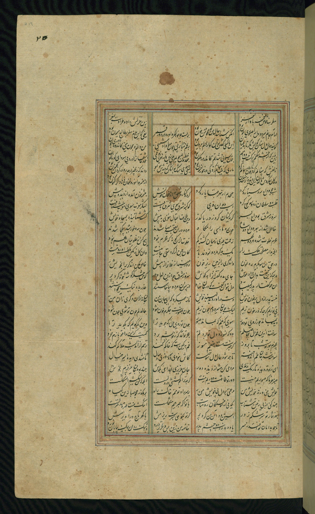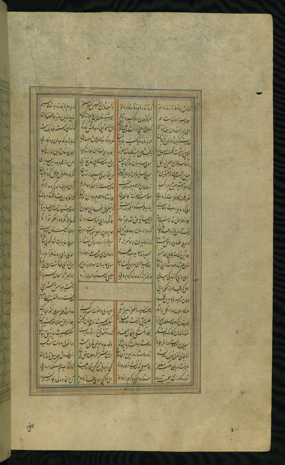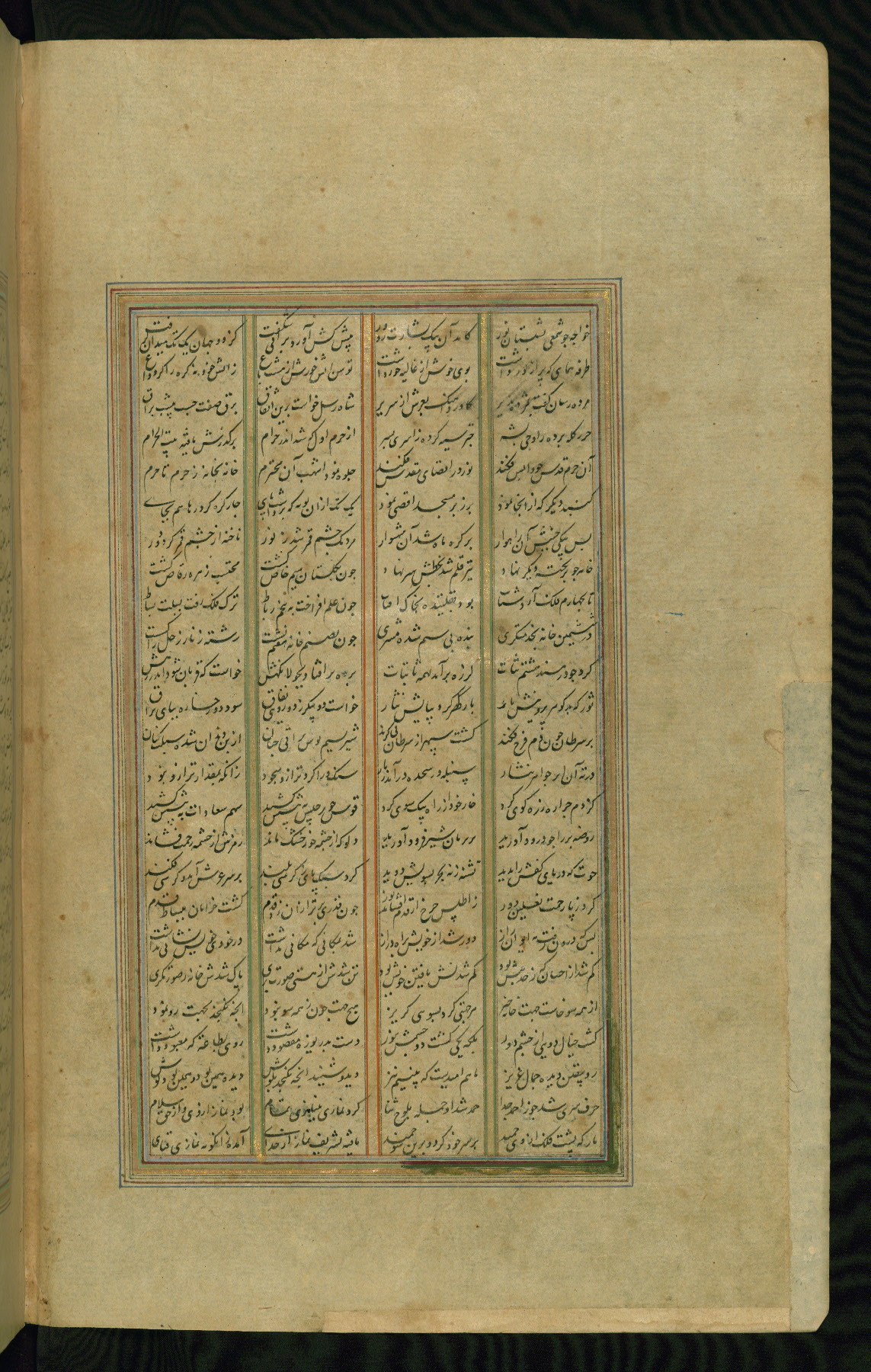 This illuminated and illustrated manuscript contains the Khamsah (quintet) and two historical poems (masnavi), Qirān-i saʿdayn and Nuh sipihr, by Amīr Khusraw Dihlavī (d. 725 AH / 1325 CE). The codex is dated 1017 AH / 1609 CE and was produced in Safavid Iran. All texts are written in black nastaʿlīq script with chapter headings in red. The manuscript opens with an illuminated and illustrated frontispiece of a hunting and court scene in the early Safavid style (fols. 1b-2a). The first text is Khamsah-i Dihlavī (fols. 2b-192a), which is introduced by an illuminated incipit and titlepiece with the title of the first poem of the quintet and the author's name. The second text is Qirān-i saʿdayn, a historical poem (masnavi) about the meeting of Sultan Muʿizz al-Dīn Kayqubād and his father, Nāṣir al-Din Bughrā Khān, on the banks of the Sarjū in Oudh. It is also introduced with an illuminated incipit and titlepiece (fol. 193b). The third text is Nuh sipihr, a historical poem (masnavi) describing the glories of Sultan Quṭb al-Dīn Mubārak Shāh Khaljī’s time, introduced with an illuminated incipit and headpiece (fol. 223b). The dark brown leather binding is original to the manuscript.