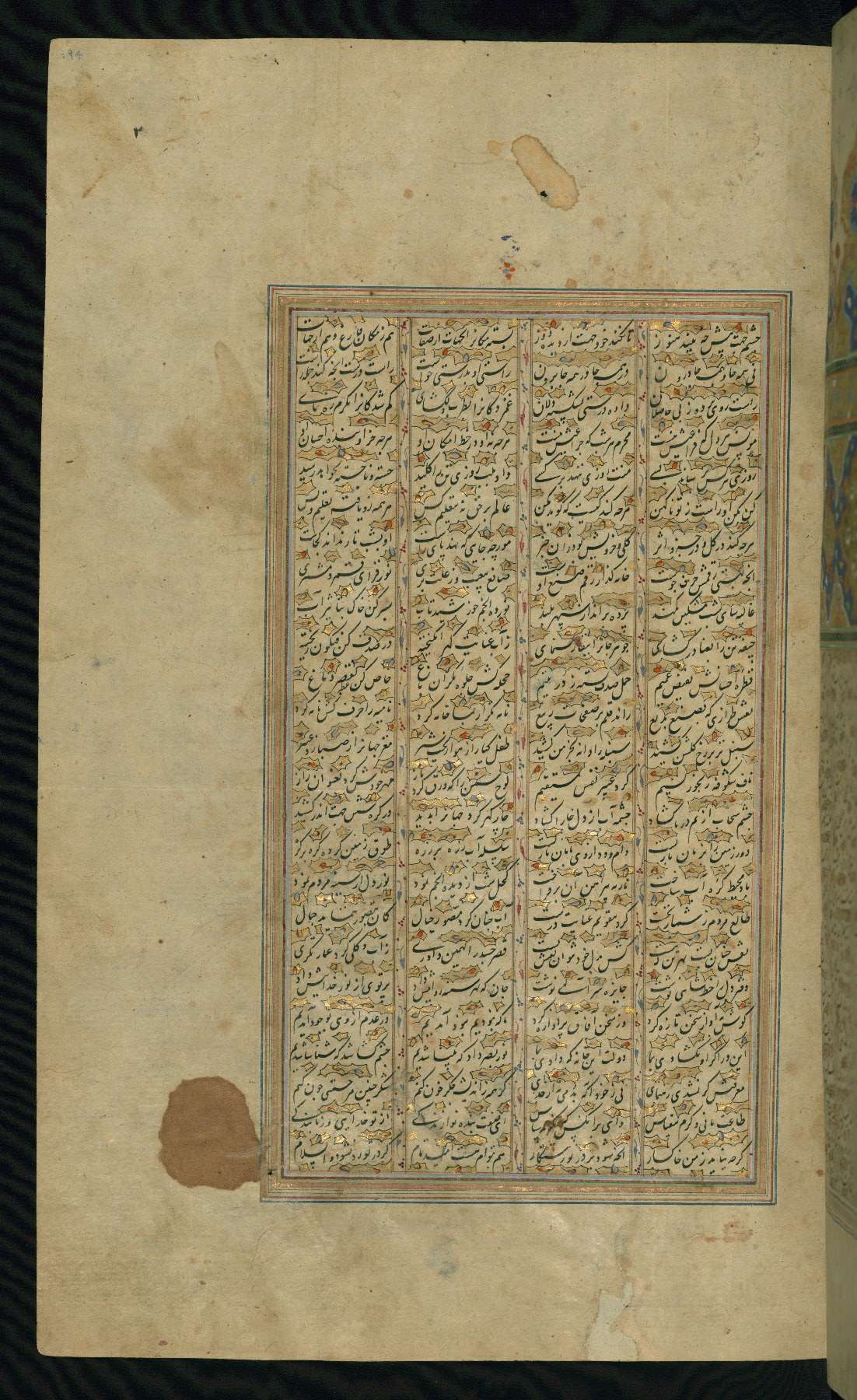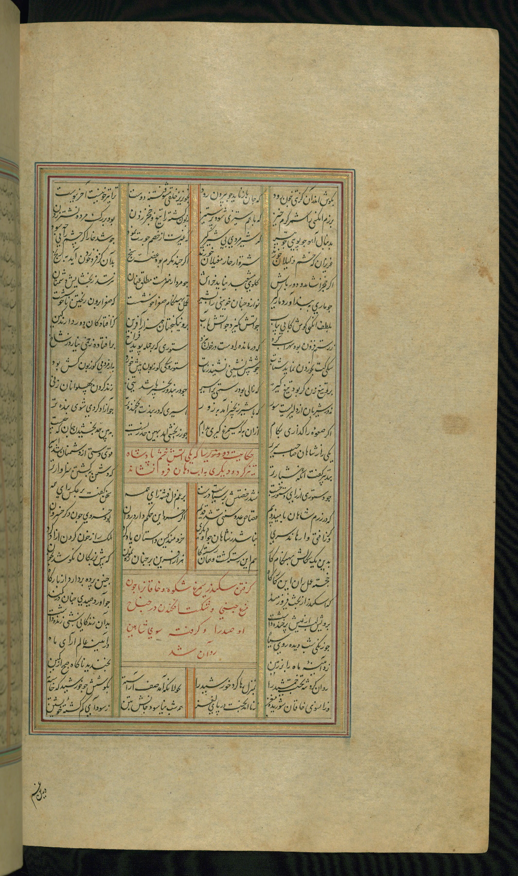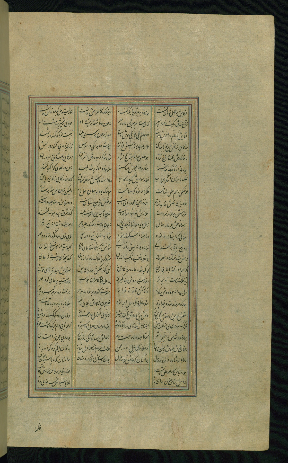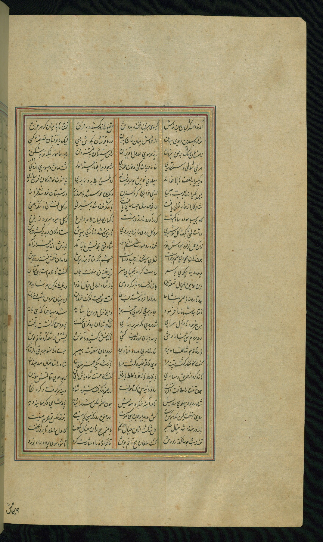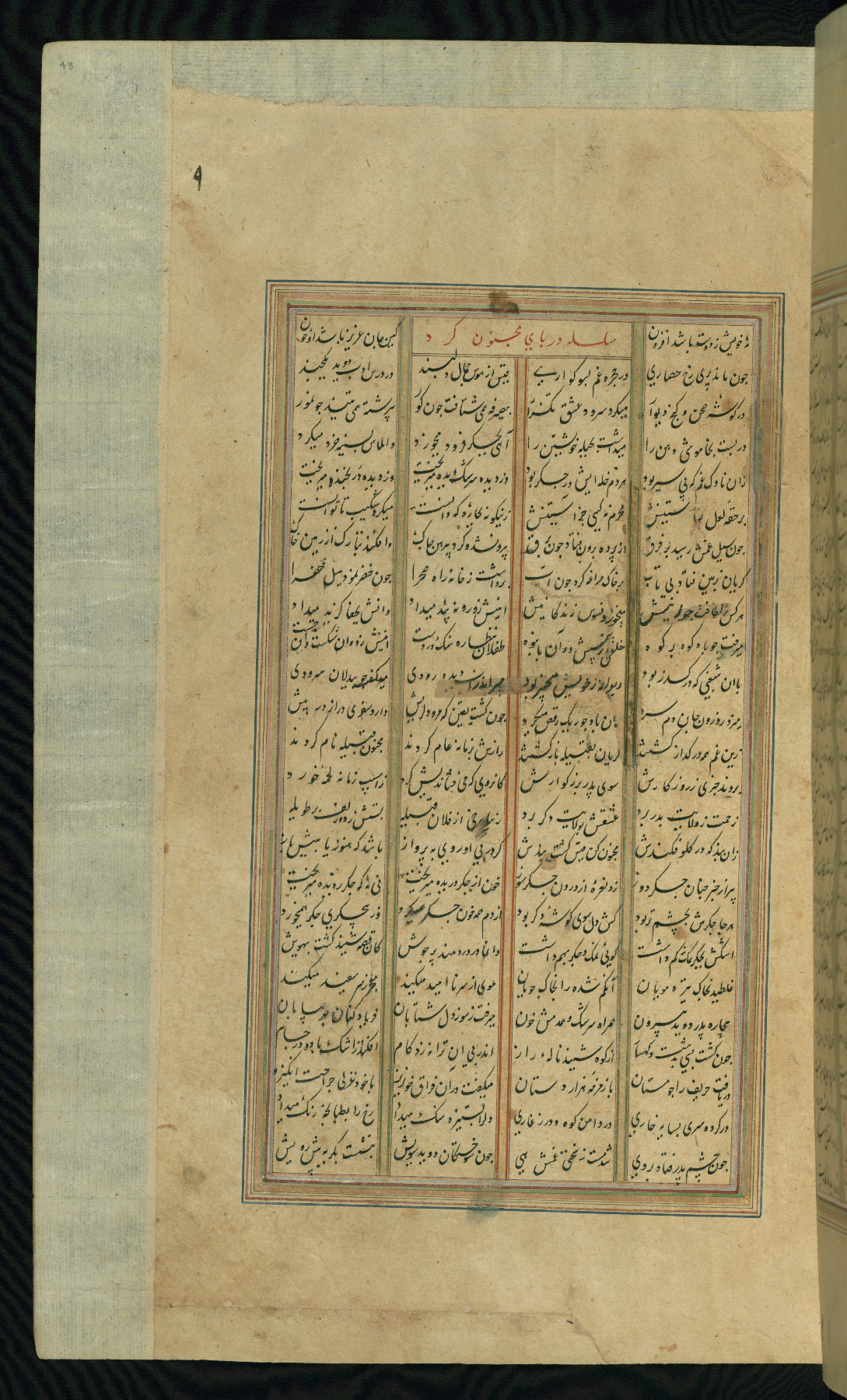 This illuminated and illustrated manuscript contains the Khamsah (quintet) and two historical poems (masnavi), Qirān-i saʿdayn and Nuh sipihr, by Amīr Khusraw Dihlavī (d. 725 AH / 1325 CE). The codex is dated 1017 AH / 1609 CE and was produced in Safavid Iran. All texts are written in black nastaʿlīq script with chapter headings in red. The manuscript opens with an illuminated and illustrated frontispiece of a hunting and court scene in the early Safavid style (fols. 1b-2a). The first text is Khamsah-i Dihlavī (fols. 2b-192a), which is introduced by an illuminated incipit and titlepiece with the title of the first poem of the quintet and the author's name. The second text is Qirān-i saʿdayn, a historical poem (masnavi) about the meeting of Sultan Muʿizz al-Dīn Kayqubād and his father, Nāṣir al-Din Bughrā Khān, on the banks of the Sarjū in Oudh. It is also introduced with an illuminated incipit and titlepiece (fol. 193b). The third text is Nuh sipihr, a historical poem (masnavi) describing the glories of Sultan Quṭb al-Dīn Mubārak Shāh Khaljī’s time, introduced with an illuminated incipit and headpiece (fol. 223b). The dark brown leather binding is original to the manuscript.