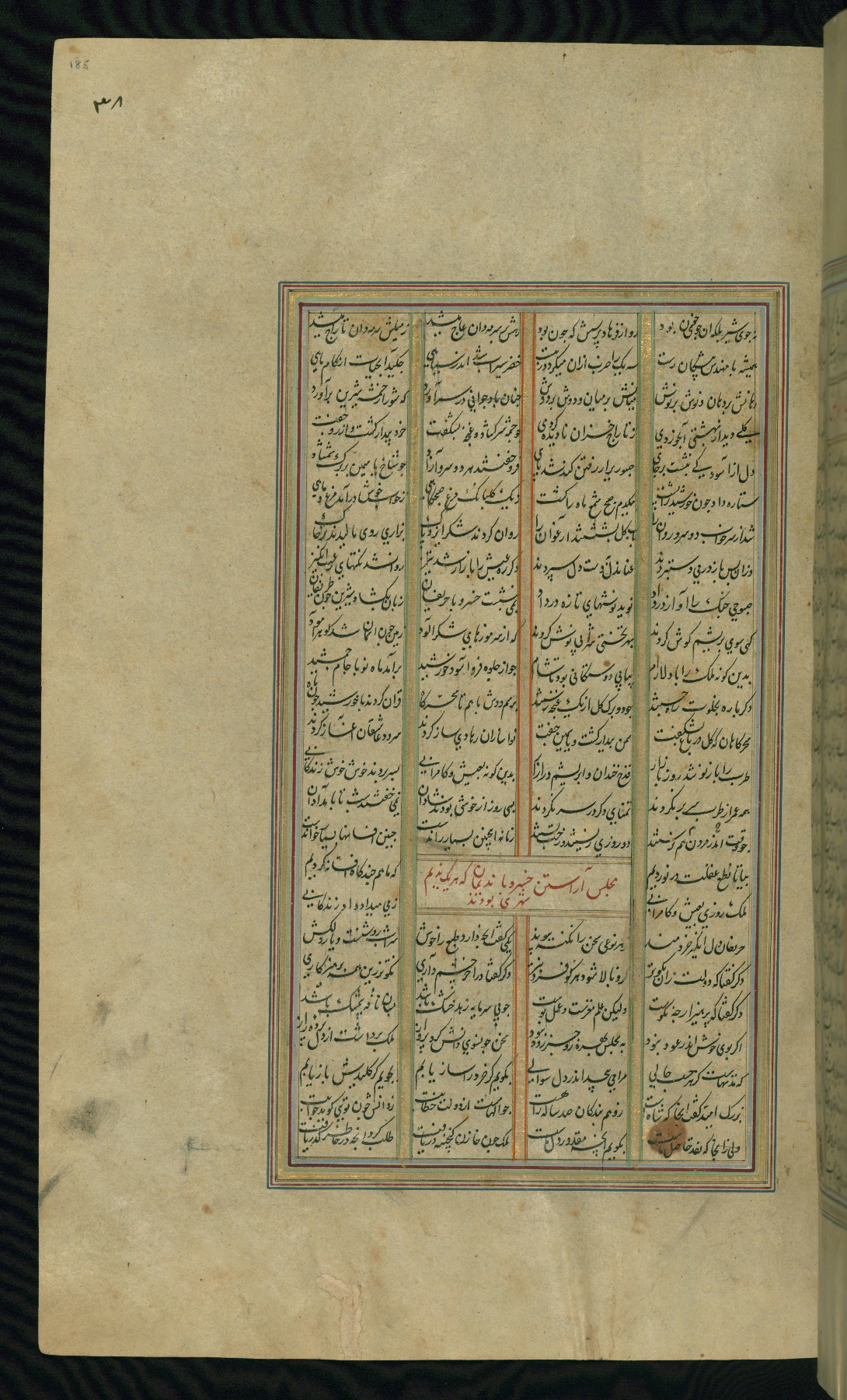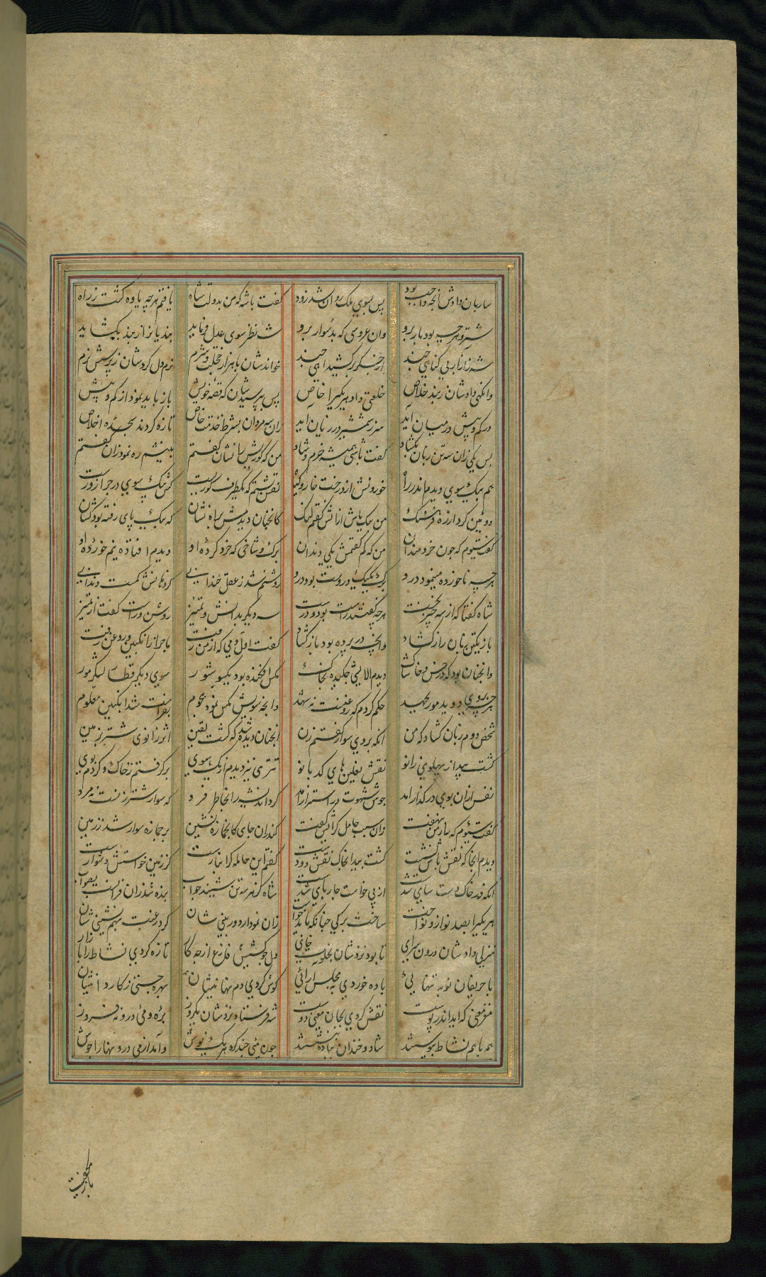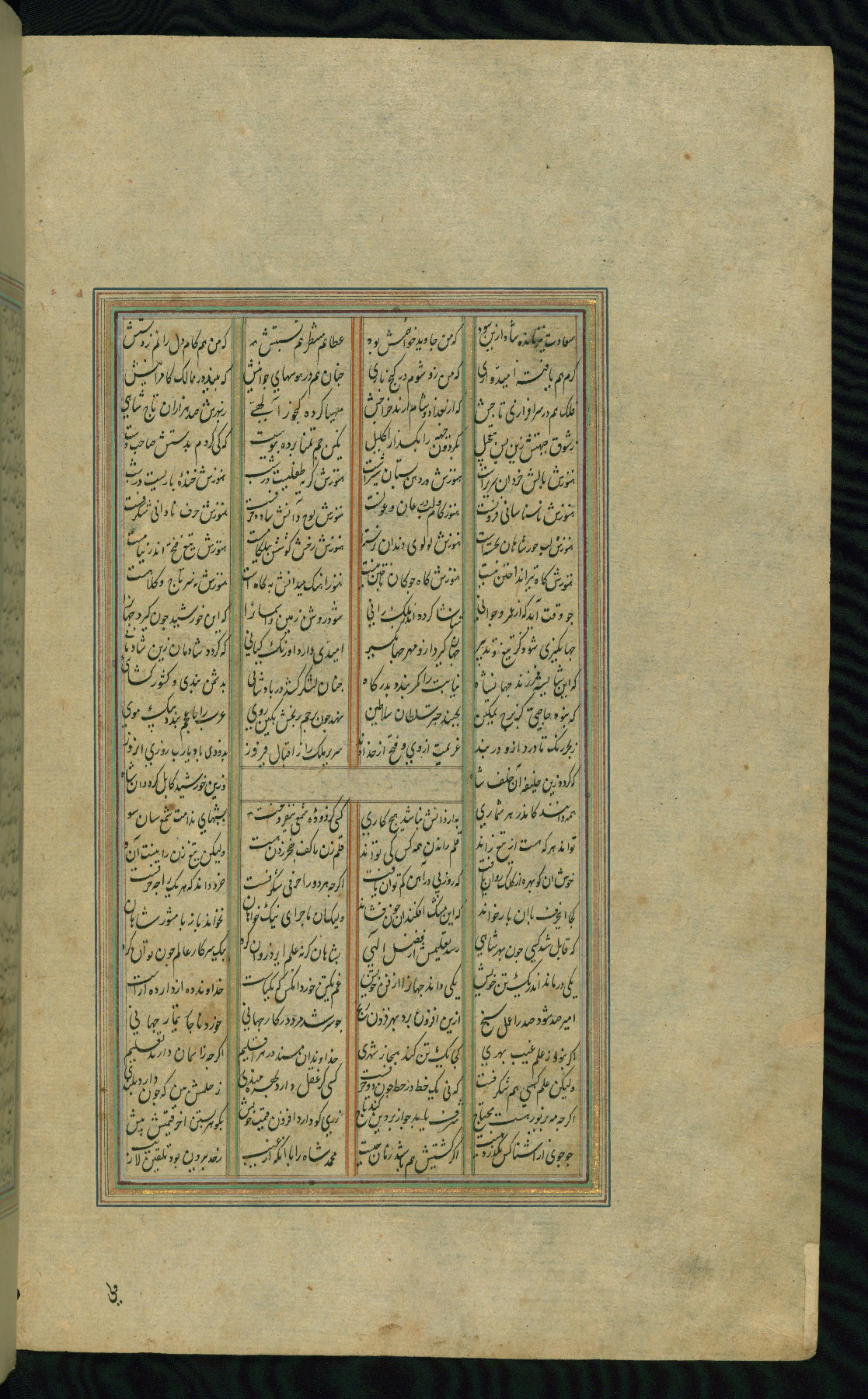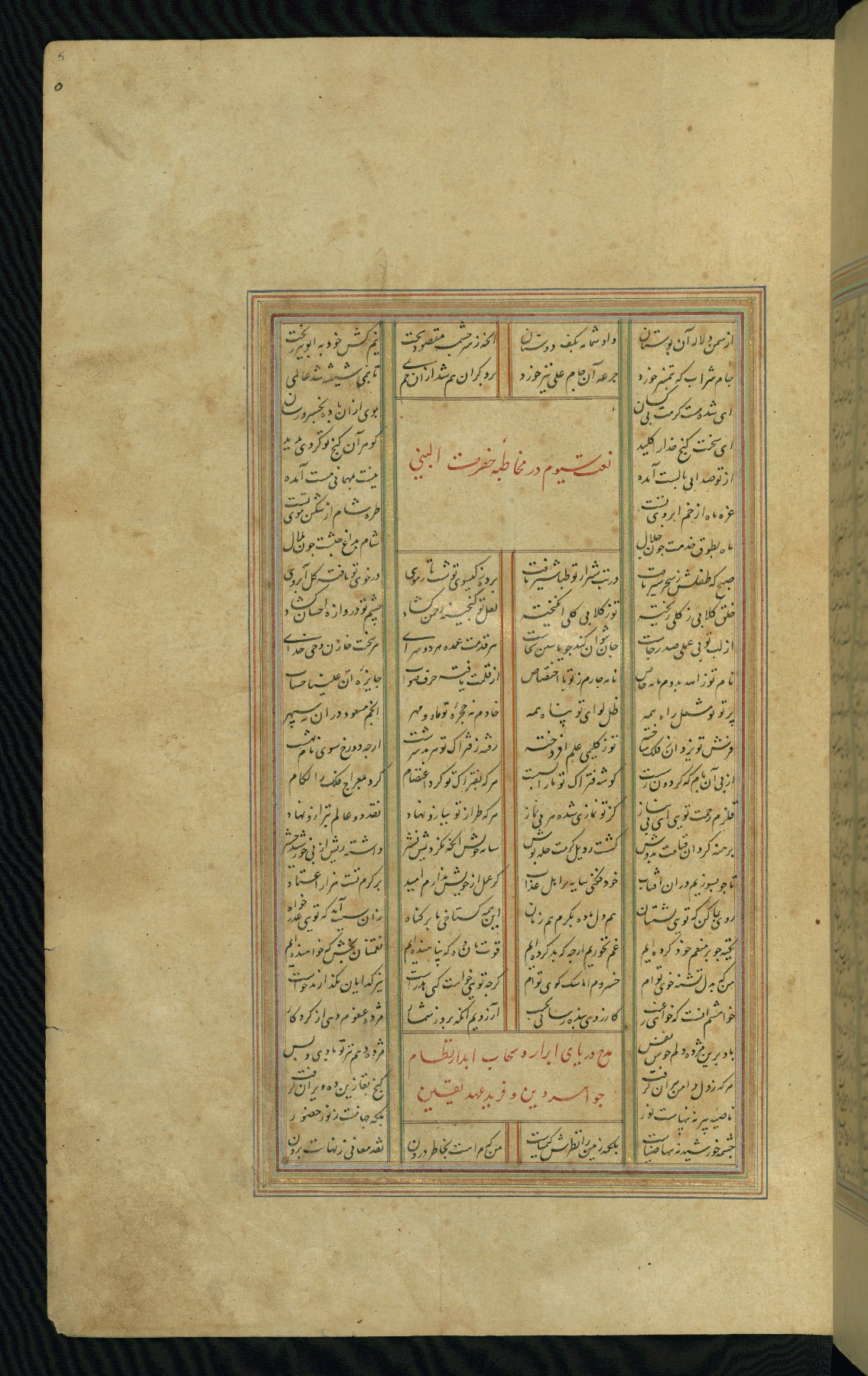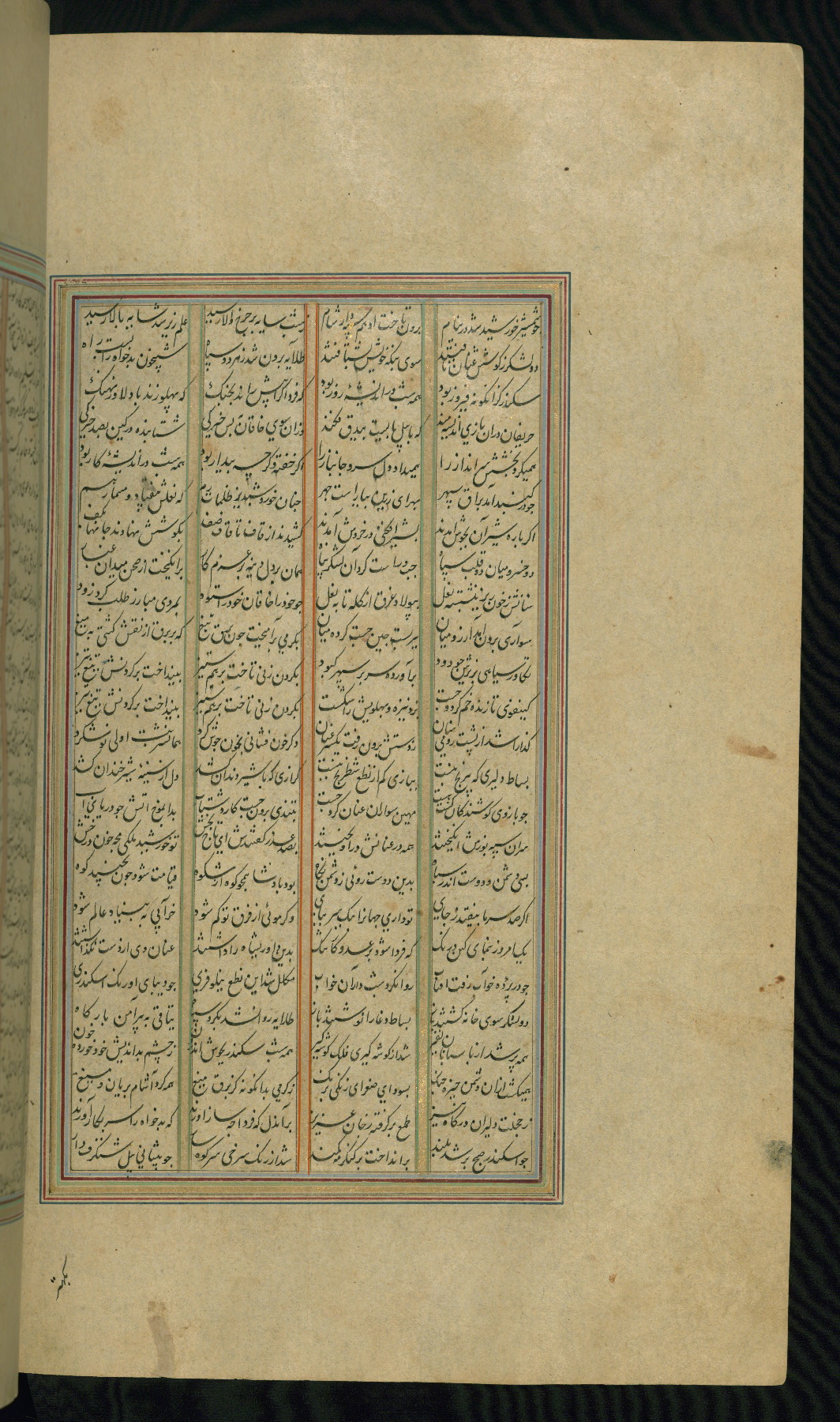 This illuminated and illustrated manuscript contains the Khamsah (quintet) and two historical poems (masnavi), Qirān-i saʿdayn and Nuh sipihr, by Amīr Khusraw Dihlavī (d. 725 AH / 1325 CE). The codex is dated 1017 AH / 1609 CE and was produced in Safavid Iran. All texts are written in black nastaʿlīq script with chapter headings in red. The manuscript opens with an illuminated and illustrated frontispiece of a hunting and court scene in the early Safavid style (fols. 1b-2a). The first text is Khamsah-i Dihlavī (fols. 2b-192a), which is introduced by an illuminated incipit and titlepiece with the title of the first poem of the quintet and the author's name. The second text is Qirān-i saʿdayn, a historical poem (masnavi) about the meeting of Sultan Muʿizz al-Dīn Kayqubād and his father, Nāṣir al-Din Bughrā Khān, on the banks of the Sarjū in Oudh. It is also introduced with an illuminated incipit and titlepiece (fol. 193b). The third text is Nuh sipihr, a historical poem (masnavi) describing the glories of Sultan Quṭb al-Dīn Mubārak Shāh Khaljī’s time, introduced with an illuminated incipit and headpiece (fol. 223b). The dark brown leather binding is original to the manuscript.