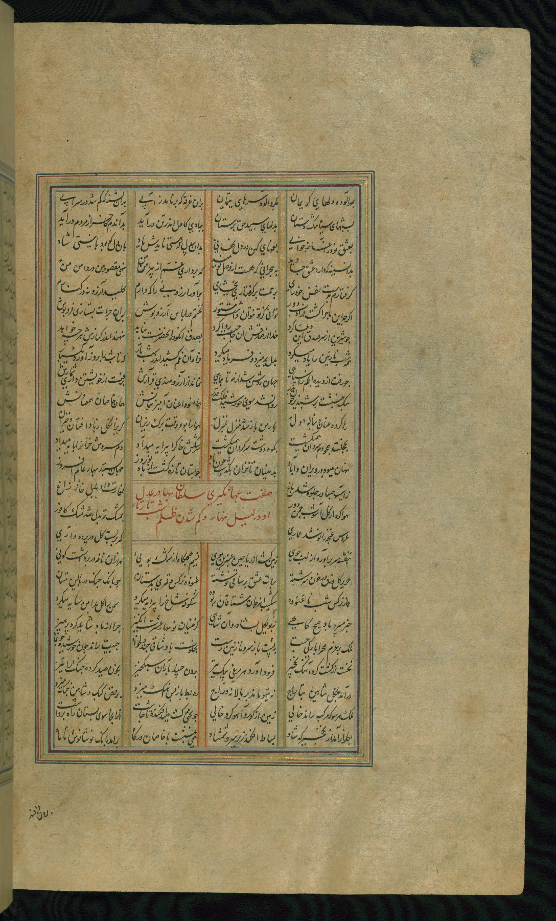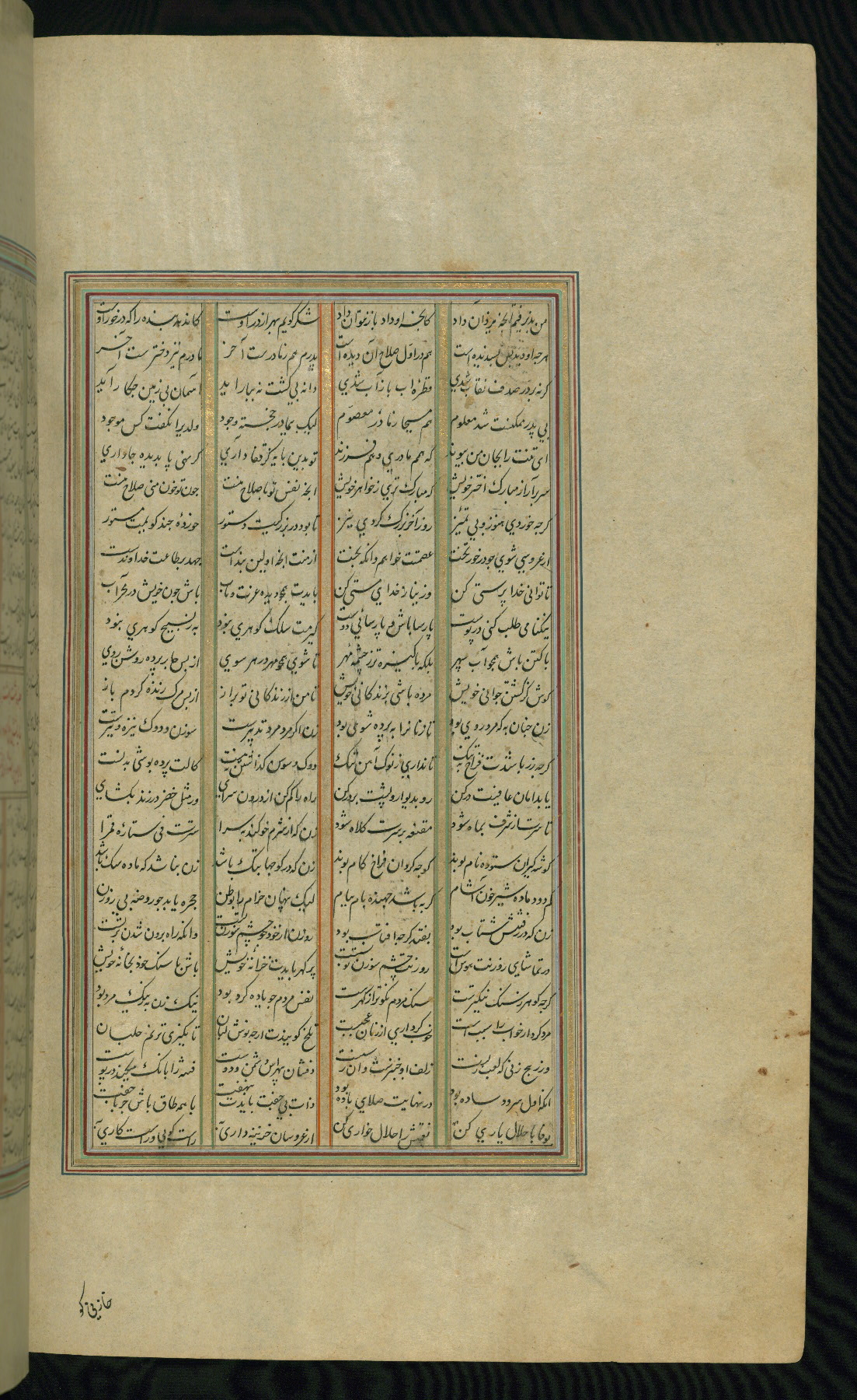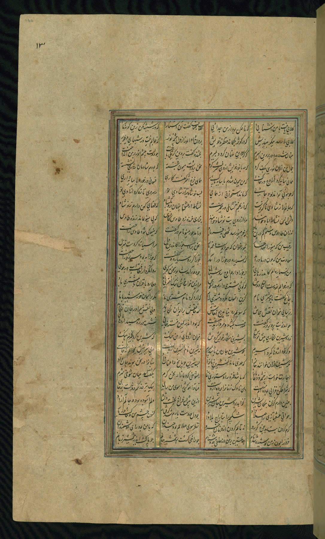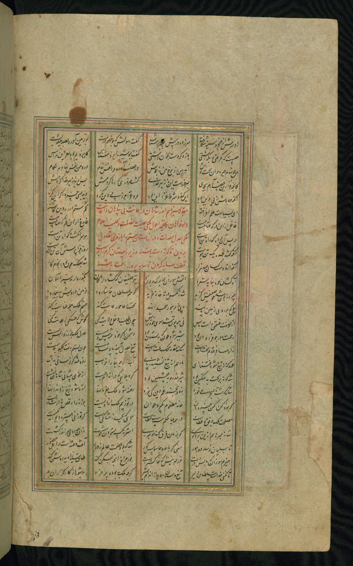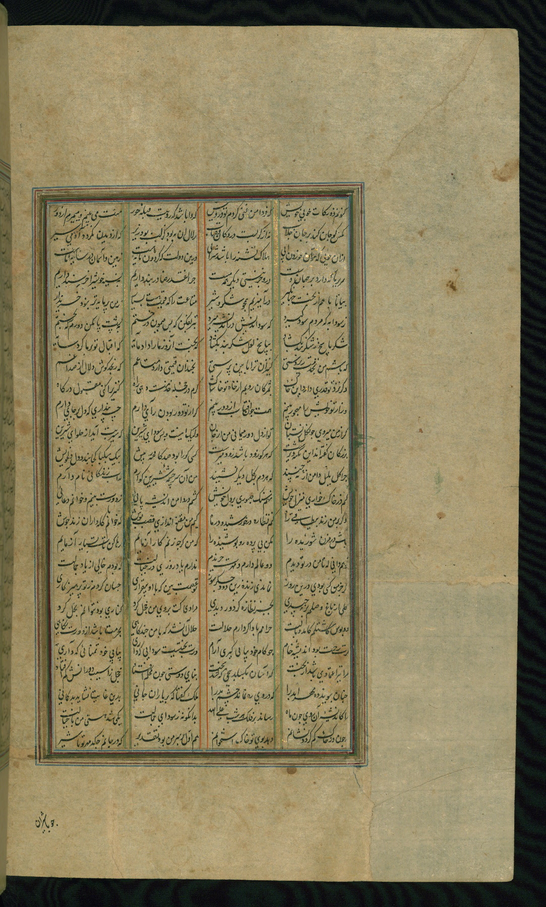 This illuminated and illustrated manuscript contains the Khamsah (quintet) and two historical poems (masnavi), Qirān-i saʿdayn and Nuh sipihr, by Amīr Khusraw Dihlavī (d. 725 AH / 1325 CE). The codex is dated 1017 AH / 1609 CE and was produced in Safavid Iran. All texts are written in black nastaʿlīq script with chapter headings in red. The manuscript opens with an illuminated and illustrated frontispiece of a hunting and court scene in the early Safavid style (fols. 1b-2a). The first text is Khamsah-i Dihlavī (fols. 2b-192a), which is introduced by an illuminated incipit and titlepiece with the title of the first poem of the quintet and the author's name. The second text is Qirān-i saʿdayn, a historical poem (masnavi) about the meeting of Sultan Muʿizz al-Dīn Kayqubād and his father, Nāṣir al-Din Bughrā Khān, on the banks of the Sarjū in Oudh. It is also introduced with an illuminated incipit and titlepiece (fol. 193b). The third text is Nuh sipihr, a historical poem (masnavi) describing the glories of Sultan Quṭb al-Dīn Mubārak Shāh Khaljī’s time, introduced with an illuminated incipit and headpiece (fol. 223b). The dark brown leather binding is original to the manuscript.