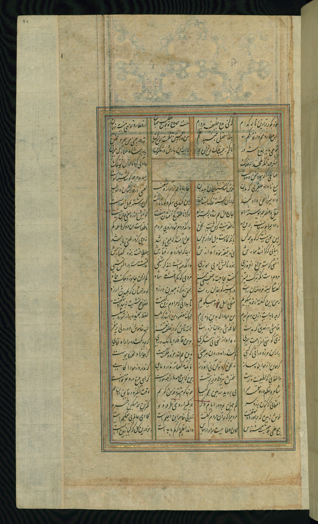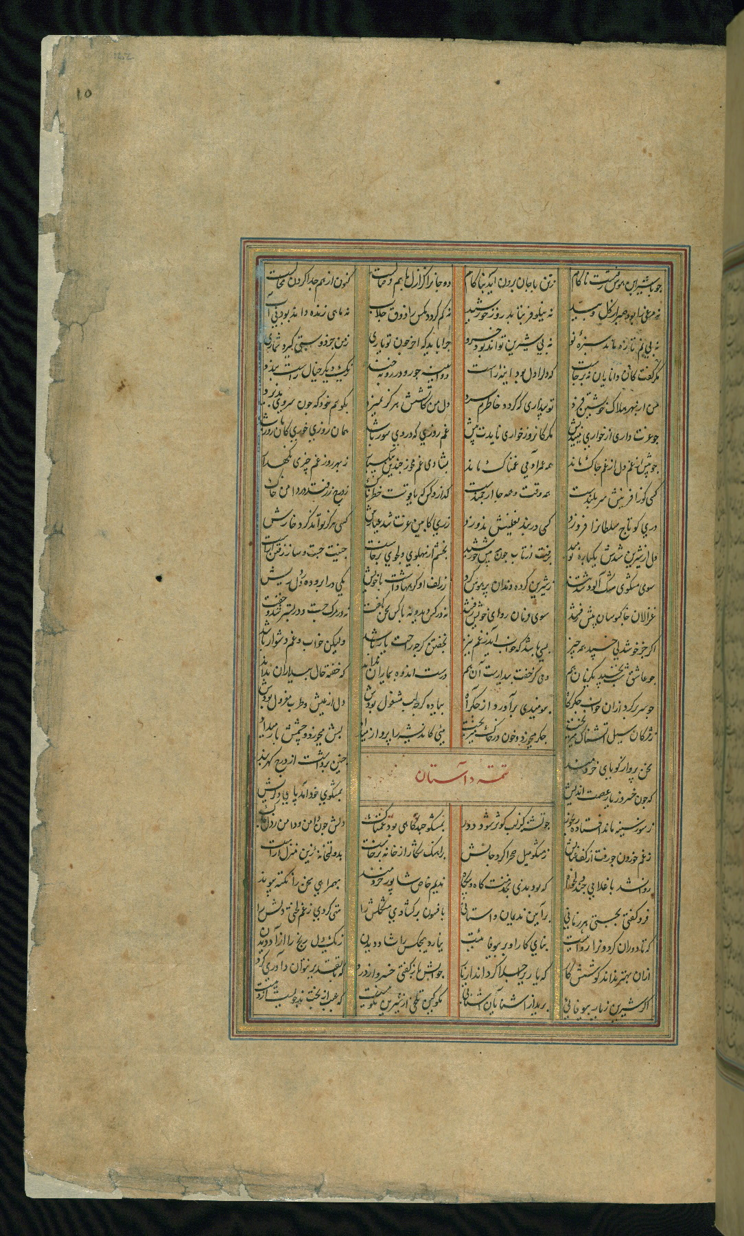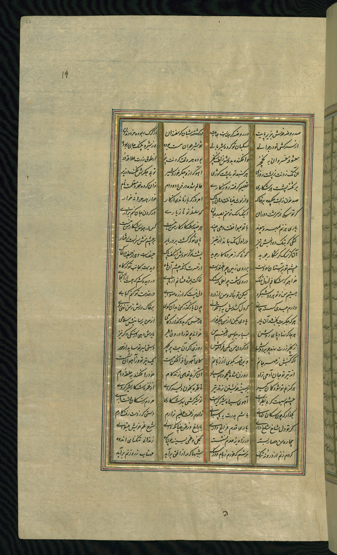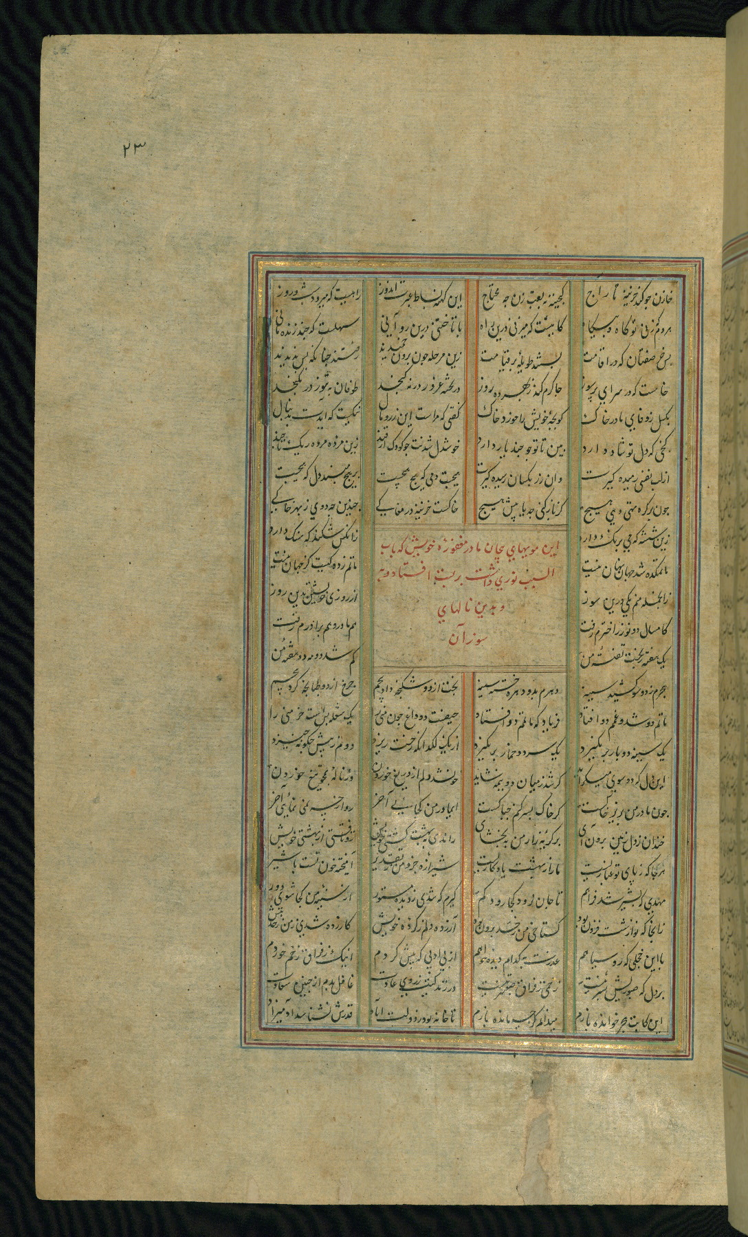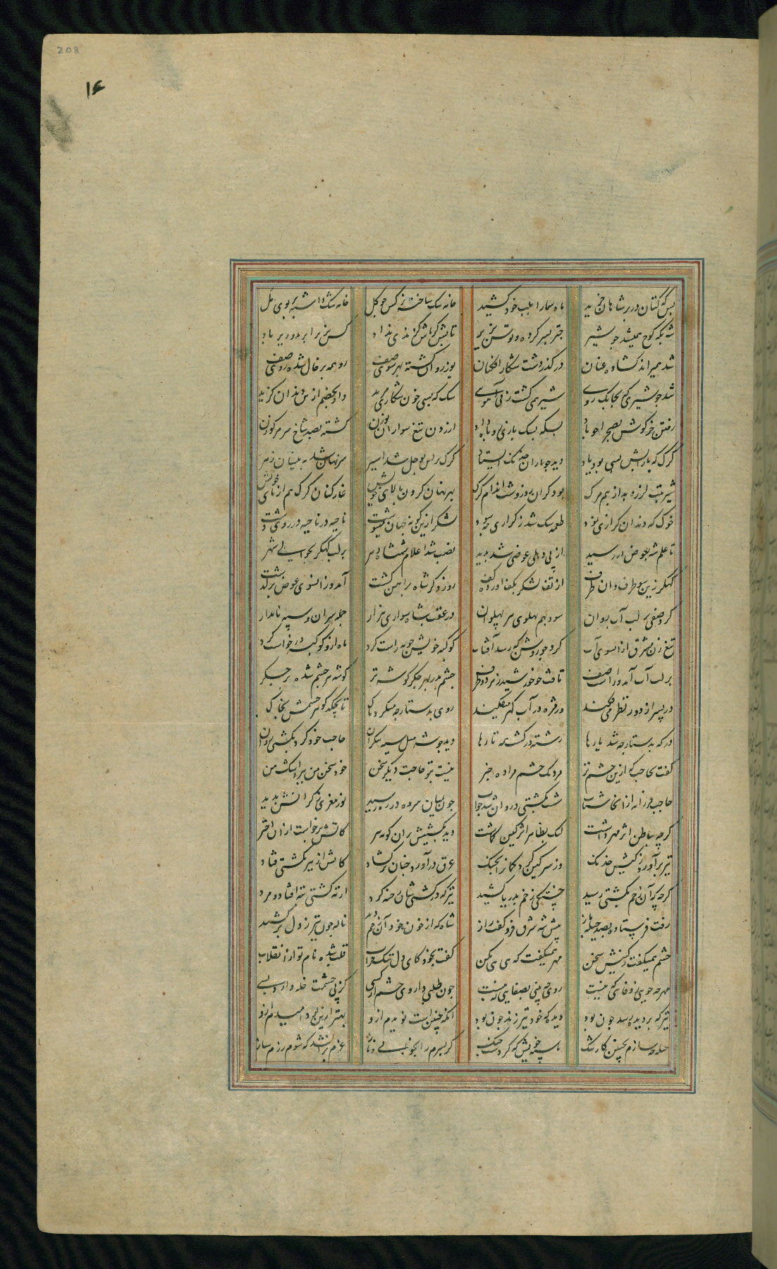 This illuminated and illustrated manuscript contains the Khamsah (quintet) and two historical poems (masnavi), Qirān-i saʿdayn and Nuh sipihr, by Amīr Khusraw Dihlavī (d. 725 AH / 1325 CE). The codex is dated 1017 AH / 1609 CE and was produced in Safavid Iran. All texts are written in black nastaʿlīq script with chapter headings in red. The manuscript opens with an illuminated and illustrated frontispiece of a hunting and court scene in the early Safavid style (fols. 1b-2a). The first text is Khamsah-i Dihlavī (fols. 2b-192a), which is introduced by an illuminated incipit and titlepiece with the title of the first poem of the quintet and the author's name. The second text is Qirān-i saʿdayn, a historical poem (masnavi) about the meeting of Sultan Muʿizz al-Dīn Kayqubād and his father, Nāṣir al-Din Bughrā Khān, on the banks of the Sarjū in Oudh. It is also introduced with an illuminated incipit and titlepiece (fol. 193b). The third text is Nuh sipihr, a historical poem (masnavi) describing the glories of Sultan Quṭb al-Dīn Mubārak Shāh Khaljī’s time, introduced with an illuminated incipit and headpiece (fol. 223b). The dark brown leather binding is original to the manuscript.