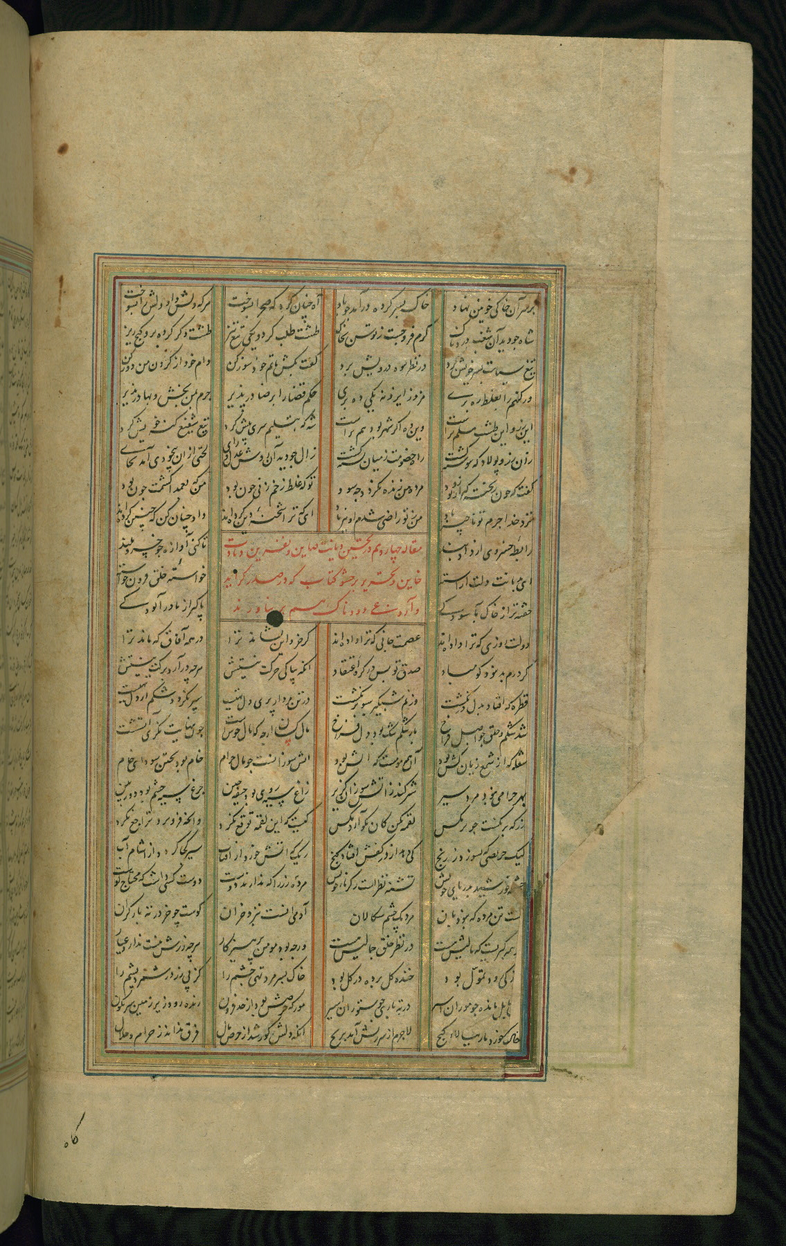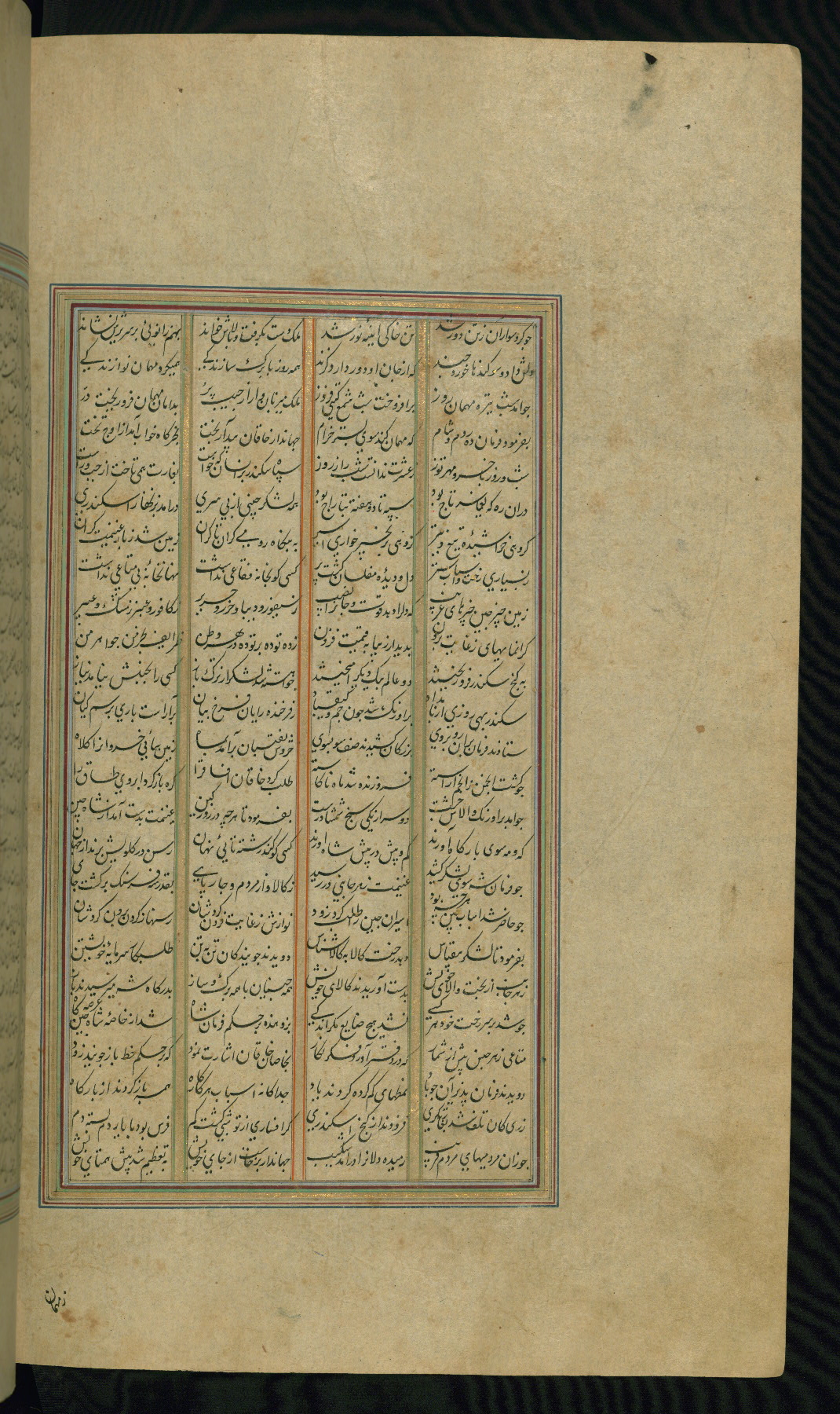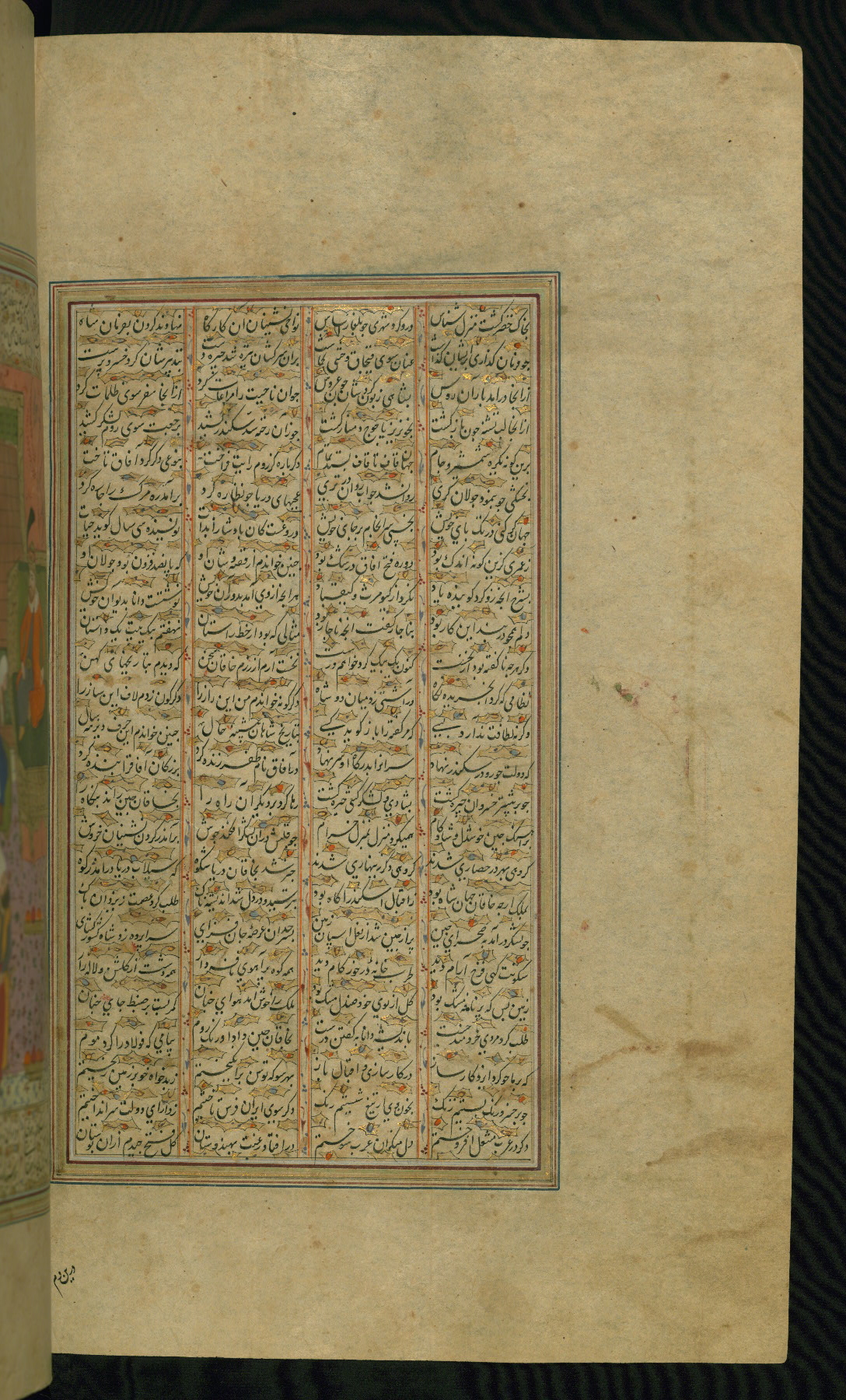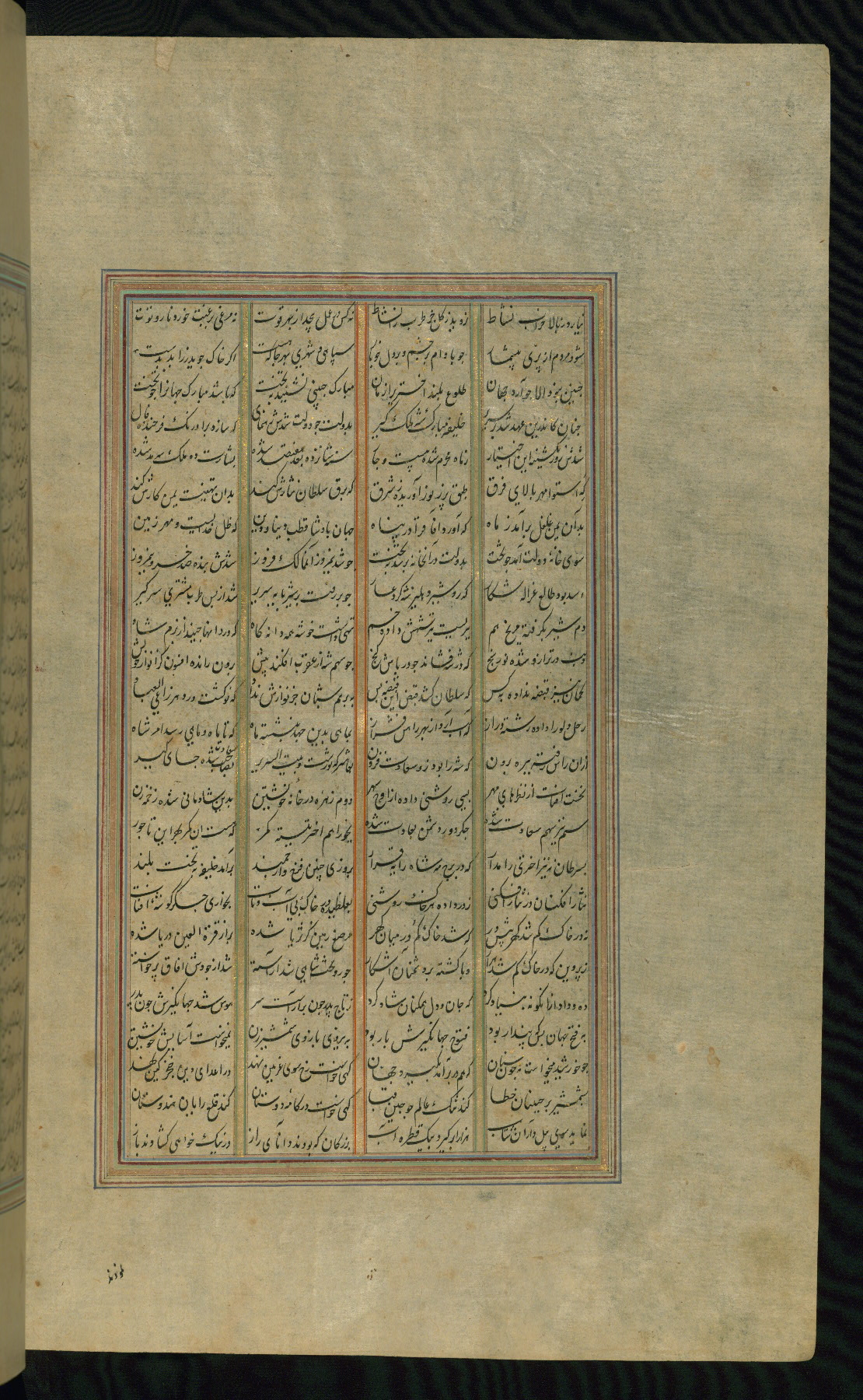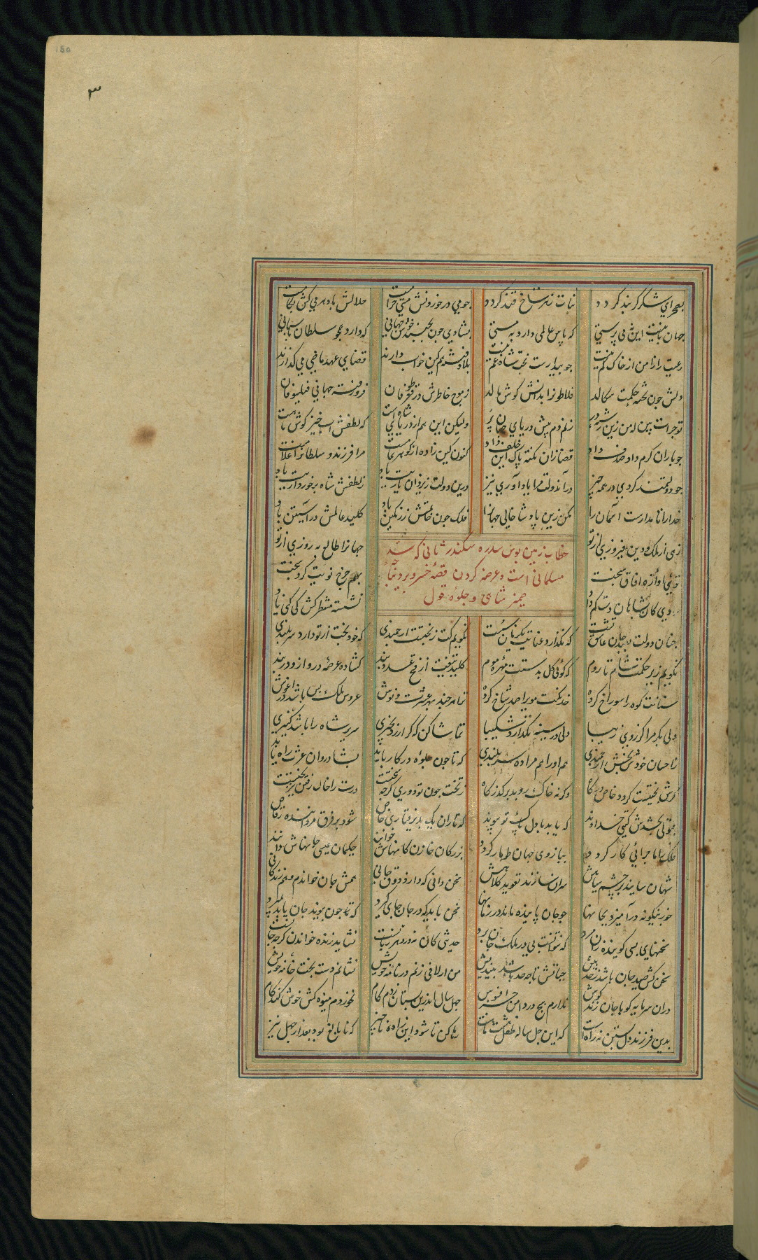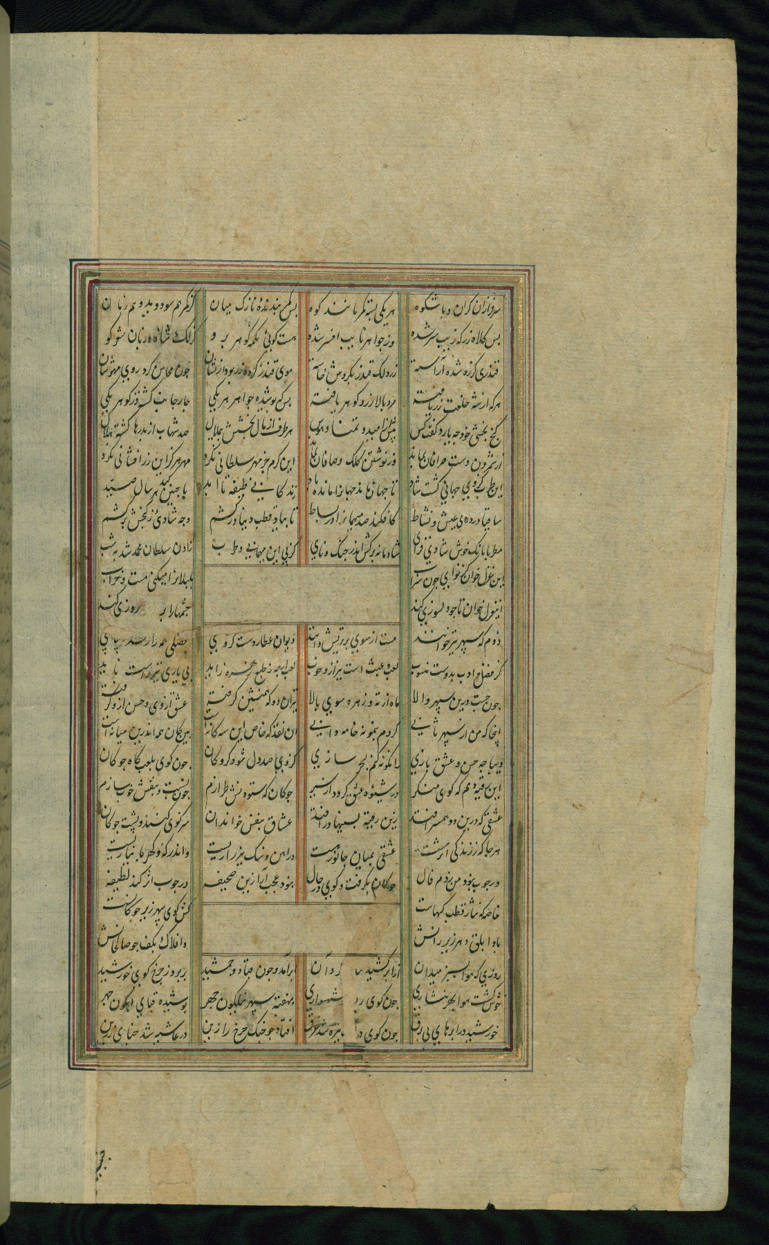 This illuminated and illustrated manuscript contains the Khamsah (quintet) and two historical poems (masnavi), Qirān-i saʿdayn and Nuh sipihr, by Amīr Khusraw Dihlavī (d. 725 AH / 1325 CE). The codex is dated 1017 AH / 1609 CE and was produced in Safavid Iran. All texts are written in black nastaʿlīq script with chapter headings in red. The manuscript opens with an illuminated and illustrated frontispiece of a hunting and court scene in the early Safavid style (fols. 1b-2a). The first text is Khamsah-i Dihlavī (fols. 2b-192a), which is introduced by an illuminated incipit and titlepiece with the title of the first poem of the quintet and the author's name. The second text is Qirān-i saʿdayn, a historical poem (masnavi) about the meeting of Sultan Muʿizz al-Dīn Kayqubād and his father, Nāṣir al-Din Bughrā Khān, on the banks of the Sarjū in Oudh. It is also introduced with an illuminated incipit and titlepiece (fol. 193b). The third text is Nuh sipihr, a historical poem (masnavi) describing the glories of Sultan Quṭb al-Dīn Mubārak Shāh Khaljī’s time, introduced with an illuminated incipit and headpiece (fol. 223b). The dark brown leather binding is original to the manuscript.