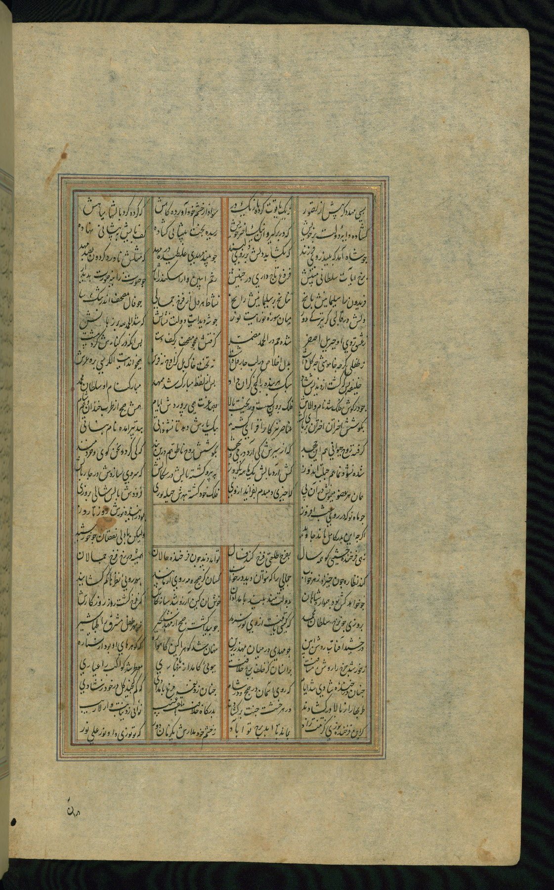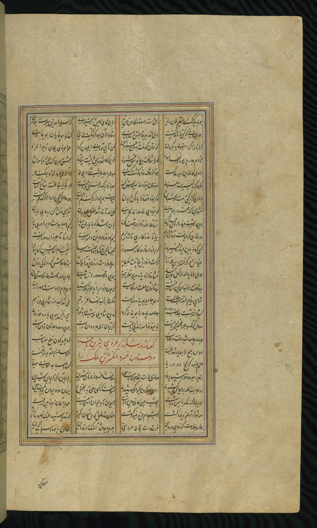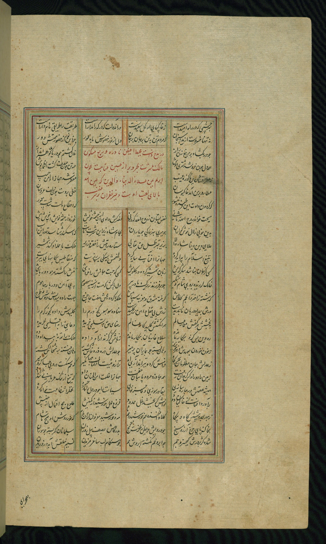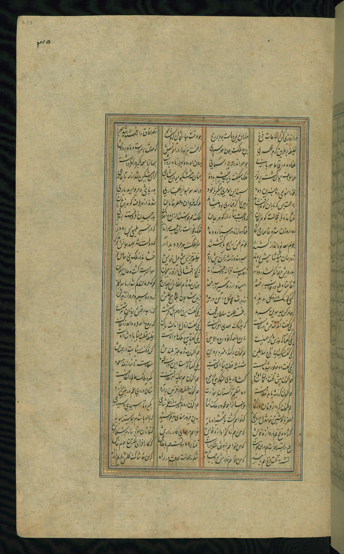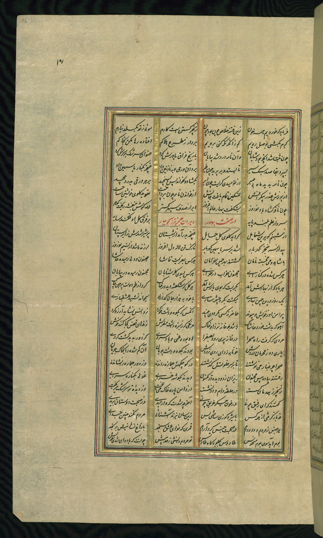 This illuminated and illustrated manuscript contains the Khamsah (quintet) and two historical poems (masnavi), Qirān-i saʿdayn and Nuh sipihr, by Amīr Khusraw Dihlavī (d. 725 AH / 1325 CE). The codex is dated 1017 AH / 1609 CE and was produced in Safavid Iran. All texts are written in black nastaʿlīq script with chapter headings in red. The manuscript opens with an illuminated and illustrated frontispiece of a hunting and court scene in the early Safavid style (fols. 1b-2a). The first text is Khamsah-i Dihlavī (fols. 2b-192a), which is introduced by an illuminated incipit and titlepiece with the title of the first poem of the quintet and the author's name. The second text is Qirān-i saʿdayn, a historical poem (masnavi) about the meeting of Sultan Muʿizz al-Dīn Kayqubād and his father, Nāṣir al-Din Bughrā Khān, on the banks of the Sarjū in Oudh. It is also introduced with an illuminated incipit and titlepiece (fol. 193b). The third text is Nuh sipihr, a historical poem (masnavi) describing the glories of Sultan Quṭb al-Dīn Mubārak Shāh Khaljī’s time, introduced with an illuminated incipit and headpiece (fol. 223b). The dark brown leather binding is original to the manuscript.
