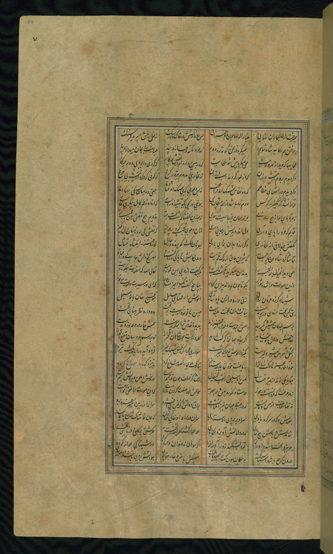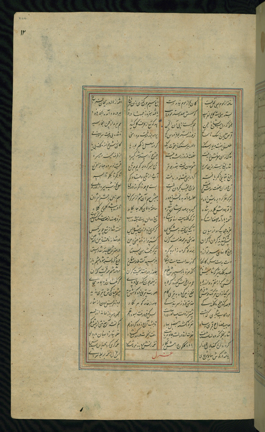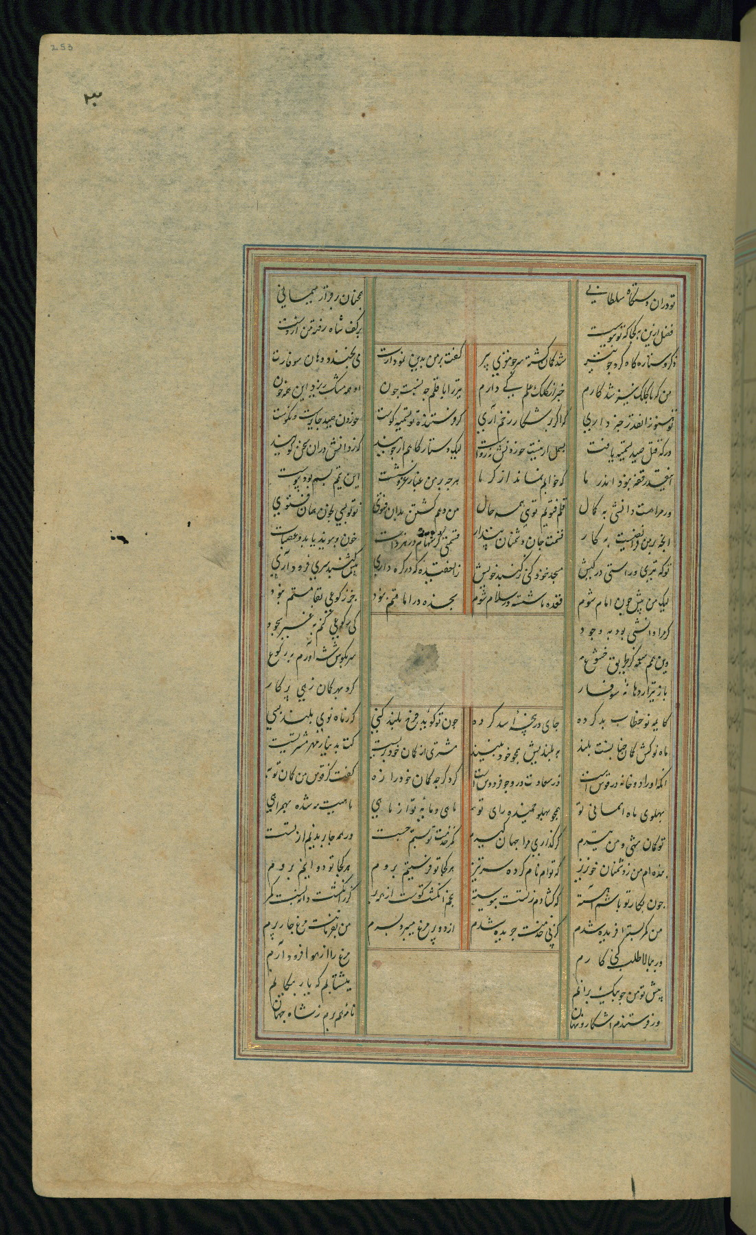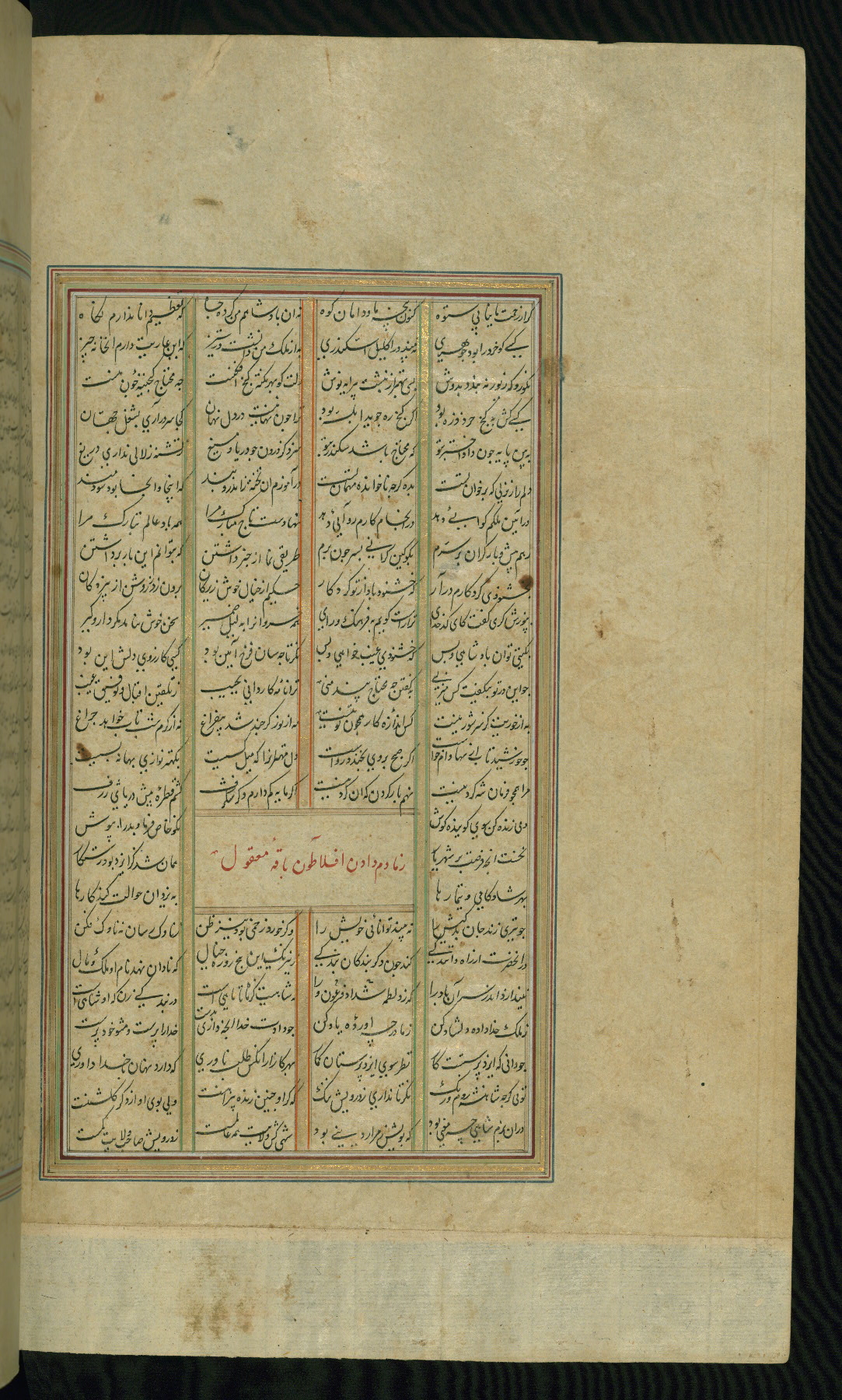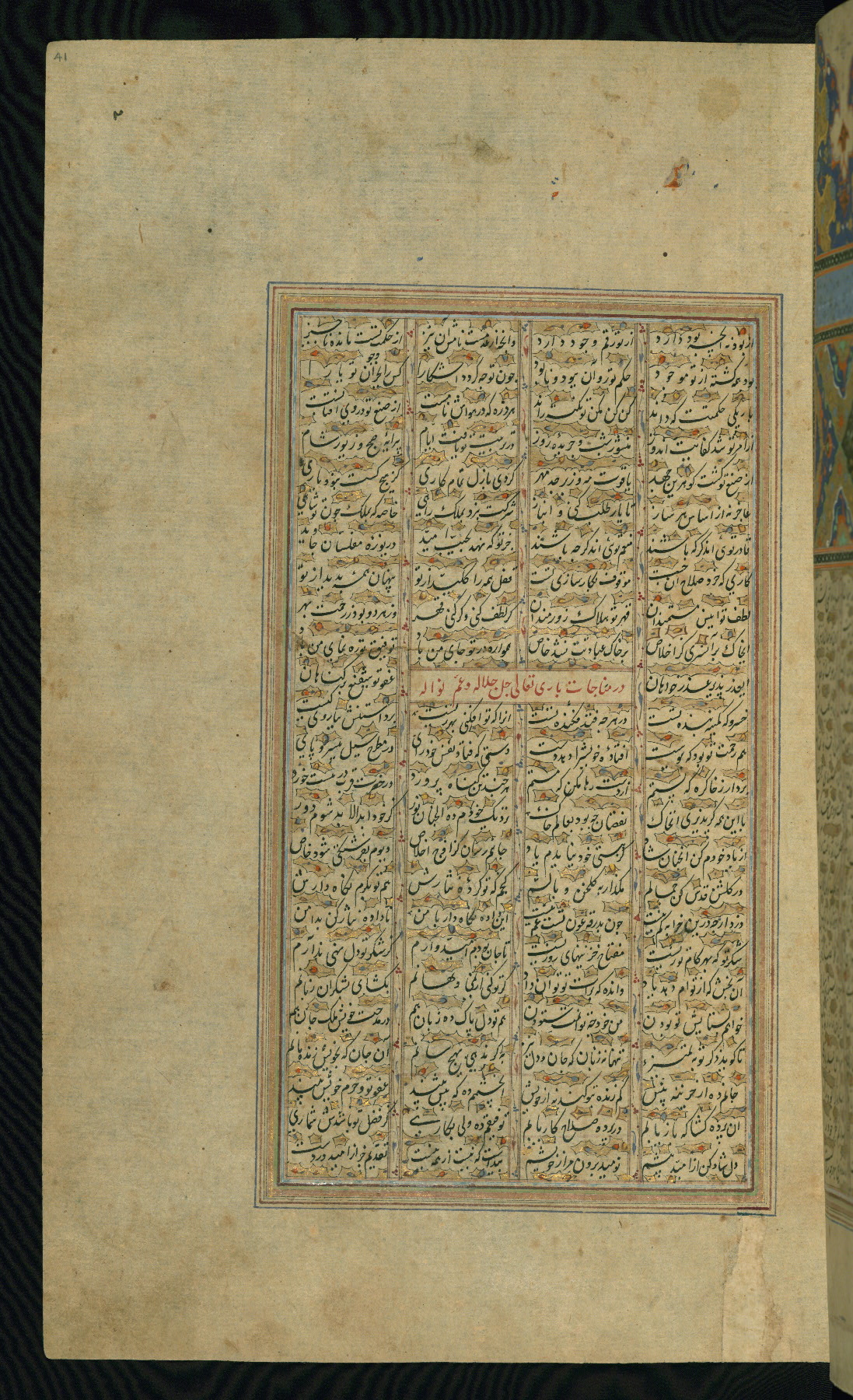 This illuminated and illustrated manuscript contains the Khamsah (quintet) and two historical poems (masnavi), Qirān-i saʿdayn and Nuh sipihr, by Amīr Khusraw Dihlavī (d. 725 AH / 1325 CE). The codex is dated 1017 AH / 1609 CE and was produced in Safavid Iran. All texts are written in black nastaʿlīq script with chapter headings in red. The manuscript opens with an illuminated and illustrated frontispiece of a hunting and court scene in the early Safavid style (fols. 1b-2a). The first text is Khamsah-i Dihlavī (fols. 2b-192a), which is introduced by an illuminated incipit and titlepiece with the title of the first poem of the quintet and the author's name. The second text is Qirān-i saʿdayn, a historical poem (masnavi) about the meeting of Sultan Muʿizz al-Dīn Kayqubād and his father, Nāṣir al-Din Bughrā Khān, on the banks of the Sarjū in Oudh. It is also introduced with an illuminated incipit and titlepiece (fol. 193b). The third text is Nuh sipihr, a historical poem (masnavi) describing the glories of Sultan Quṭb al-Dīn Mubārak Shāh Khaljī’s time, introduced with an illuminated incipit and headpiece (fol. 223b). The dark brown leather binding is original to the manuscript.
