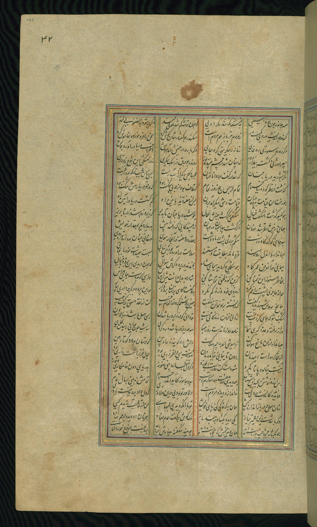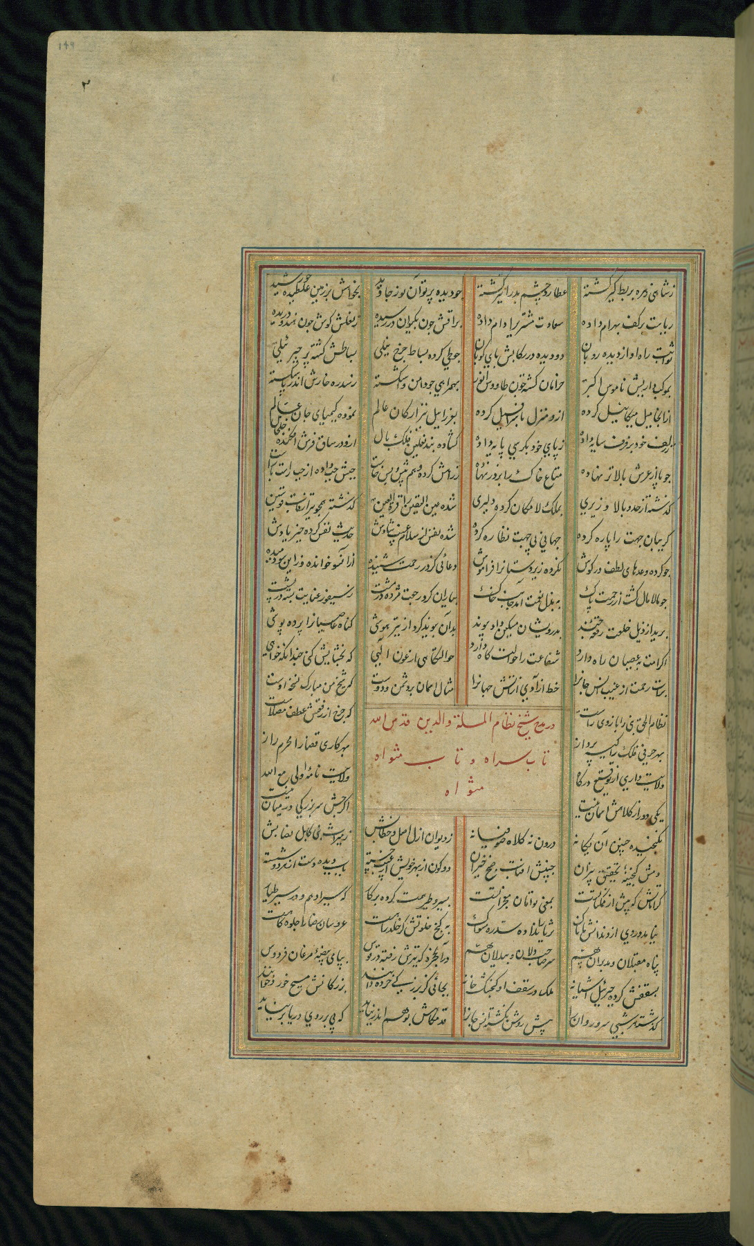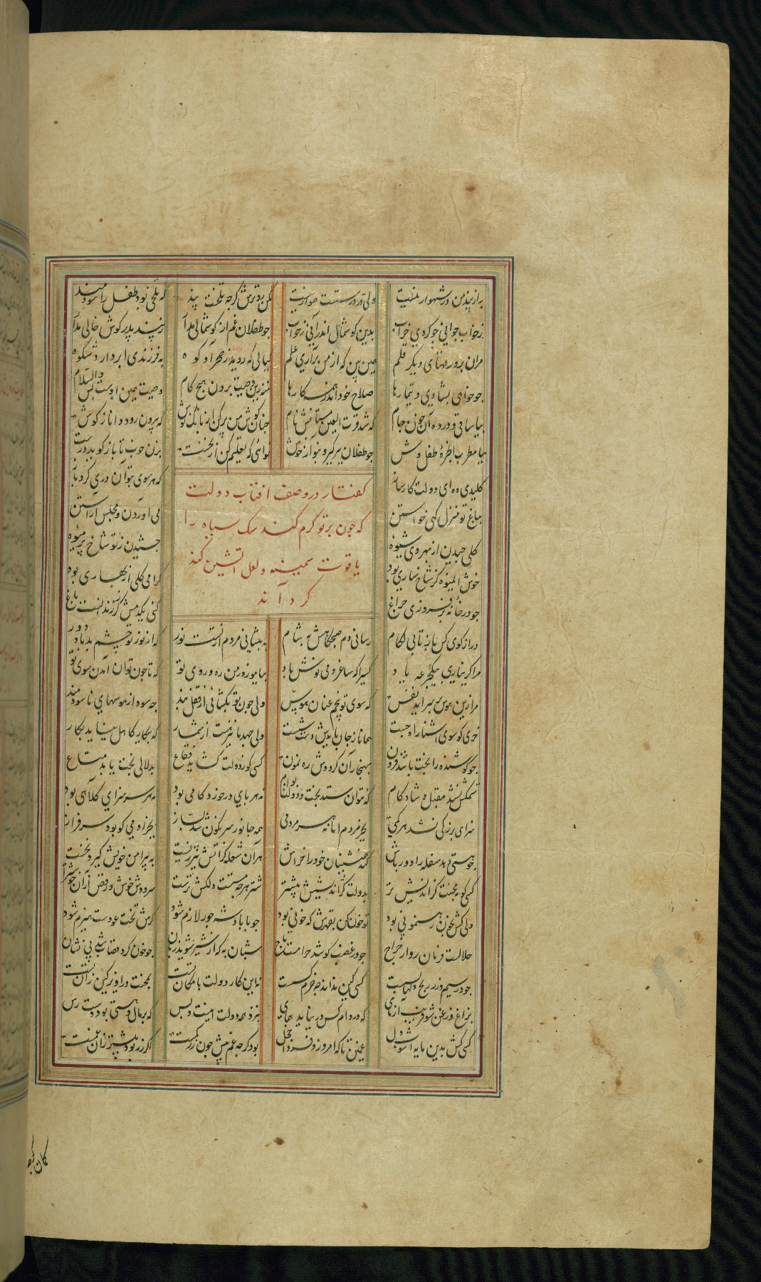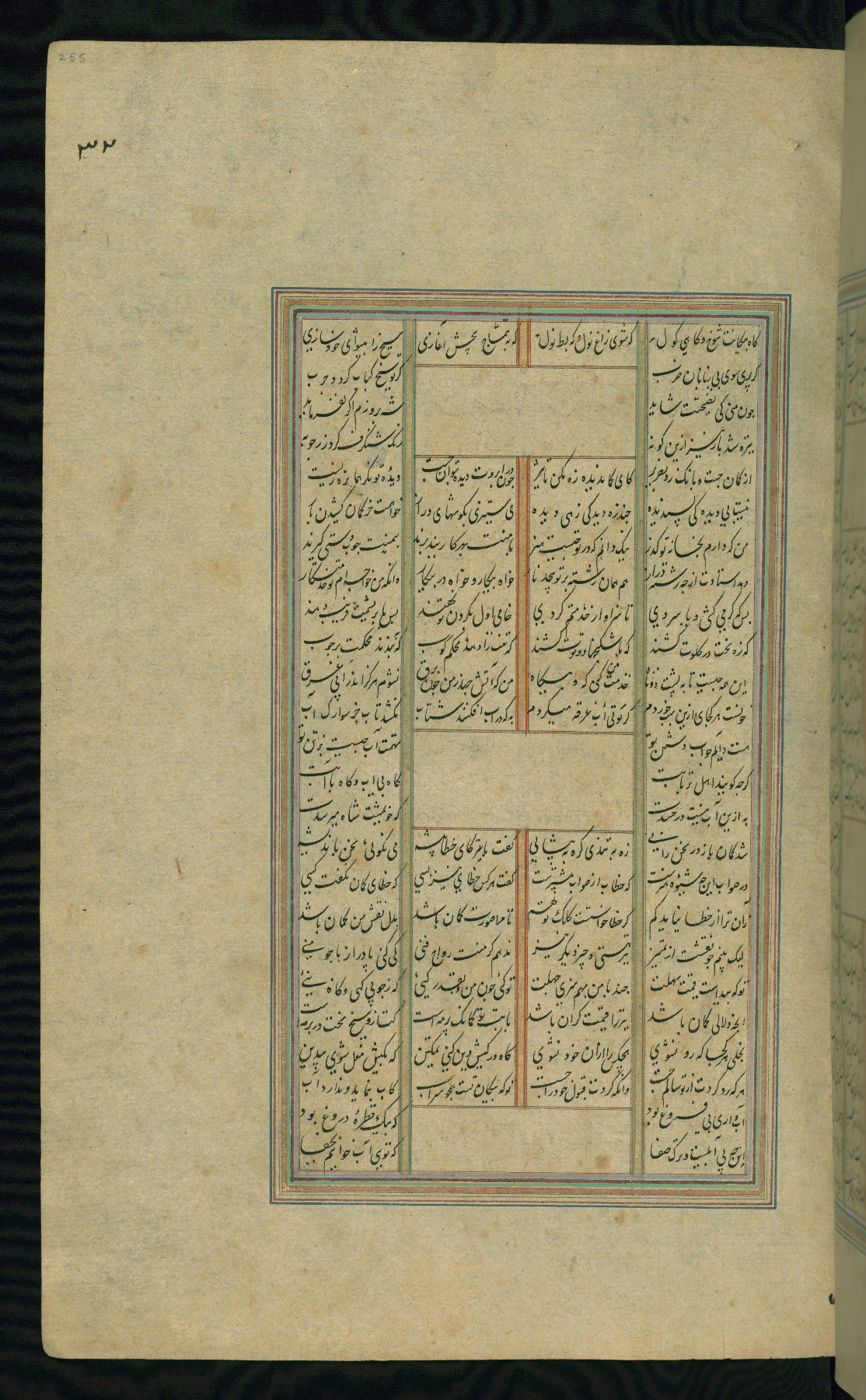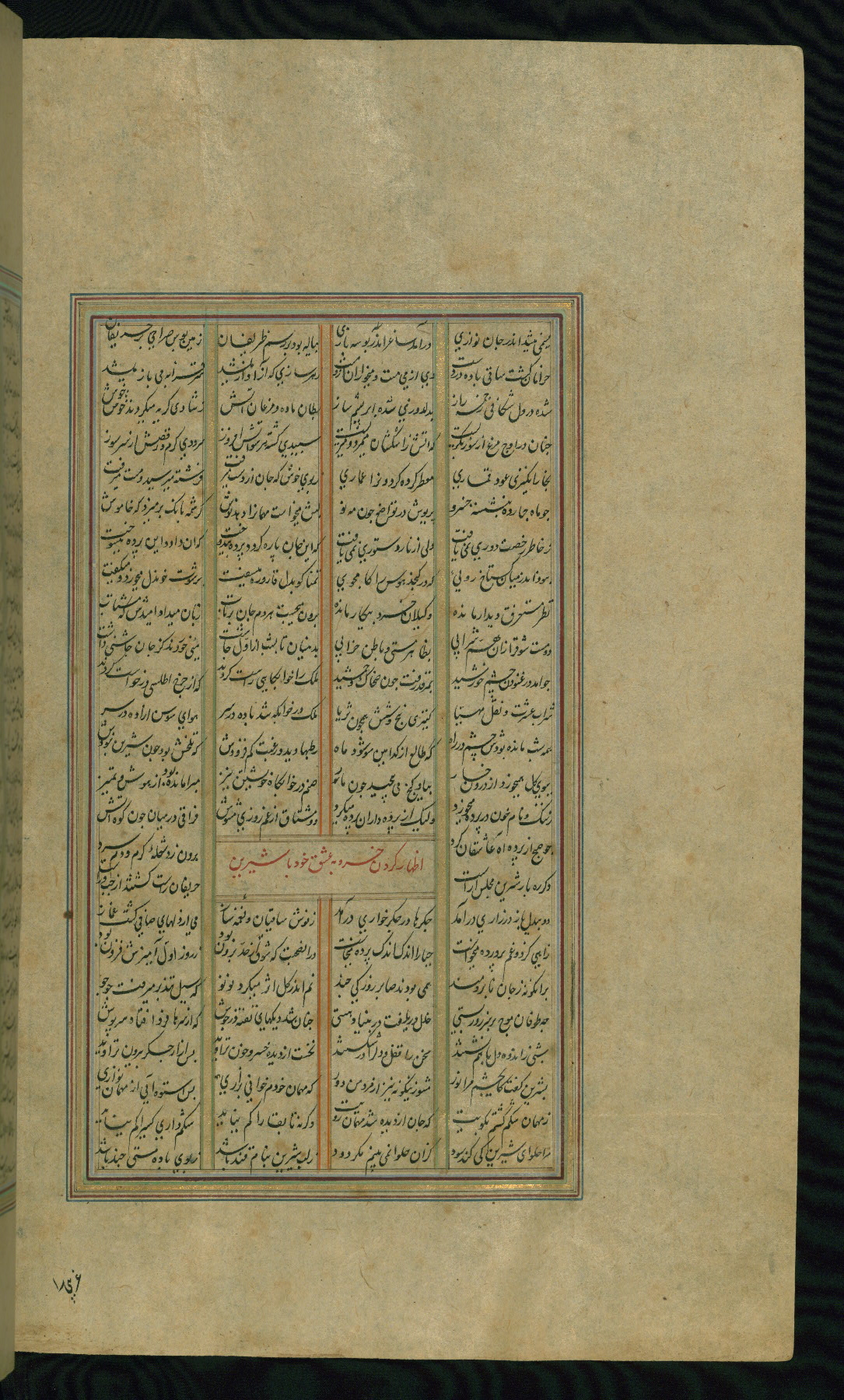This illuminated and illustrated manuscript contains the Khamsah (quintet) and two historical poems (masnavi), Qirān-i saʿdayn and Nuh sipihr, by Amīr Khusraw Dihlavī (d. 725 AH / 1325 CE). The codex is dated 1017 AH / 1609 CE and was produced in Safavid Iran. All texts are written in black nastaʿlīq script with chapter headings in red. The manuscript opens with an illuminated and illustrated frontispiece of a hunting and court scene in the early Safavid style (fols. 1b-2a). The first text is Khamsah-i Dihlavī (fols. 2b-192a), which is introduced by an illuminated incipit and titlepiece with the title of the first poem of the quintet and the author's name. The second text is Qirān-i saʿdayn, a historical poem (masnavi) about the meeting of Sultan Muʿizz al-Dīn Kayqubād and his father, Nāṣir al-Din Bughrā Khān, on the banks of the Sarjū in Oudh. It is also introduced with an illuminated incipit and titlepiece (fol. 193b). The third text is Nuh sipihr, a historical poem (masnavi) describing the glories of Sultan Quṭb al-Dīn Mubārak Shāh Khaljī’s time, introduced with an illuminated incipit and headpiece (fol. 223b). The dark brown leather binding is original to the manuscript.