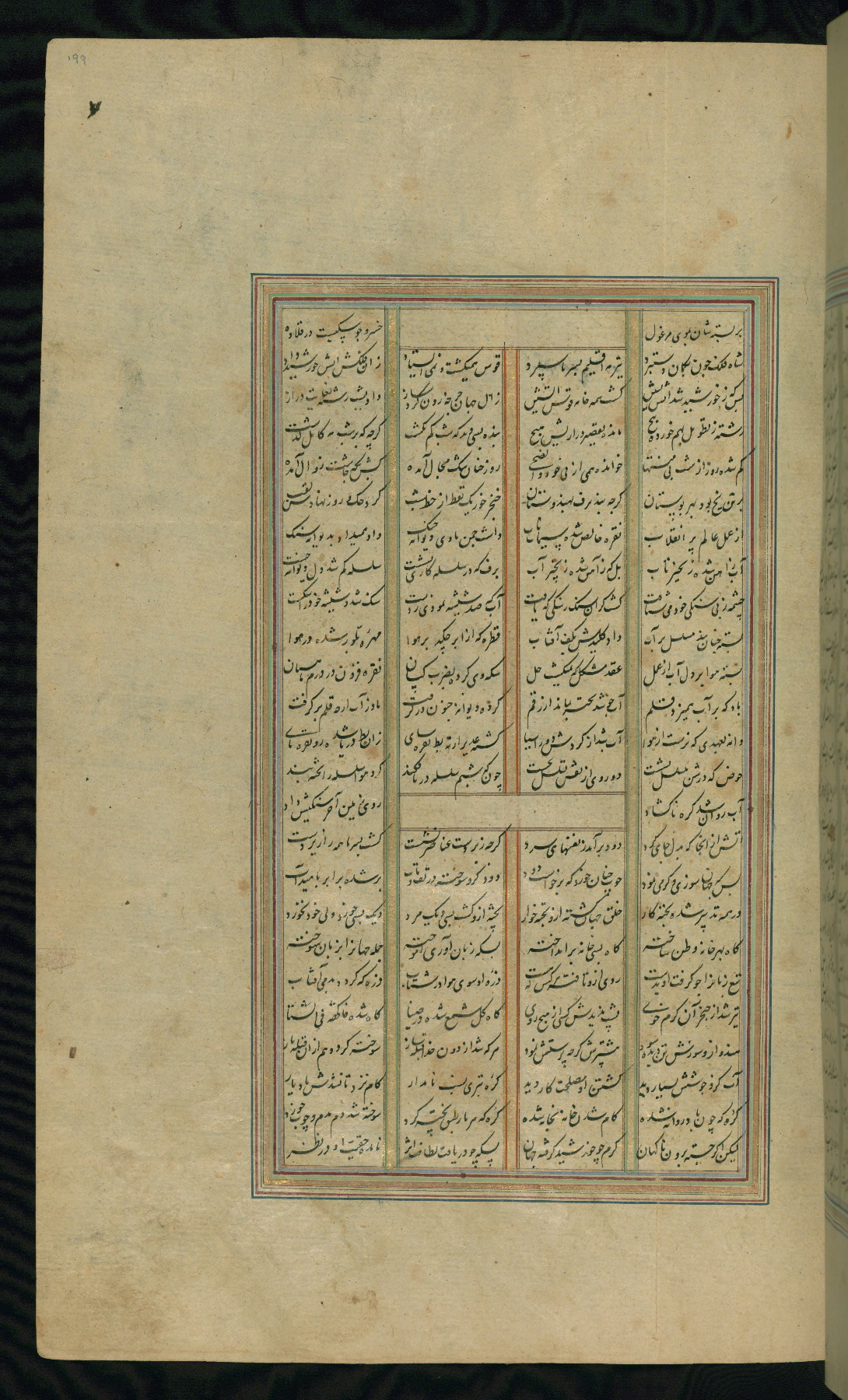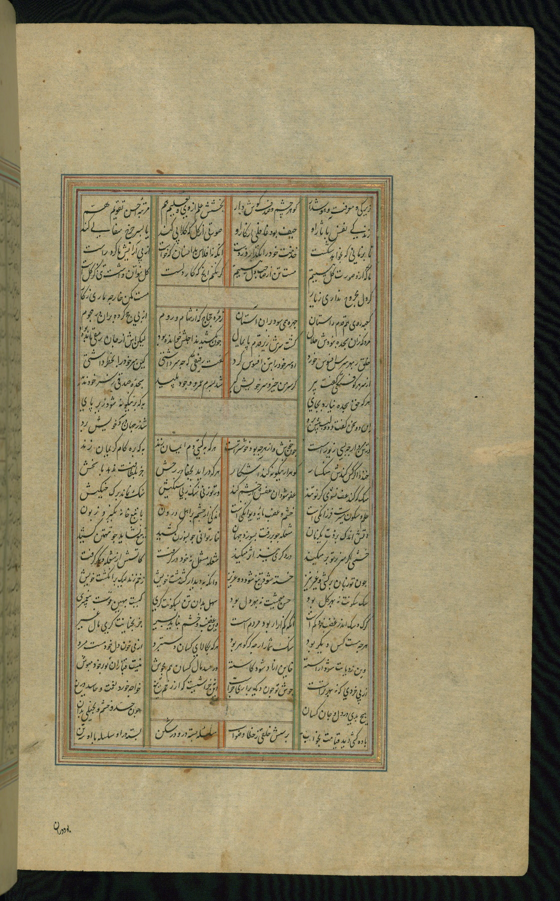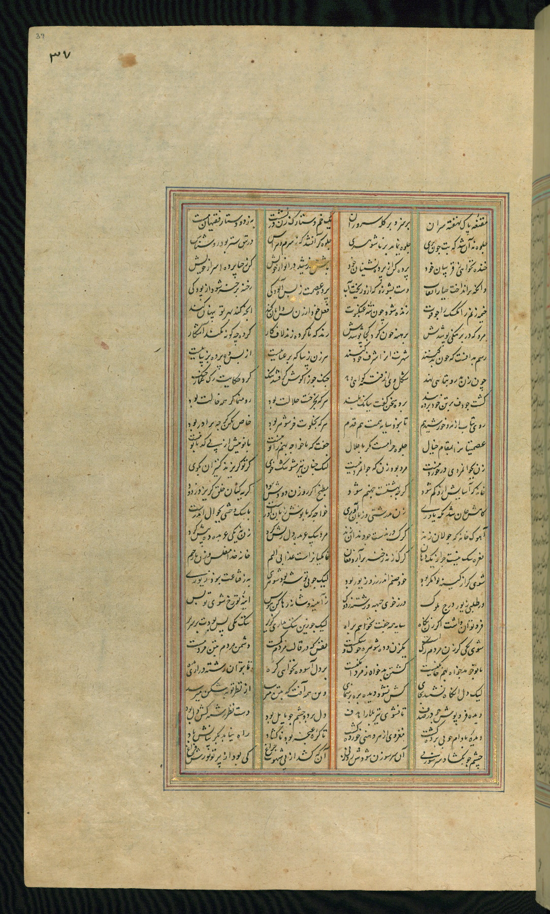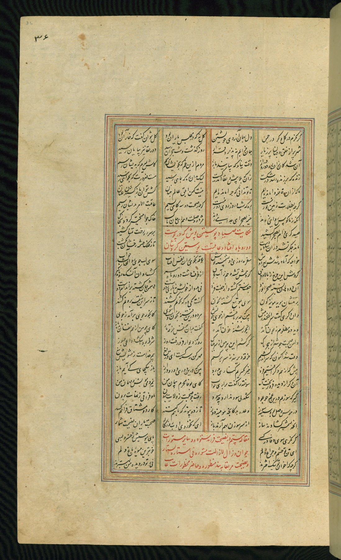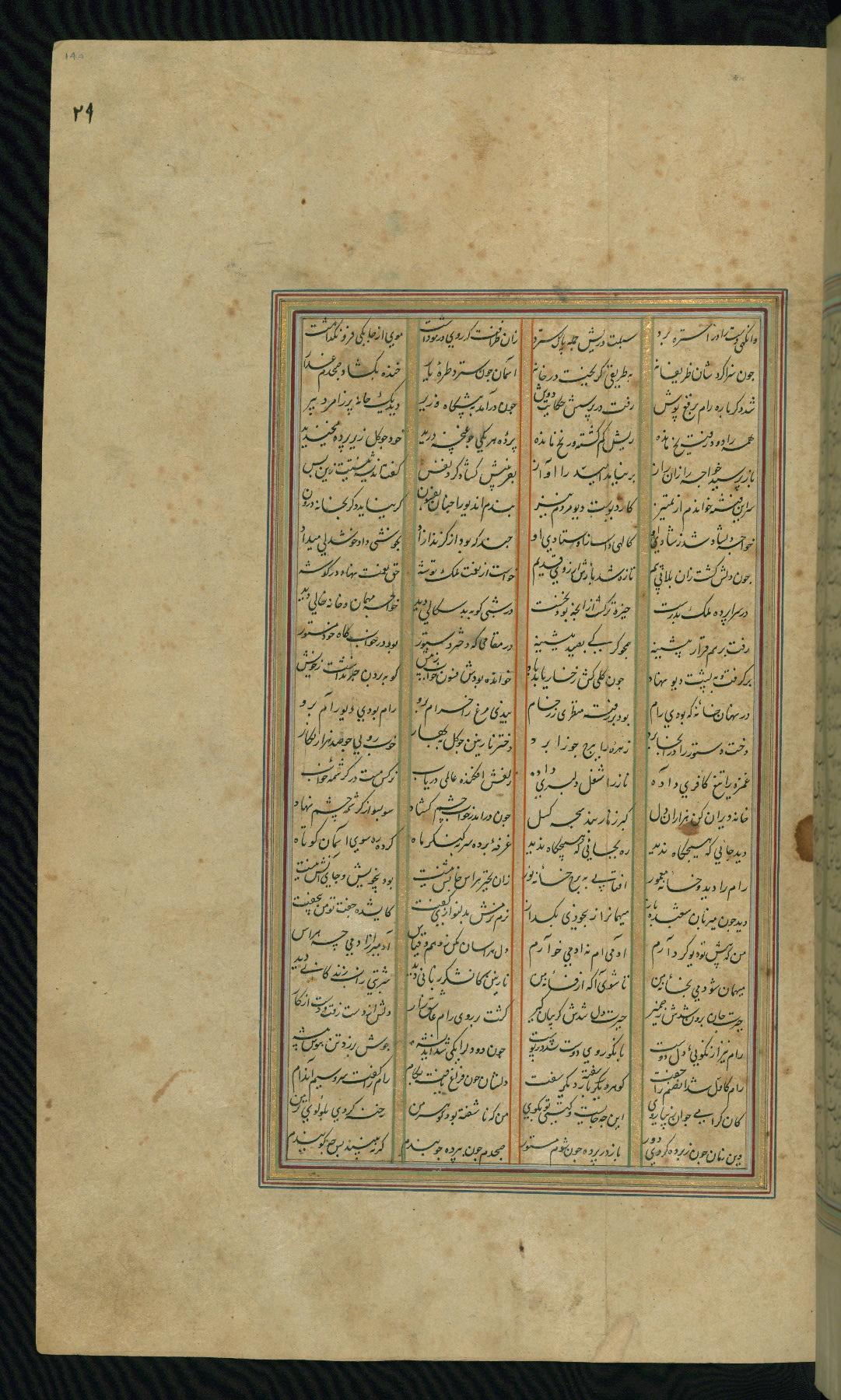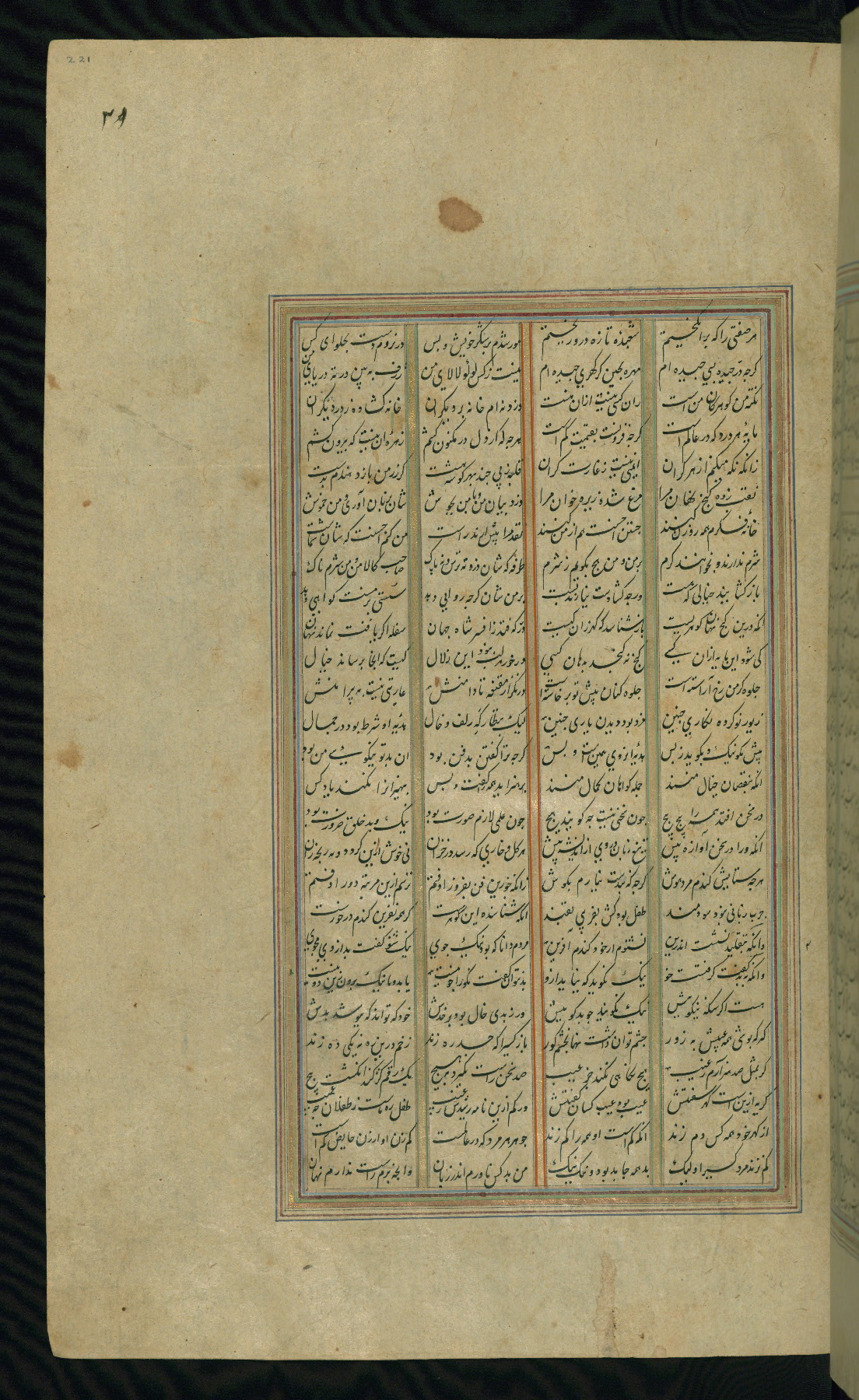 This illuminated and illustrated manuscript contains the Khamsah (quintet) and two historical poems (masnavi), Qirān-i saʿdayn and Nuh sipihr, by Amīr Khusraw Dihlavī (d. 725 AH / 1325 CE). The codex is dated 1017 AH / 1609 CE and was produced in Safavid Iran. All texts are written in black nastaʿlīq script with chapter headings in red. The manuscript opens with an illuminated and illustrated frontispiece of a hunting and court scene in the early Safavid style (fols. 1b-2a). The first text is Khamsah-i Dihlavī (fols. 2b-192a), which is introduced by an illuminated incipit and titlepiece with the title of the first poem of the quintet and the author's name. The second text is Qirān-i saʿdayn, a historical poem (masnavi) about the meeting of Sultan Muʿizz al-Dīn Kayqubād and his father, Nāṣir al-Din Bughrā Khān, on the banks of the Sarjū in Oudh. It is also introduced with an illuminated incipit and titlepiece (fol. 193b). The third text is Nuh sipihr, a historical poem (masnavi) describing the glories of Sultan Quṭb al-Dīn Mubārak Shāh Khaljī’s time, introduced with an illuminated incipit and headpiece (fol. 223b). The dark brown leather binding is original to the manuscript.