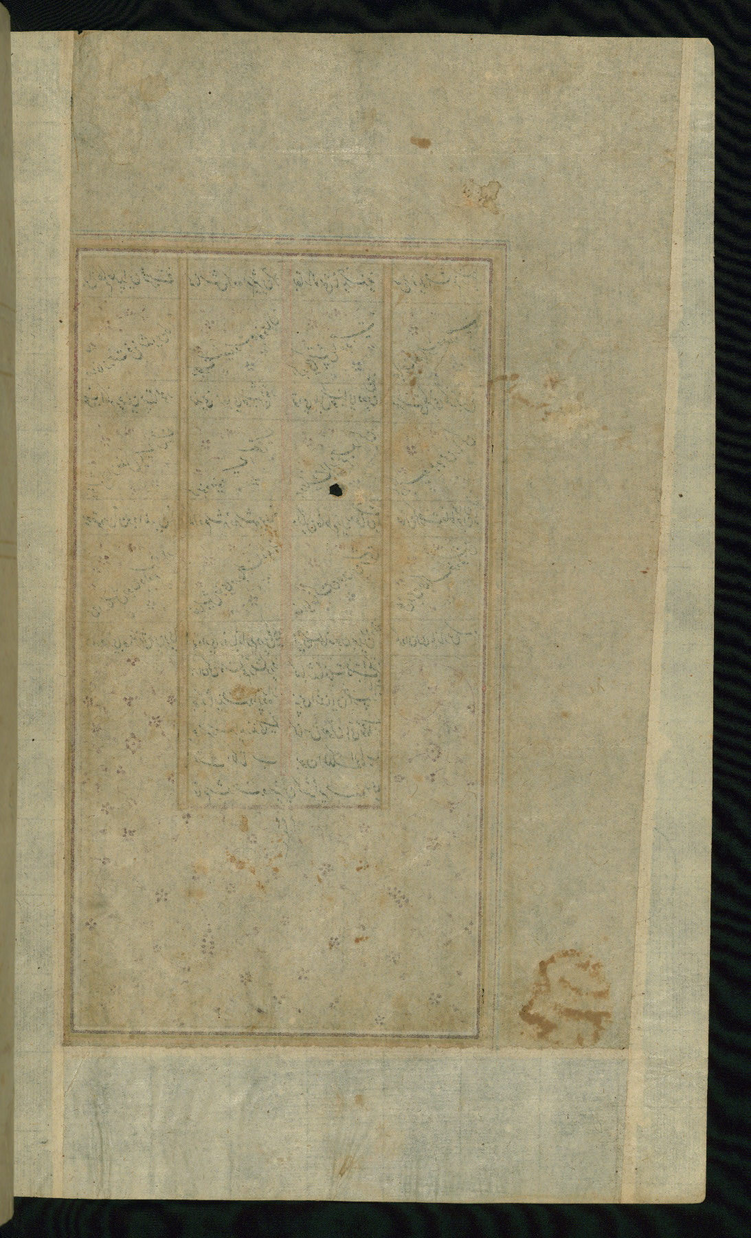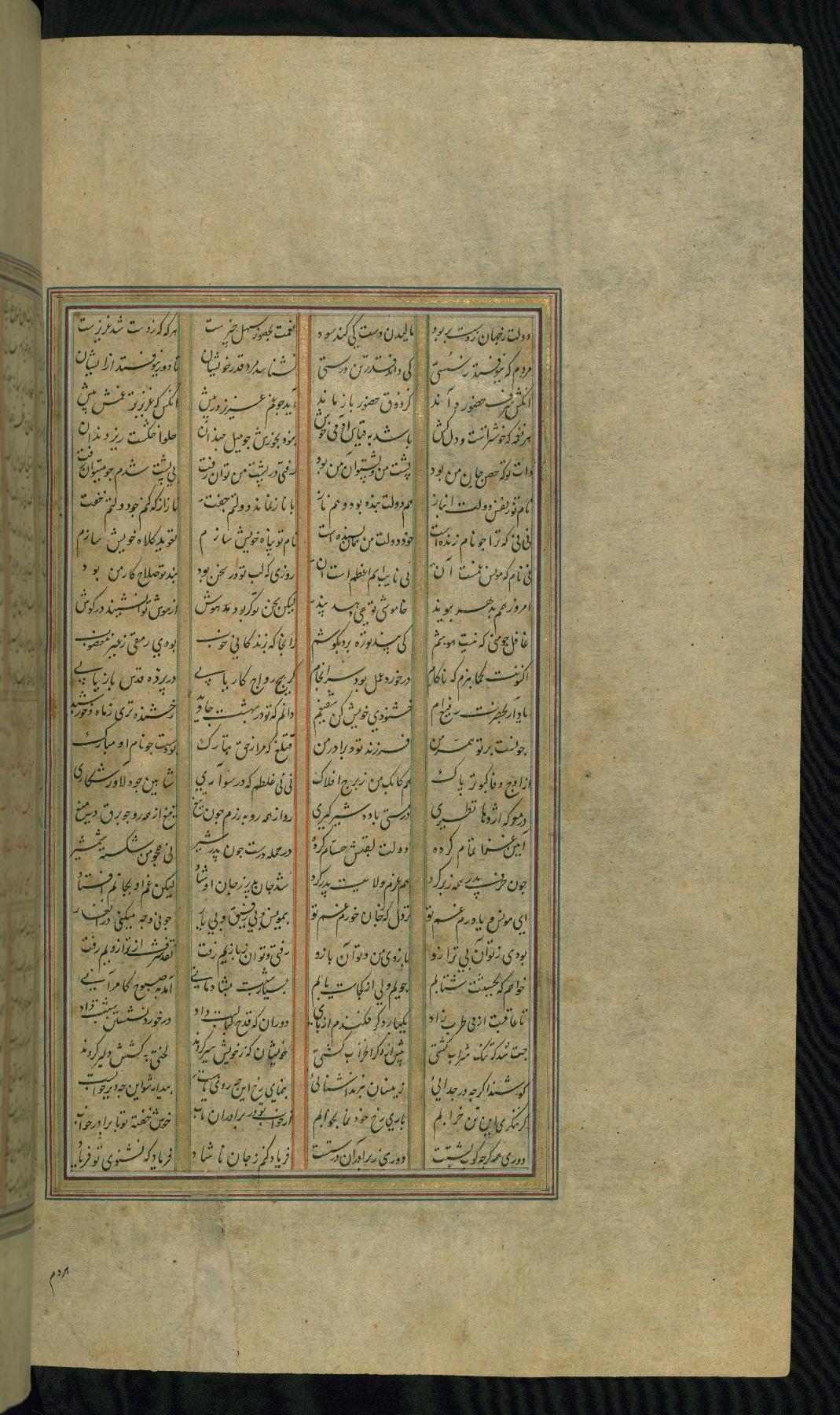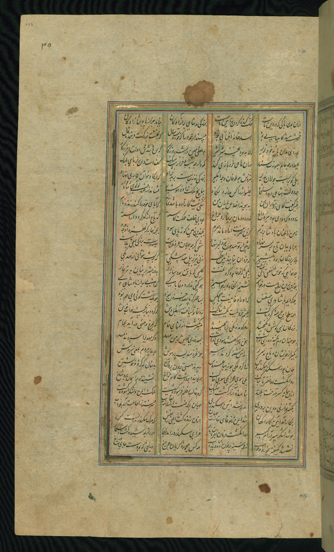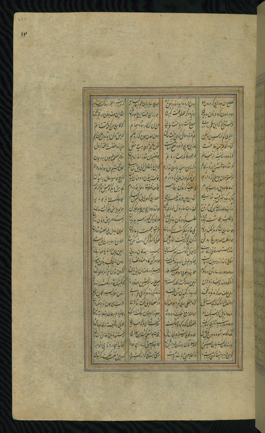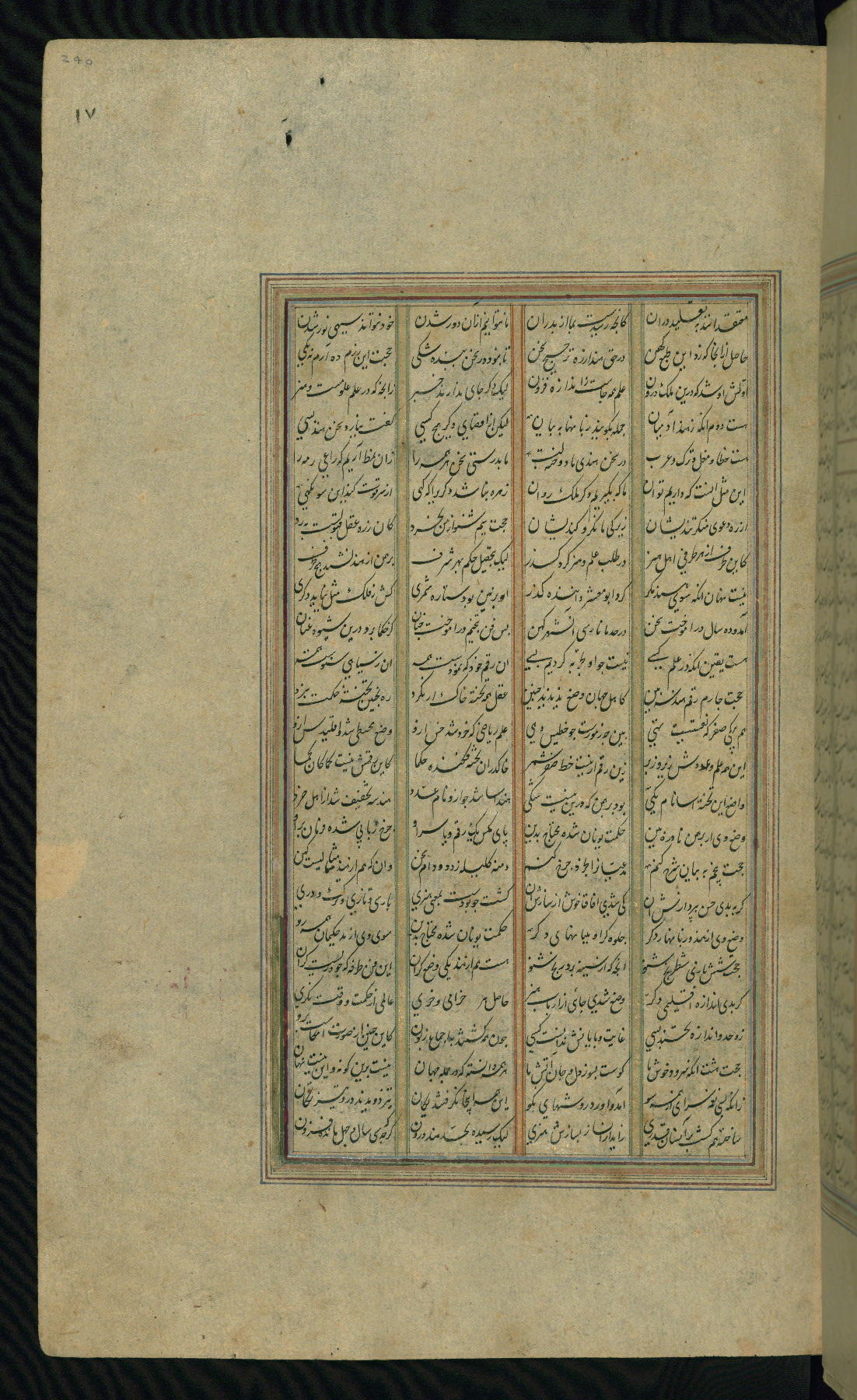 This illuminated and illustrated manuscript contains the Khamsah (quintet) and two historical poems (masnavi), Qirān-i saʿdayn and Nuh sipihr, by Amīr Khusraw Dihlavī (d. 725 AH / 1325 CE). The codex is dated 1017 AH / 1609 CE and was produced in Safavid Iran. All texts are written in black nastaʿlīq script with chapter headings in red. The manuscript opens with an illuminated and illustrated frontispiece of a hunting and court scene in the early Safavid style (fols. 1b-2a). The first text is Khamsah-i Dihlavī (fols. 2b-192a), which is introduced by an illuminated incipit and titlepiece with the title of the first poem of the quintet and the author's name. The second text is Qirān-i saʿdayn, a historical poem (masnavi) about the meeting of Sultan Muʿizz al-Dīn Kayqubād and his father, Nāṣir al-Din Bughrā Khān, on the banks of the Sarjū in Oudh. It is also introduced with an illuminated incipit and titlepiece (fol. 193b). The third text is Nuh sipihr, a historical poem (masnavi) describing the glories of Sultan Quṭb al-Dīn Mubārak Shāh Khaljī’s time, introduced with an illuminated incipit and headpiece (fol. 223b). The dark brown leather binding is original to the manuscript.