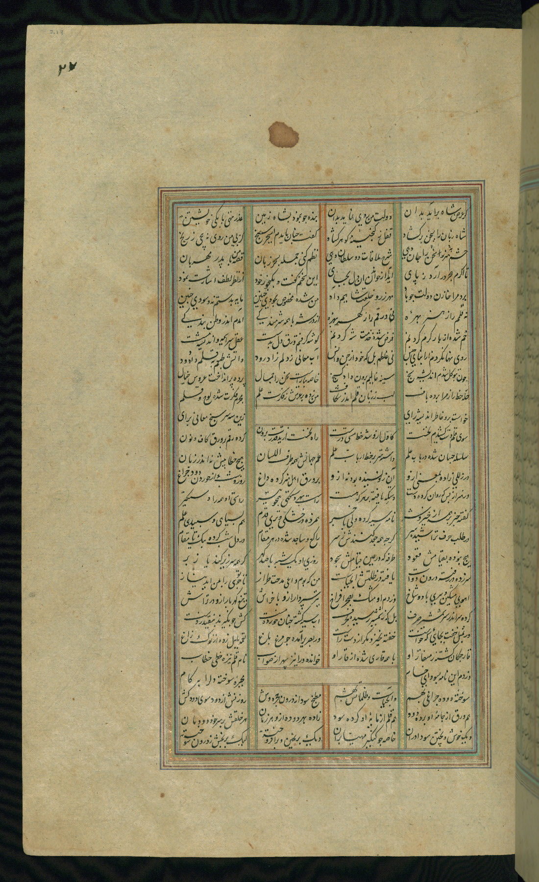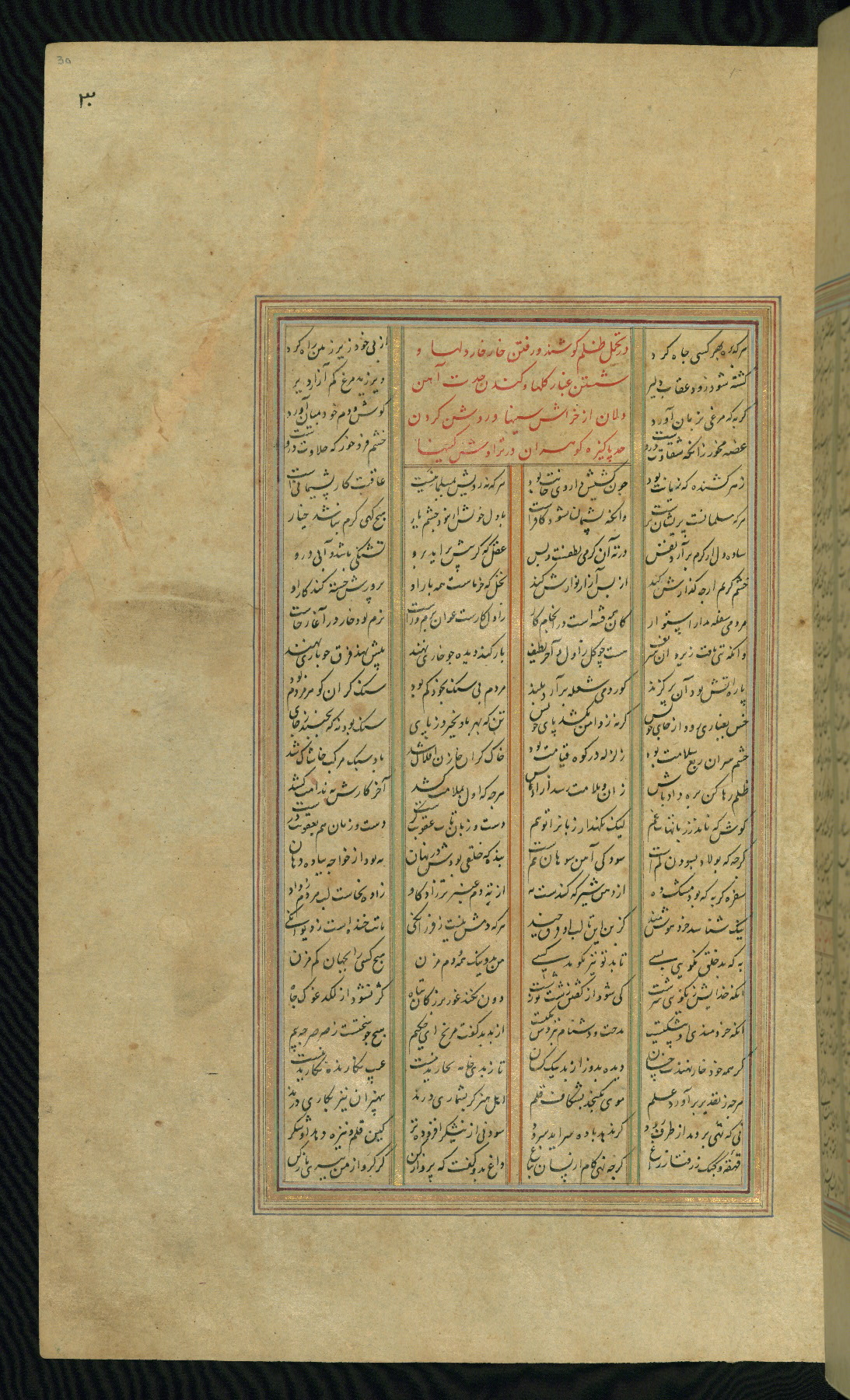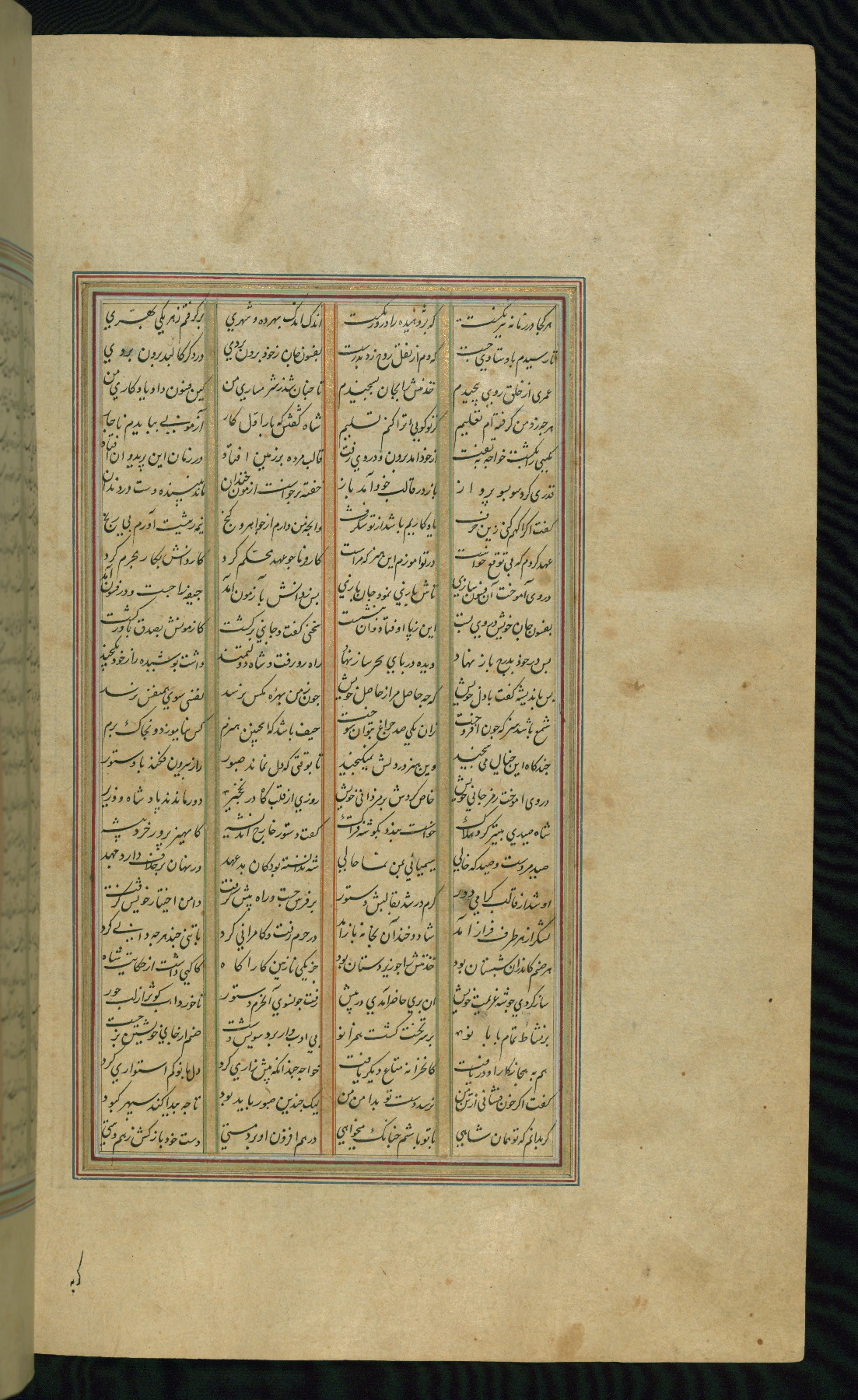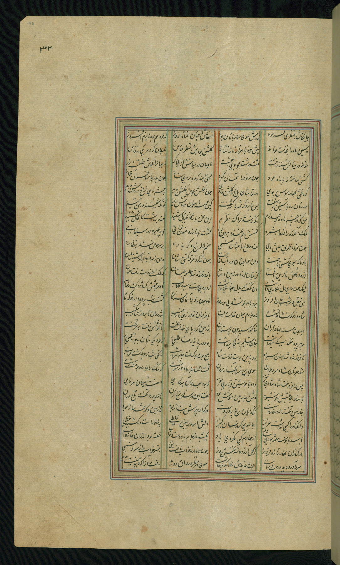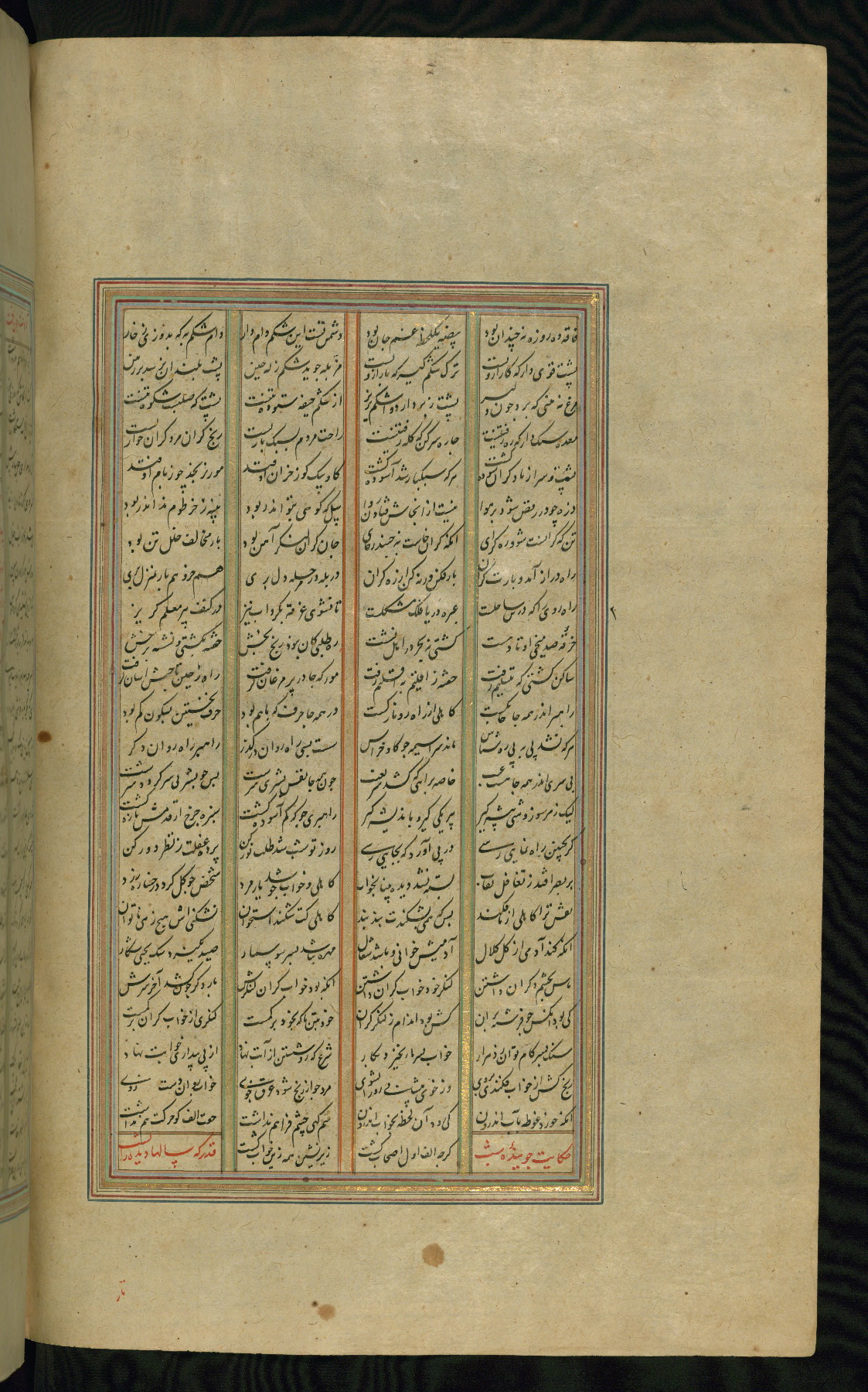 This illuminated and illustrated manuscript contains the Khamsah (quintet) and two historical poems (masnavi), Qirān-i saʿdayn and Nuh sipihr, by Amīr Khusraw Dihlavī (d. 725 AH / 1325 CE). The codex is dated 1017 AH / 1609 CE and was produced in Safavid Iran. All texts are written in black nastaʿlīq script with chapter headings in red. The manuscript opens with an illuminated and illustrated frontispiece of a hunting and court scene in the early Safavid style (fols. 1b-2a). The first text is Khamsah-i Dihlavī (fols. 2b-192a), which is introduced by an illuminated incipit and titlepiece with the title of the first poem of the quintet and the author's name. The second text is Qirān-i saʿdayn, a historical poem (masnavi) about the meeting of Sultan Muʿizz al-Dīn Kayqubād and his father, Nāṣir al-Din Bughrā Khān, on the banks of the Sarjū in Oudh. It is also introduced with an illuminated incipit and titlepiece (fol. 193b). The third text is Nuh sipihr, a historical poem (masnavi) describing the glories of Sultan Quṭb al-Dīn Mubārak Shāh Khaljī’s time, introduced with an illuminated incipit and headpiece (fol. 223b). The dark brown leather binding is original to the manuscript.