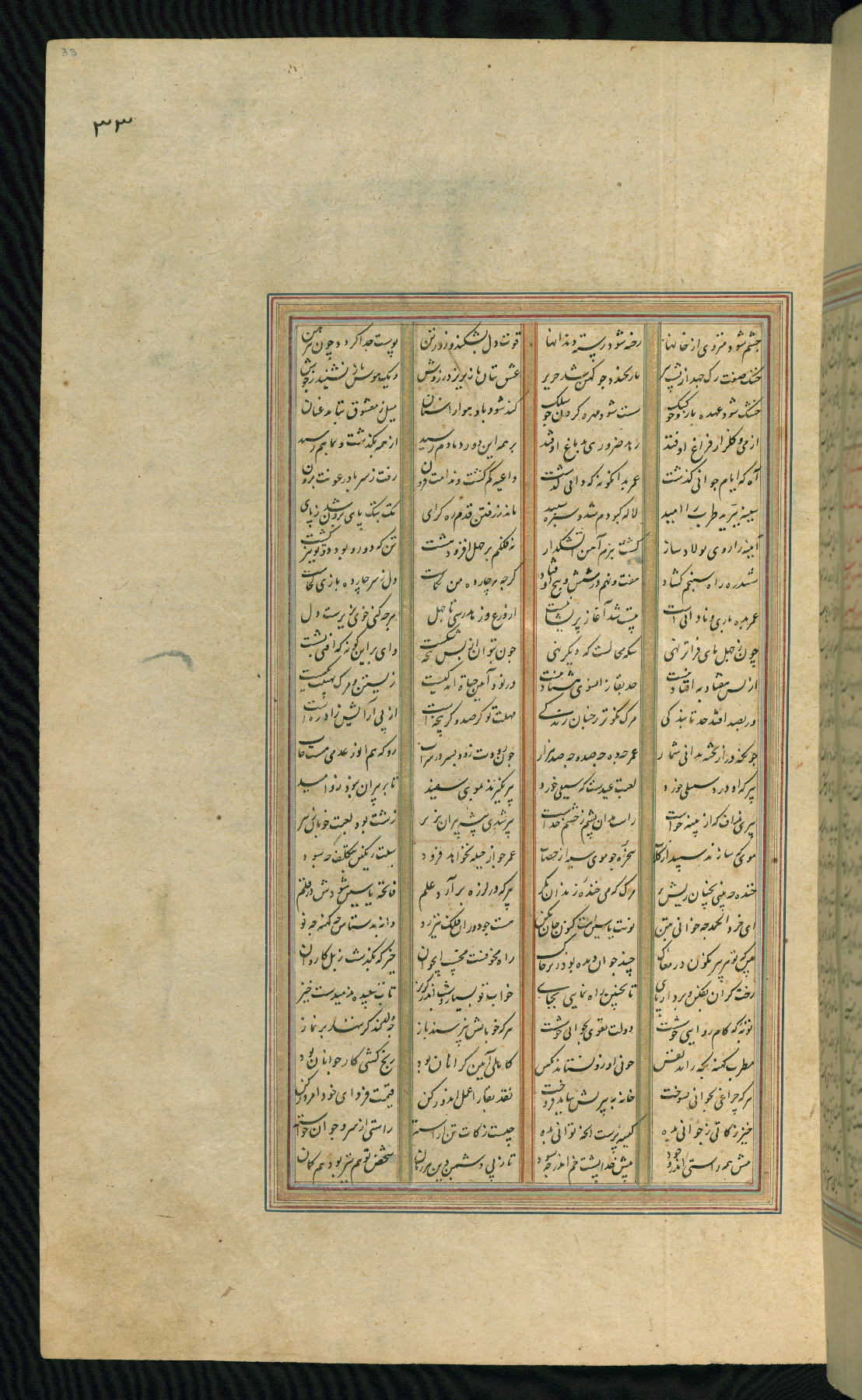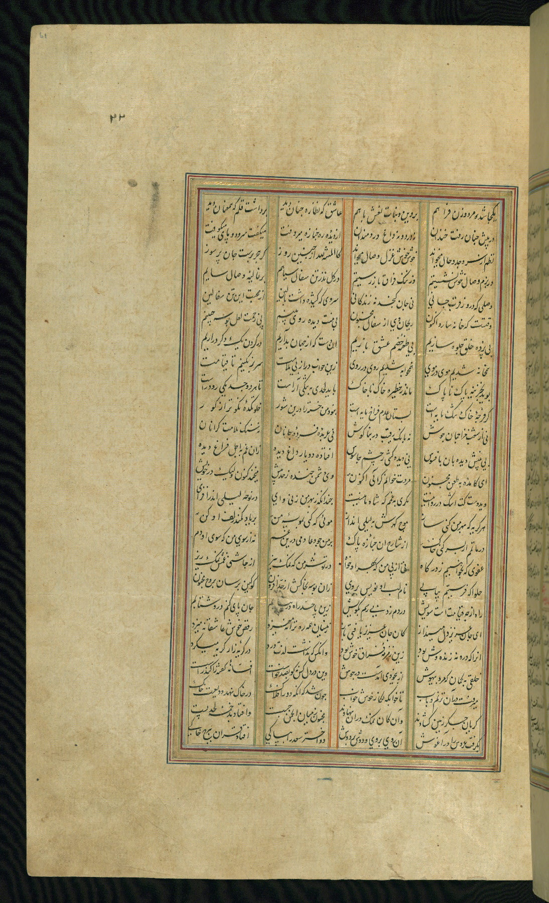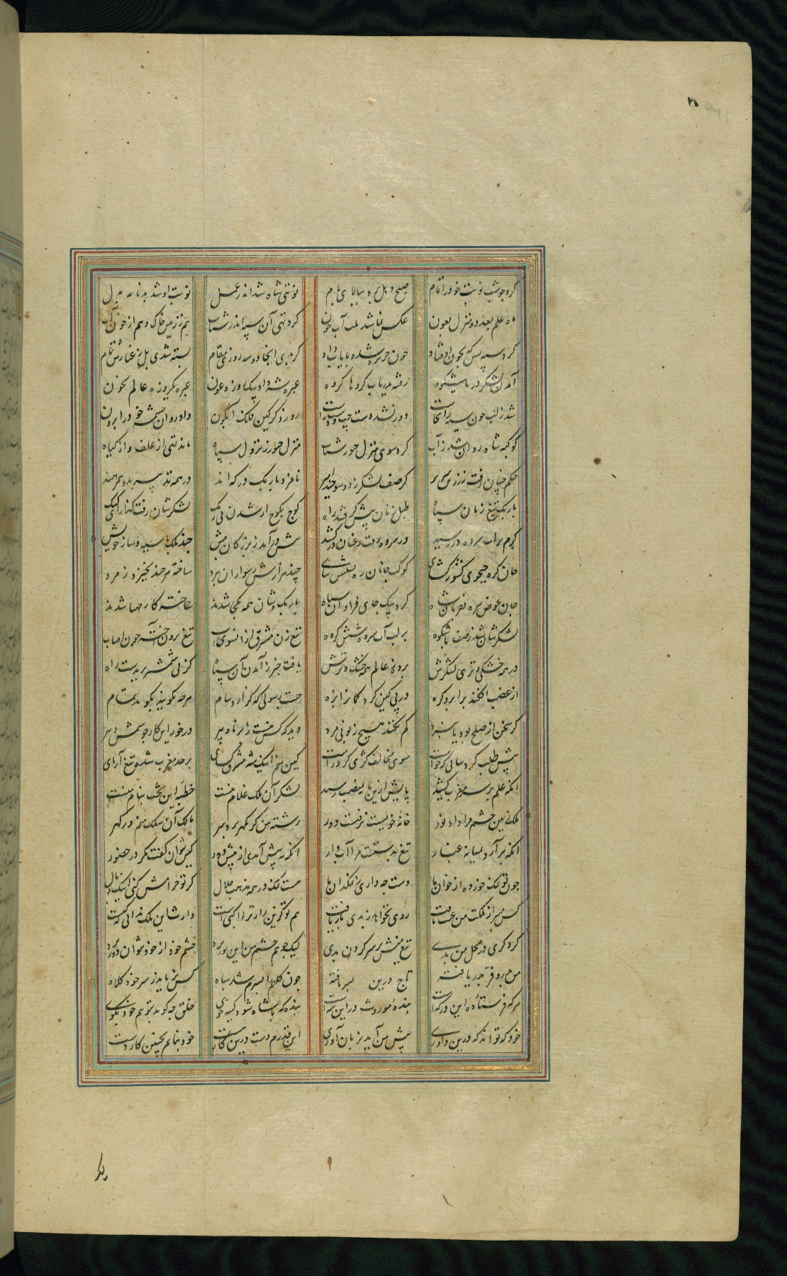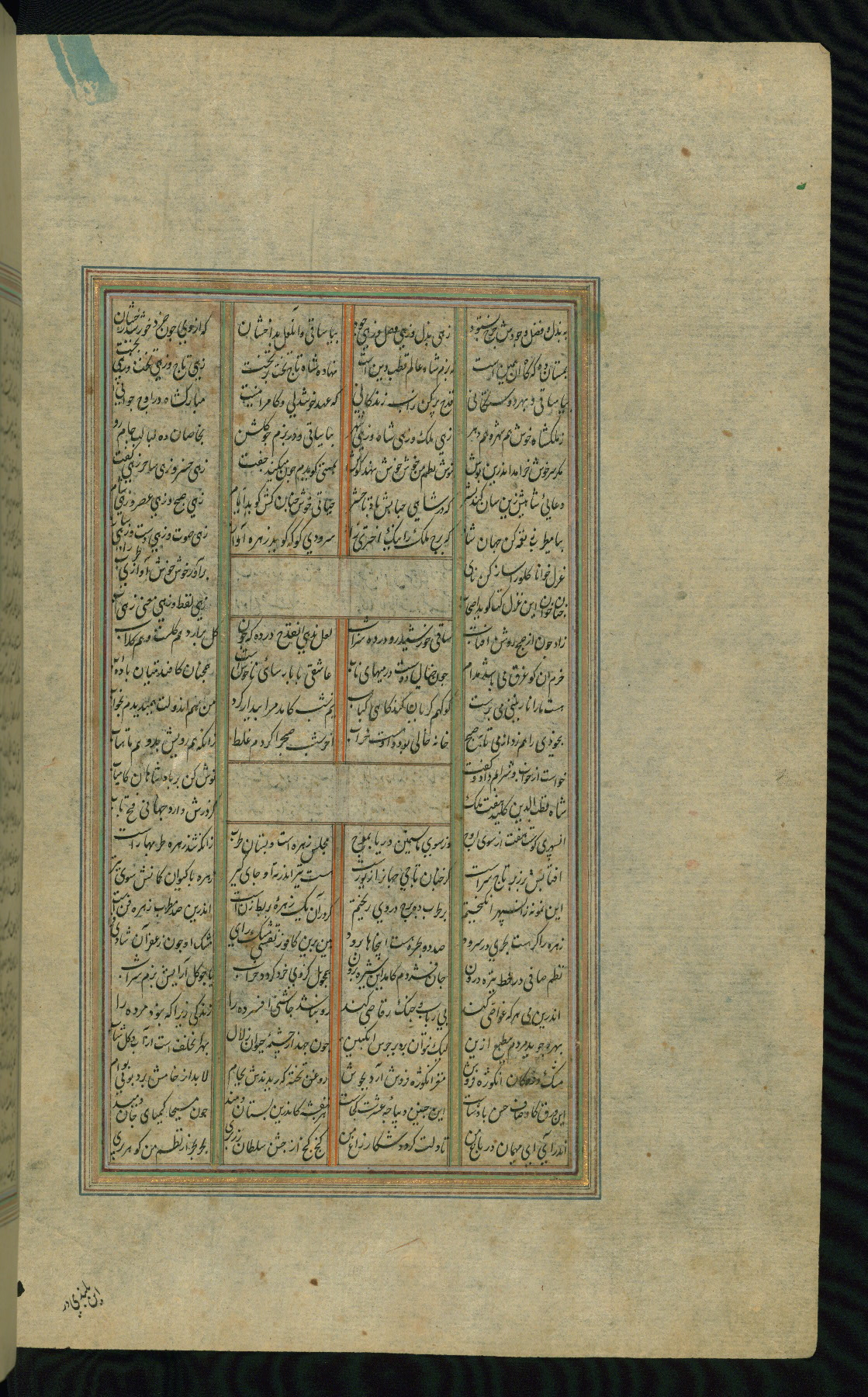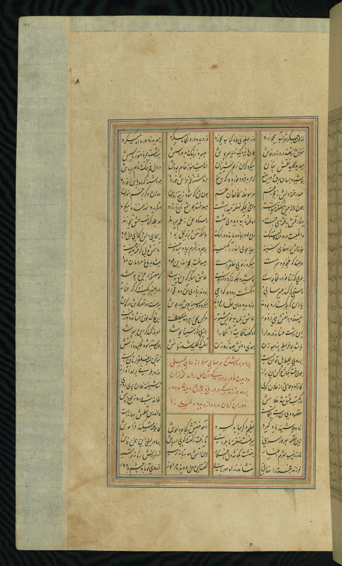 This illuminated and illustrated manuscript contains the Khamsah (quintet) and two historical poems (masnavi), Qirān-i saʿdayn and Nuh sipihr, by Amīr Khusraw Dihlavī (d. 725 AH / 1325 CE). The codex is dated 1017 AH / 1609 CE and was produced in Safavid Iran. All texts are written in black nastaʿlīq script with chapter headings in red. The manuscript opens with an illuminated and illustrated frontispiece of a hunting and court scene in the early Safavid style (fols. 1b-2a). The first text is Khamsah-i Dihlavī (fols. 2b-192a), which is introduced by an illuminated incipit and titlepiece with the title of the first poem of the quintet and the author's name. The second text is Qirān-i saʿdayn, a historical poem (masnavi) about the meeting of Sultan Muʿizz al-Dīn Kayqubād and his father, Nāṣir al-Din Bughrā Khān, on the banks of the Sarjū in Oudh. It is also introduced with an illuminated incipit and titlepiece (fol. 193b). The third text is Nuh sipihr, a historical poem (masnavi) describing the glories of Sultan Quṭb al-Dīn Mubārak Shāh Khaljī’s time, introduced with an illuminated incipit and headpiece (fol. 223b). The dark brown leather binding is original to the manuscript.