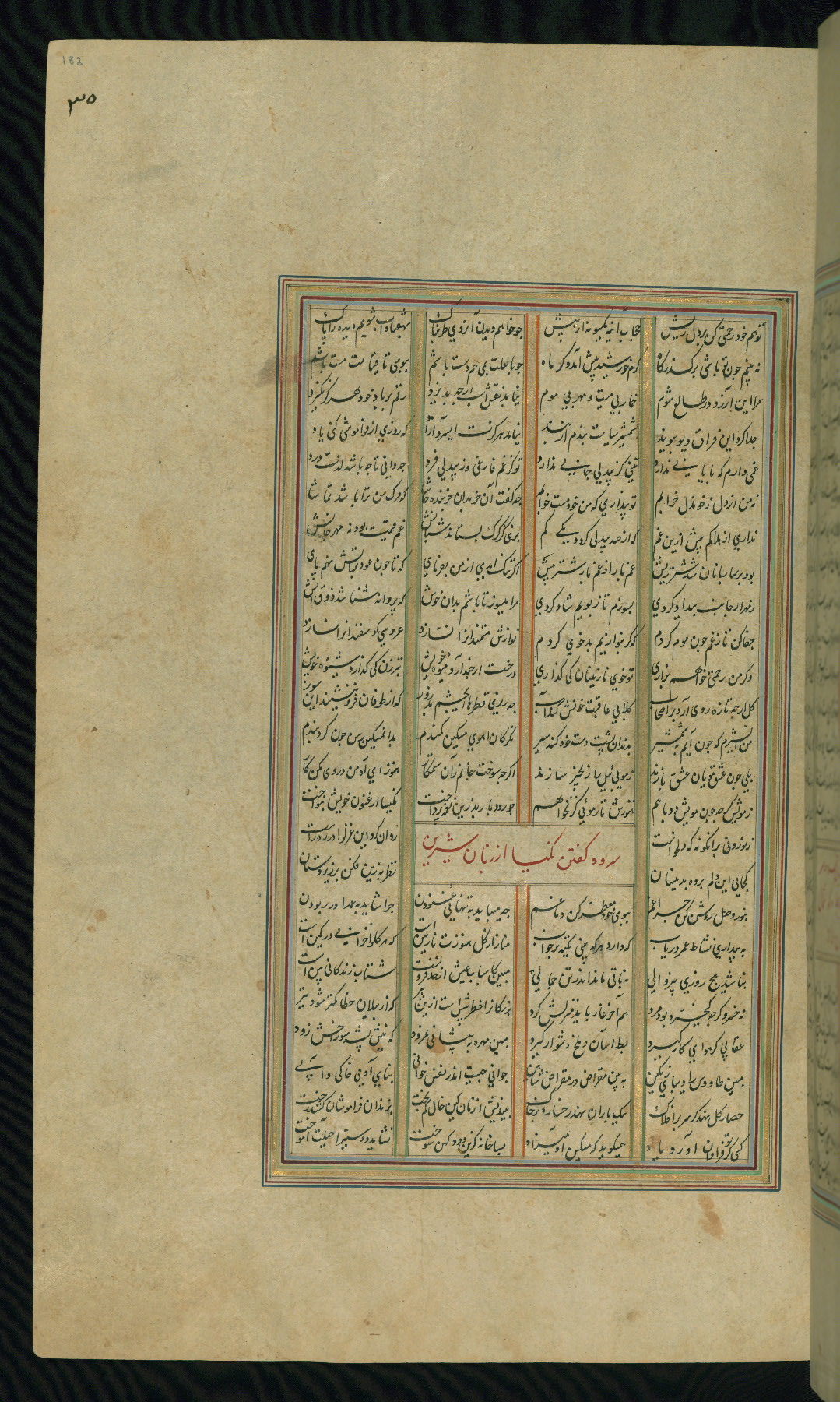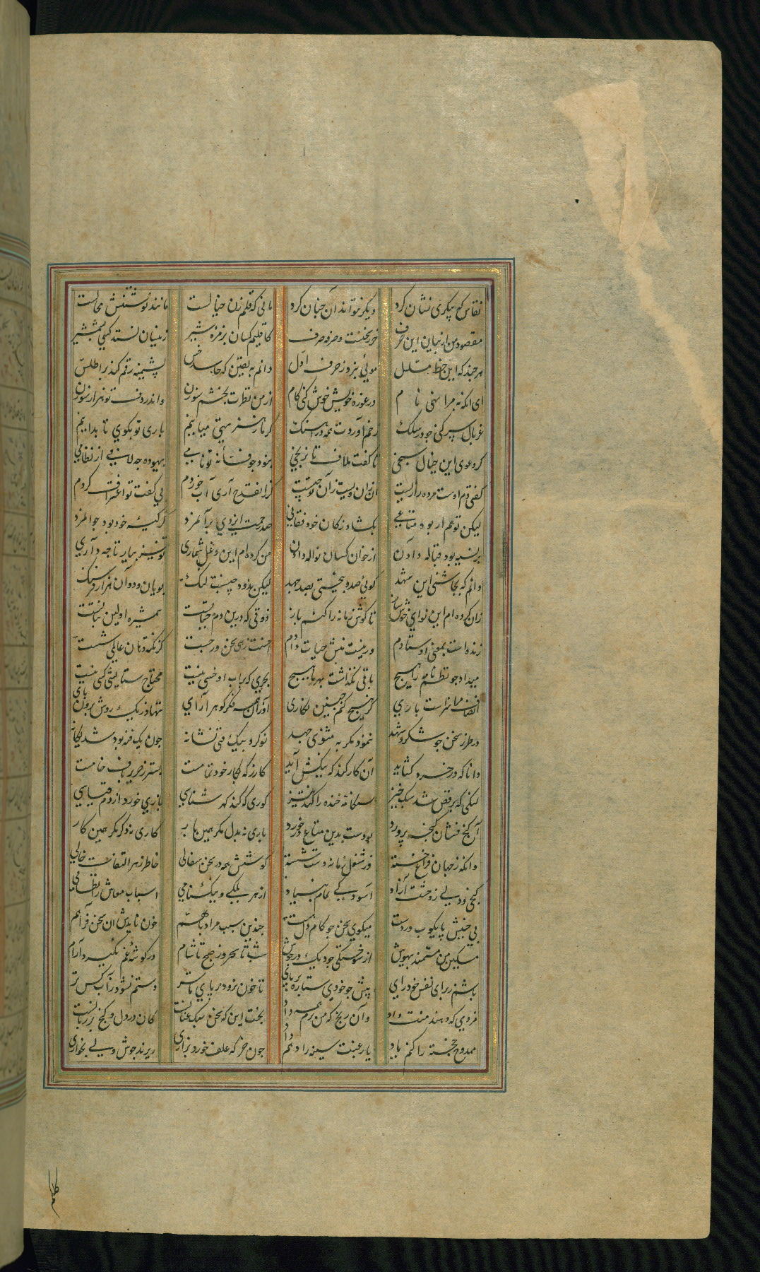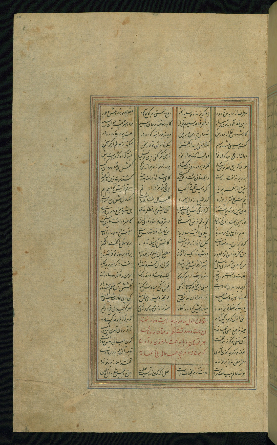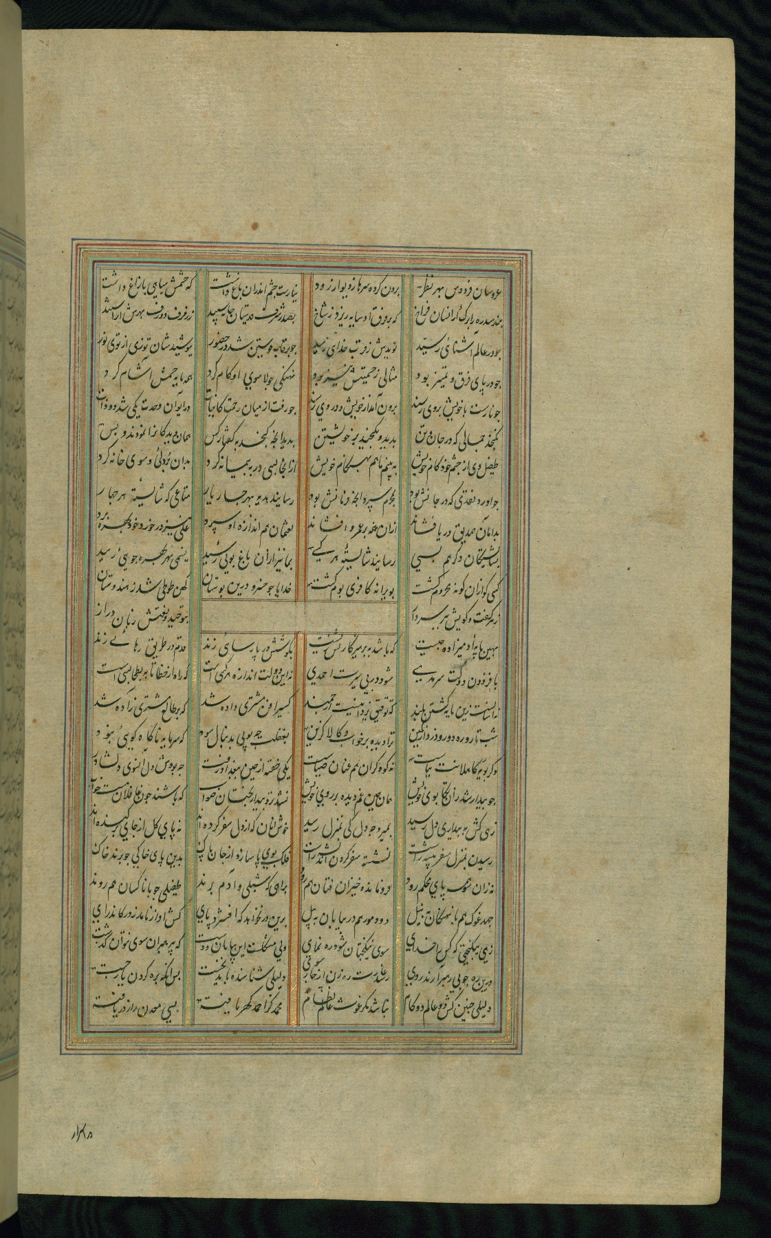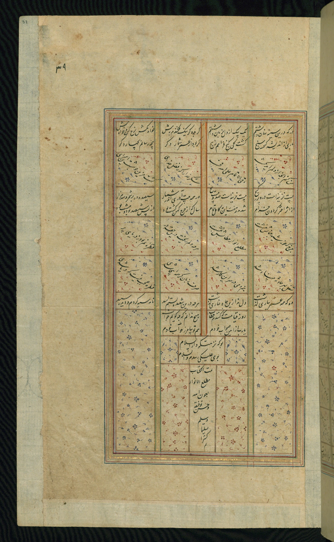 This illuminated and illustrated manuscript contains the Khamsah (quintet) and two historical poems (masnavi), Qirān-i saʿdayn and Nuh sipihr, by Amīr Khusraw Dihlavī (d. 725 AH / 1325 CE). The codex is dated 1017 AH / 1609 CE and was produced in Safavid Iran. All texts are written in black nastaʿlīq script with chapter headings in red. The manuscript opens with an illuminated and illustrated frontispiece of a hunting and court scene in the early Safavid style (fols. 1b-2a). The first text is Khamsah-i Dihlavī (fols. 2b-192a), which is introduced by an illuminated incipit and titlepiece with the title of the first poem of the quintet and the author's name. The second text is Qirān-i saʿdayn, a historical poem (masnavi) about the meeting of Sultan Muʿizz al-Dīn Kayqubād and his father, Nāṣir al-Din Bughrā Khān, on the banks of the Sarjū in Oudh. It is also introduced with an illuminated incipit and titlepiece (fol. 193b). The third text is Nuh sipihr, a historical poem (masnavi) describing the glories of Sultan Quṭb al-Dīn Mubārak Shāh Khaljī’s time, introduced with an illuminated incipit and headpiece (fol. 223b). The dark brown leather binding is original to the manuscript.