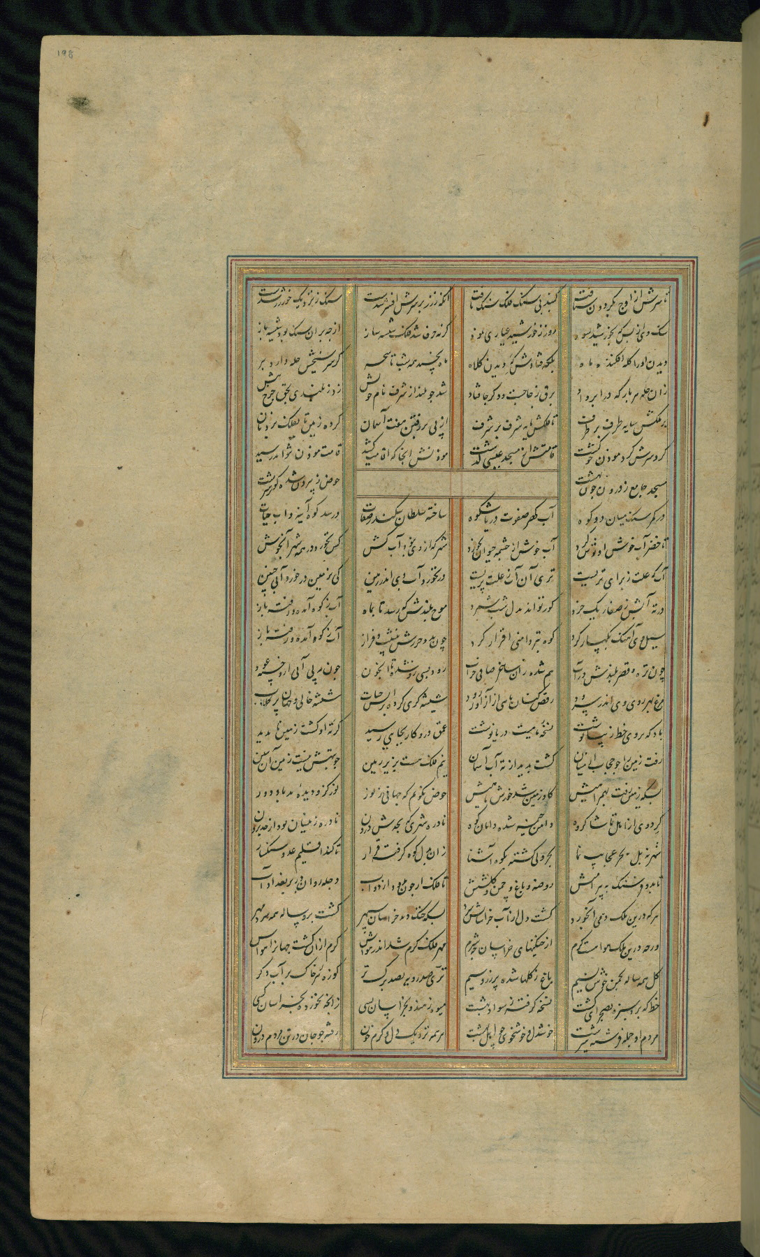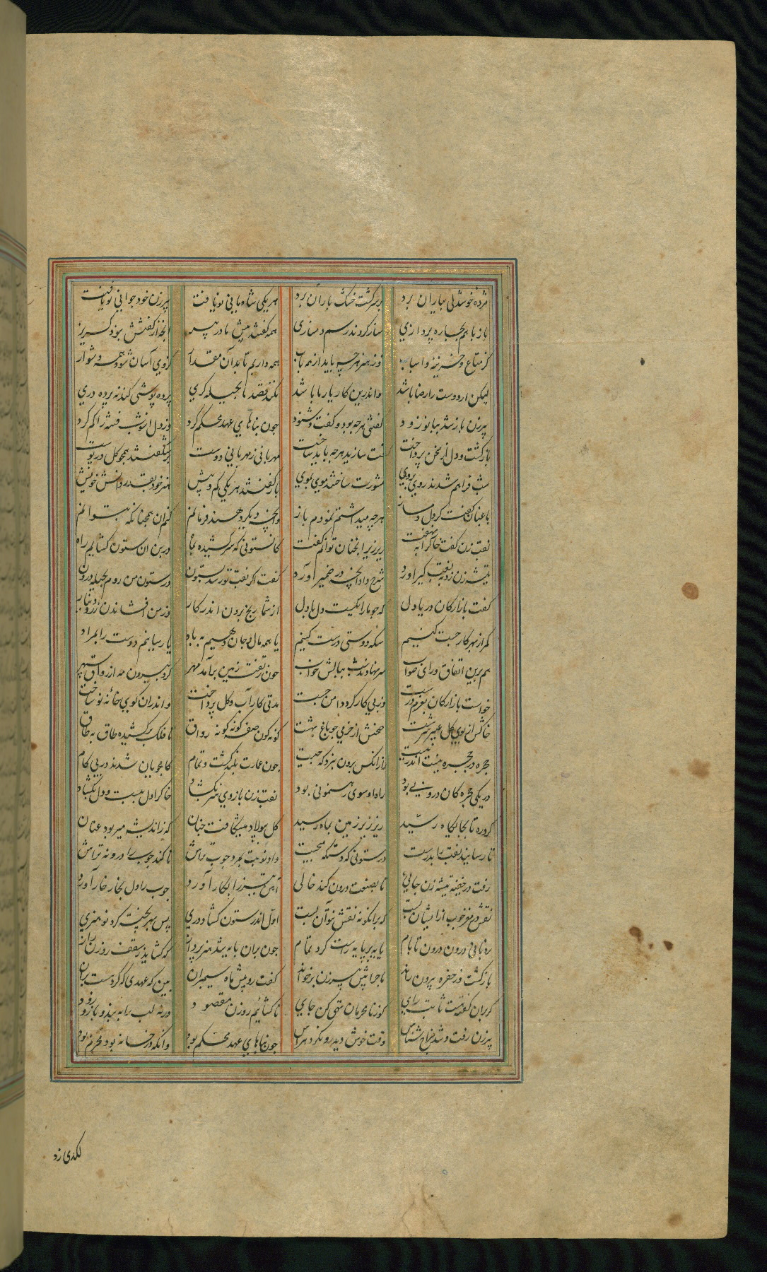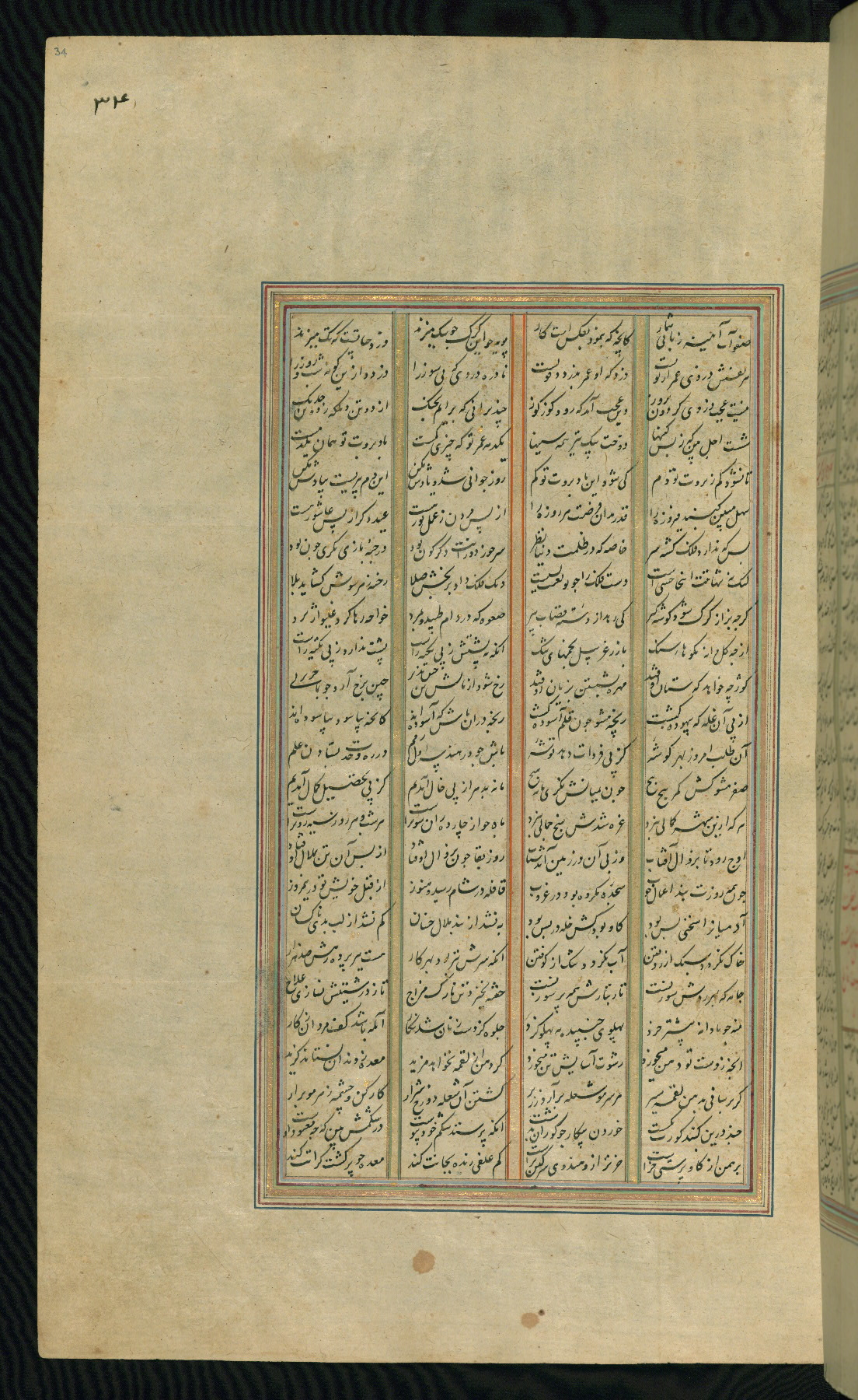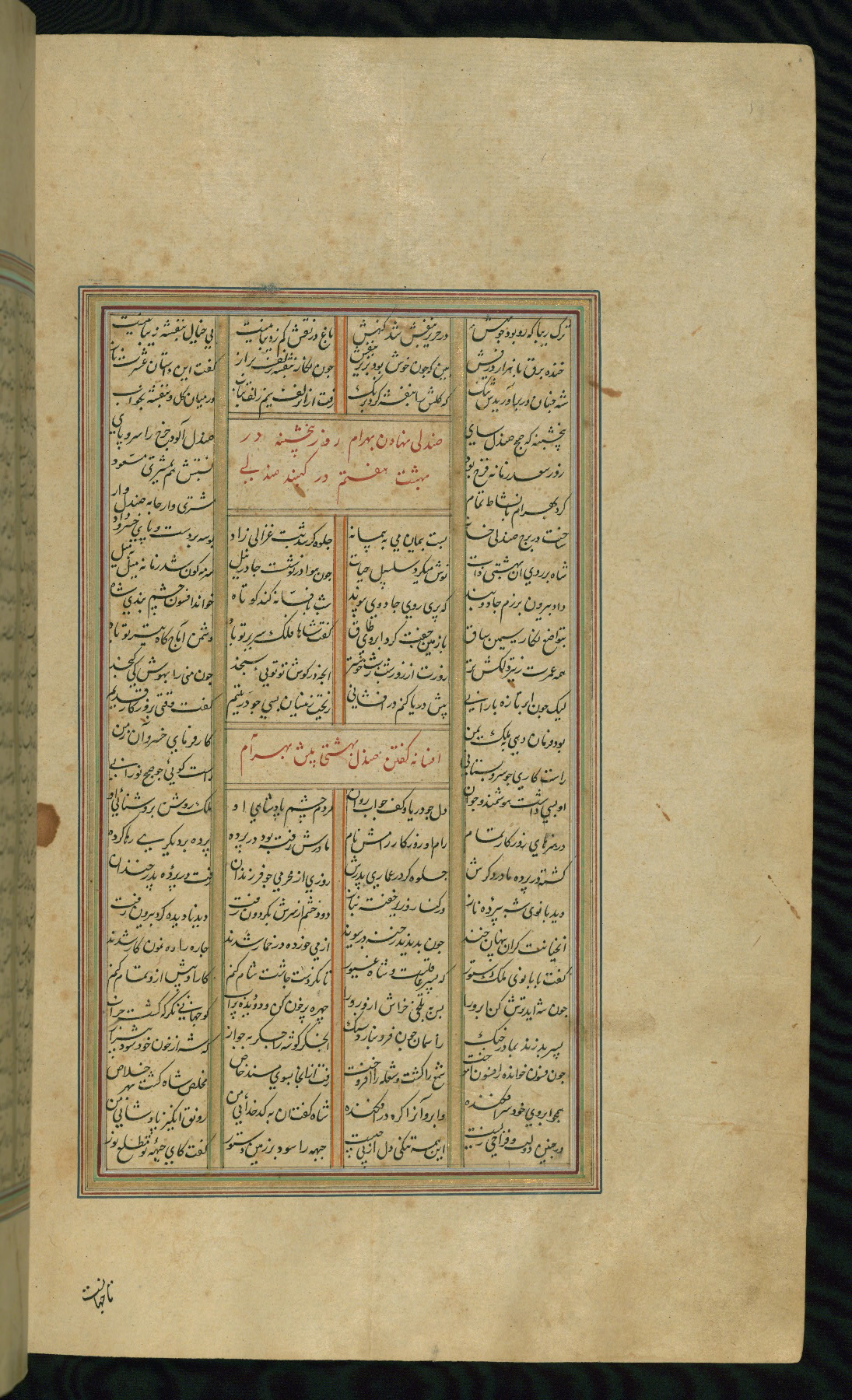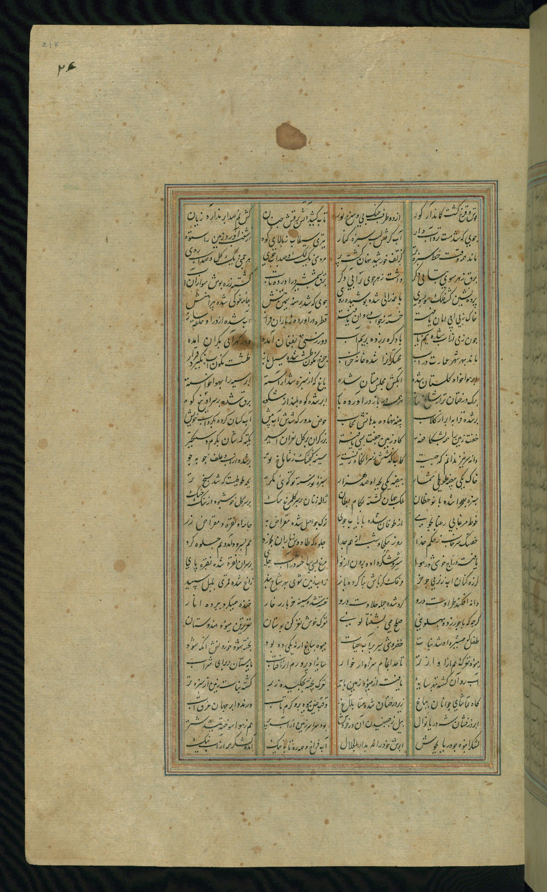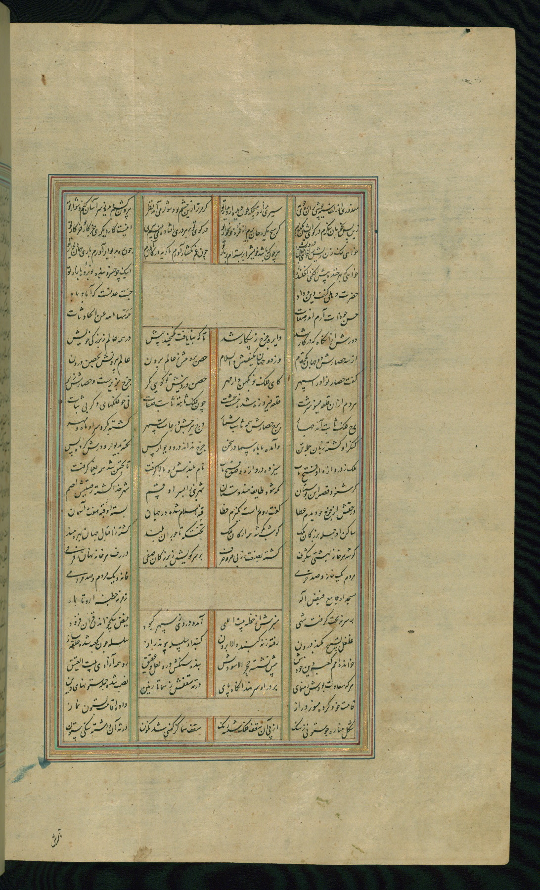 This illuminated and illustrated manuscript contains the Khamsah (quintet) and two historical poems (masnavi), Qirān-i saʿdayn and Nuh sipihr, by Amīr Khusraw Dihlavī (d. 725 AH / 1325 CE). The codex is dated 1017 AH / 1609 CE and was produced in Safavid Iran. All texts are written in black nastaʿlīq script with chapter headings in red. The manuscript opens with an illuminated and illustrated frontispiece of a hunting and court scene in the early Safavid style (fols. 1b-2a). The first text is Khamsah-i Dihlavī (fols. 2b-192a), which is introduced by an illuminated incipit and titlepiece with the title of the first poem of the quintet and the author's name. The second text is Qirān-i saʿdayn, a historical poem (masnavi) about the meeting of Sultan Muʿizz al-Dīn Kayqubād and his father, Nāṣir al-Din Bughrā Khān, on the banks of the Sarjū in Oudh. It is also introduced with an illuminated incipit and titlepiece (fol. 193b). The third text is Nuh sipihr, a historical poem (masnavi) describing the glories of Sultan Quṭb al-Dīn Mubārak Shāh Khaljī’s time, introduced with an illuminated incipit and headpiece (fol. 223b). The dark brown leather binding is original to the manuscript.