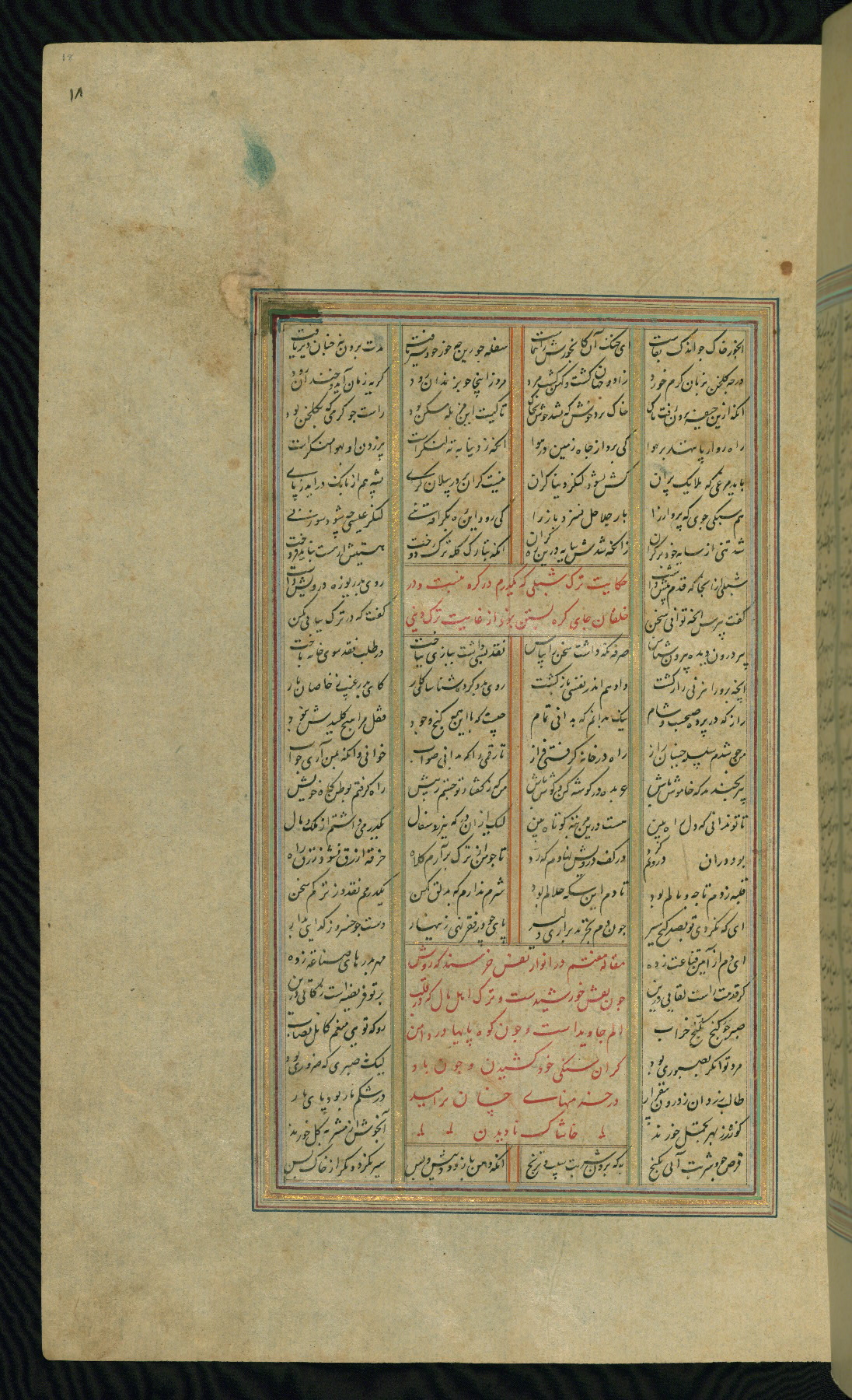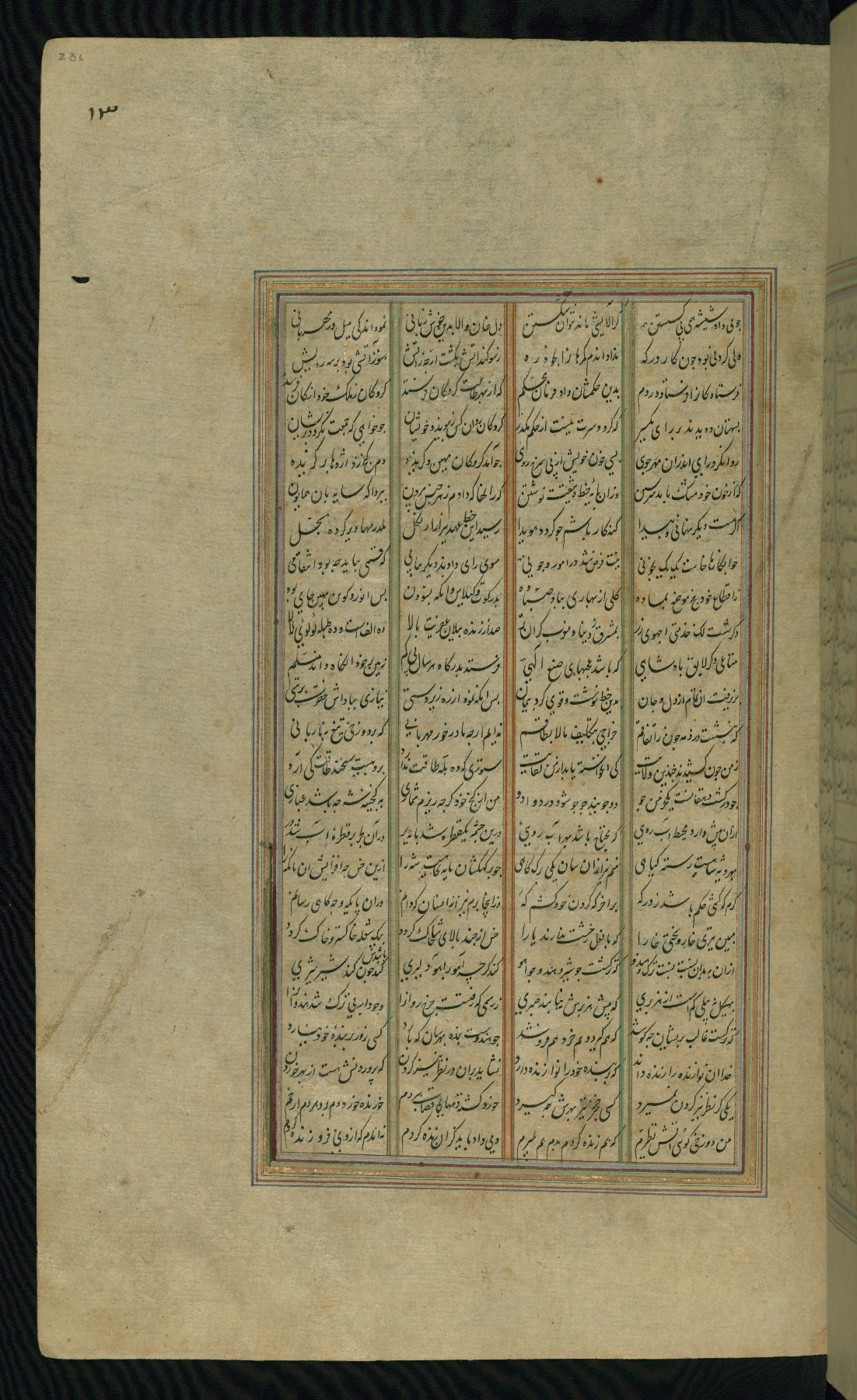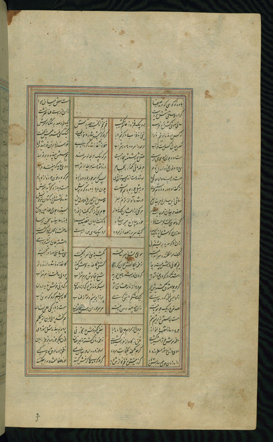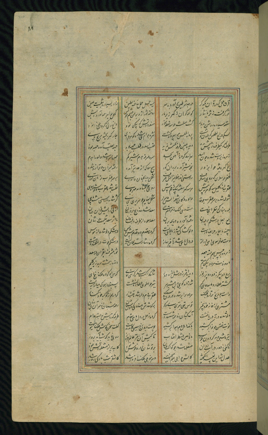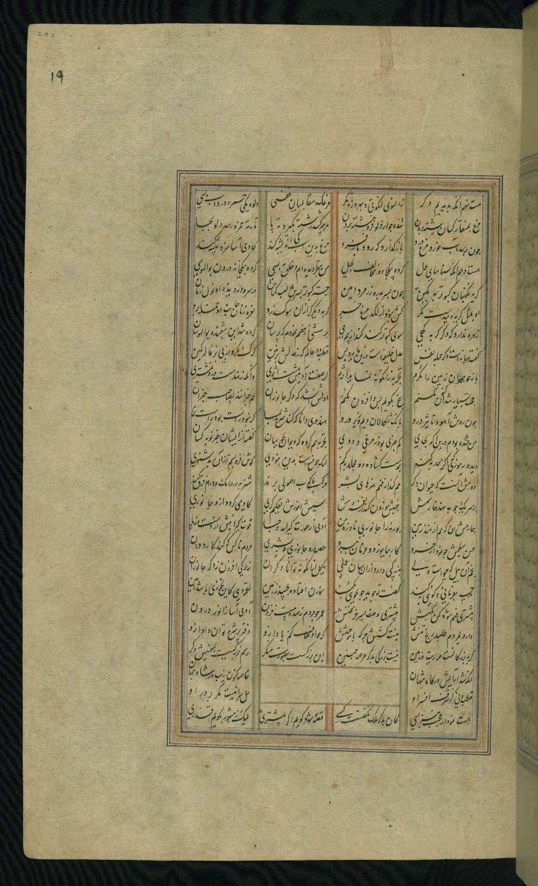 This illuminated and illustrated manuscript contains the Khamsah (quintet) and two historical poems (masnavi), Qirān-i saʿdayn and Nuh sipihr, by Amīr Khusraw Dihlavī (d. 725 AH / 1325 CE). The codex is dated 1017 AH / 1609 CE and was produced in Safavid Iran. All texts are written in black nastaʿlīq script with chapter headings in red. The manuscript opens with an illuminated and illustrated frontispiece of a hunting and court scene in the early Safavid style (fols. 1b-2a). The first text is Khamsah-i Dihlavī (fols. 2b-192a), which is introduced by an illuminated incipit and titlepiece with the title of the first poem of the quintet and the author's name. The second text is Qirān-i saʿdayn, a historical poem (masnavi) about the meeting of Sultan Muʿizz al-Dīn Kayqubād and his father, Nāṣir al-Din Bughrā Khān, on the banks of the Sarjū in Oudh. It is also introduced with an illuminated incipit and titlepiece (fol. 193b). The third text is Nuh sipihr, a historical poem (masnavi) describing the glories of Sultan Quṭb al-Dīn Mubārak Shāh Khaljī’s time, introduced with an illuminated incipit and headpiece (fol. 223b). The dark brown leather binding is original to the manuscript.