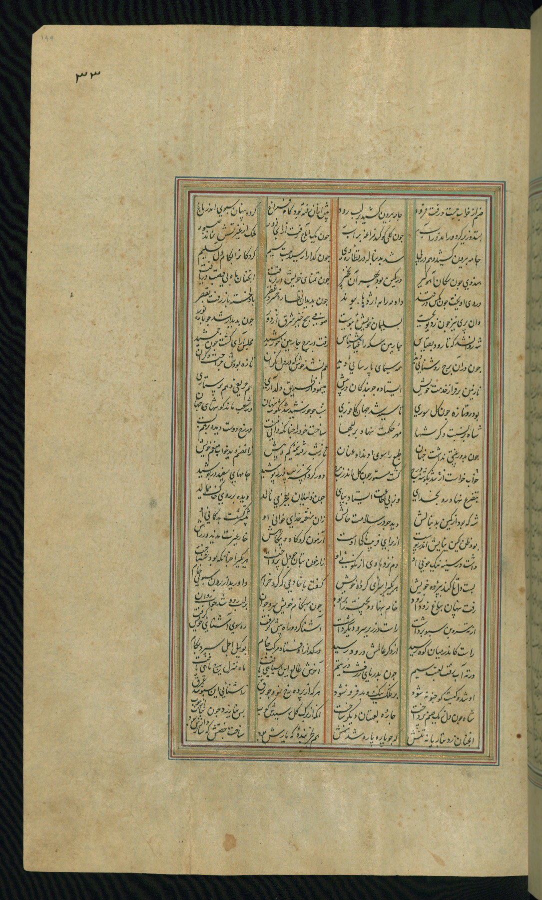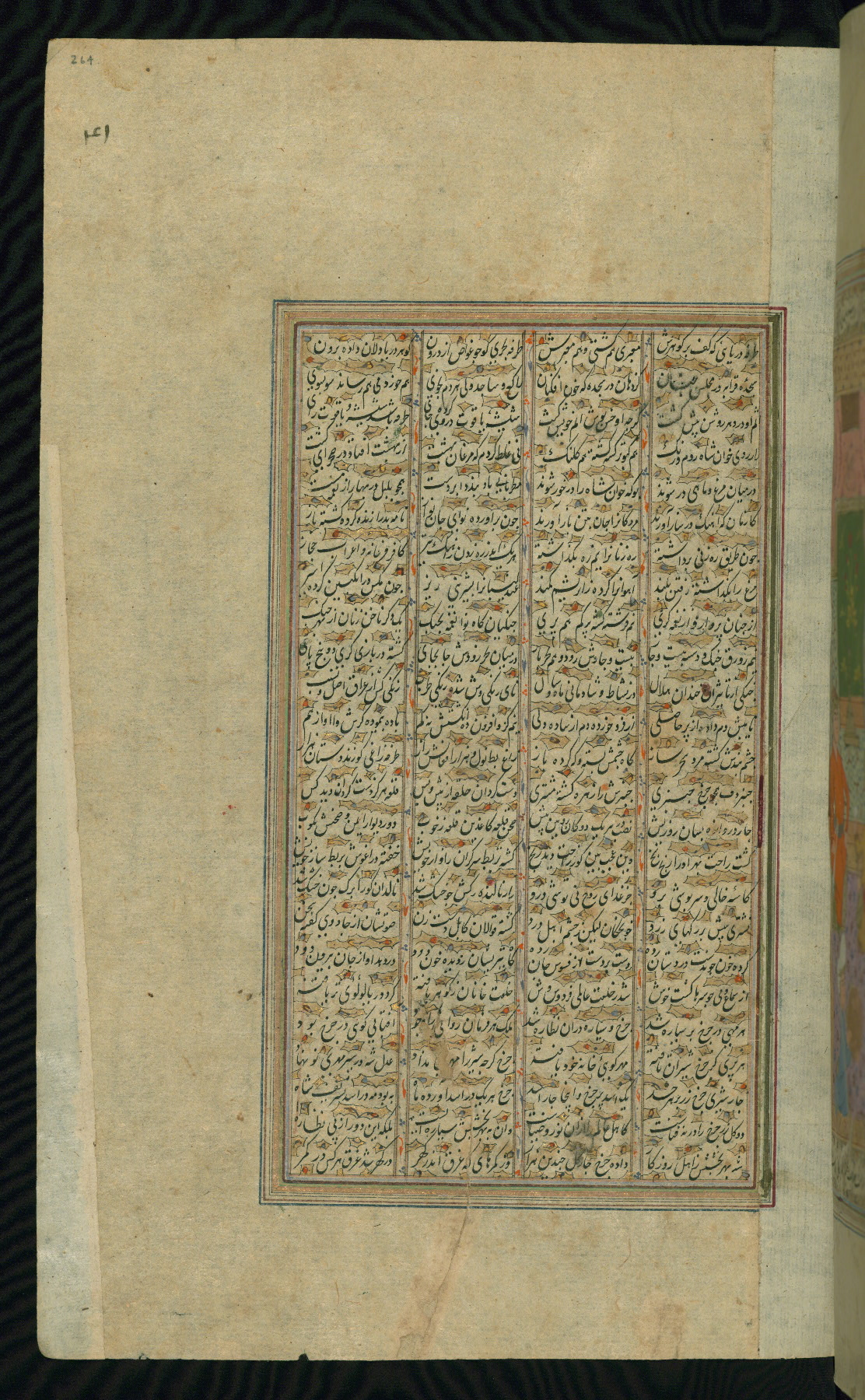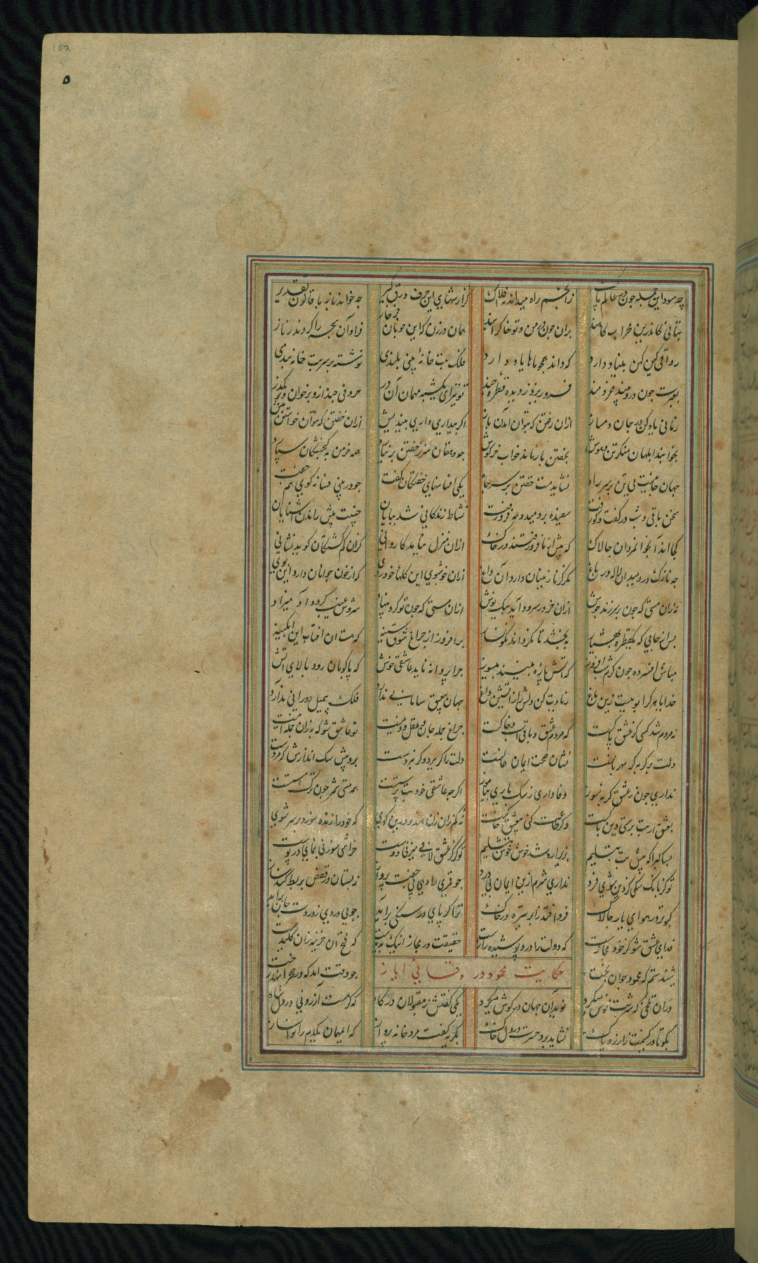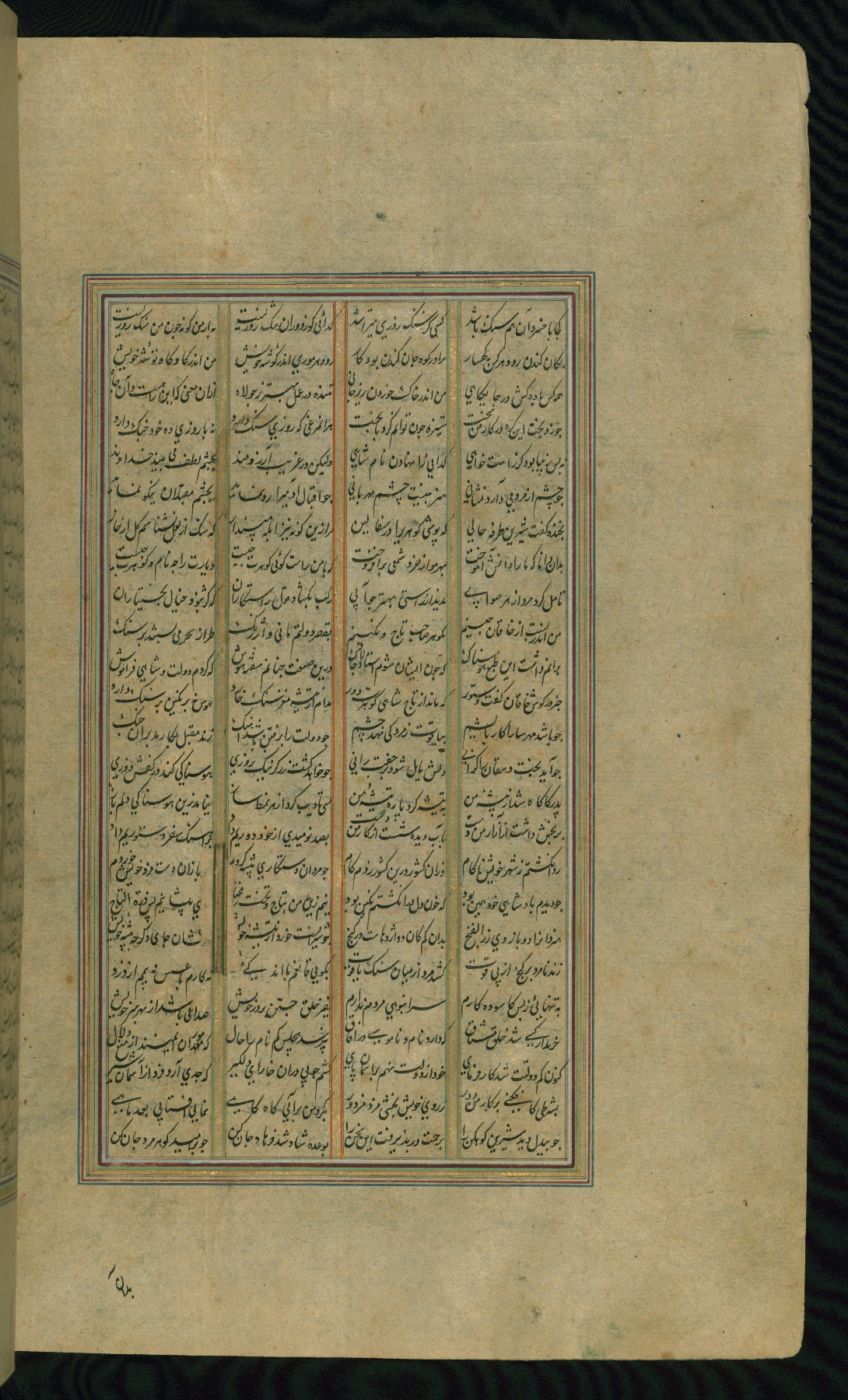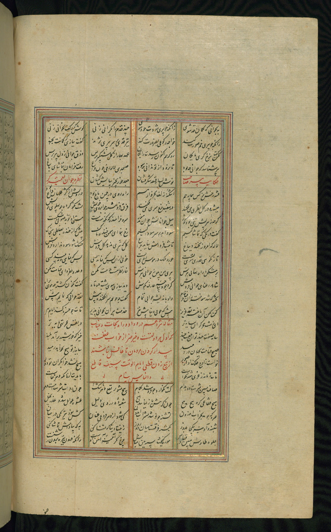 This illuminated and illustrated manuscript contains the Khamsah (quintet) and two historical poems (masnavi), Qirān-i saʿdayn and Nuh sipihr, by Amīr Khusraw Dihlavī (d. 725 AH / 1325 CE). The codex is dated 1017 AH / 1609 CE and was produced in Safavid Iran. All texts are written in black nastaʿlīq script with chapter headings in red. The manuscript opens with an illuminated and illustrated frontispiece of a hunting and court scene in the early Safavid style (fols. 1b-2a). The first text is Khamsah-i Dihlavī (fols. 2b-192a), which is introduced by an illuminated incipit and titlepiece with the title of the first poem of the quintet and the author's name. The second text is Qirān-i saʿdayn, a historical poem (masnavi) about the meeting of Sultan Muʿizz al-Dīn Kayqubād and his father, Nāṣir al-Din Bughrā Khān, on the banks of the Sarjū in Oudh. It is also introduced with an illuminated incipit and titlepiece (fol. 193b). The third text is Nuh sipihr, a historical poem (masnavi) describing the glories of Sultan Quṭb al-Dīn Mubārak Shāh Khaljī’s time, introduced with an illuminated incipit and headpiece (fol. 223b). The dark brown leather binding is original to the manuscript.