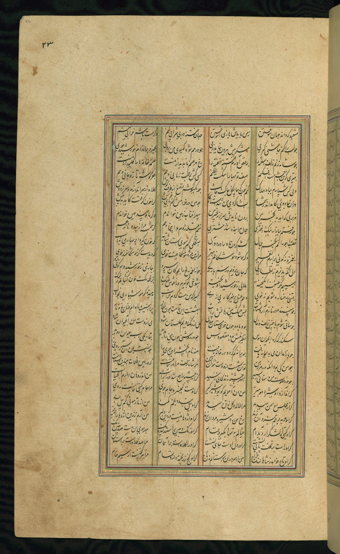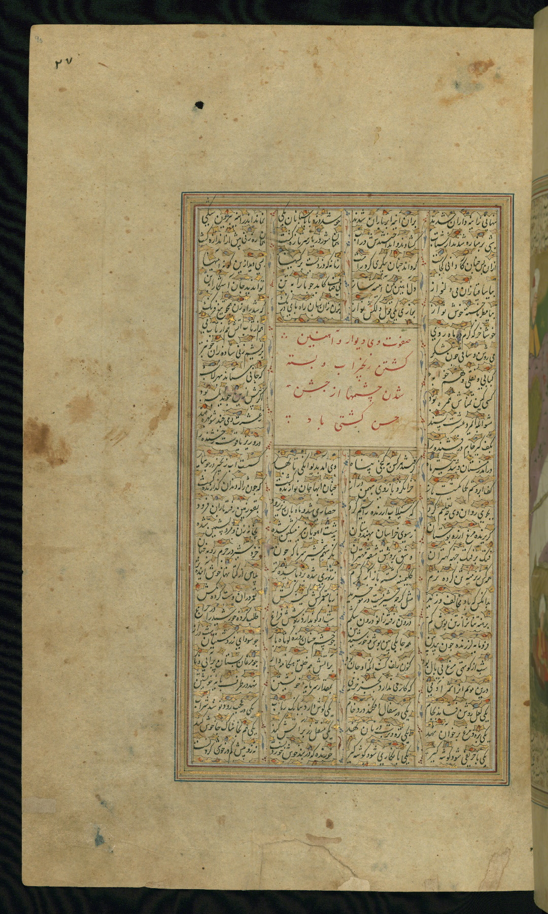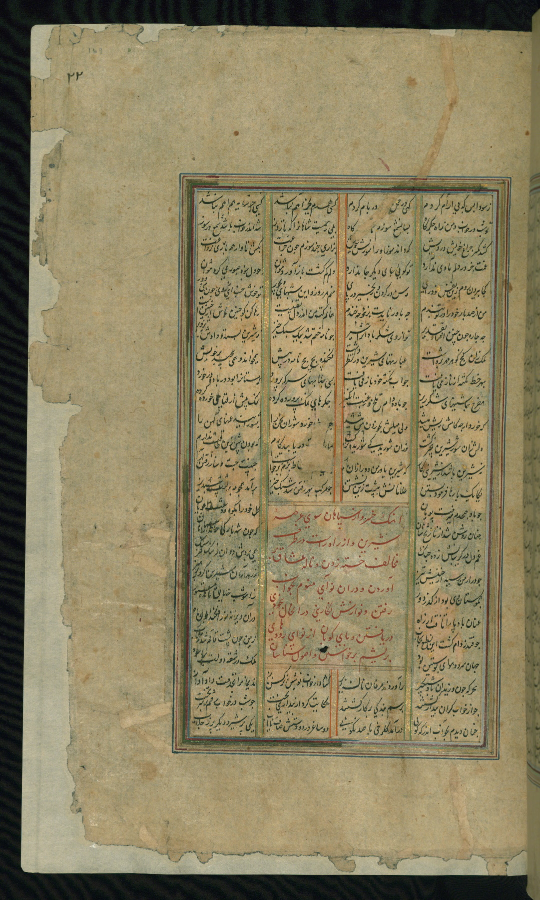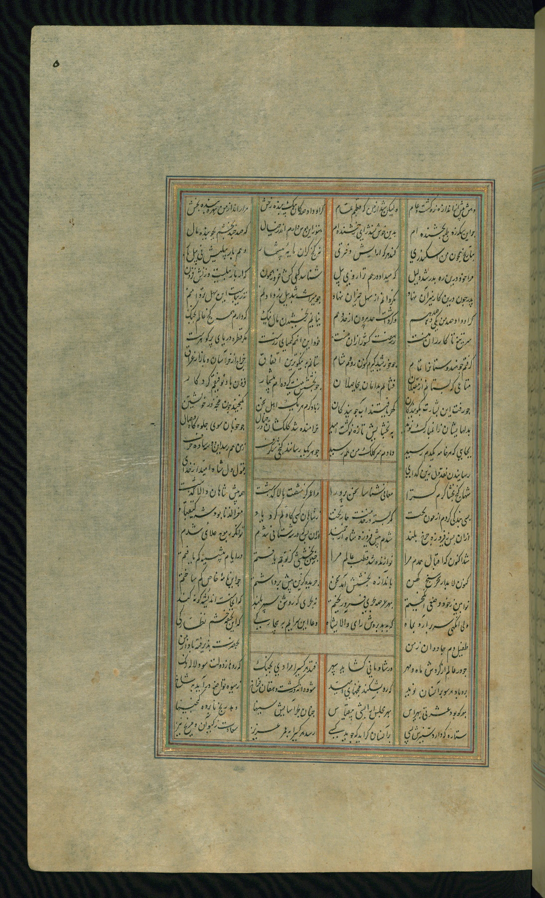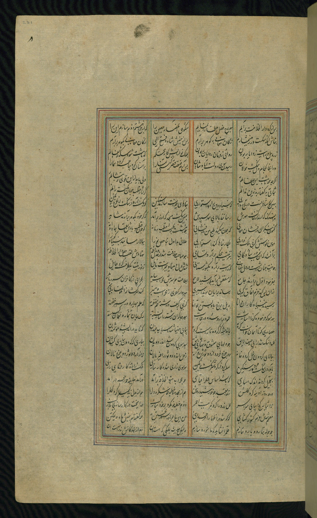 This illuminated and illustrated manuscript contains the Khamsah (quintet) and two historical poems (masnavi), Qirān-i saʿdayn and Nuh sipihr, by Amīr Khusraw Dihlavī (d. 725 AH / 1325 CE). The codex is dated 1017 AH / 1609 CE and was produced in Safavid Iran. All texts are written in black nastaʿlīq script with chapter headings in red. The manuscript opens with an illuminated and illustrated frontispiece of a hunting and court scene in the early Safavid style (fols. 1b-2a). The first text is Khamsah-i Dihlavī (fols. 2b-192a), which is introduced by an illuminated incipit and titlepiece with the title of the first poem of the quintet and the author's name. The second text is Qirān-i saʿdayn, a historical poem (masnavi) about the meeting of Sultan Muʿizz al-Dīn Kayqubād and his father, Nāṣir al-Din Bughrā Khān, on the banks of the Sarjū in Oudh. It is also introduced with an illuminated incipit and titlepiece (fol. 193b). The third text is Nuh sipihr, a historical poem (masnavi) describing the glories of Sultan Quṭb al-Dīn Mubārak Shāh Khaljī’s time, introduced with an illuminated incipit and headpiece (fol. 223b). The dark brown leather binding is original to the manuscript.