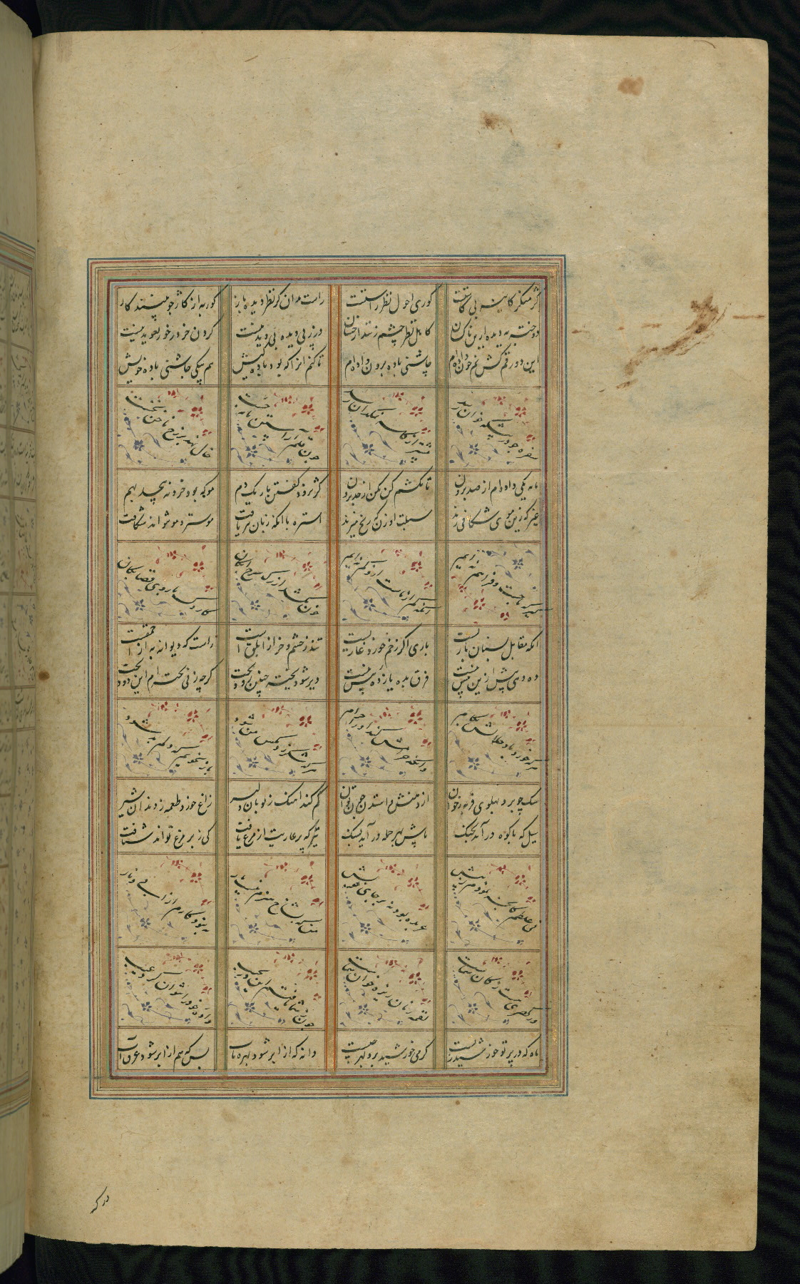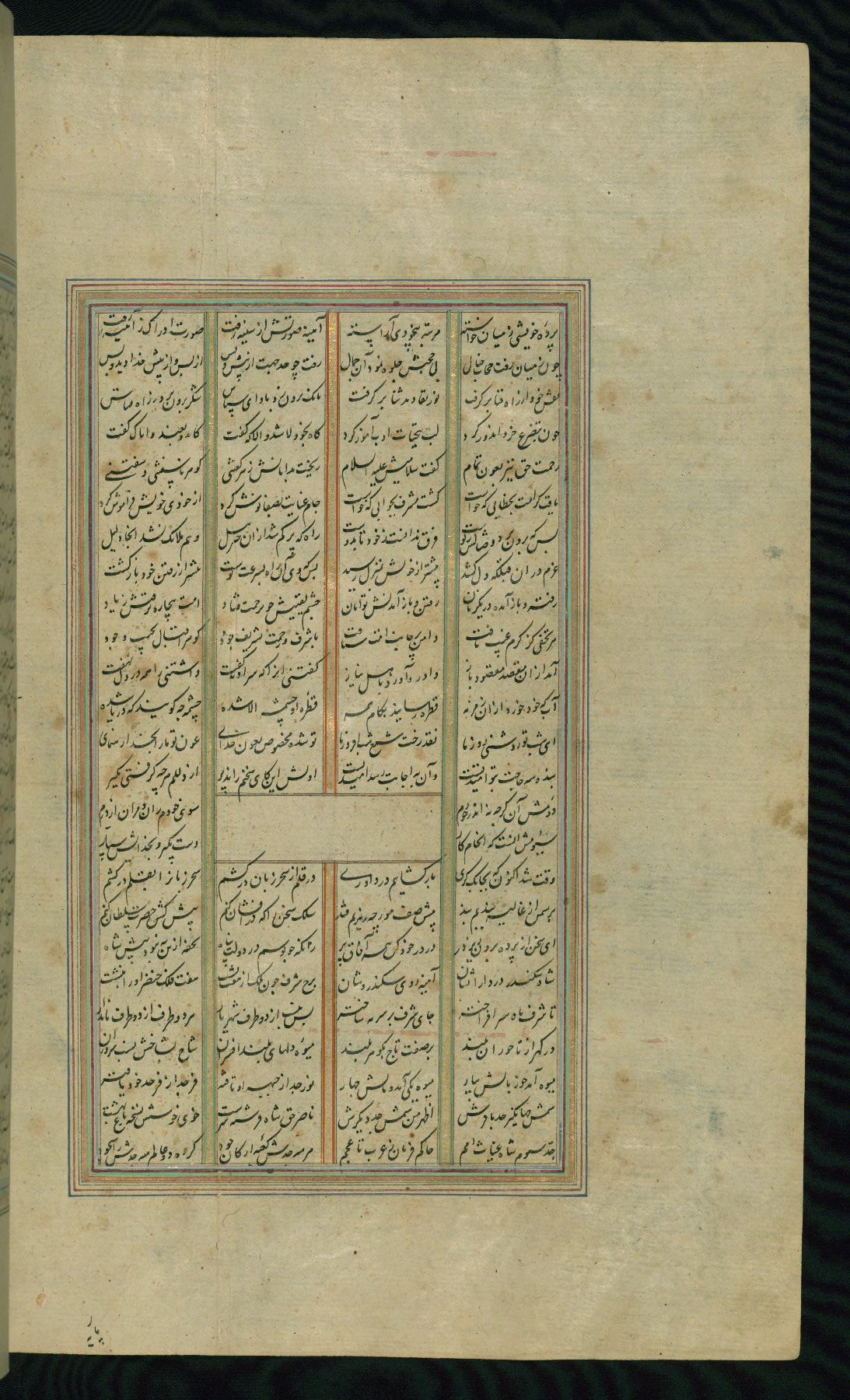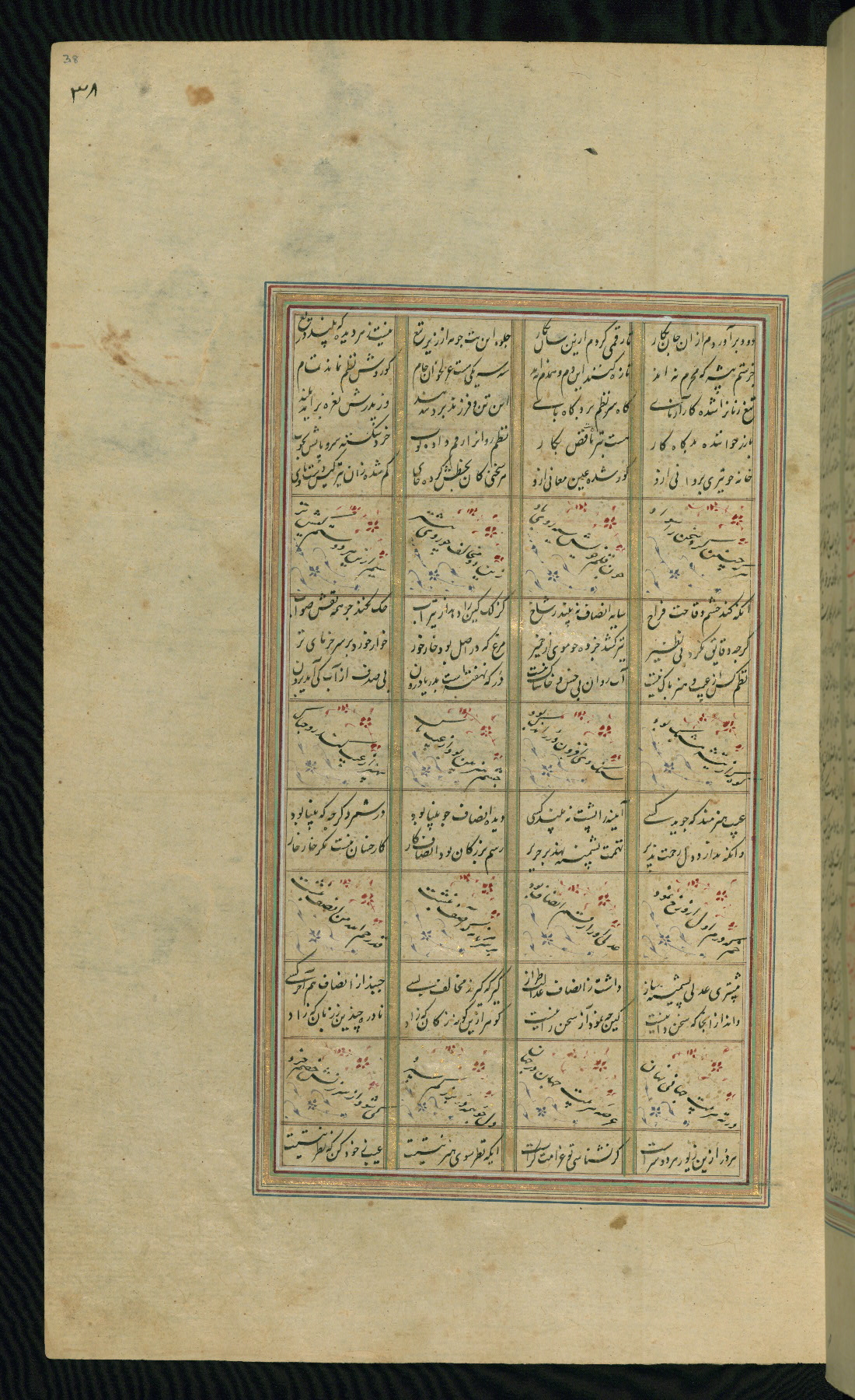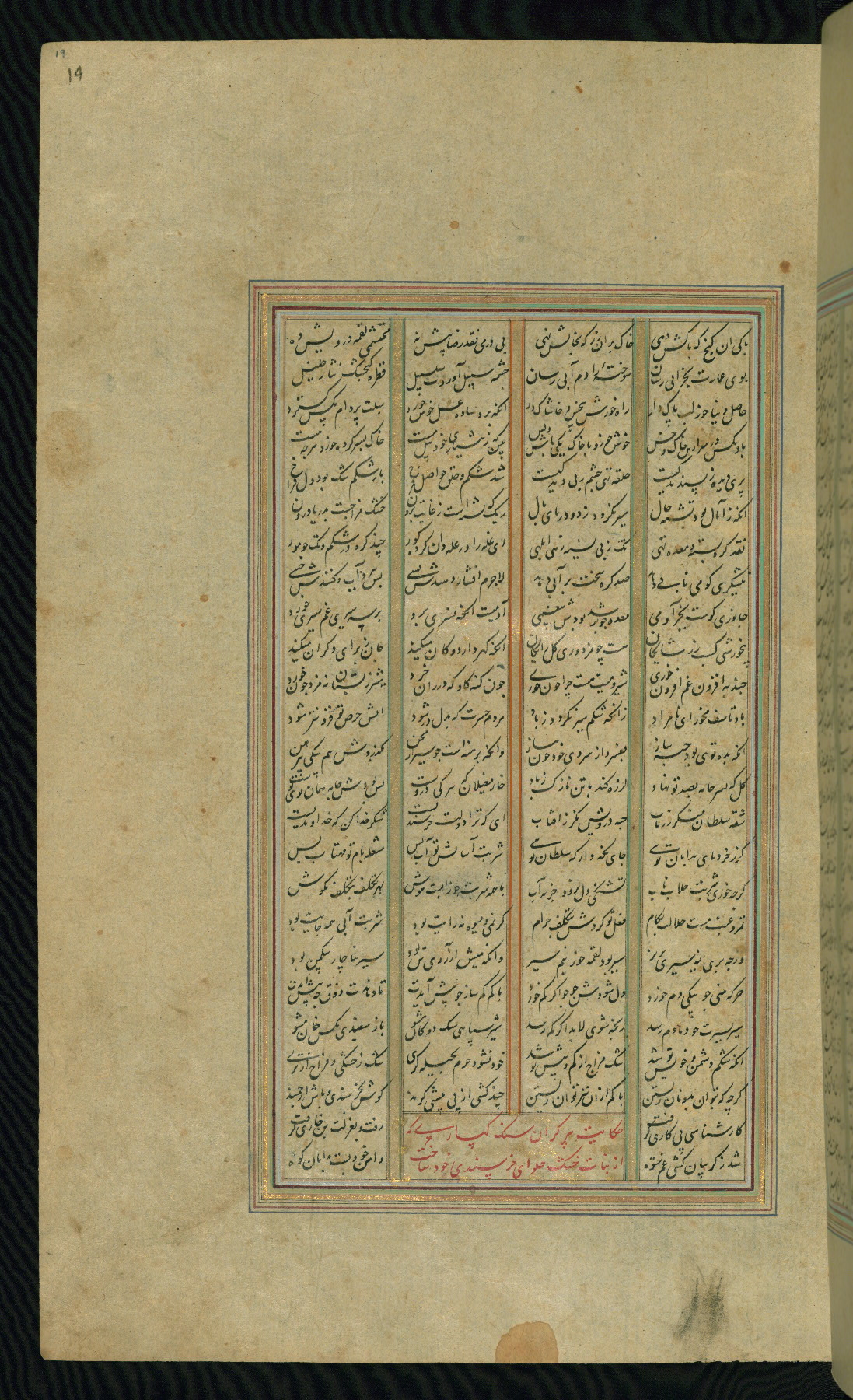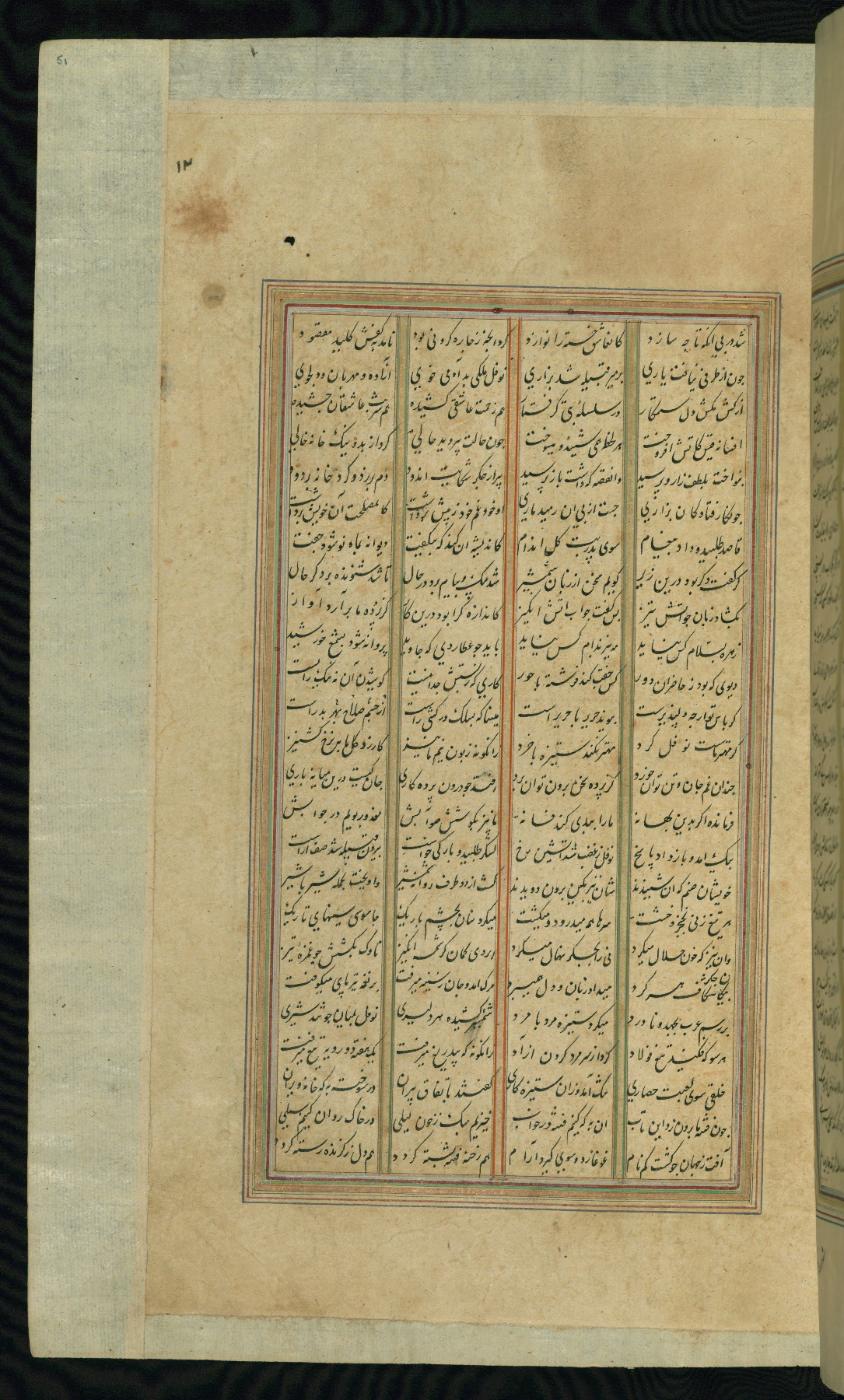 This illuminated and illustrated manuscript contains the Khamsah (quintet) and two historical poems (masnavi), Qirān-i saʿdayn and Nuh sipihr, by Amīr Khusraw Dihlavī (d. 725 AH / 1325 CE). The codex is dated 1017 AH / 1609 CE and was produced in Safavid Iran. All texts are written in black nastaʿlīq script with chapter headings in red. The manuscript opens with an illuminated and illustrated frontispiece of a hunting and court scene in the early Safavid style (fols. 1b-2a). The first text is Khamsah-i Dihlavī (fols. 2b-192a), which is introduced by an illuminated incipit and titlepiece with the title of the first poem of the quintet and the author's name. The second text is Qirān-i saʿdayn, a historical poem (masnavi) about the meeting of Sultan Muʿizz al-Dīn Kayqubād and his father, Nāṣir al-Din Bughrā Khān, on the banks of the Sarjū in Oudh. It is also introduced with an illuminated incipit and titlepiece (fol. 193b). The third text is Nuh sipihr, a historical poem (masnavi) describing the glories of Sultan Quṭb al-Dīn Mubārak Shāh Khaljī’s time, introduced with an illuminated incipit and headpiece (fol. 223b). The dark brown leather binding is original to the manuscript.