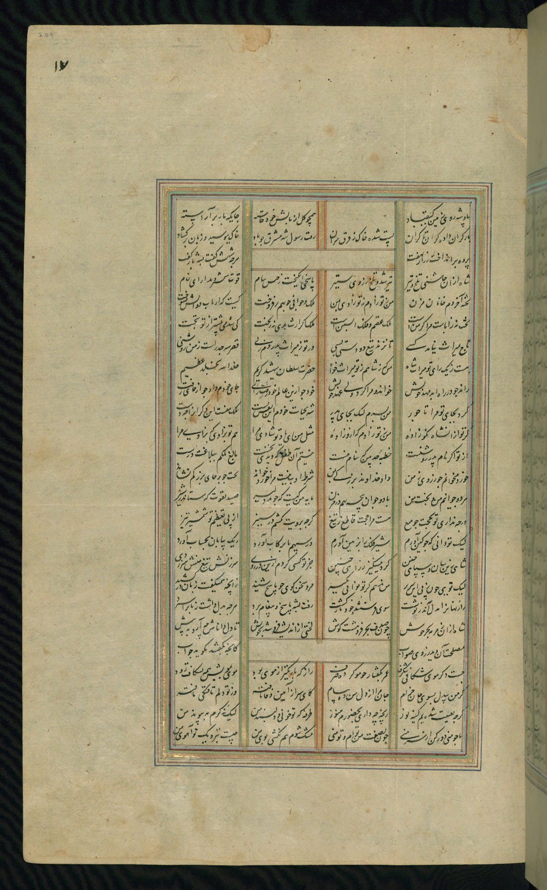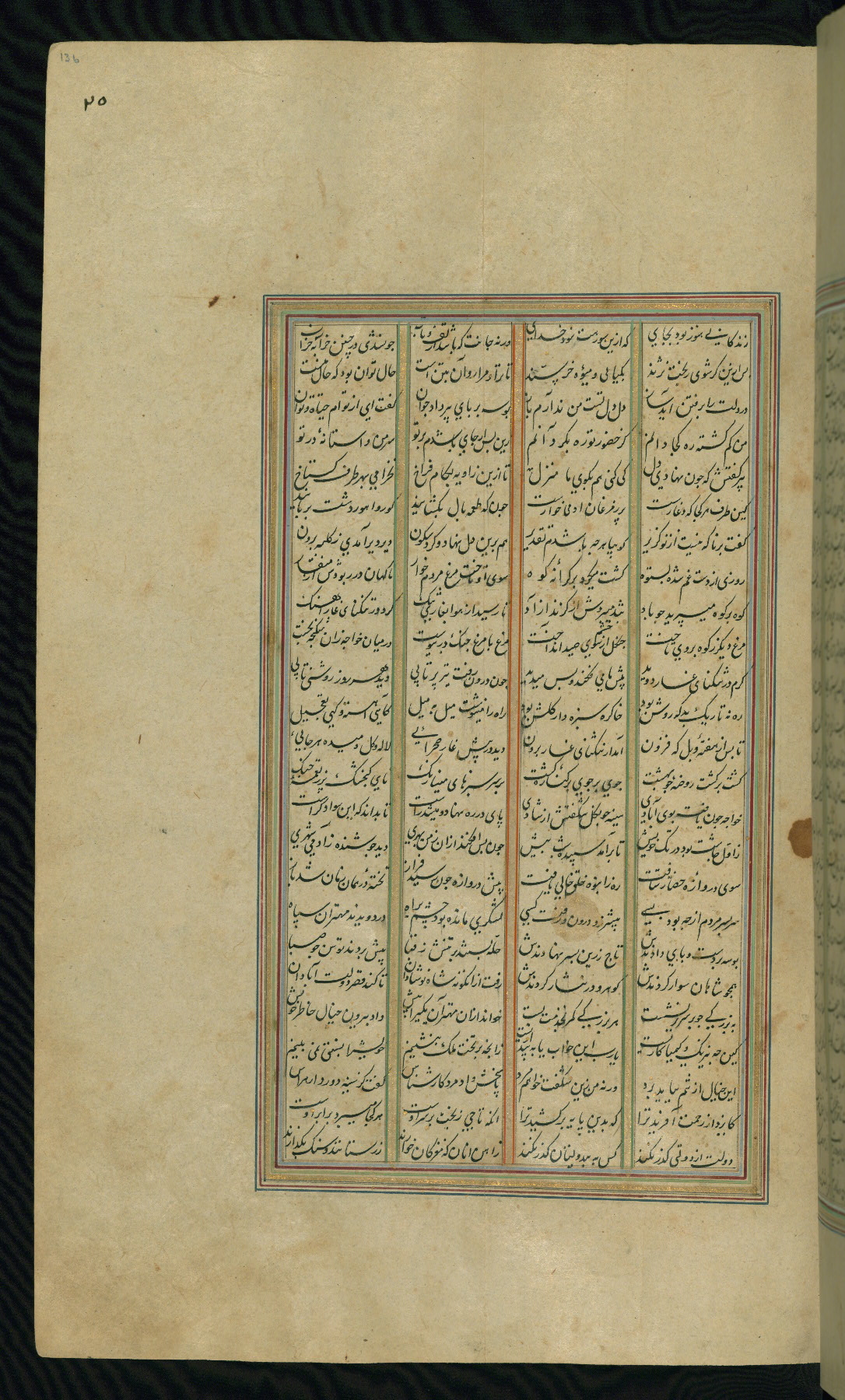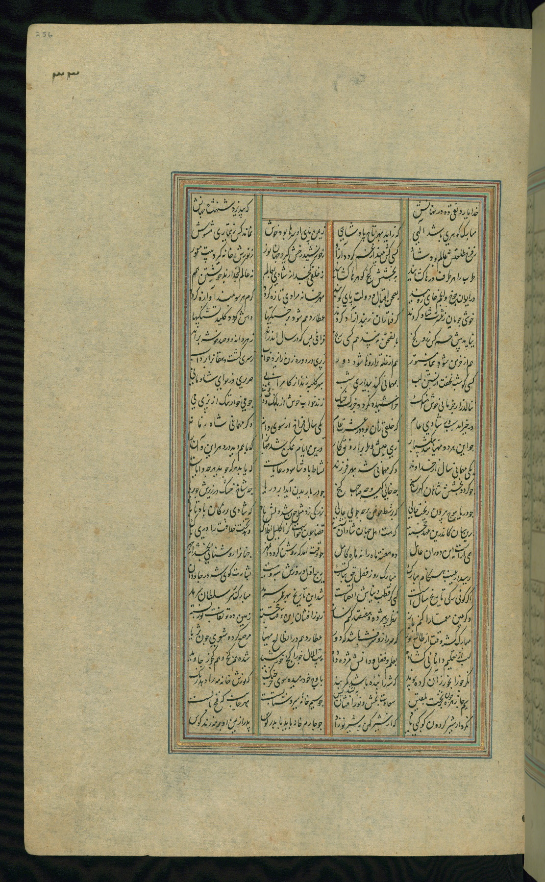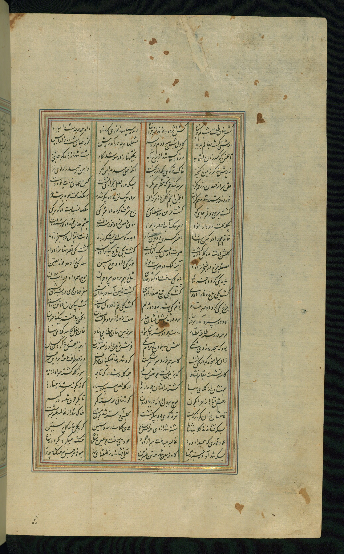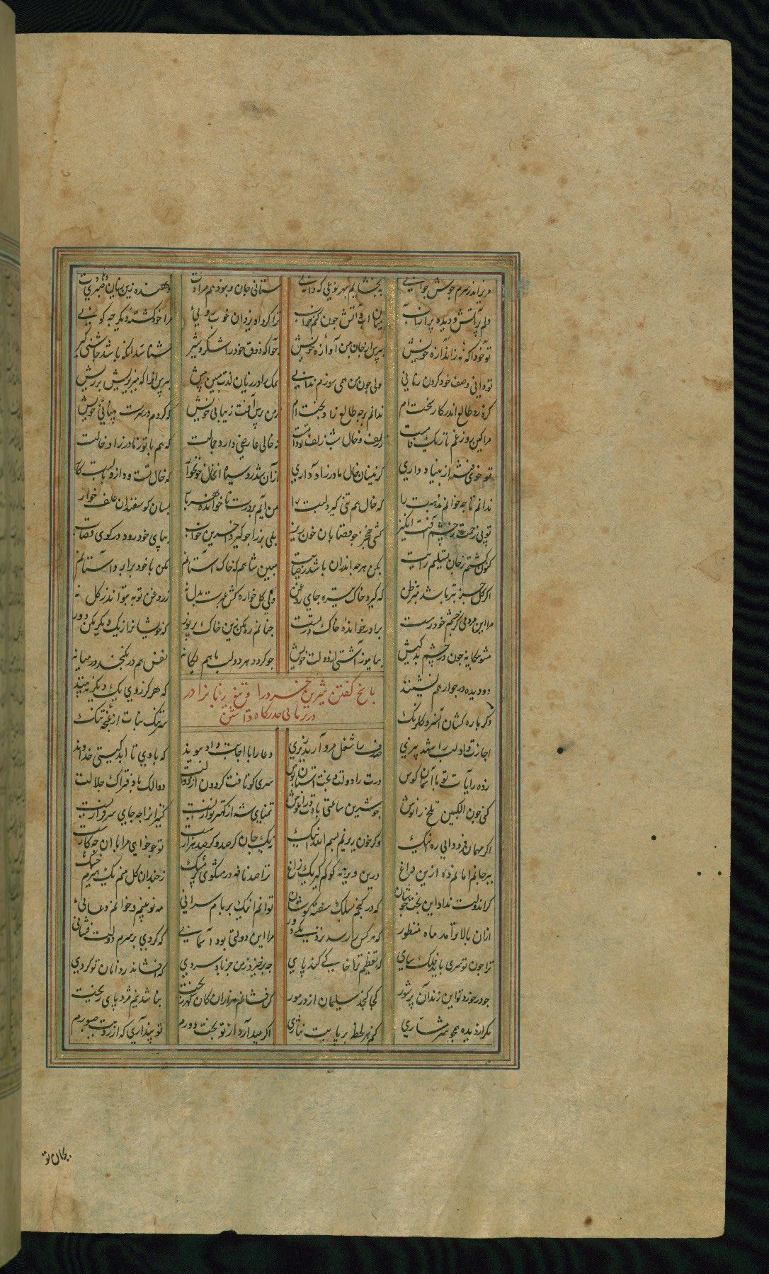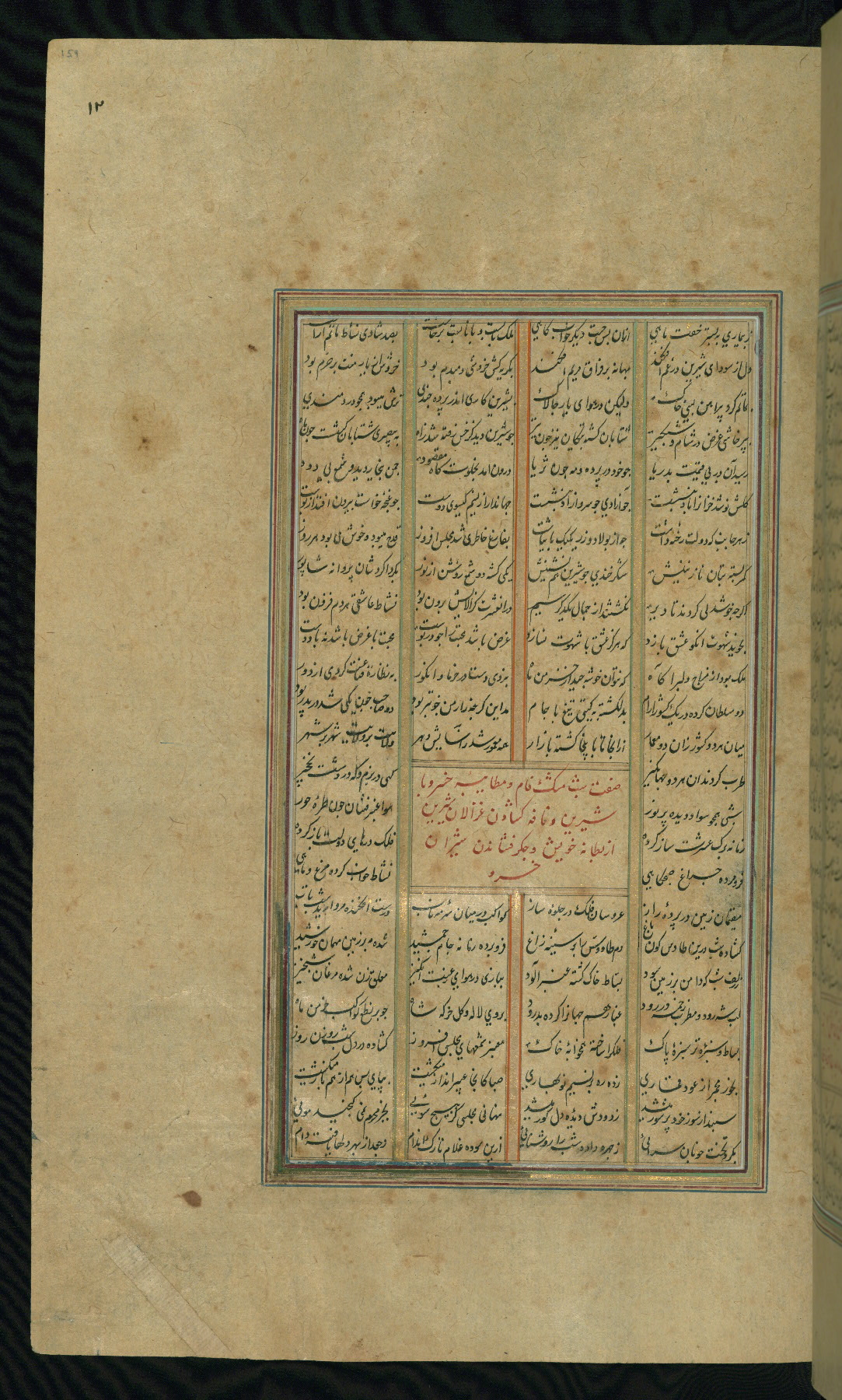 This illuminated and illustrated manuscript contains the Khamsah (quintet) and two historical poems (masnavi), Qirān-i saʿdayn and Nuh sipihr, by Amīr Khusraw Dihlavī (d. 725 AH / 1325 CE). The codex is dated 1017 AH / 1609 CE and was produced in Safavid Iran. All texts are written in black nastaʿlīq script with chapter headings in red. The manuscript opens with an illuminated and illustrated frontispiece of a hunting and court scene in the early Safavid style (fols. 1b-2a). The first text is Khamsah-i Dihlavī (fols. 2b-192a), which is introduced by an illuminated incipit and titlepiece with the title of the first poem of the quintet and the author's name. The second text is Qirān-i saʿdayn, a historical poem (masnavi) about the meeting of Sultan Muʿizz al-Dīn Kayqubād and his father, Nāṣir al-Din Bughrā Khān, on the banks of the Sarjū in Oudh. It is also introduced with an illuminated incipit and titlepiece (fol. 193b). The third text is Nuh sipihr, a historical poem (masnavi) describing the glories of Sultan Quṭb al-Dīn Mubārak Shāh Khaljī’s time, introduced with an illuminated incipit and headpiece (fol. 223b). The dark brown leather binding is original to the manuscript.