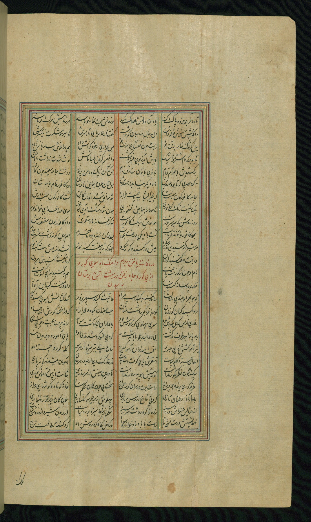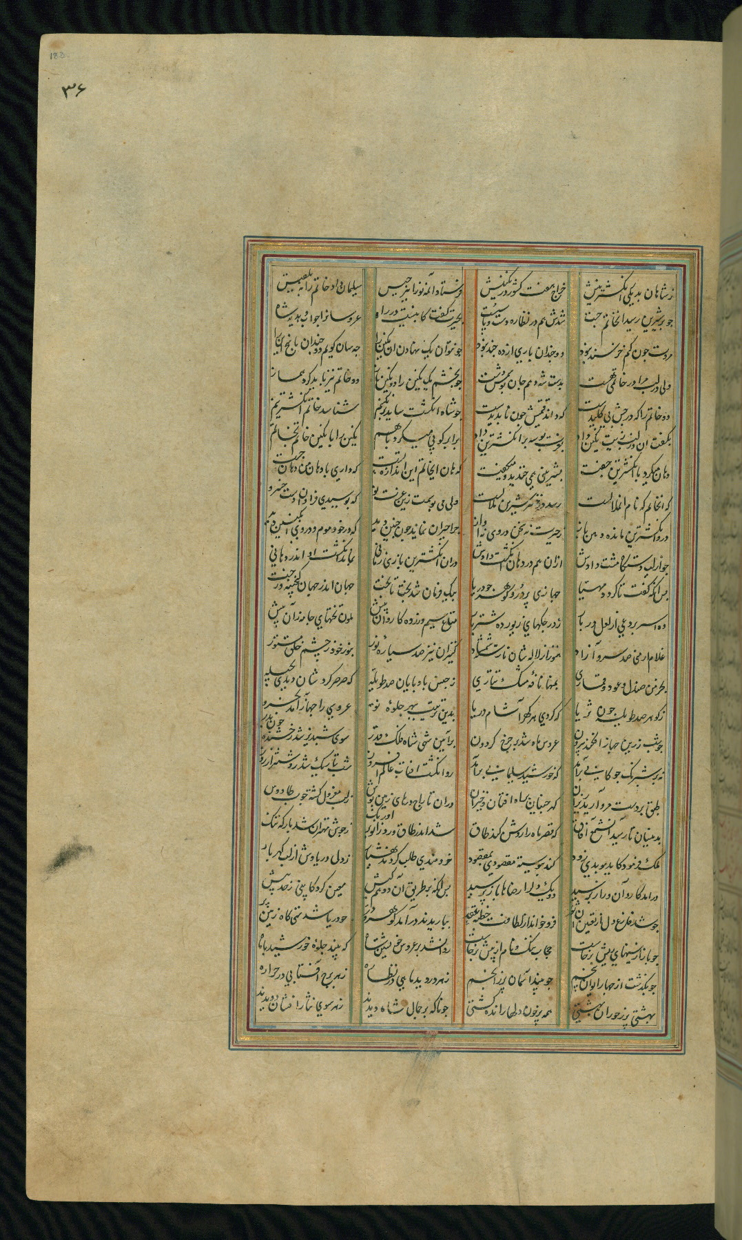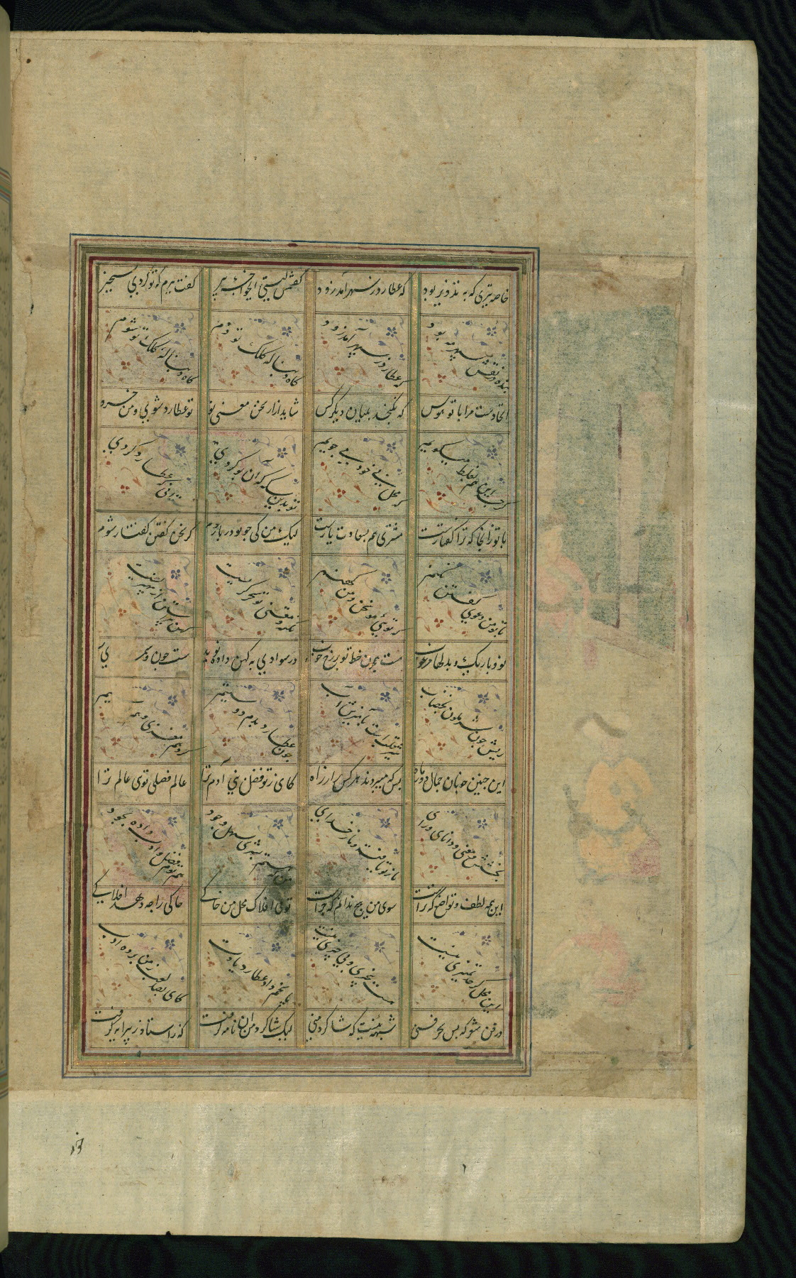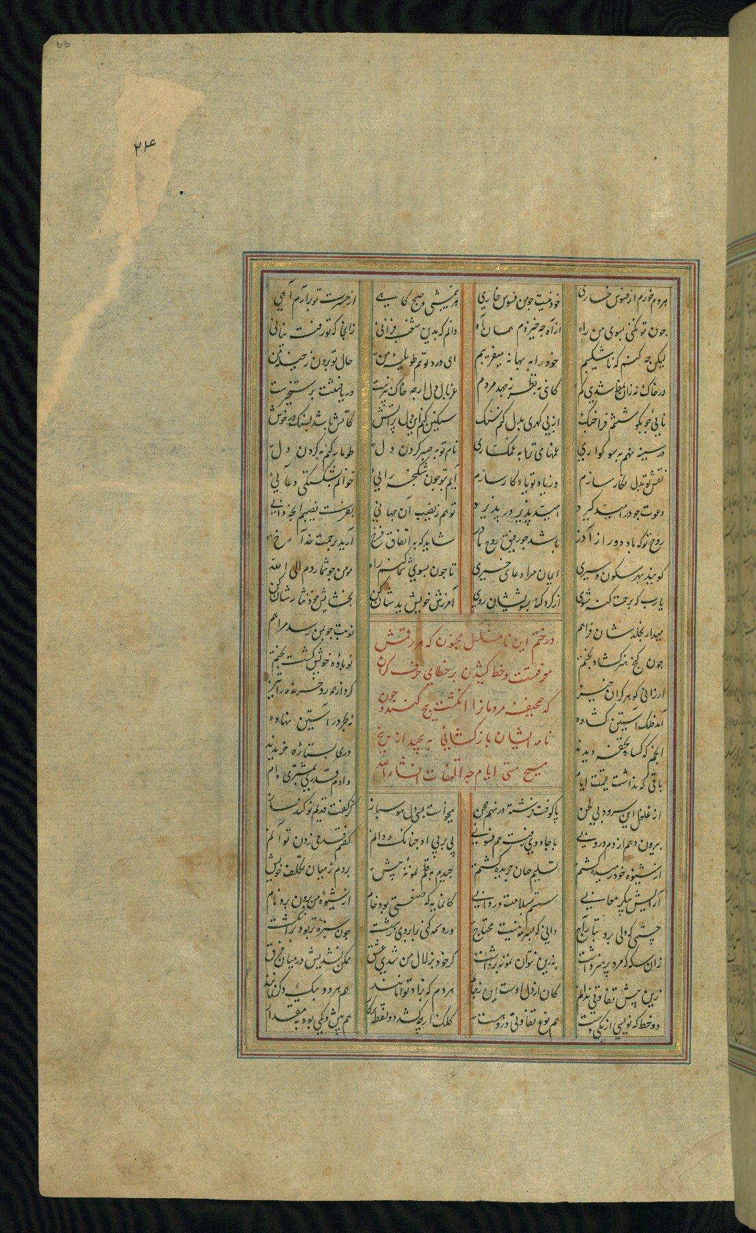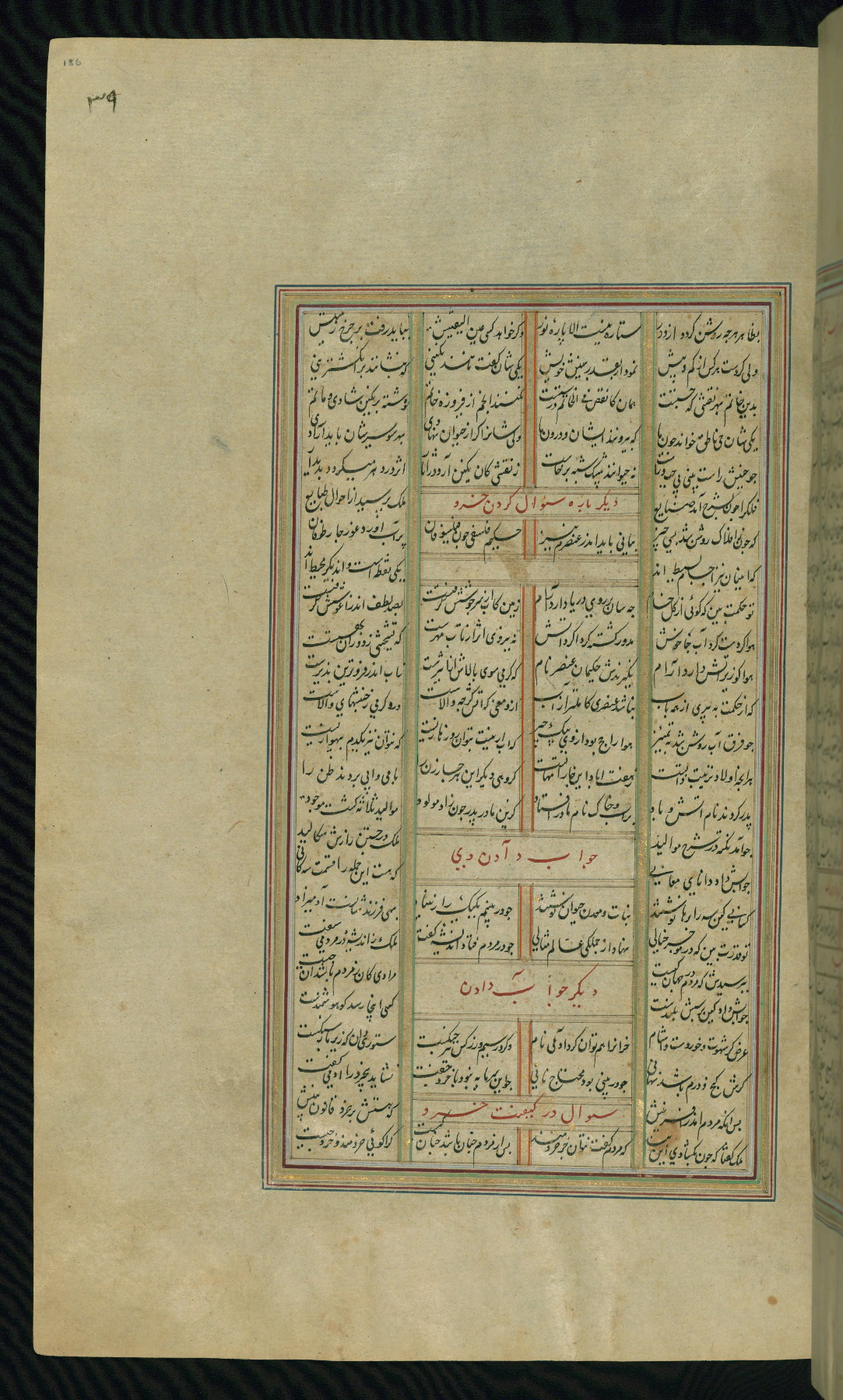 This illuminated and illustrated manuscript contains the Khamsah (quintet) and two historical poems (masnavi), Qirān-i saʿdayn and Nuh sipihr, by Amīr Khusraw Dihlavī (d. 725 AH / 1325 CE). The codex is dated 1017 AH / 1609 CE and was produced in Safavid Iran. All texts are written in black nastaʿlīq script with chapter headings in red. The manuscript opens with an illuminated and illustrated frontispiece of a hunting and court scene in the early Safavid style (fols. 1b-2a). The first text is Khamsah-i Dihlavī (fols. 2b-192a), which is introduced by an illuminated incipit and titlepiece with the title of the first poem of the quintet and the author's name. The second text is Qirān-i saʿdayn, a historical poem (masnavi) about the meeting of Sultan Muʿizz al-Dīn Kayqubād and his father, Nāṣir al-Din Bughrā Khān, on the banks of the Sarjū in Oudh. It is also introduced with an illuminated incipit and titlepiece (fol. 193b). The third text is Nuh sipihr, a historical poem (masnavi) describing the glories of Sultan Quṭb al-Dīn Mubārak Shāh Khaljī’s time, introduced with an illuminated incipit and headpiece (fol. 223b). The dark brown leather binding is original to the manuscript.