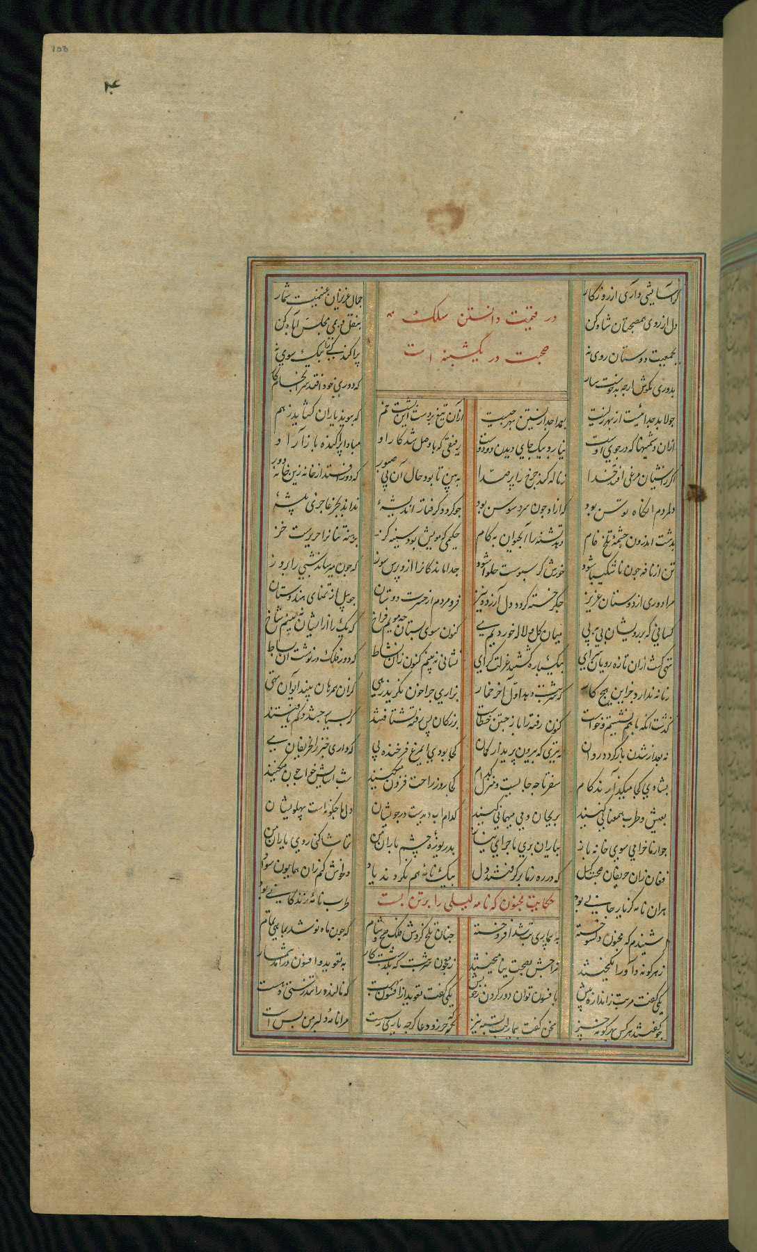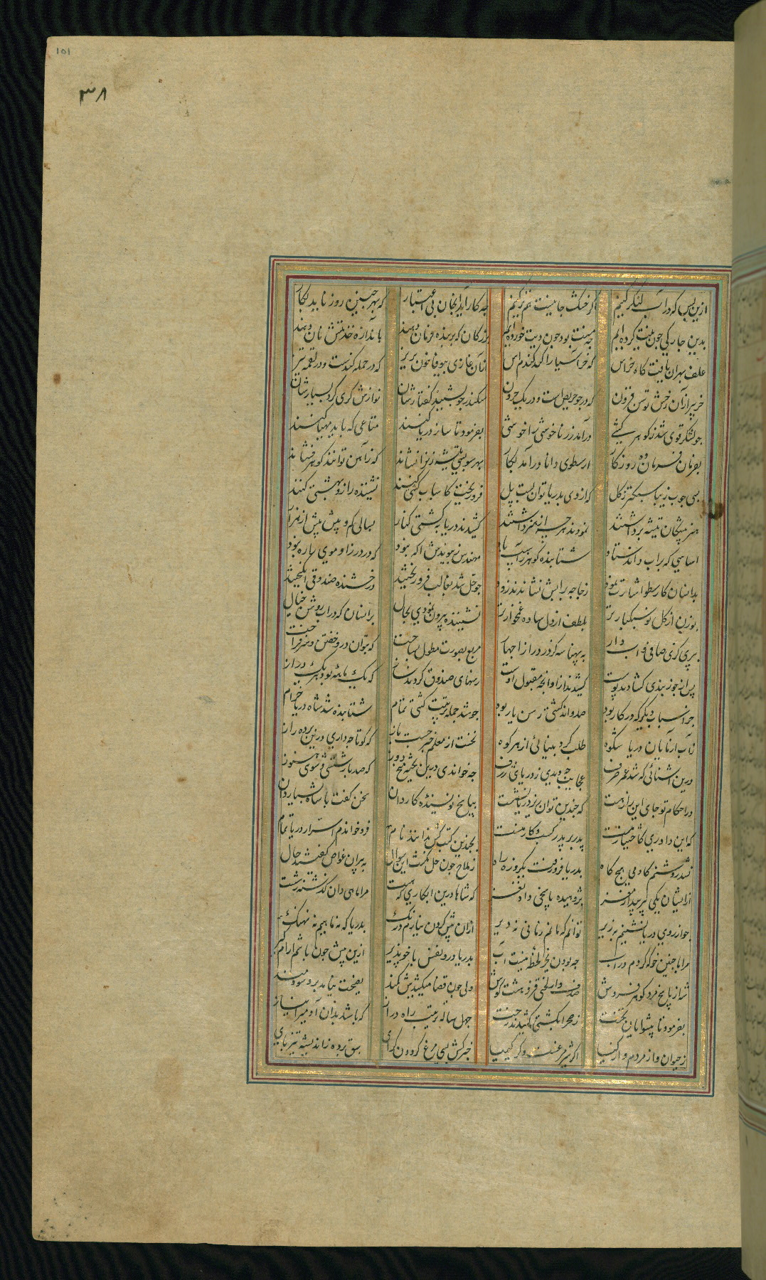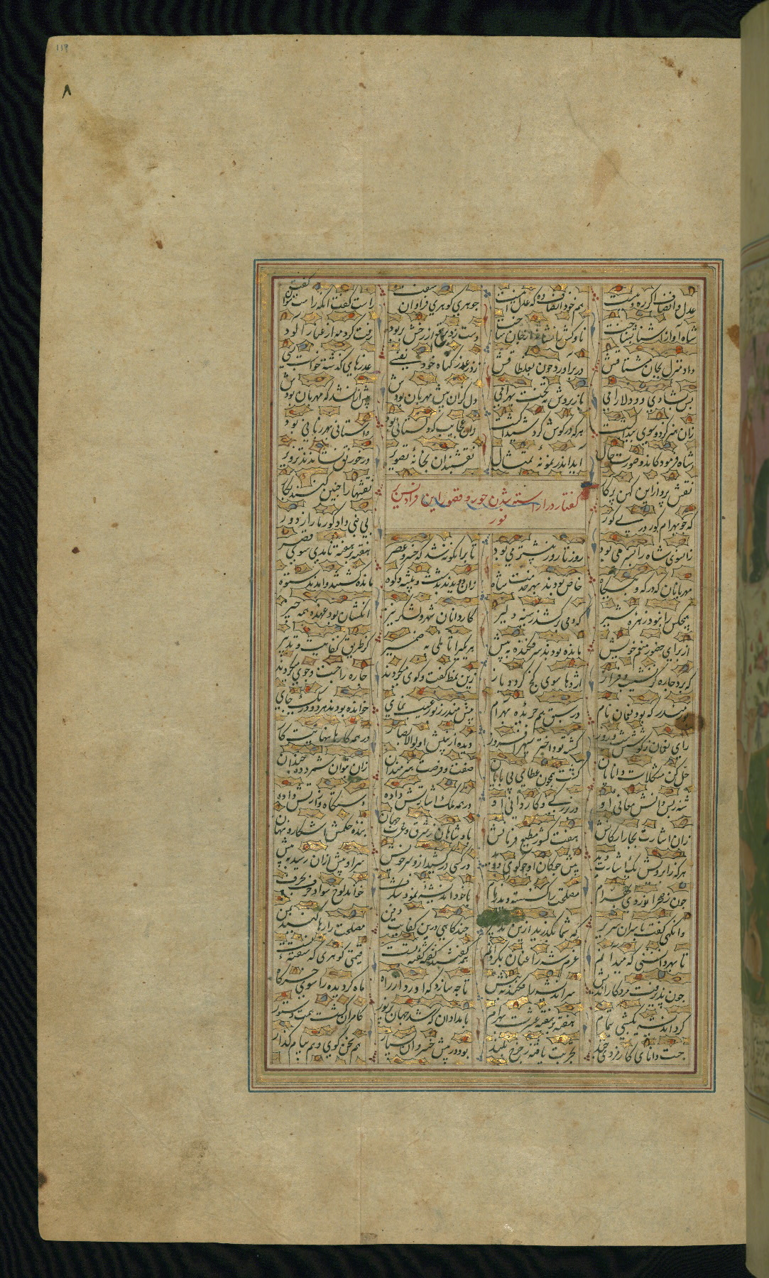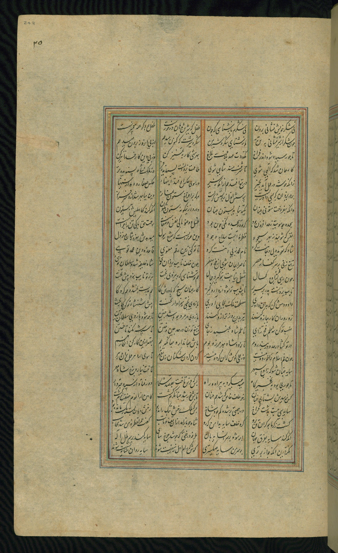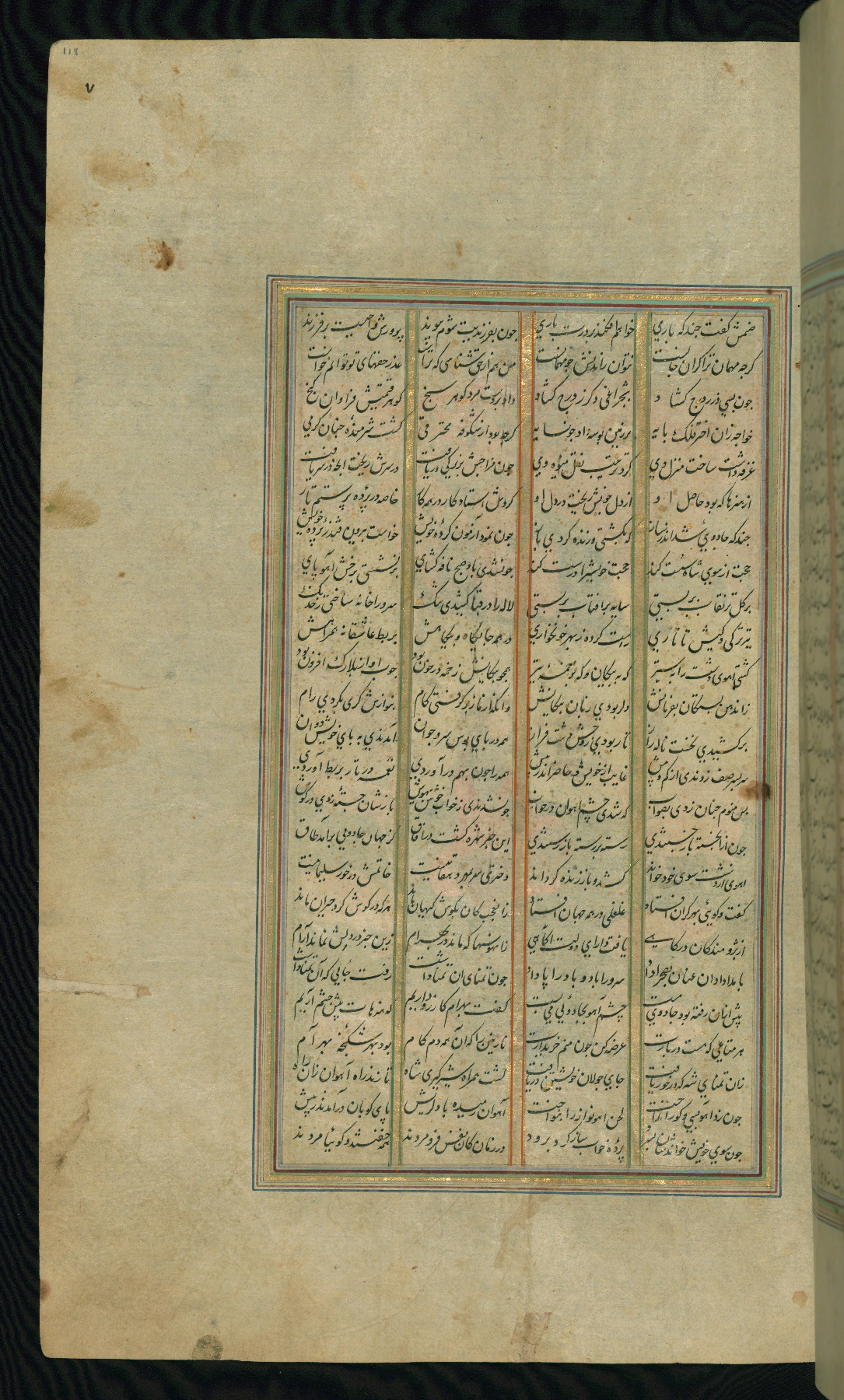 This illuminated and illustrated manuscript contains the Khamsah (quintet) and two historical poems (masnavi), Qirān-i saʿdayn and Nuh sipihr, by Amīr Khusraw Dihlavī (d. 725 AH / 1325 CE). The codex is dated 1017 AH / 1609 CE and was produced in Safavid Iran. All texts are written in black nastaʿlīq script with chapter headings in red. The manuscript opens with an illuminated and illustrated frontispiece of a hunting and court scene in the early Safavid style (fols. 1b-2a). The first text is Khamsah-i Dihlavī (fols. 2b-192a), which is introduced by an illuminated incipit and titlepiece with the title of the first poem of the quintet and the author's name. The second text is Qirān-i saʿdayn, a historical poem (masnavi) about the meeting of Sultan Muʿizz al-Dīn Kayqubād and his father, Nāṣir al-Din Bughrā Khān, on the banks of the Sarjū in Oudh. It is also introduced with an illuminated incipit and titlepiece (fol. 193b). The third text is Nuh sipihr, a historical poem (masnavi) describing the glories of Sultan Quṭb al-Dīn Mubārak Shāh Khaljī’s time, introduced with an illuminated incipit and headpiece (fol. 223b). The dark brown leather binding is original to the manuscript.