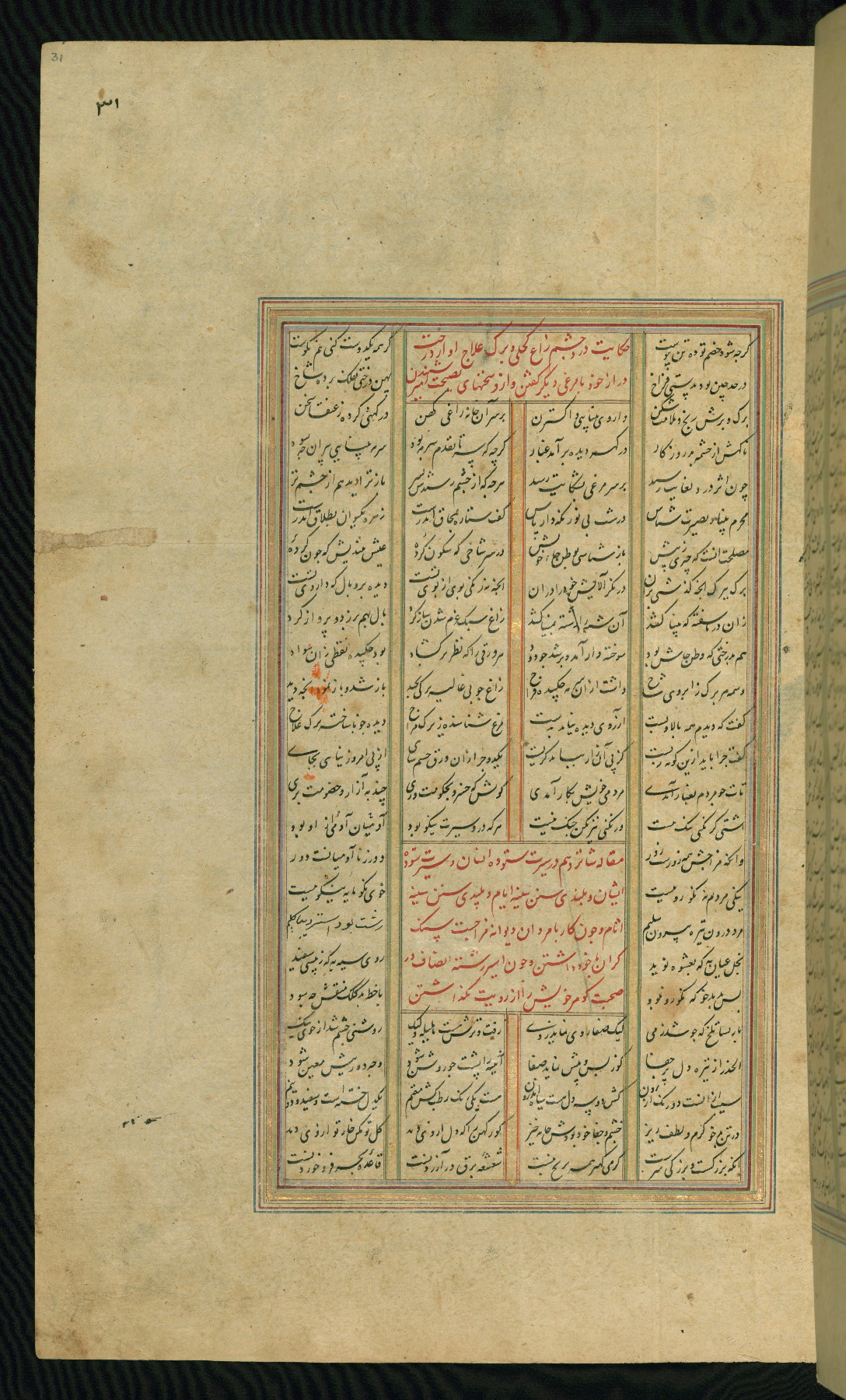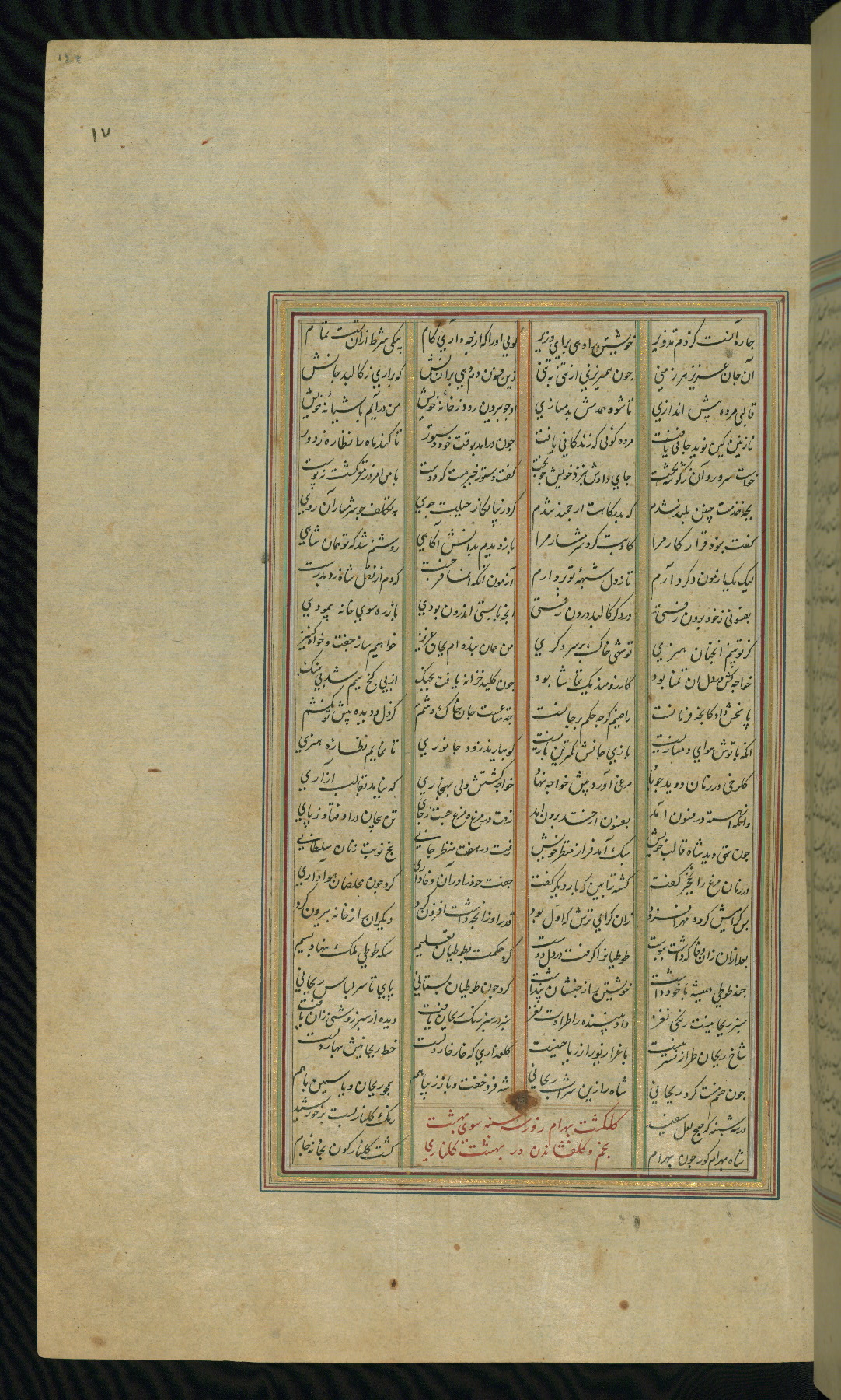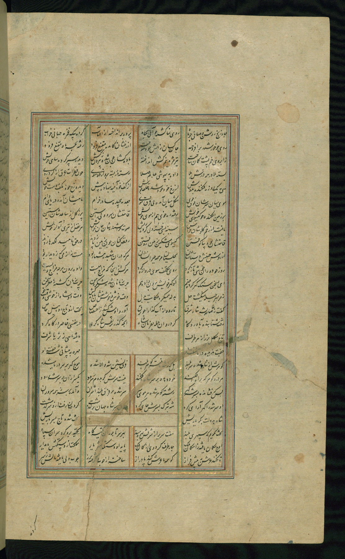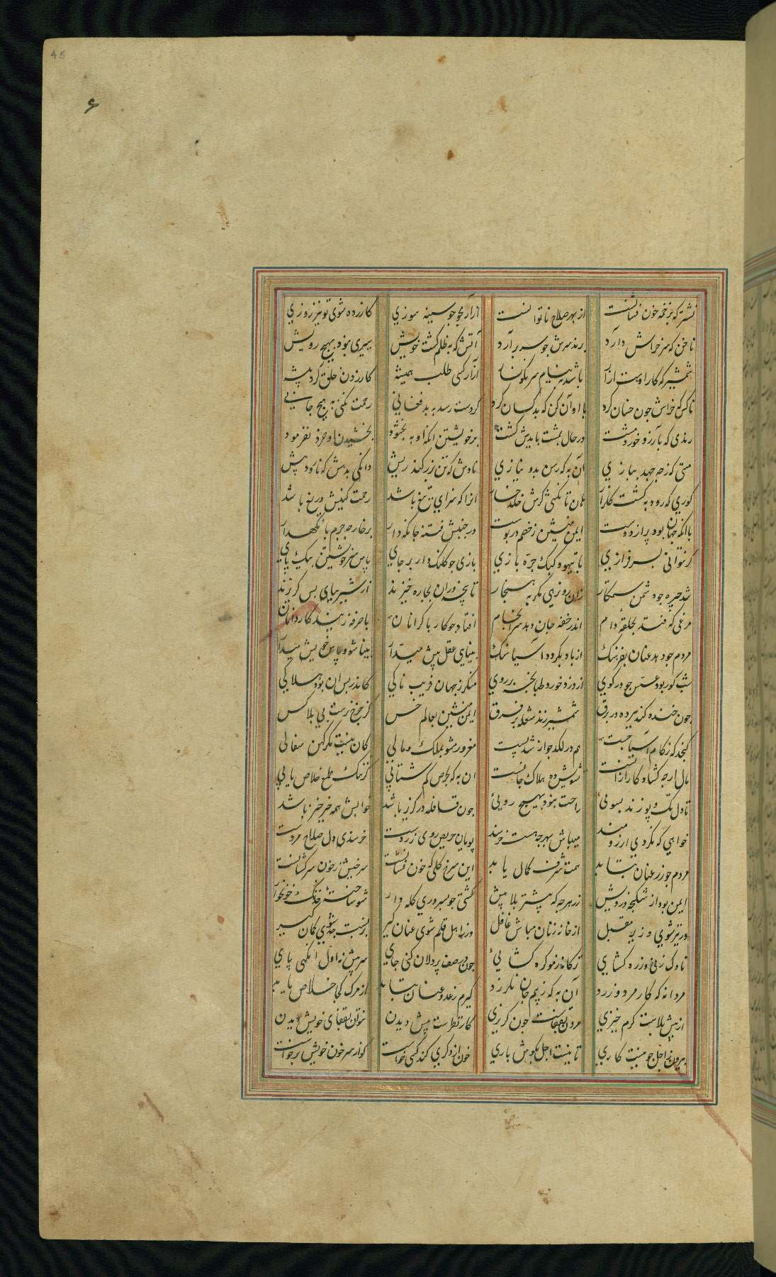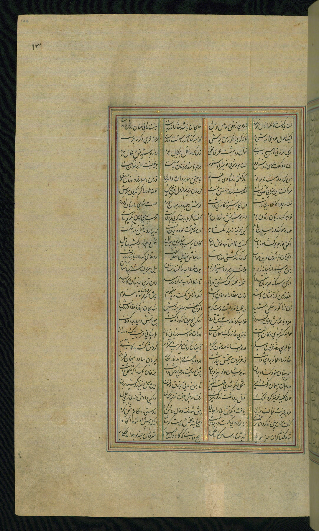 This illuminated and illustrated manuscript contains the Khamsah (quintet) and two historical poems (masnavi), Qirān-i saʿdayn and Nuh sipihr, by Amīr Khusraw Dihlavī (d. 725 AH / 1325 CE). The codex is dated 1017 AH / 1609 CE and was produced in Safavid Iran. All texts are written in black nastaʿlīq script with chapter headings in red. The manuscript opens with an illuminated and illustrated frontispiece of a hunting and court scene in the early Safavid style (fols. 1b-2a). The first text is Khamsah-i Dihlavī (fols. 2b-192a), which is introduced by an illuminated incipit and titlepiece with the title of the first poem of the quintet and the author's name. The second text is Qirān-i saʿdayn, a historical poem (masnavi) about the meeting of Sultan Muʿizz al-Dīn Kayqubād and his father, Nāṣir al-Din Bughrā Khān, on the banks of the Sarjū in Oudh. It is also introduced with an illuminated incipit and titlepiece (fol. 193b). The third text is Nuh sipihr, a historical poem (masnavi) describing the glories of Sultan Quṭb al-Dīn Mubārak Shāh Khaljī’s time, introduced with an illuminated incipit and headpiece (fol. 223b). The dark brown leather binding is original to the manuscript.