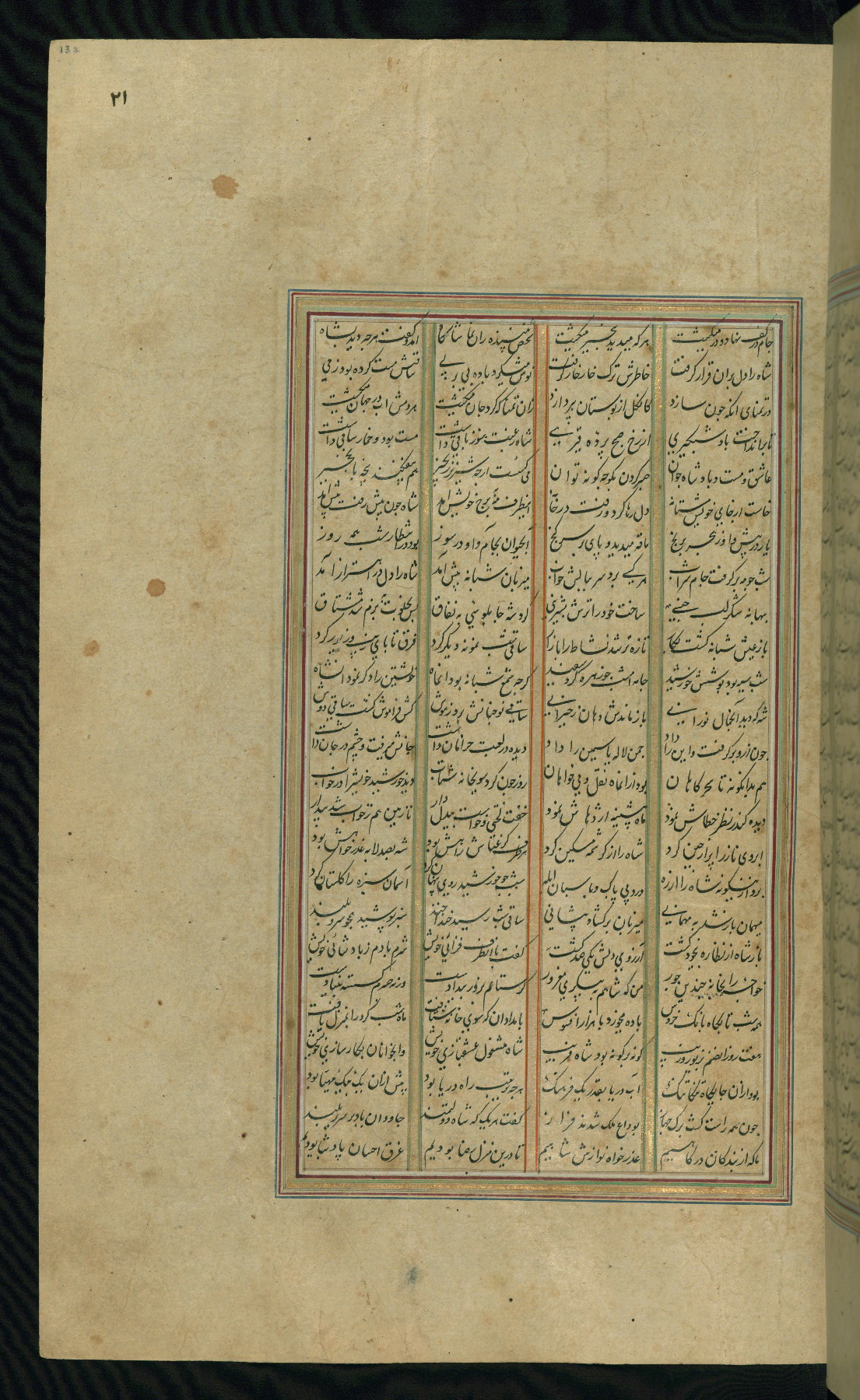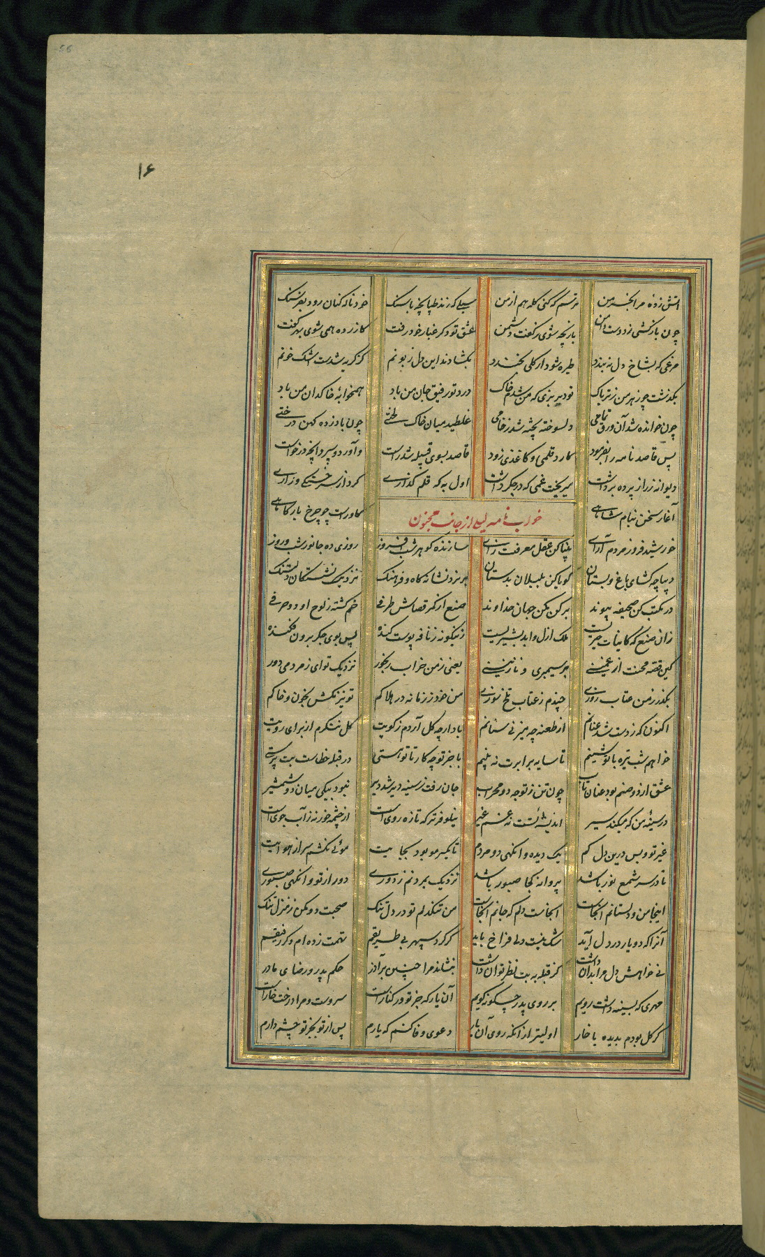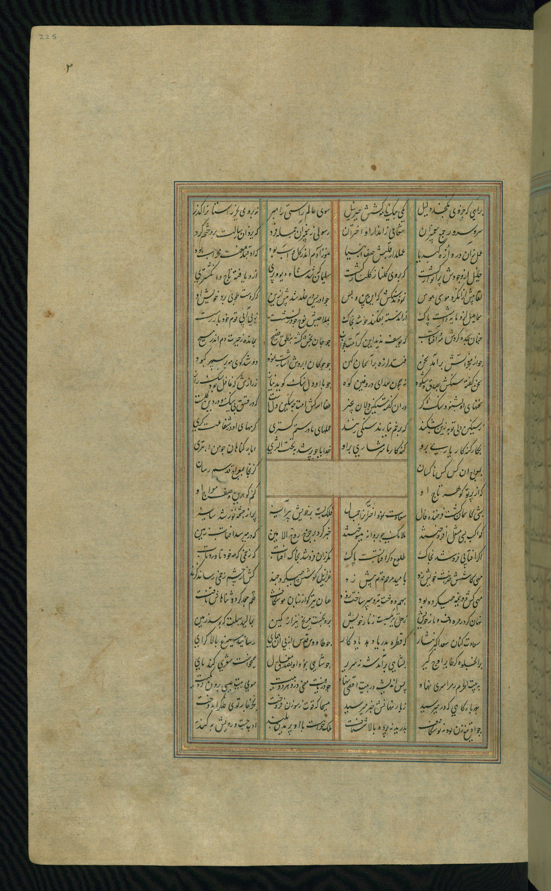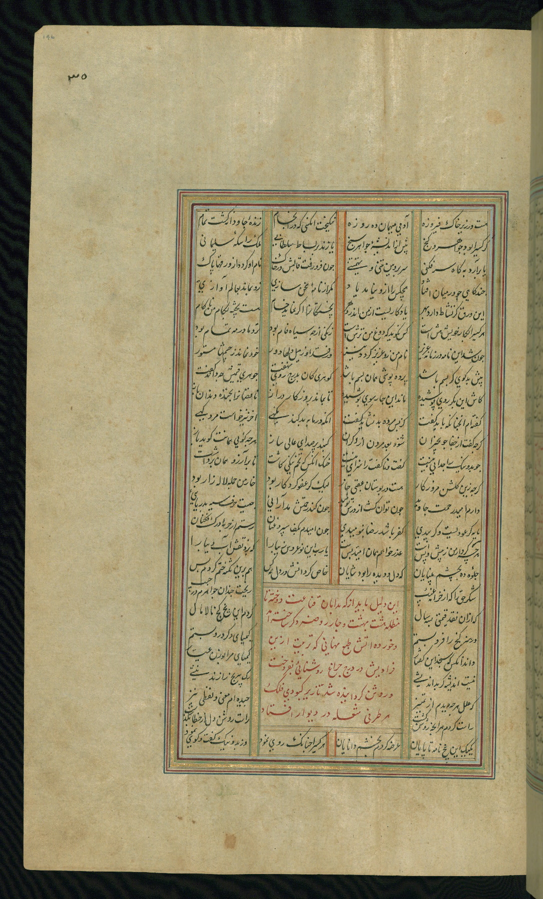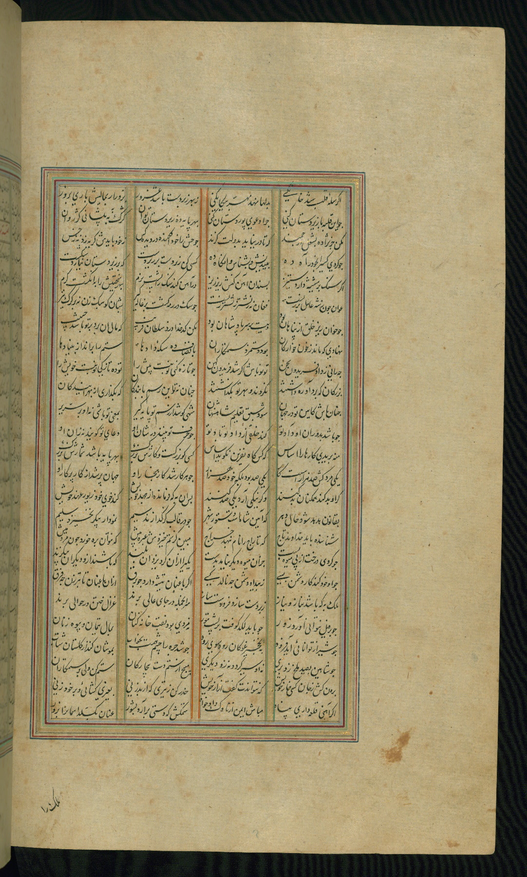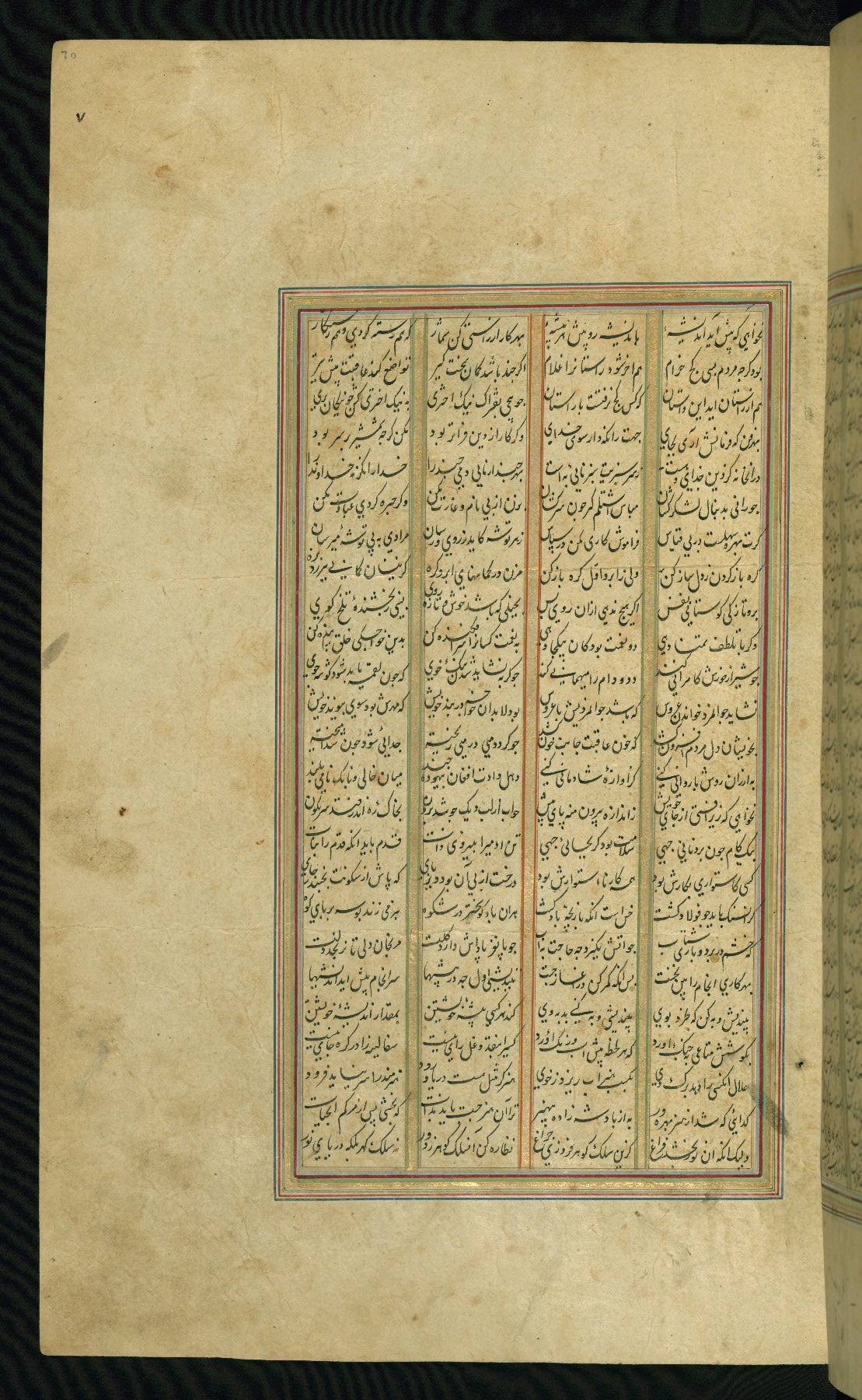 This illuminated and illustrated manuscript contains the Khamsah (quintet) and two historical poems (masnavi), Qirān-i saʿdayn and Nuh sipihr, by Amīr Khusraw Dihlavī (d. 725 AH / 1325 CE). The codex is dated 1017 AH / 1609 CE and was produced in Safavid Iran. All texts are written in black nastaʿlīq script with chapter headings in red. The manuscript opens with an illuminated and illustrated frontispiece of a hunting and court scene in the early Safavid style (fols. 1b-2a). The first text is Khamsah-i Dihlavī (fols. 2b-192a), which is introduced by an illuminated incipit and titlepiece with the title of the first poem of the quintet and the author's name. The second text is Qirān-i saʿdayn, a historical poem (masnavi) about the meeting of Sultan Muʿizz al-Dīn Kayqubād and his father, Nāṣir al-Din Bughrā Khān, on the banks of the Sarjū in Oudh. It is also introduced with an illuminated incipit and titlepiece (fol. 193b). The third text is Nuh sipihr, a historical poem (masnavi) describing the glories of Sultan Quṭb al-Dīn Mubārak Shāh Khaljī’s time, introduced with an illuminated incipit and headpiece (fol. 223b). The dark brown leather binding is original to the manuscript.