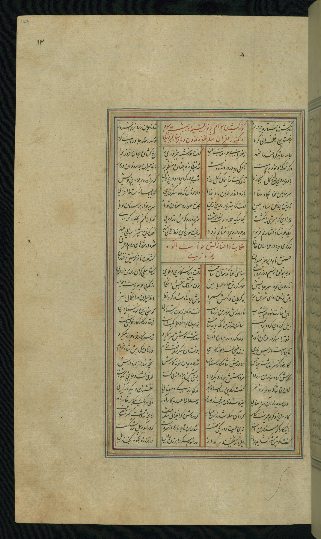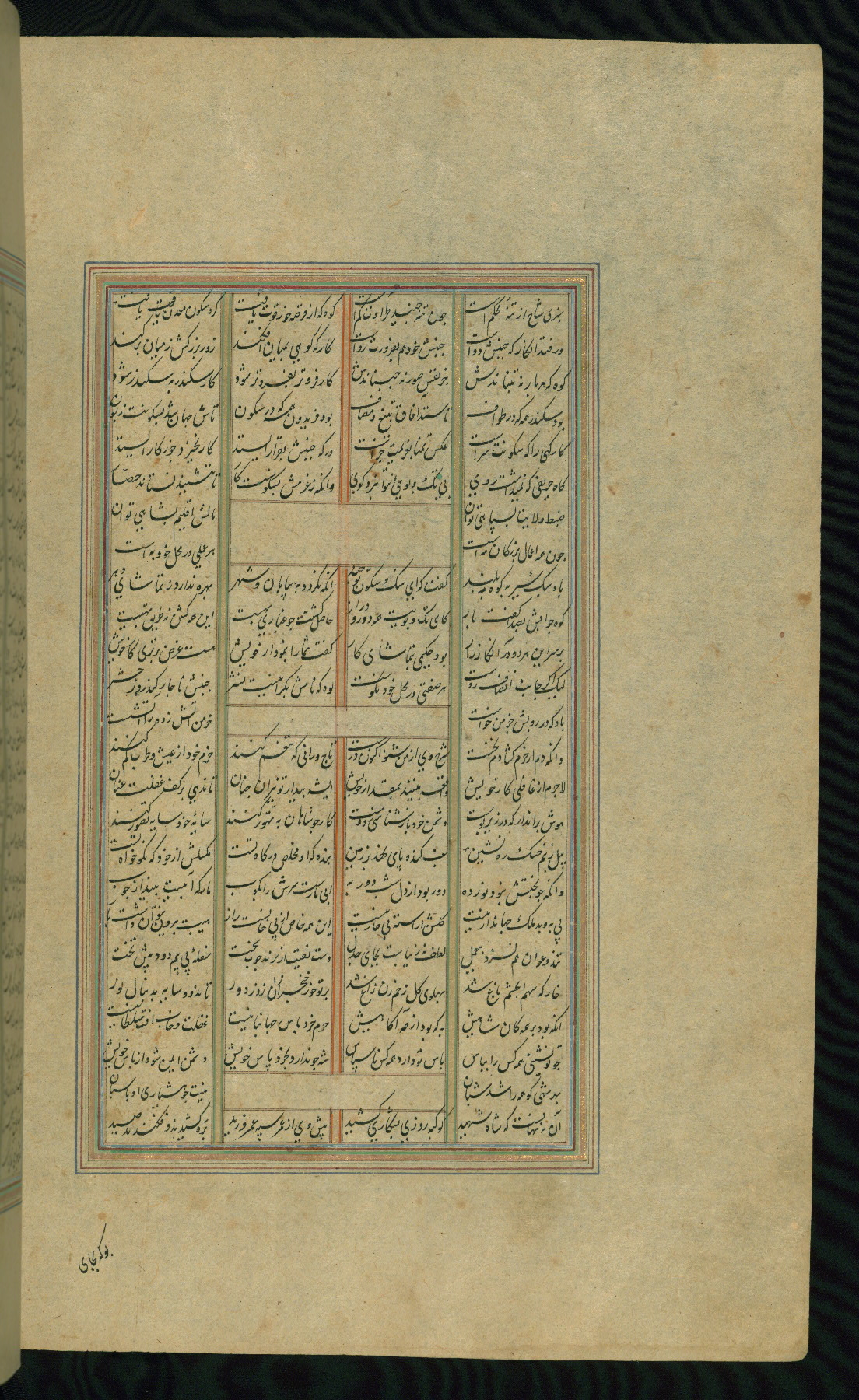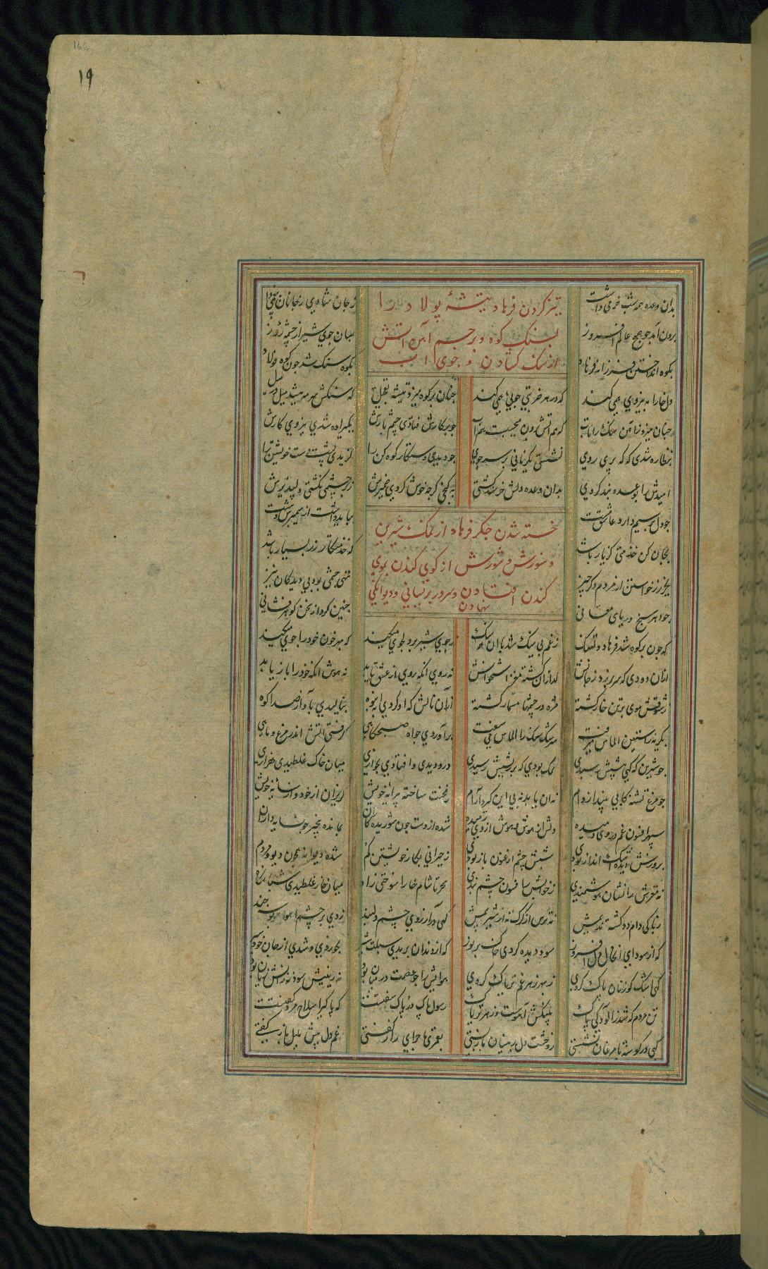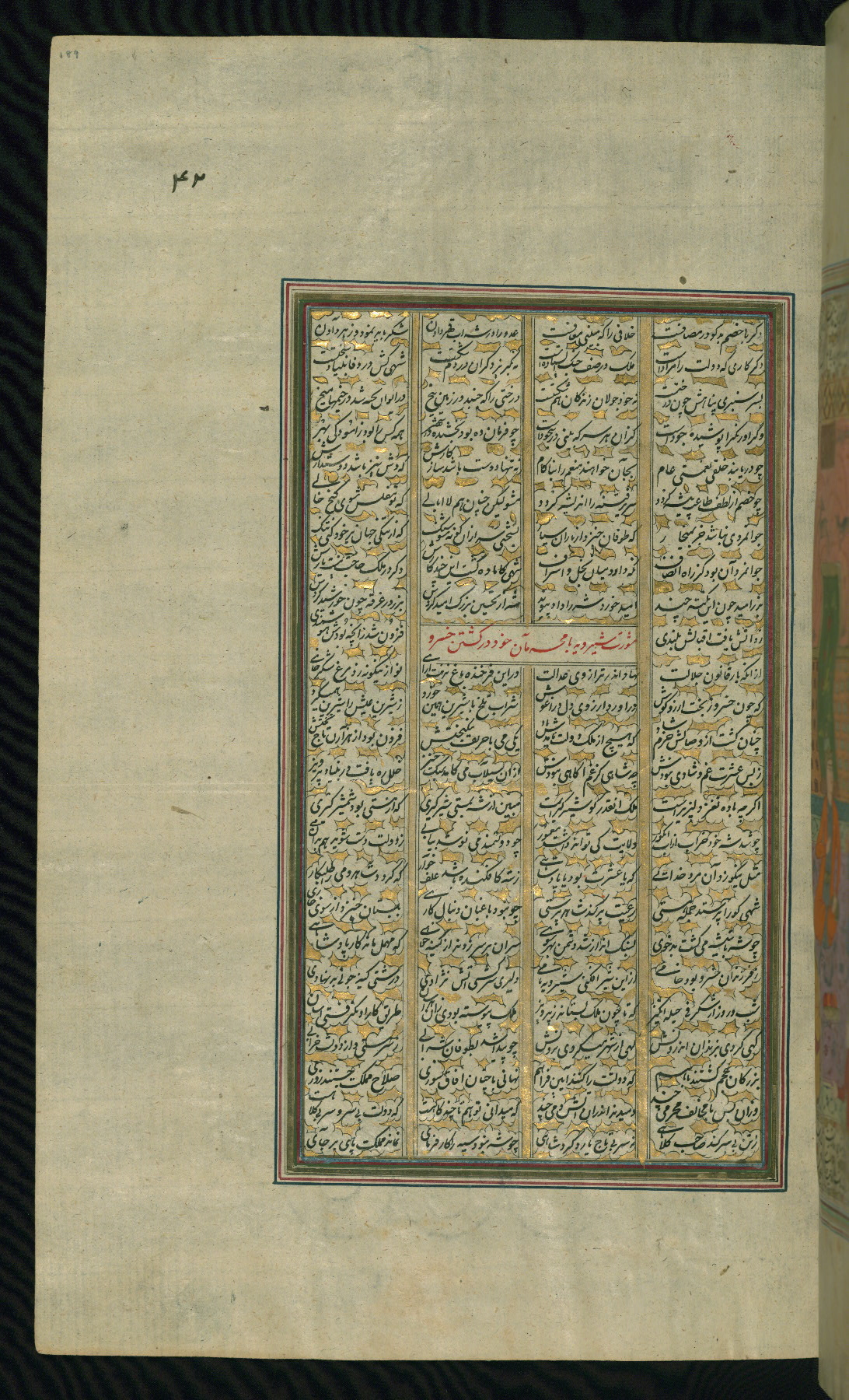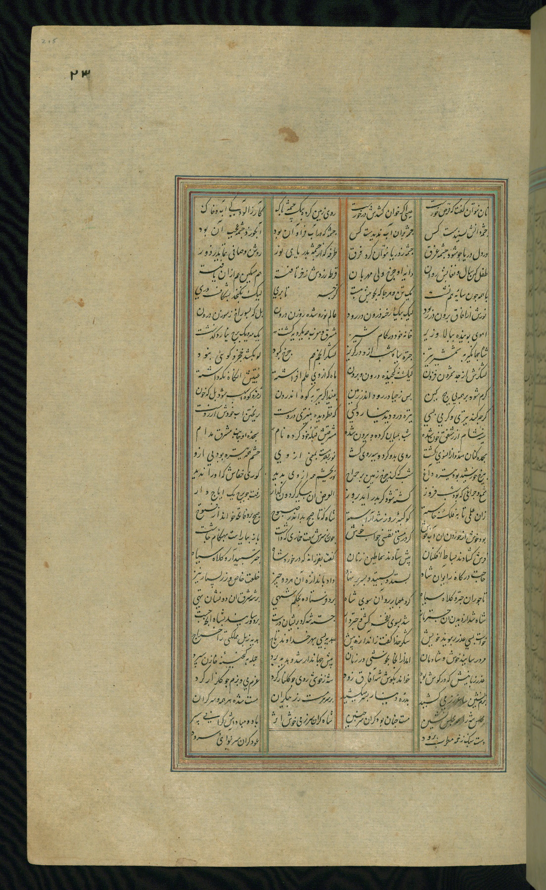 This illuminated and illustrated manuscript contains the Khamsah (quintet) and two historical poems (masnavi), Qirān-i saʿdayn and Nuh sipihr, by Amīr Khusraw Dihlavī (d. 725 AH / 1325 CE). The codex is dated 1017 AH / 1609 CE and was produced in Safavid Iran. All texts are written in black nastaʿlīq script with chapter headings in red. The manuscript opens with an illuminated and illustrated frontispiece of a hunting and court scene in the early Safavid style (fols. 1b-2a). The first text is Khamsah-i Dihlavī (fols. 2b-192a), which is introduced by an illuminated incipit and titlepiece with the title of the first poem of the quintet and the author's name. The second text is Qirān-i saʿdayn, a historical poem (masnavi) about the meeting of Sultan Muʿizz al-Dīn Kayqubād and his father, Nāṣir al-Din Bughrā Khān, on the banks of the Sarjū in Oudh. It is also introduced with an illuminated incipit and titlepiece (fol. 193b). The third text is Nuh sipihr, a historical poem (masnavi) describing the glories of Sultan Quṭb al-Dīn Mubārak Shāh Khaljī’s time, introduced with an illuminated incipit and headpiece (fol. 223b). The dark brown leather binding is original to the manuscript.