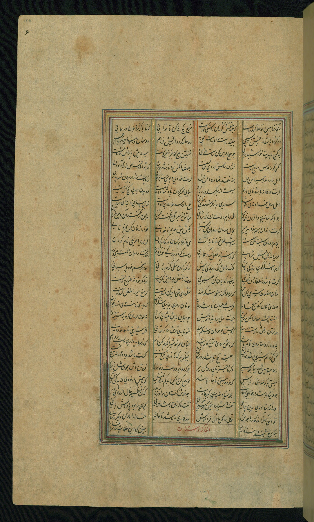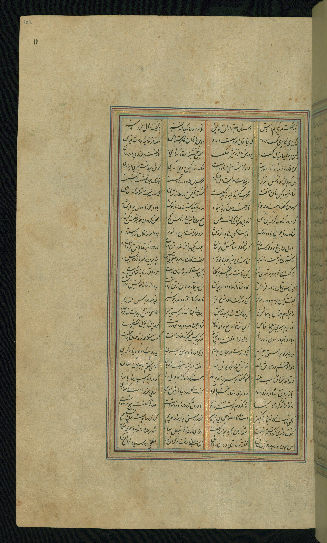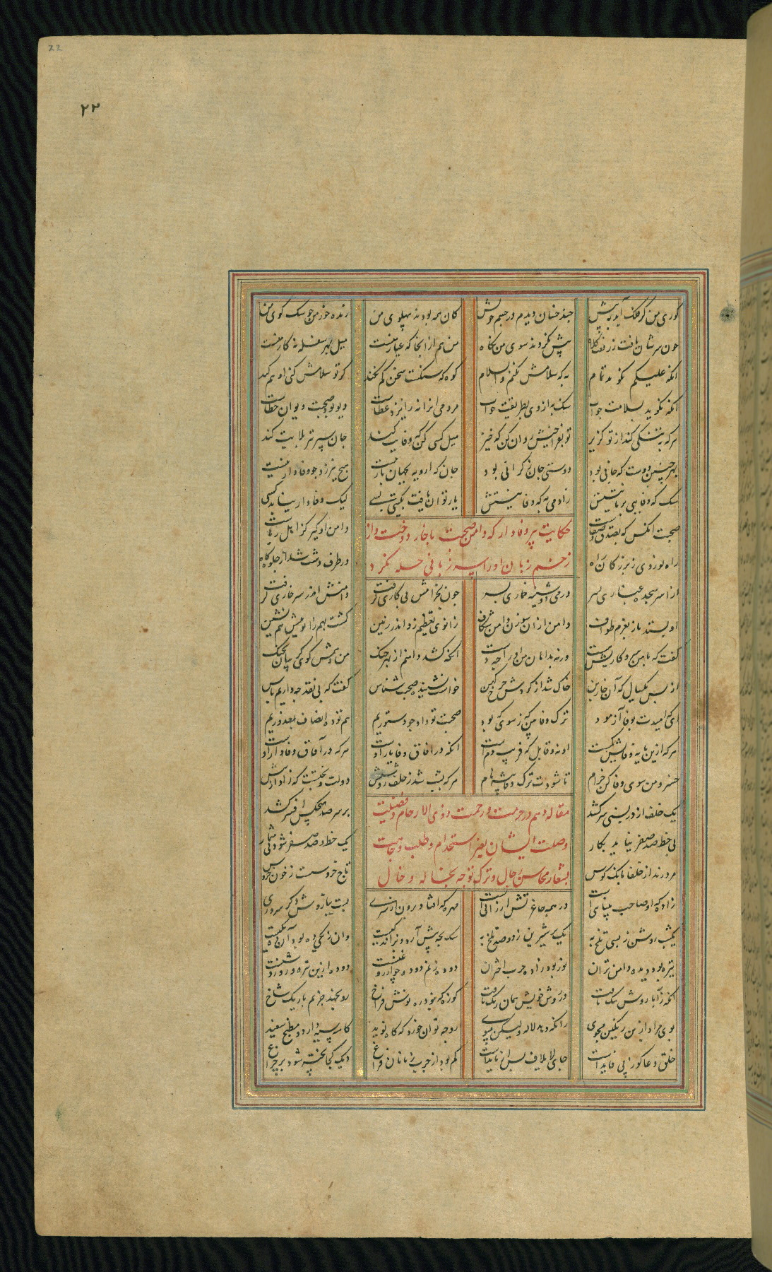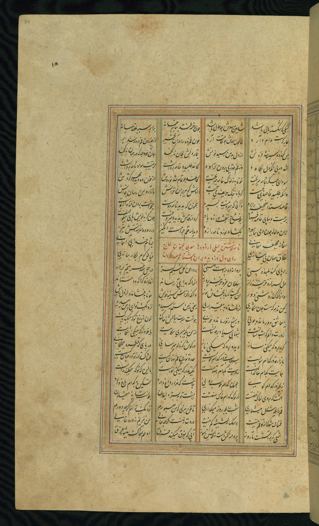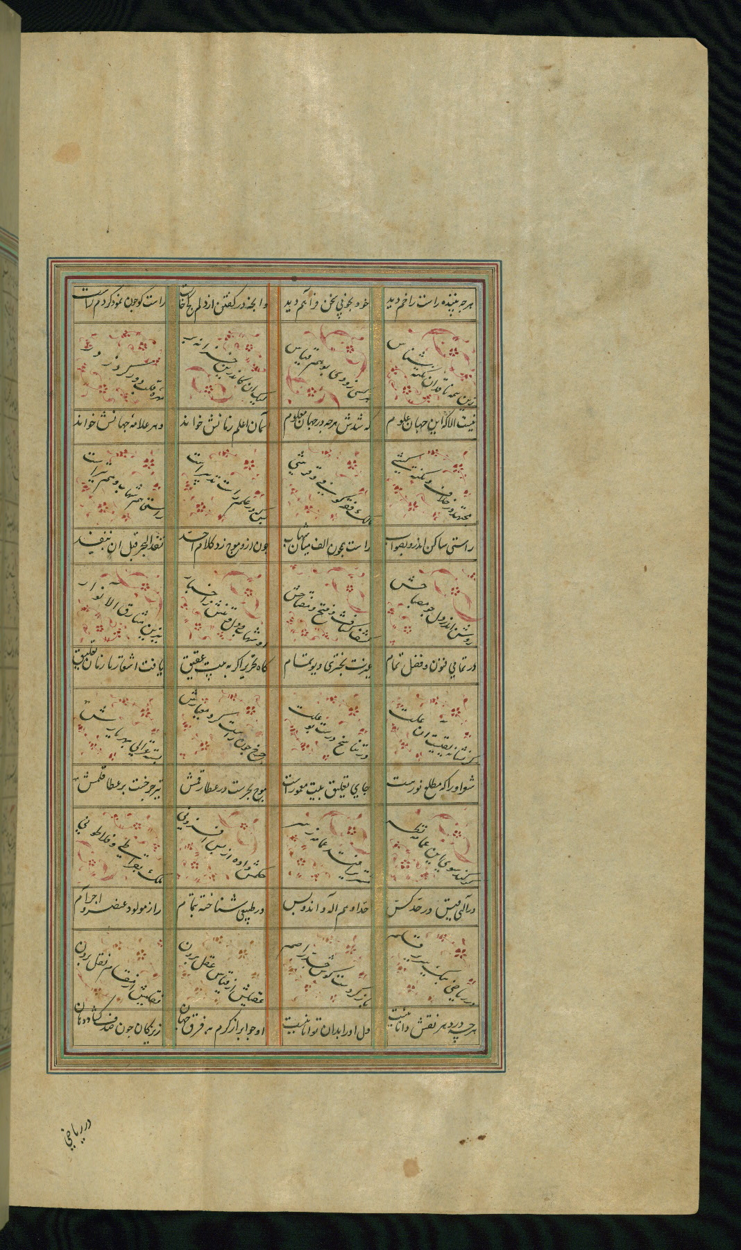 This illuminated and illustrated manuscript contains the Khamsah (quintet) and two historical poems (masnavi), Qirān-i saʿdayn and Nuh sipihr, by Amīr Khusraw Dihlavī (d. 725 AH / 1325 CE). The codex is dated 1017 AH / 1609 CE and was produced in Safavid Iran. All texts are written in black nastaʿlīq script with chapter headings in red. The manuscript opens with an illuminated and illustrated frontispiece of a hunting and court scene in the early Safavid style (fols. 1b-2a). The first text is Khamsah-i Dihlavī (fols. 2b-192a), which is introduced by an illuminated incipit and titlepiece with the title of the first poem of the quintet and the author's name. The second text is Qirān-i saʿdayn, a historical poem (masnavi) about the meeting of Sultan Muʿizz al-Dīn Kayqubād and his father, Nāṣir al-Din Bughrā Khān, on the banks of the Sarjū in Oudh. It is also introduced with an illuminated incipit and titlepiece (fol. 193b). The third text is Nuh sipihr, a historical poem (masnavi) describing the glories of Sultan Quṭb al-Dīn Mubārak Shāh Khaljī’s time, introduced with an illuminated incipit and headpiece (fol. 223b). The dark brown leather binding is original to the manuscript.