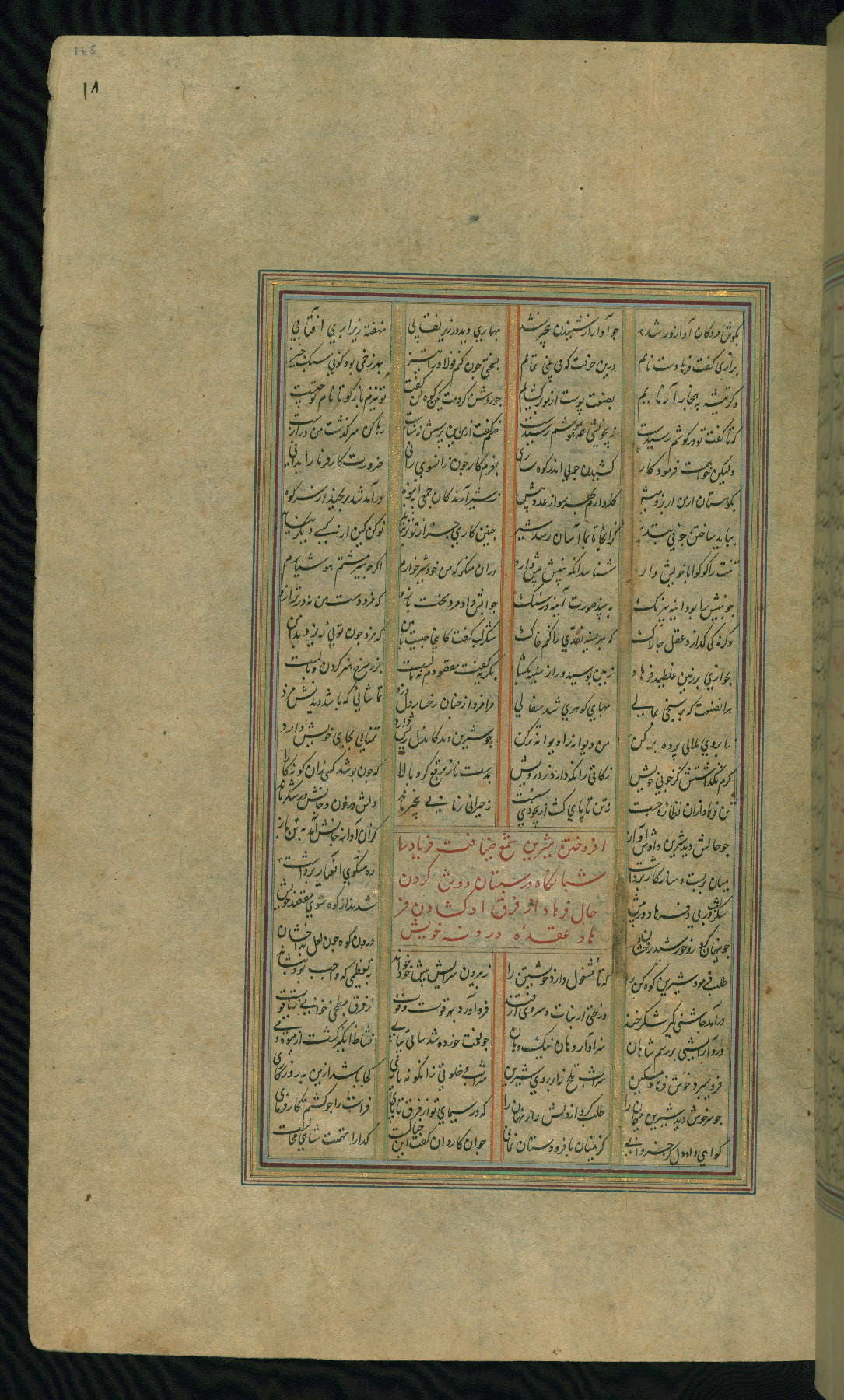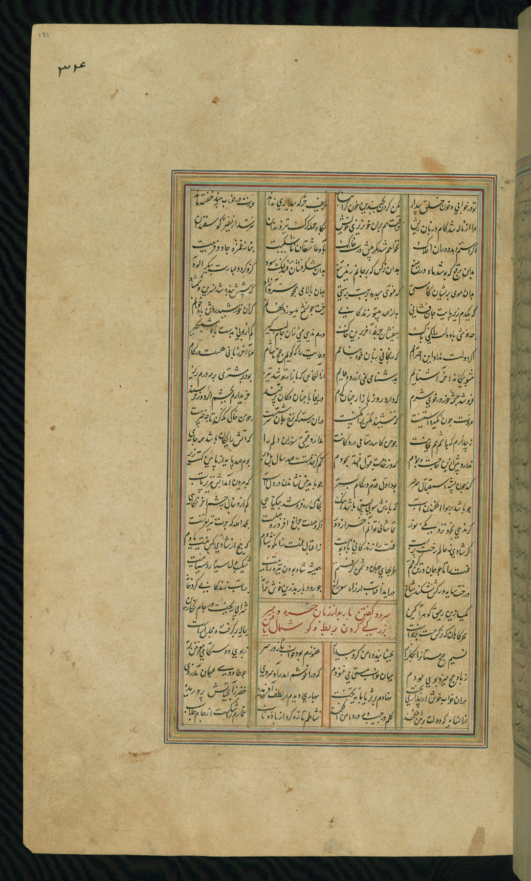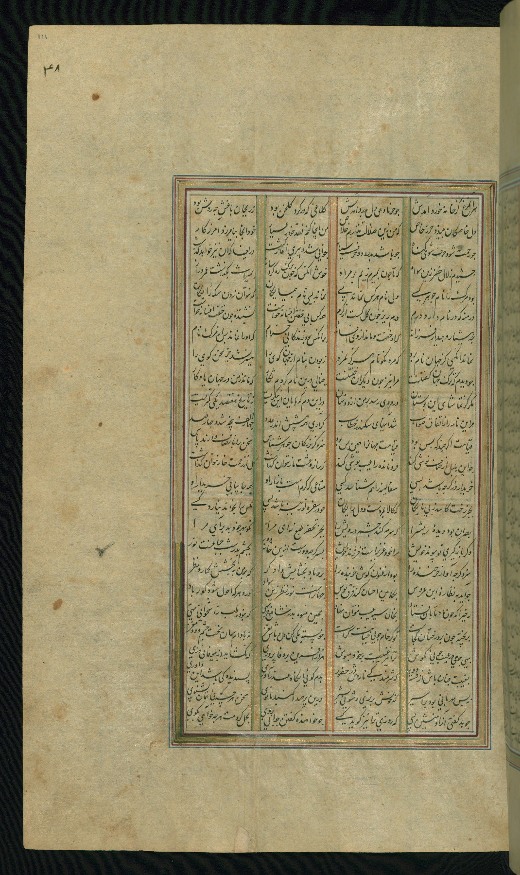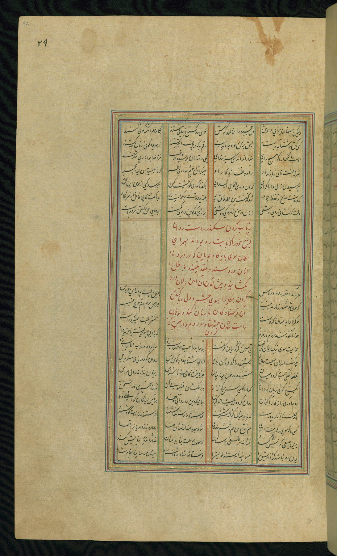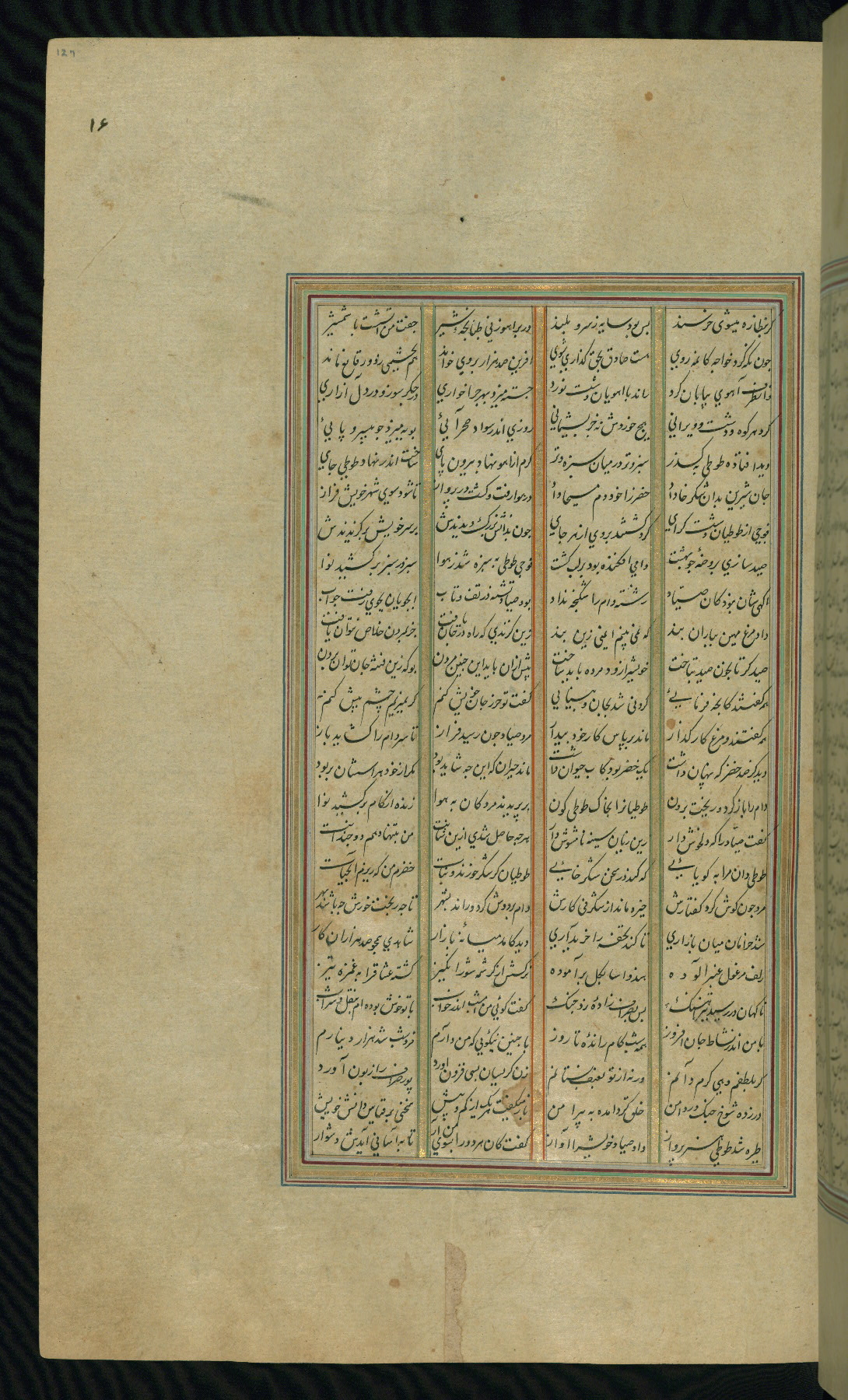 This illuminated and illustrated manuscript contains the Khamsah (quintet) and two historical poems (masnavi), Qirān-i saʿdayn and Nuh sipihr, by Amīr Khusraw Dihlavī (d. 725 AH / 1325 CE). The codex is dated 1017 AH / 1609 CE and was produced in Safavid Iran. All texts are written in black nastaʿlīq script with chapter headings in red. The manuscript opens with an illuminated and illustrated frontispiece of a hunting and court scene in the early Safavid style (fols. 1b-2a). The first text is Khamsah-i Dihlavī (fols. 2b-192a), which is introduced by an illuminated incipit and titlepiece with the title of the first poem of the quintet and the author's name. The second text is Qirān-i saʿdayn, a historical poem (masnavi) about the meeting of Sultan Muʿizz al-Dīn Kayqubād and his father, Nāṣir al-Din Bughrā Khān, on the banks of the Sarjū in Oudh. It is also introduced with an illuminated incipit and titlepiece (fol. 193b). The third text is Nuh sipihr, a historical poem (masnavi) describing the glories of Sultan Quṭb al-Dīn Mubārak Shāh Khaljī’s time, introduced with an illuminated incipit and headpiece (fol. 223b). The dark brown leather binding is original to the manuscript.