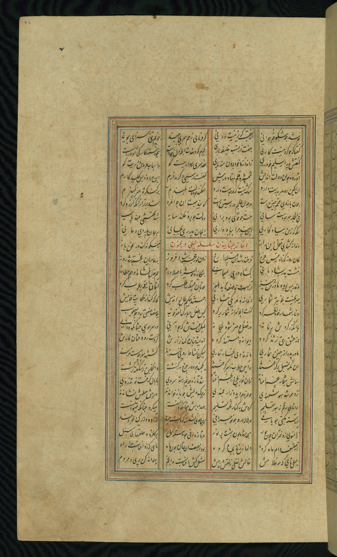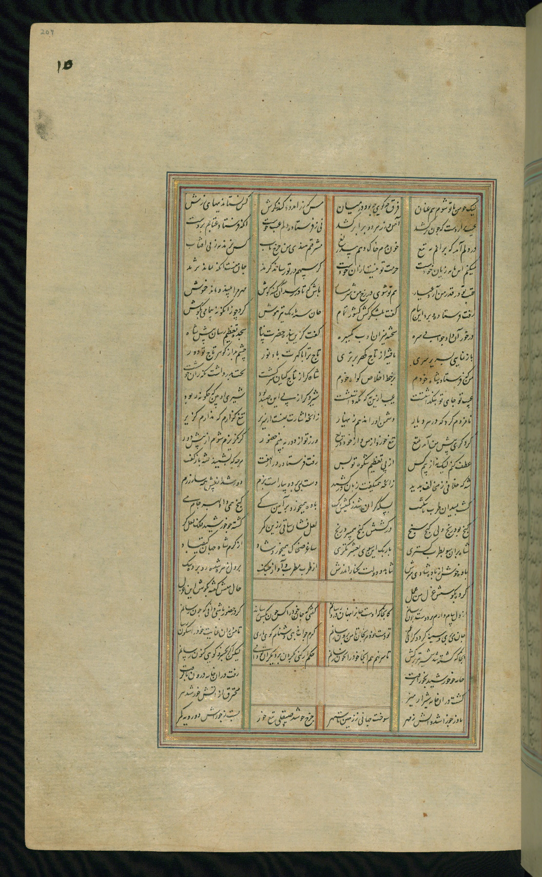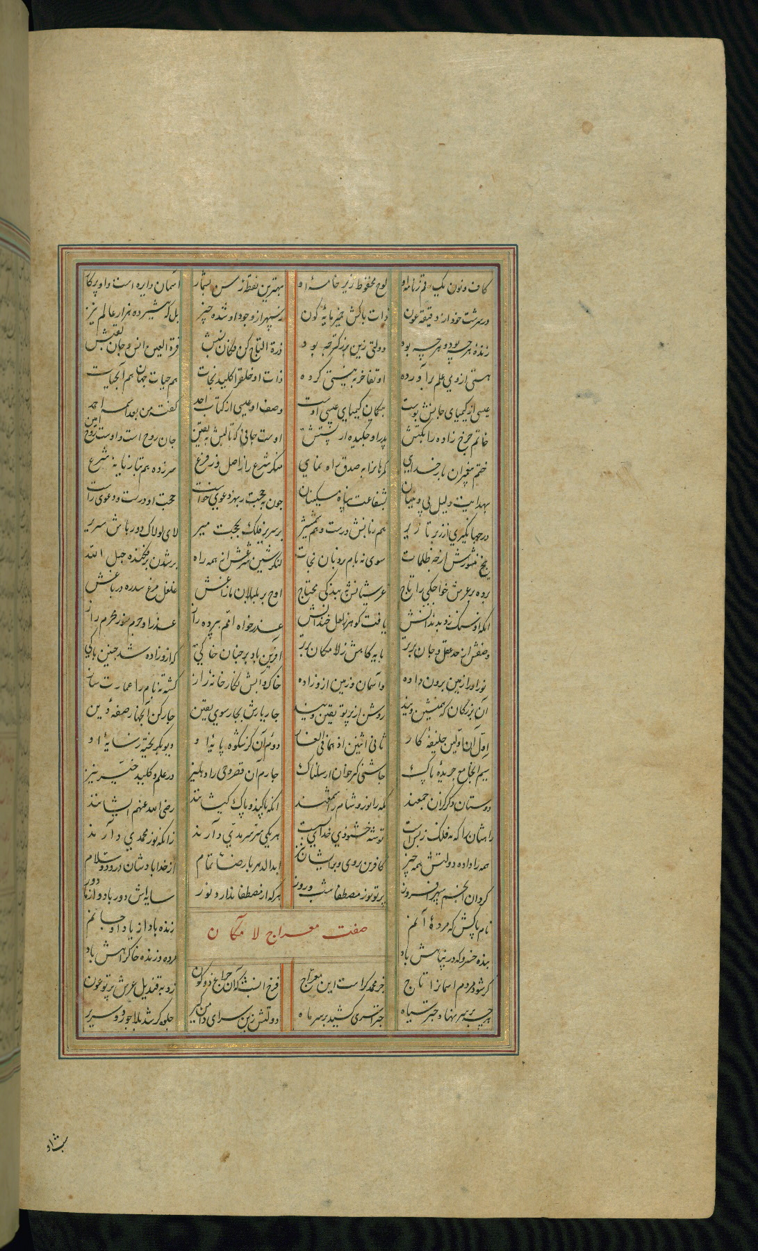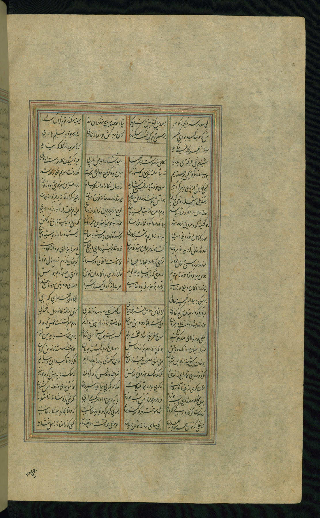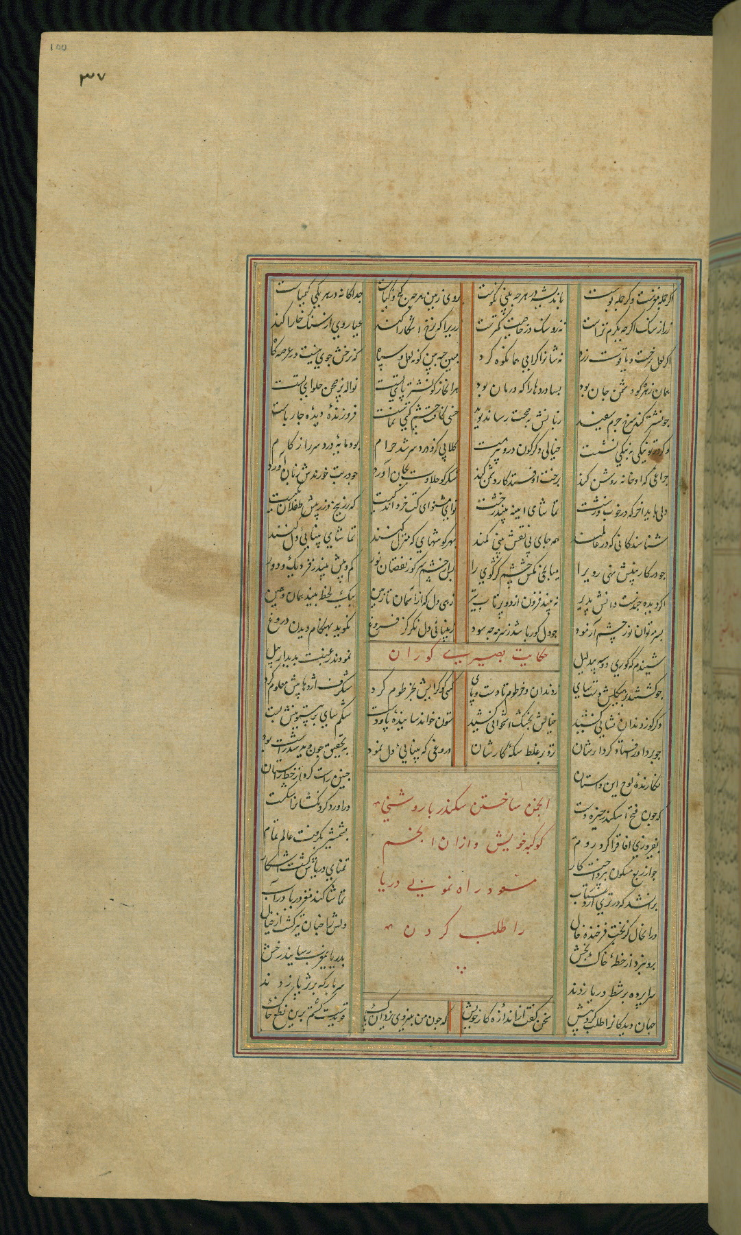 This illuminated and illustrated manuscript contains the Khamsah (quintet) and two historical poems (masnavi), Qirān-i saʿdayn and Nuh sipihr, by Amīr Khusraw Dihlavī (d. 725 AH / 1325 CE). The codex is dated 1017 AH / 1609 CE and was produced in Safavid Iran. All texts are written in black nastaʿlīq script with chapter headings in red. The manuscript opens with an illuminated and illustrated frontispiece of a hunting and court scene in the early Safavid style (fols. 1b-2a). The first text is Khamsah-i Dihlavī (fols. 2b-192a), which is introduced by an illuminated incipit and titlepiece with the title of the first poem of the quintet and the author's name. The second text is Qirān-i saʿdayn, a historical poem (masnavi) about the meeting of Sultan Muʿizz al-Dīn Kayqubād and his father, Nāṣir al-Din Bughrā Khān, on the banks of the Sarjū in Oudh. It is also introduced with an illuminated incipit and titlepiece (fol. 193b). The third text is Nuh sipihr, a historical poem (masnavi) describing the glories of Sultan Quṭb al-Dīn Mubārak Shāh Khaljī’s time, introduced with an illuminated incipit and headpiece (fol. 223b). The dark brown leather binding is original to the manuscript.
