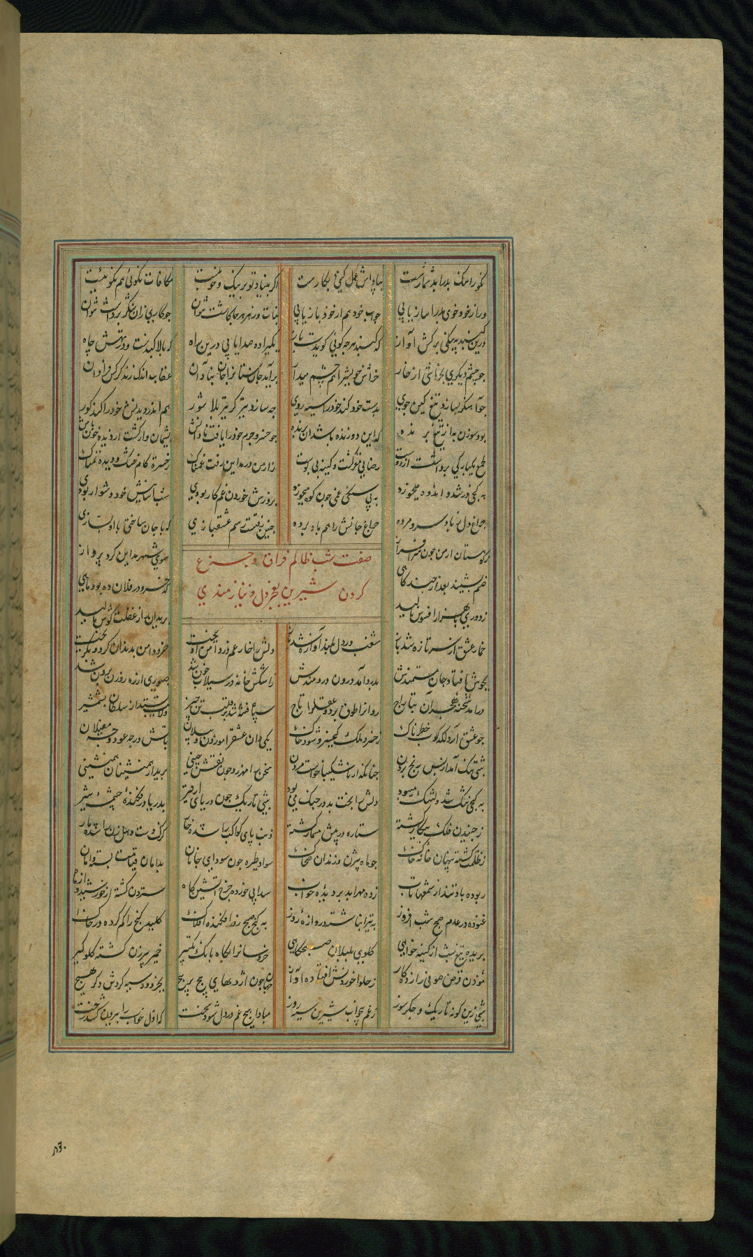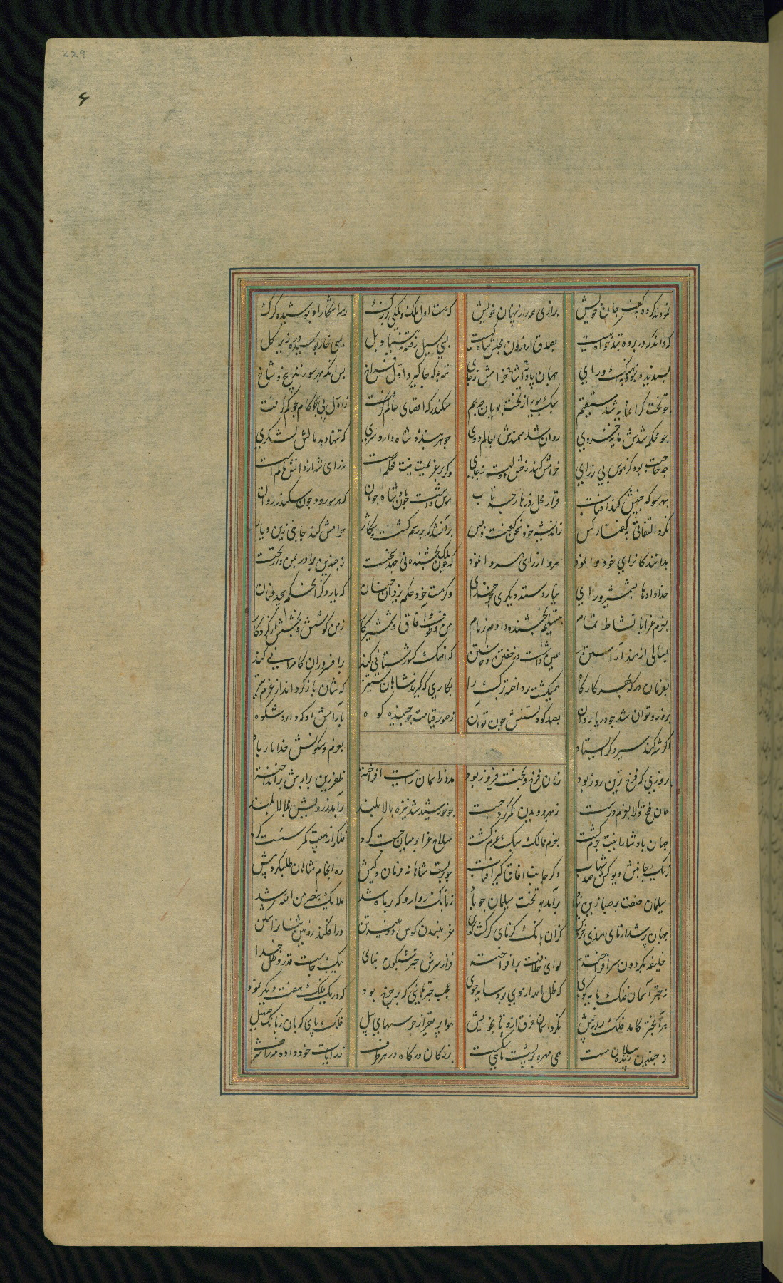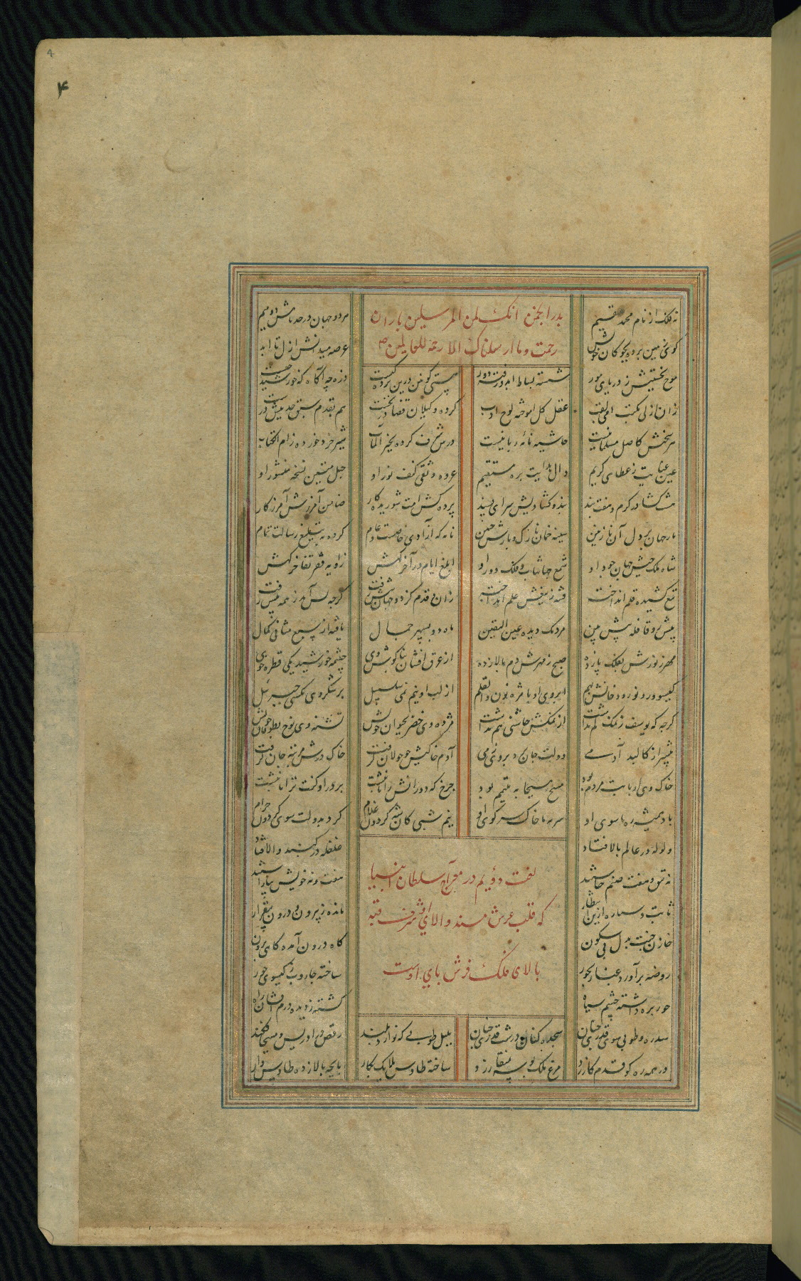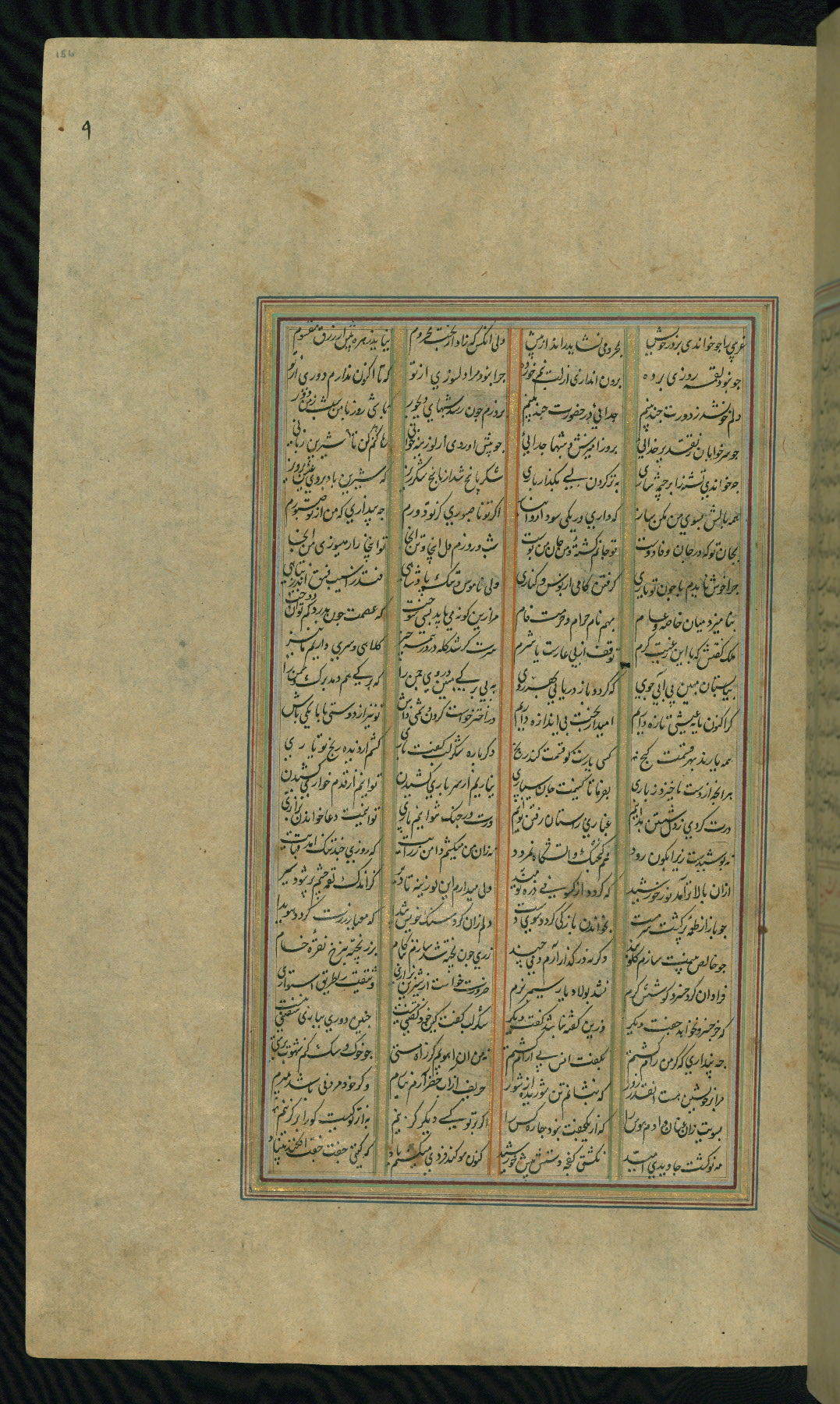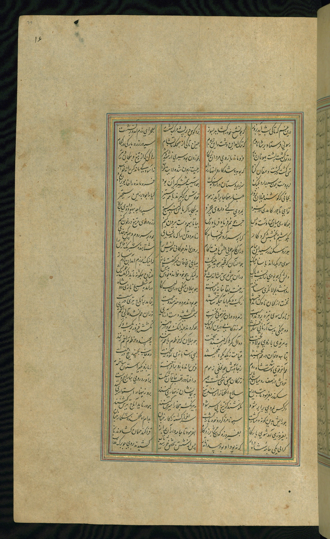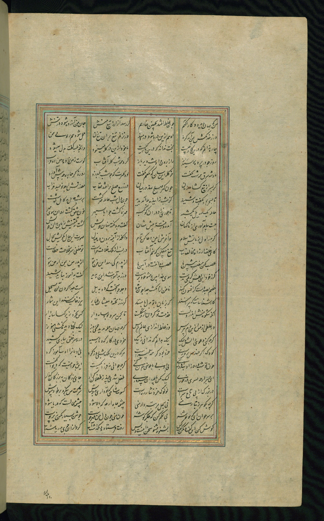 This illuminated and illustrated manuscript contains the Khamsah (quintet) and two historical poems (masnavi), Qirān-i saʿdayn and Nuh sipihr, by Amīr Khusraw Dihlavī (d. 725 AH / 1325 CE). The codex is dated 1017 AH / 1609 CE and was produced in Safavid Iran. All texts are written in black nastaʿlīq script with chapter headings in red. The manuscript opens with an illuminated and illustrated frontispiece of a hunting and court scene in the early Safavid style (fols. 1b-2a). The first text is Khamsah-i Dihlavī (fols. 2b-192a), which is introduced by an illuminated incipit and titlepiece with the title of the first poem of the quintet and the author's name. The second text is Qirān-i saʿdayn, a historical poem (masnavi) about the meeting of Sultan Muʿizz al-Dīn Kayqubād and his father, Nāṣir al-Din Bughrā Khān, on the banks of the Sarjū in Oudh. It is also introduced with an illuminated incipit and titlepiece (fol. 193b). The third text is Nuh sipihr, a historical poem (masnavi) describing the glories of Sultan Quṭb al-Dīn Mubārak Shāh Khaljī’s time, introduced with an illuminated incipit and headpiece (fol. 223b). The dark brown leather binding is original to the manuscript.