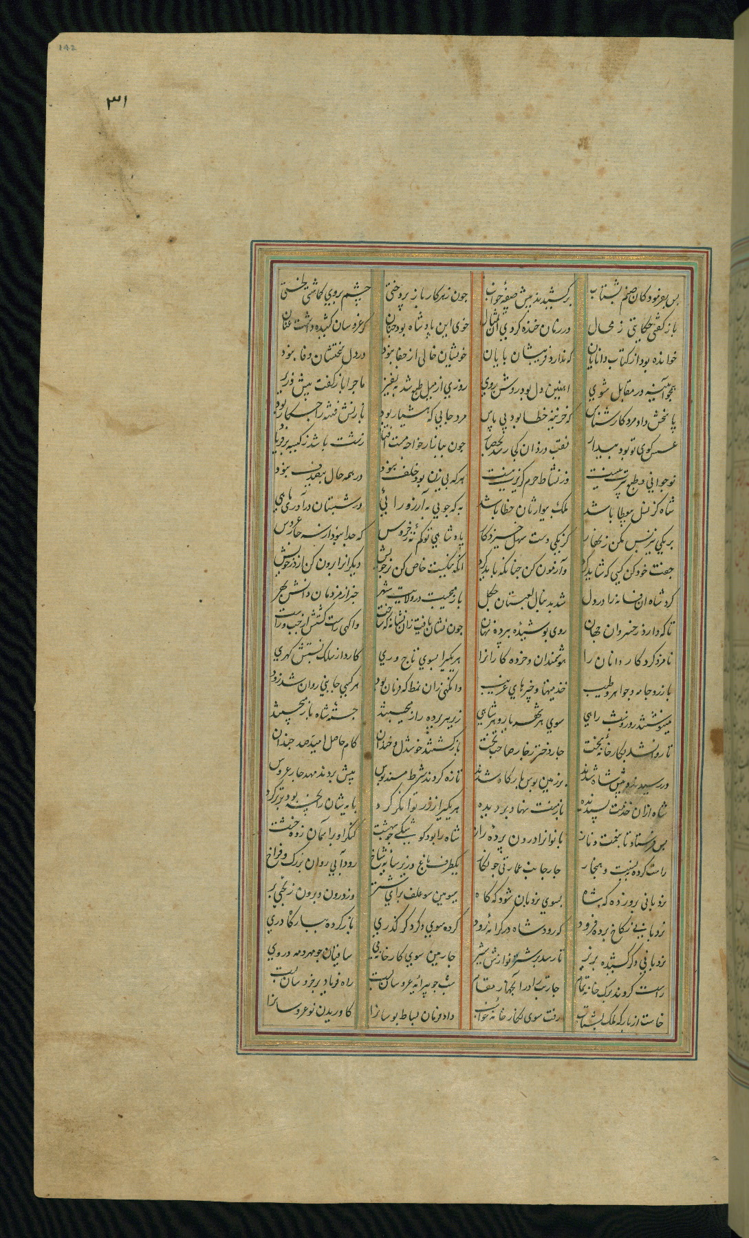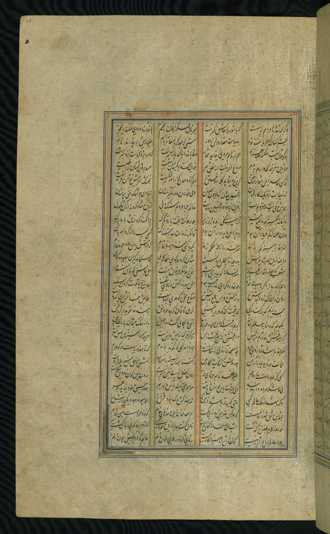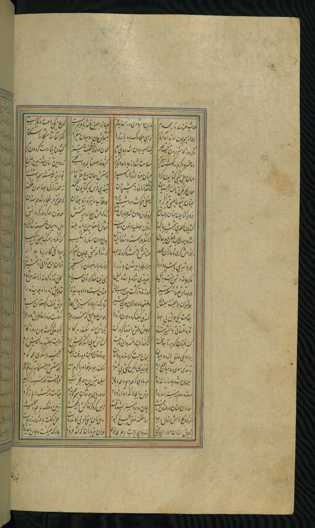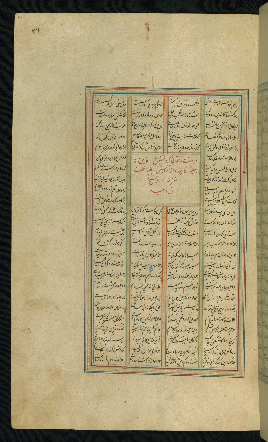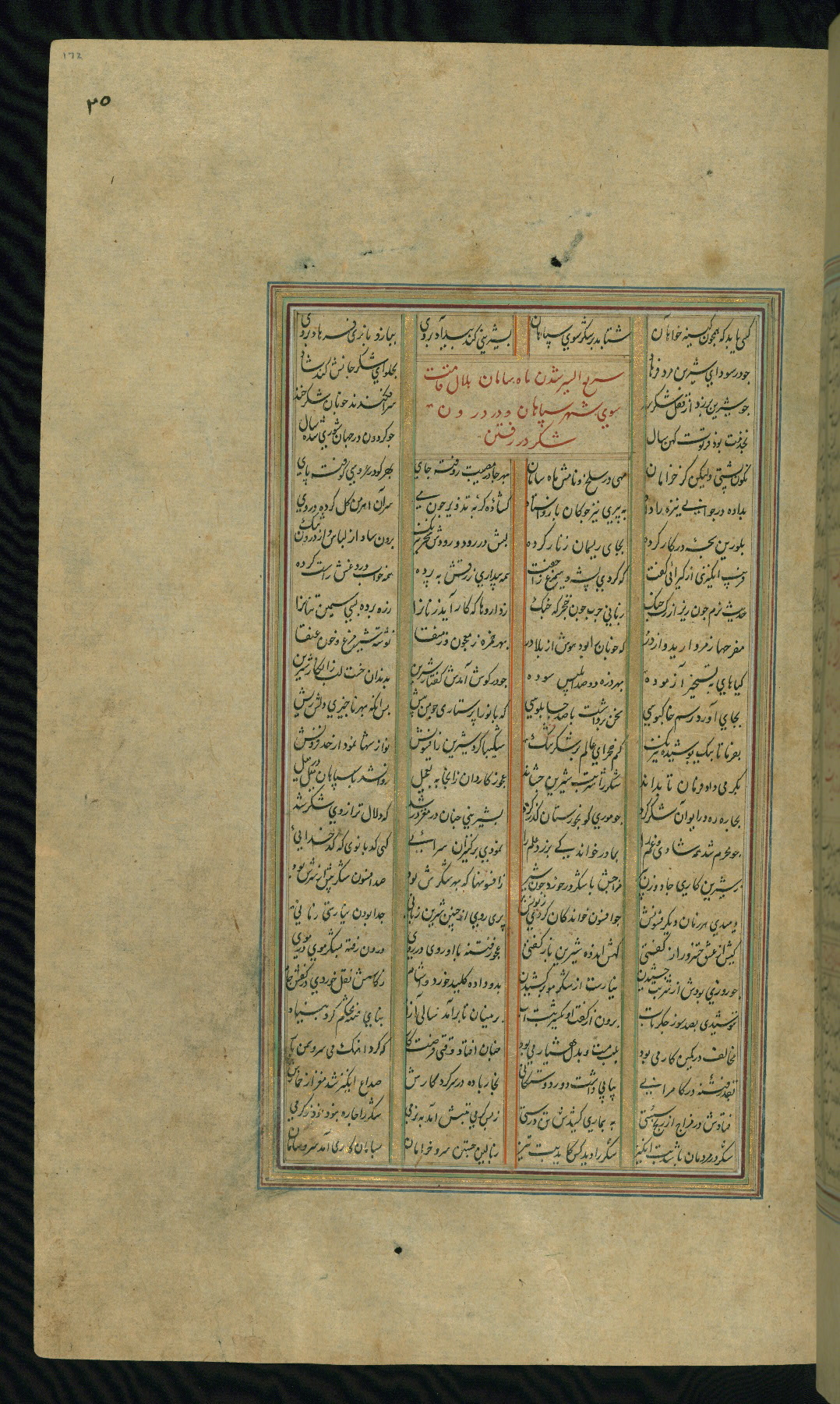 This illuminated and illustrated manuscript contains the Khamsah (quintet) and two historical poems (masnavi), Qirān-i saʿdayn and Nuh sipihr, by Amīr Khusraw Dihlavī (d. 725 AH / 1325 CE). The codex is dated 1017 AH / 1609 CE and was produced in Safavid Iran. All texts are written in black nastaʿlīq script with chapter headings in red. The manuscript opens with an illuminated and illustrated frontispiece of a hunting and court scene in the early Safavid style (fols. 1b-2a). The first text is Khamsah-i Dihlavī (fols. 2b-192a), which is introduced by an illuminated incipit and titlepiece with the title of the first poem of the quintet and the author's name. The second text is Qirān-i saʿdayn, a historical poem (masnavi) about the meeting of Sultan Muʿizz al-Dīn Kayqubād and his father, Nāṣir al-Din Bughrā Khān, on the banks of the Sarjū in Oudh. It is also introduced with an illuminated incipit and titlepiece (fol. 193b). The third text is Nuh sipihr, a historical poem (masnavi) describing the glories of Sultan Quṭb al-Dīn Mubārak Shāh Khaljī’s time, introduced with an illuminated incipit and headpiece (fol. 223b). The dark brown leather binding is original to the manuscript.