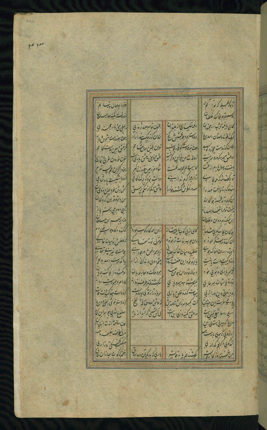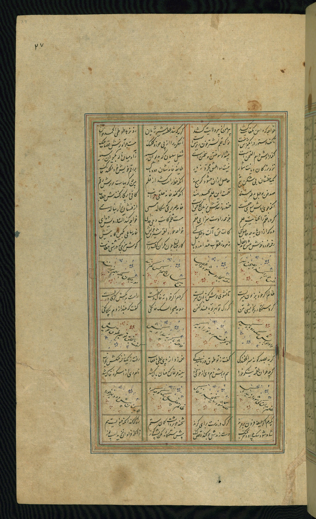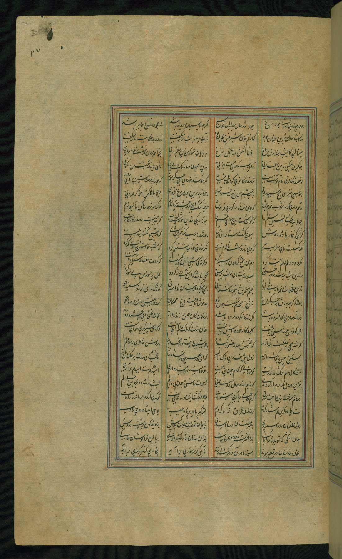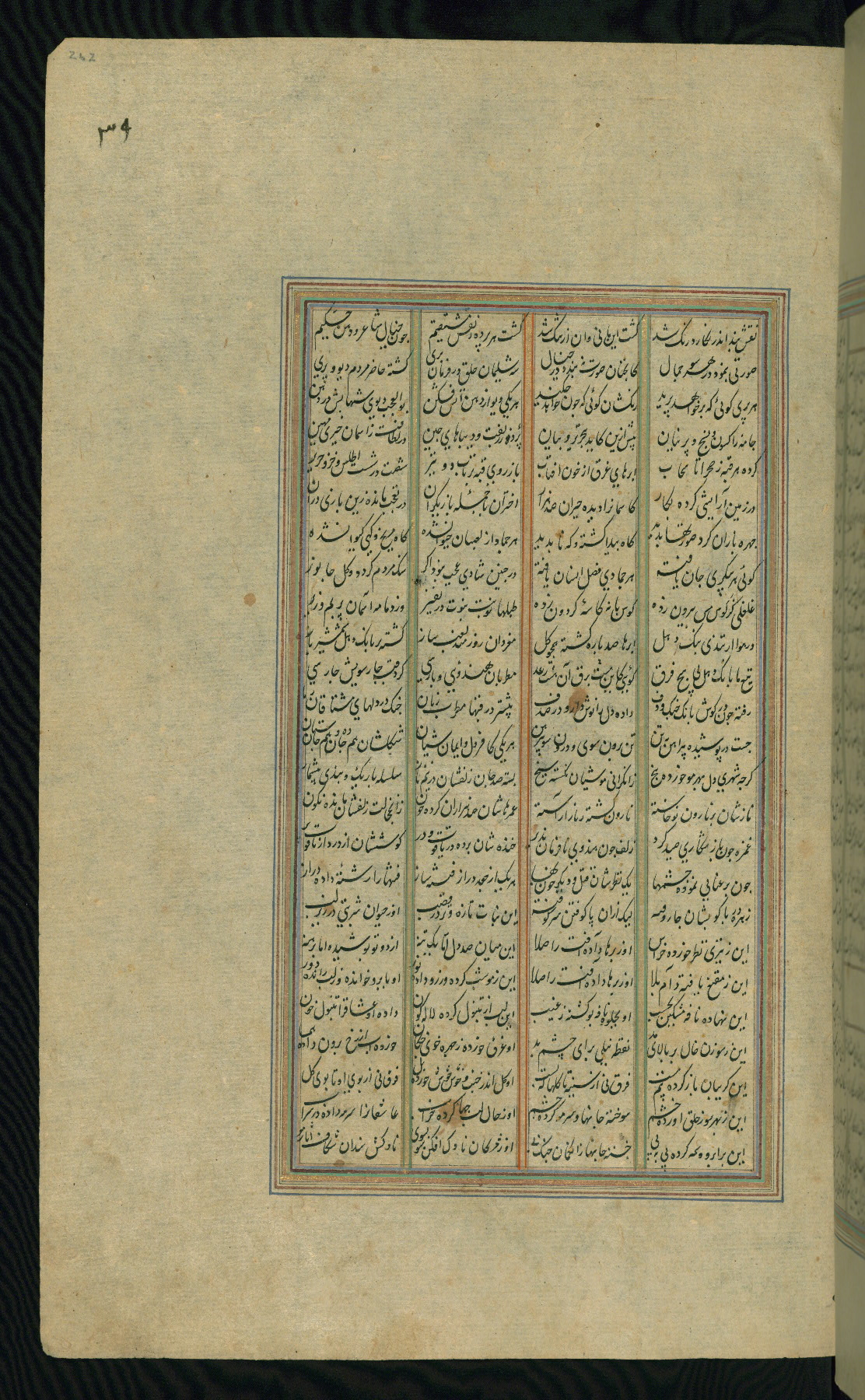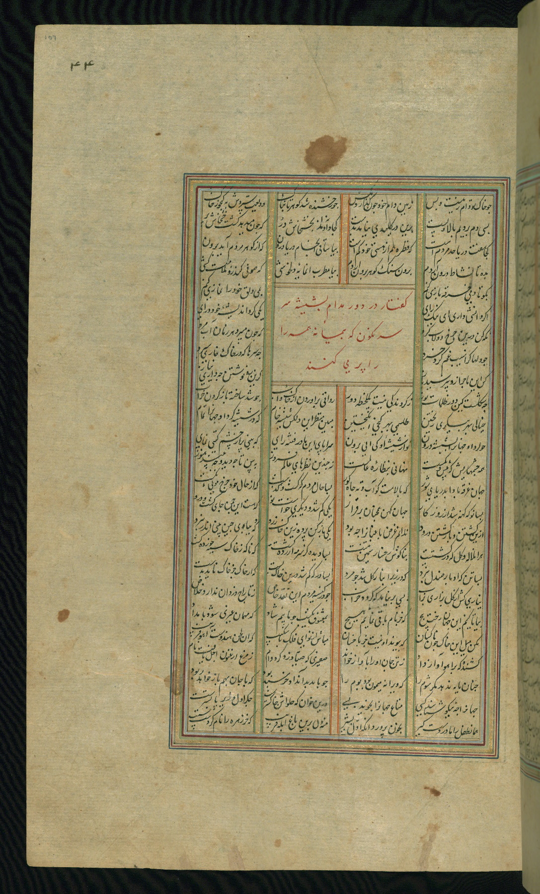 This illuminated and illustrated manuscript contains the Khamsah (quintet) and two historical poems (masnavi), Qirān-i saʿdayn and Nuh sipihr, by Amīr Khusraw Dihlavī (d. 725 AH / 1325 CE). The codex is dated 1017 AH / 1609 CE and was produced in Safavid Iran. All texts are written in black nastaʿlīq script with chapter headings in red. The manuscript opens with an illuminated and illustrated frontispiece of a hunting and court scene in the early Safavid style (fols. 1b-2a). The first text is Khamsah-i Dihlavī (fols. 2b-192a), which is introduced by an illuminated incipit and titlepiece with the title of the first poem of the quintet and the author's name. The second text is Qirān-i saʿdayn, a historical poem (masnavi) about the meeting of Sultan Muʿizz al-Dīn Kayqubād and his father, Nāṣir al-Din Bughrā Khān, on the banks of the Sarjū in Oudh. It is also introduced with an illuminated incipit and titlepiece (fol. 193b). The third text is Nuh sipihr, a historical poem (masnavi) describing the glories of Sultan Quṭb al-Dīn Mubārak Shāh Khaljī’s time, introduced with an illuminated incipit and headpiece (fol. 223b). The dark brown leather binding is original to the manuscript.