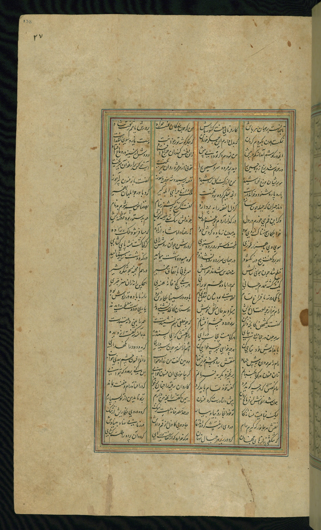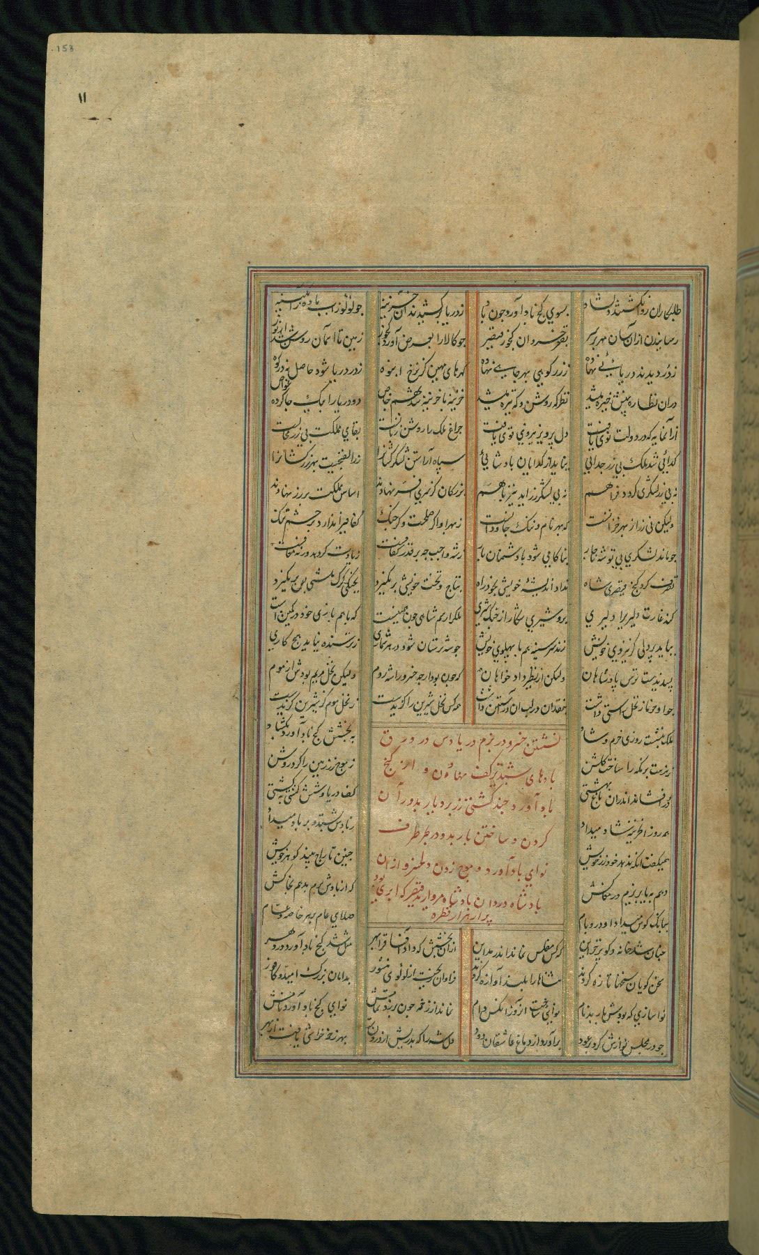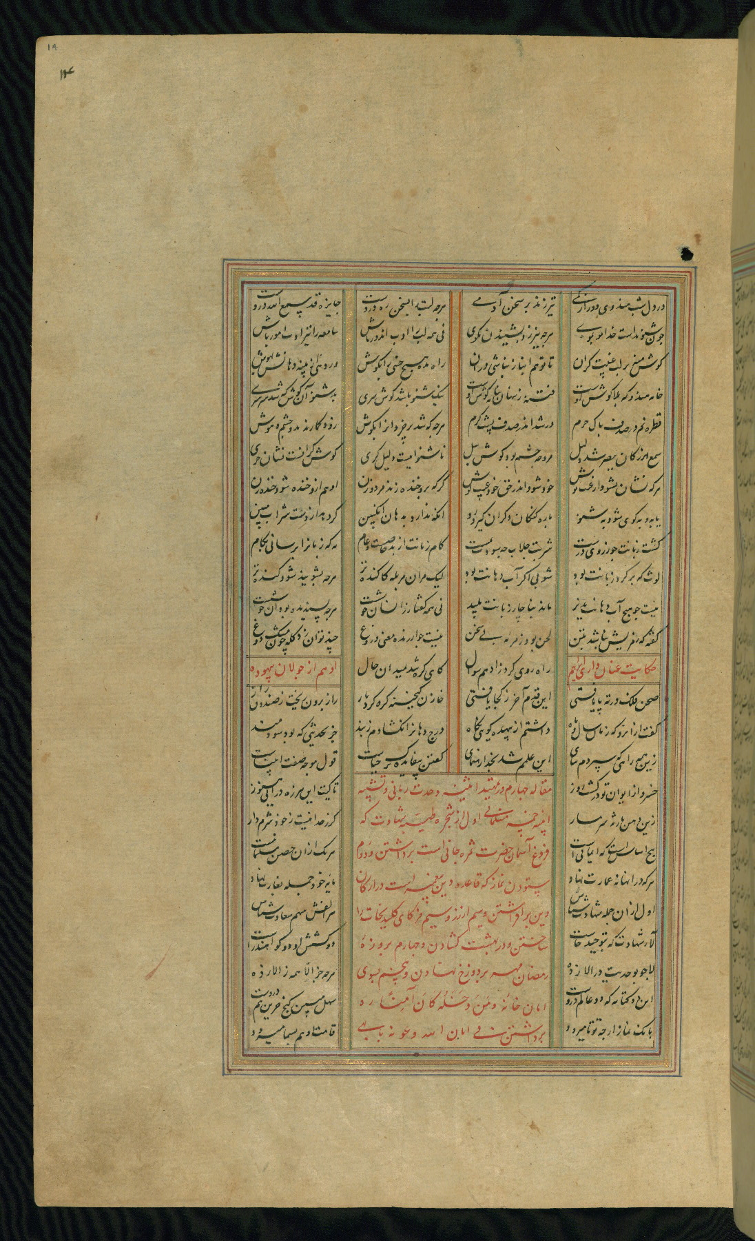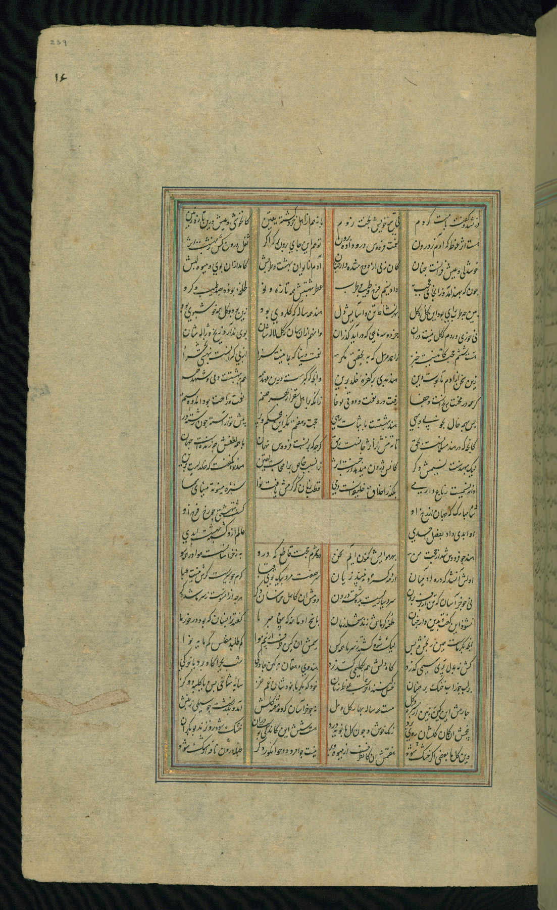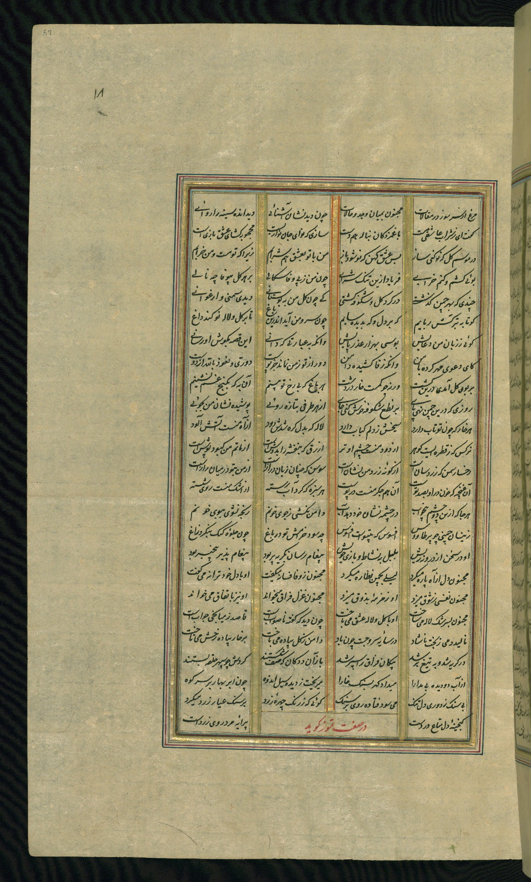 This illuminated and illustrated manuscript contains the Khamsah (quintet) and two historical poems (masnavi), Qirān-i saʿdayn and Nuh sipihr, by Amīr Khusraw Dihlavī (d. 725 AH / 1325 CE). The codex is dated 1017 AH / 1609 CE and was produced in Safavid Iran. All texts are written in black nastaʿlīq script with chapter headings in red. The manuscript opens with an illuminated and illustrated frontispiece of a hunting and court scene in the early Safavid style (fols. 1b-2a). The first text is Khamsah-i Dihlavī (fols. 2b-192a), which is introduced by an illuminated incipit and titlepiece with the title of the first poem of the quintet and the author's name. The second text is Qirān-i saʿdayn, a historical poem (masnavi) about the meeting of Sultan Muʿizz al-Dīn Kayqubād and his father, Nāṣir al-Din Bughrā Khān, on the banks of the Sarjū in Oudh. It is also introduced with an illuminated incipit and titlepiece (fol. 193b). The third text is Nuh sipihr, a historical poem (masnavi) describing the glories of Sultan Quṭb al-Dīn Mubārak Shāh Khaljī’s time, introduced with an illuminated incipit and headpiece (fol. 223b). The dark brown leather binding is original to the manuscript.