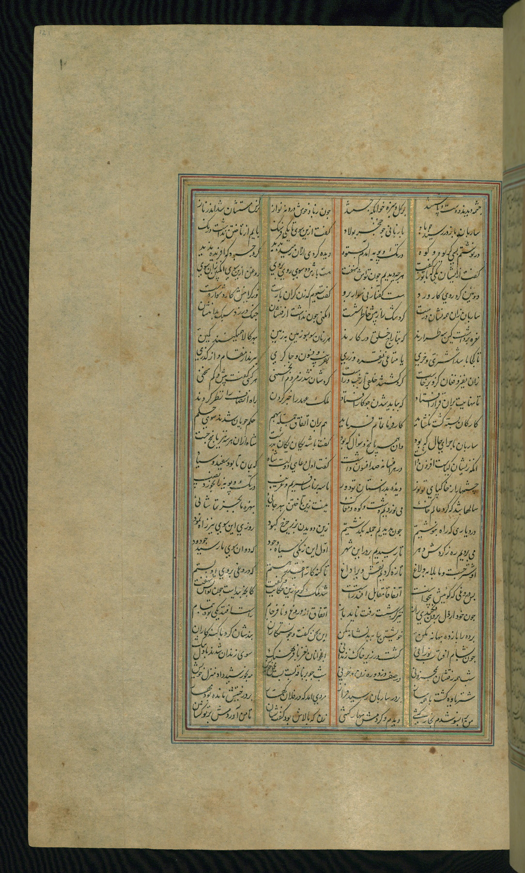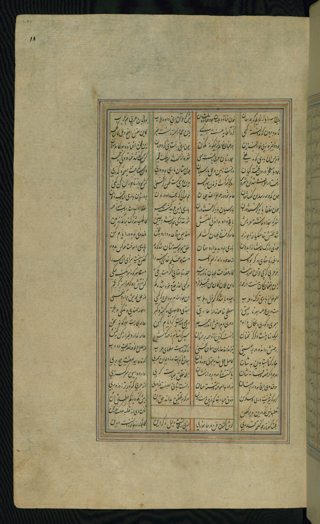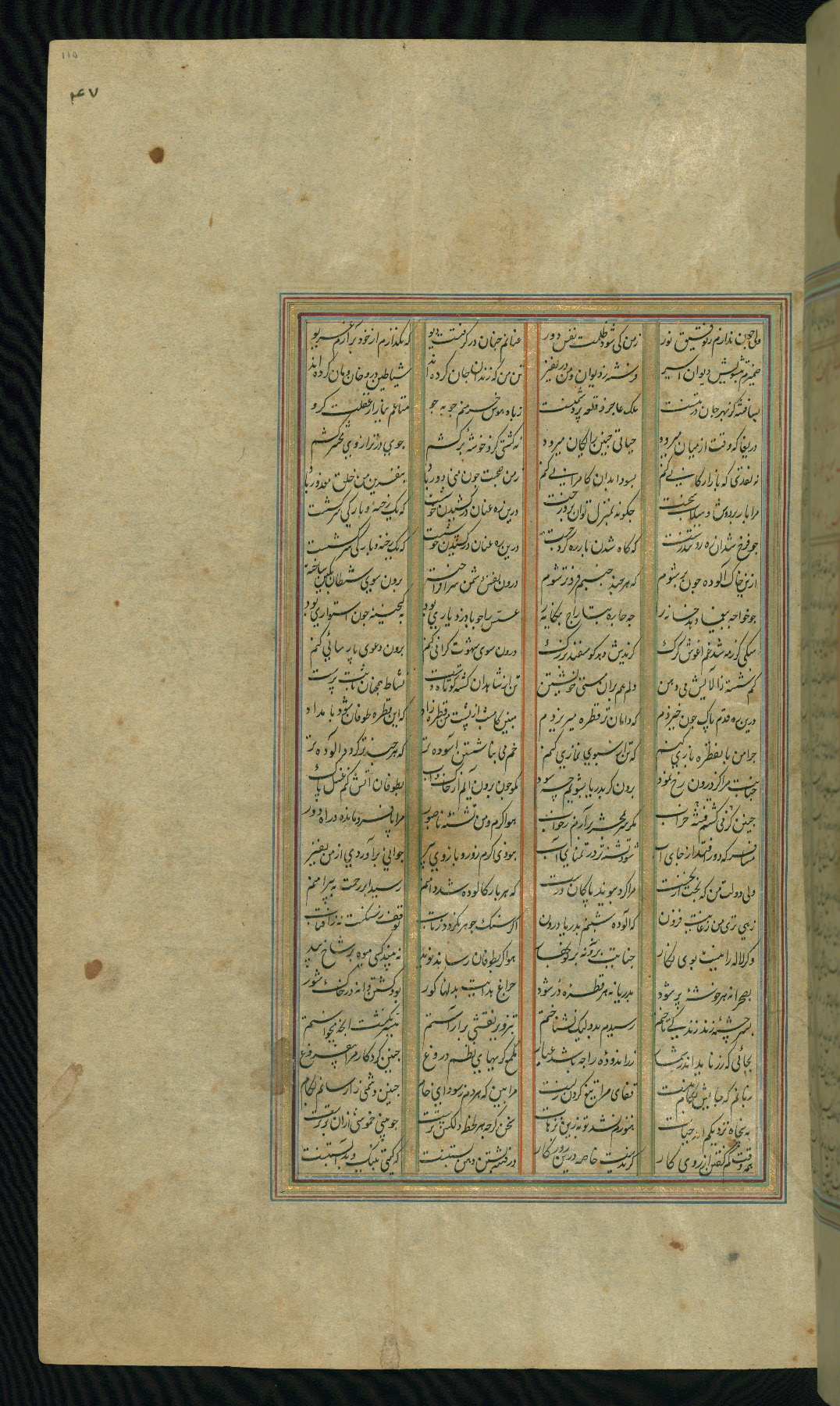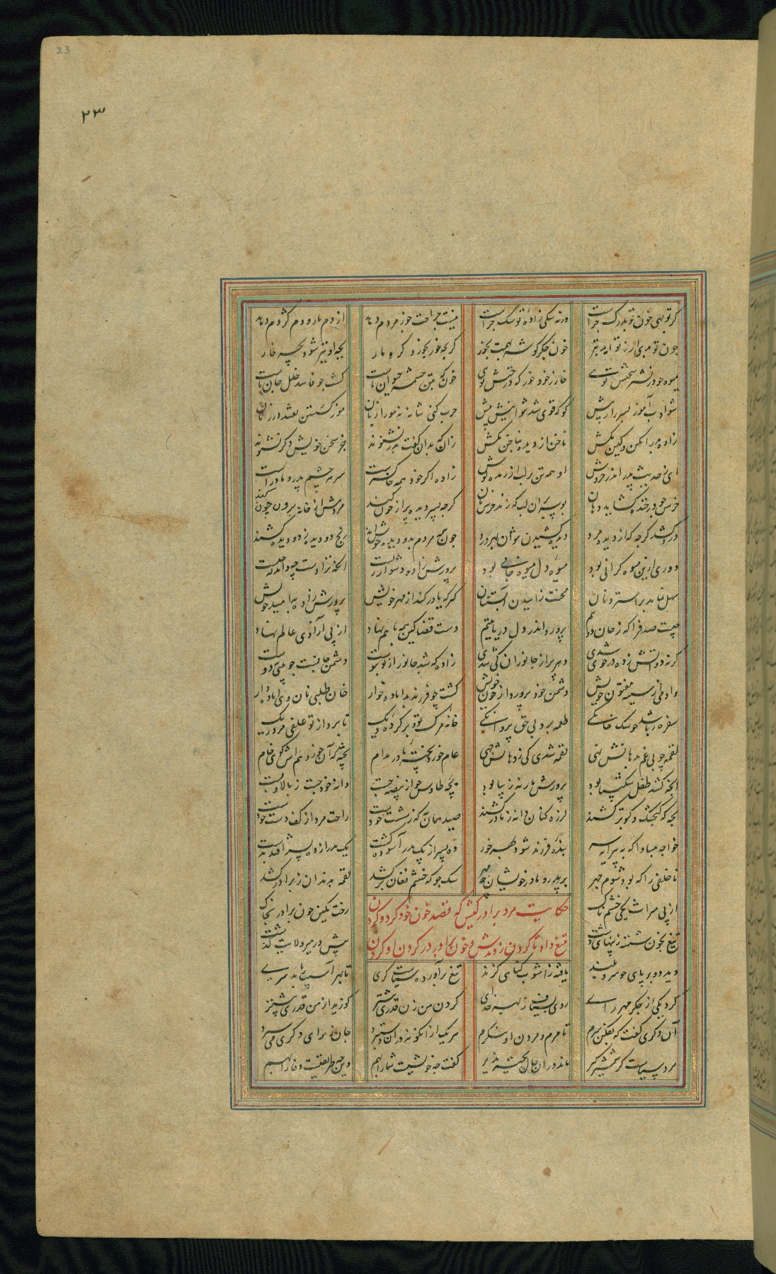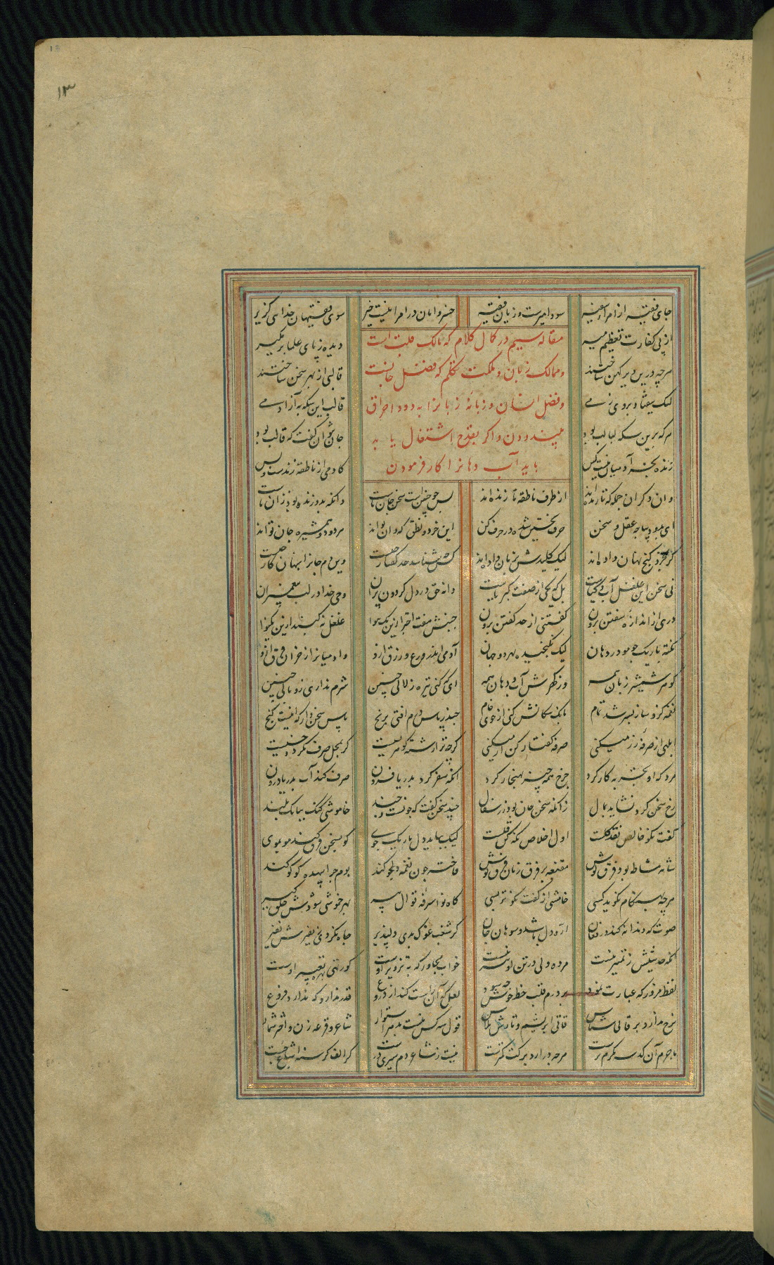 This illuminated and illustrated manuscript contains the Khamsah (quintet) and two historical poems (masnavi), Qirān-i saʿdayn and Nuh sipihr, by Amīr Khusraw Dihlavī (d. 725 AH / 1325 CE). The codex is dated 1017 AH / 1609 CE and was produced in Safavid Iran. All texts are written in black nastaʿlīq script with chapter headings in red. The manuscript opens with an illuminated and illustrated frontispiece of a hunting and court scene in the early Safavid style (fols. 1b-2a). The first text is Khamsah-i Dihlavī (fols. 2b-192a), which is introduced by an illuminated incipit and titlepiece with the title of the first poem of the quintet and the author's name. The second text is Qirān-i saʿdayn, a historical poem (masnavi) about the meeting of Sultan Muʿizz al-Dīn Kayqubād and his father, Nāṣir al-Din Bughrā Khān, on the banks of the Sarjū in Oudh. It is also introduced with an illuminated incipit and titlepiece (fol. 193b). The third text is Nuh sipihr, a historical poem (masnavi) describing the glories of Sultan Quṭb al-Dīn Mubārak Shāh Khaljī’s time, introduced with an illuminated incipit and headpiece (fol. 223b). The dark brown leather binding is original to the manuscript.