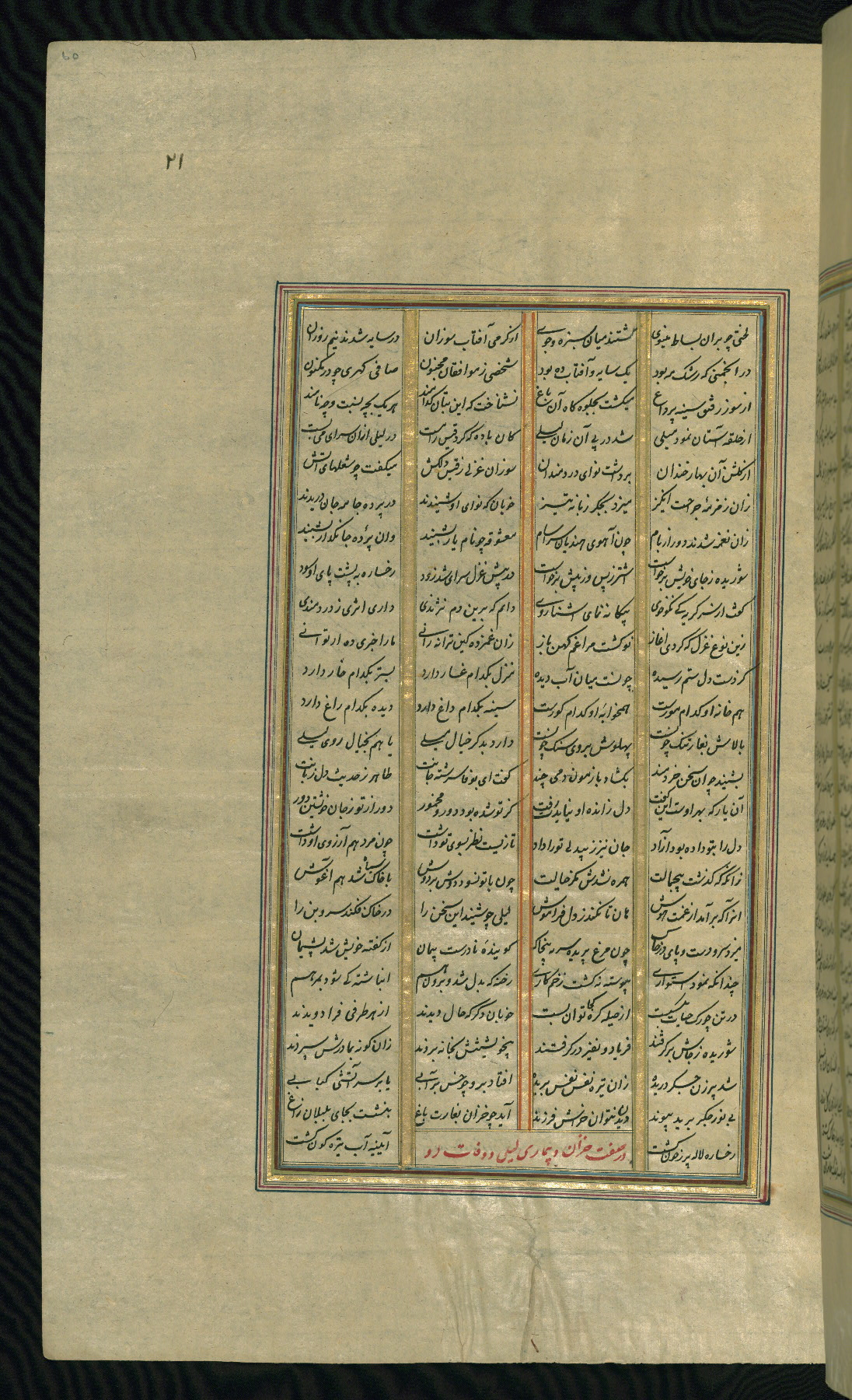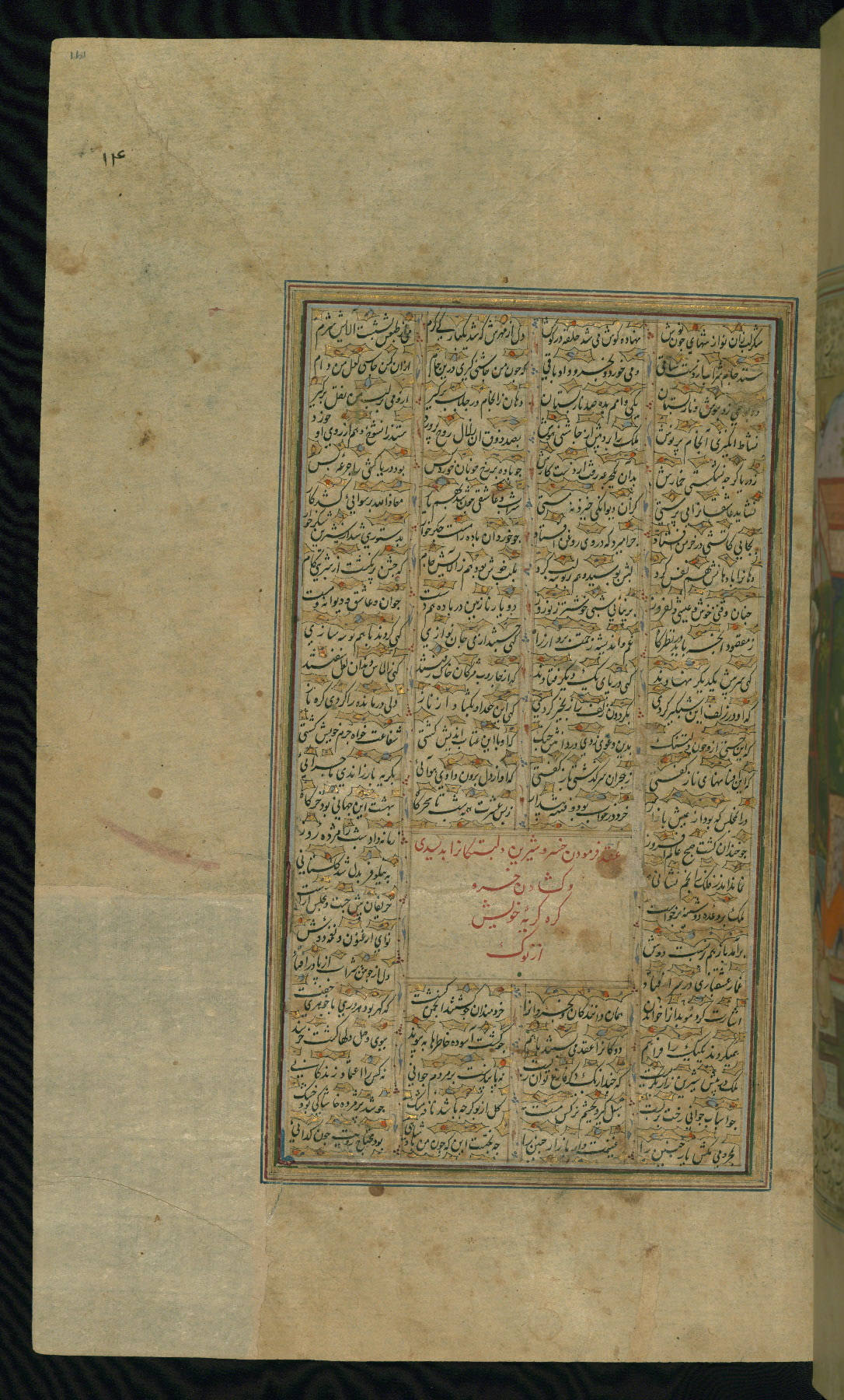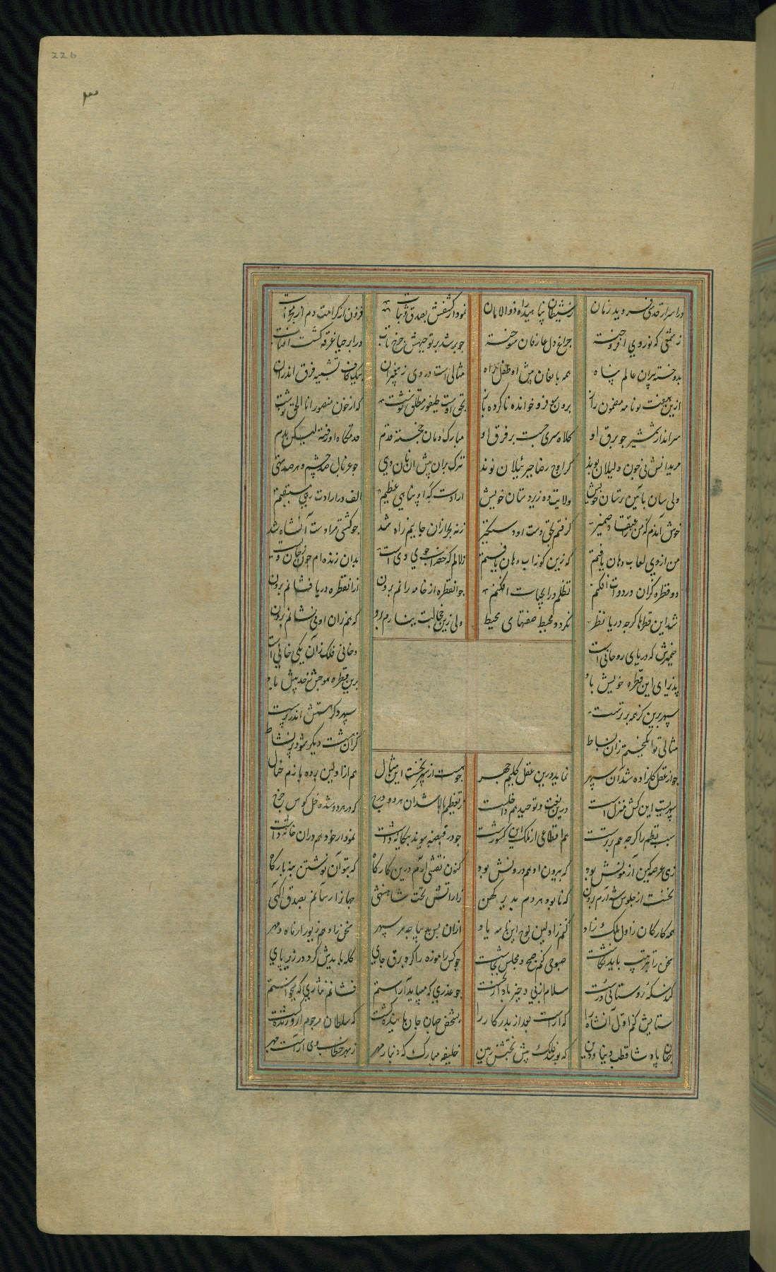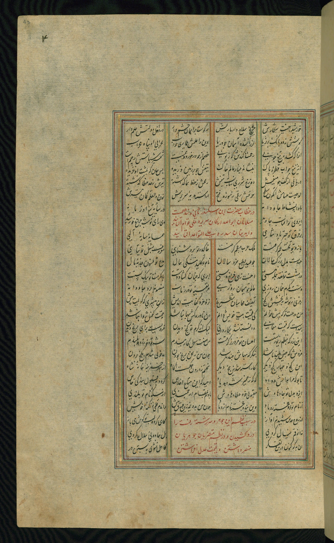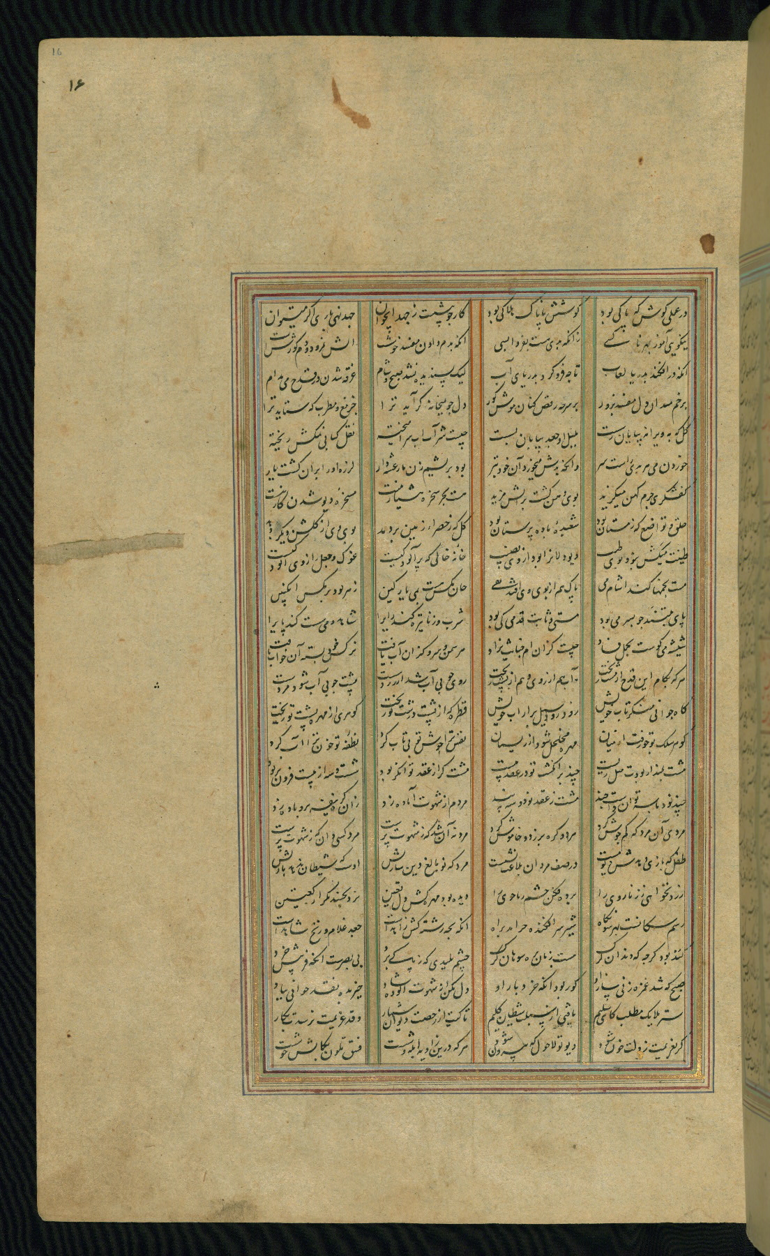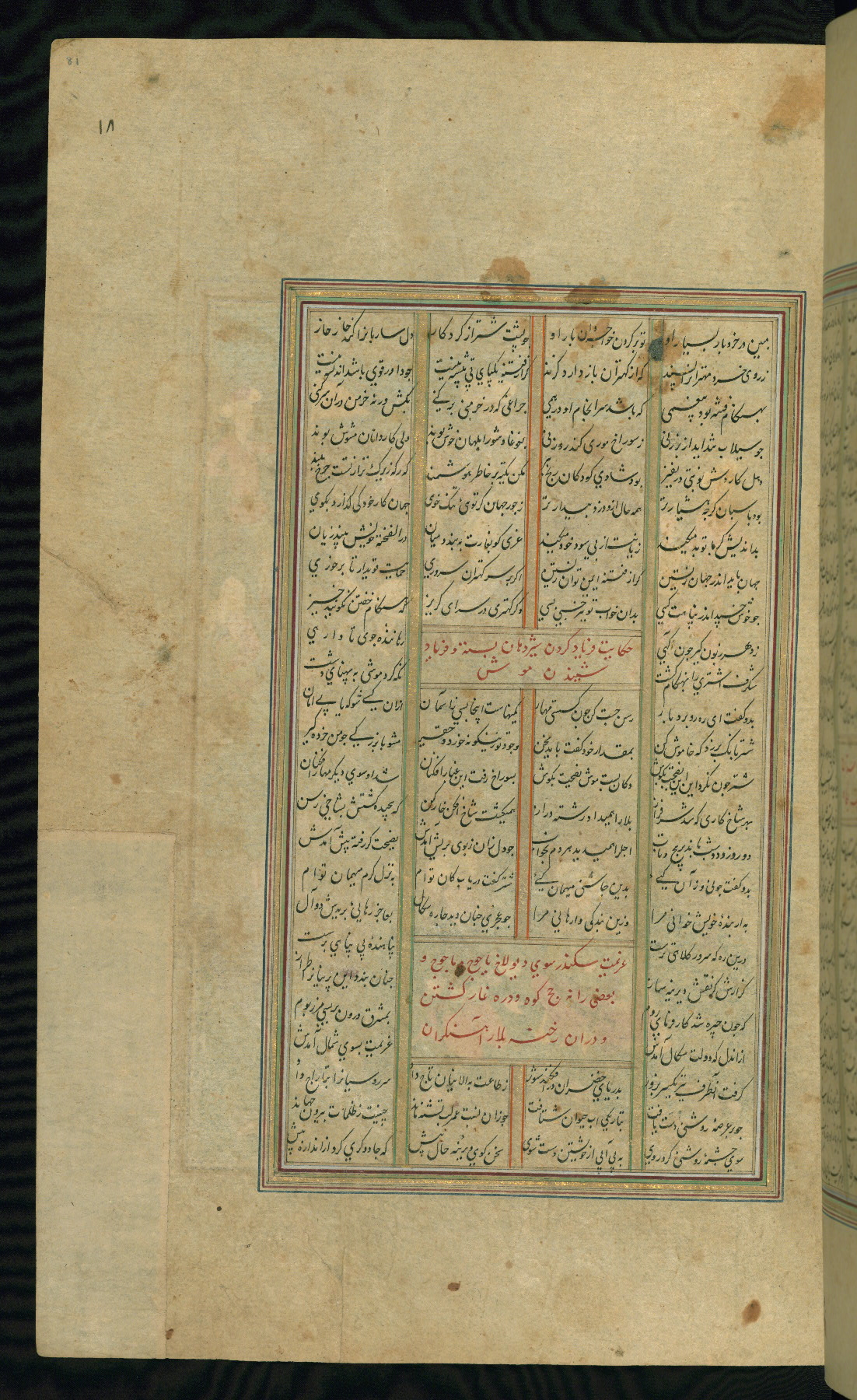 This illuminated and illustrated manuscript contains the Khamsah (quintet) and two historical poems (masnavi), Qirān-i saʿdayn and Nuh sipihr, by Amīr Khusraw Dihlavī (d. 725 AH / 1325 CE). The codex is dated 1017 AH / 1609 CE and was produced in Safavid Iran. All texts are written in black nastaʿlīq script with chapter headings in red. The manuscript opens with an illuminated and illustrated frontispiece of a hunting and court scene in the early Safavid style (fols. 1b-2a). The first text is Khamsah-i Dihlavī (fols. 2b-192a), which is introduced by an illuminated incipit and titlepiece with the title of the first poem of the quintet and the author's name. The second text is Qirān-i saʿdayn, a historical poem (masnavi) about the meeting of Sultan Muʿizz al-Dīn Kayqubād and his father, Nāṣir al-Din Bughrā Khān, on the banks of the Sarjū in Oudh. It is also introduced with an illuminated incipit and titlepiece (fol. 193b). The third text is Nuh sipihr, a historical poem (masnavi) describing the glories of Sultan Quṭb al-Dīn Mubārak Shāh Khaljī’s time, introduced with an illuminated incipit and headpiece (fol. 223b). The dark brown leather binding is original to the manuscript.
