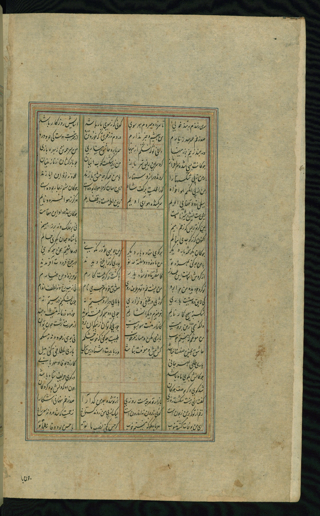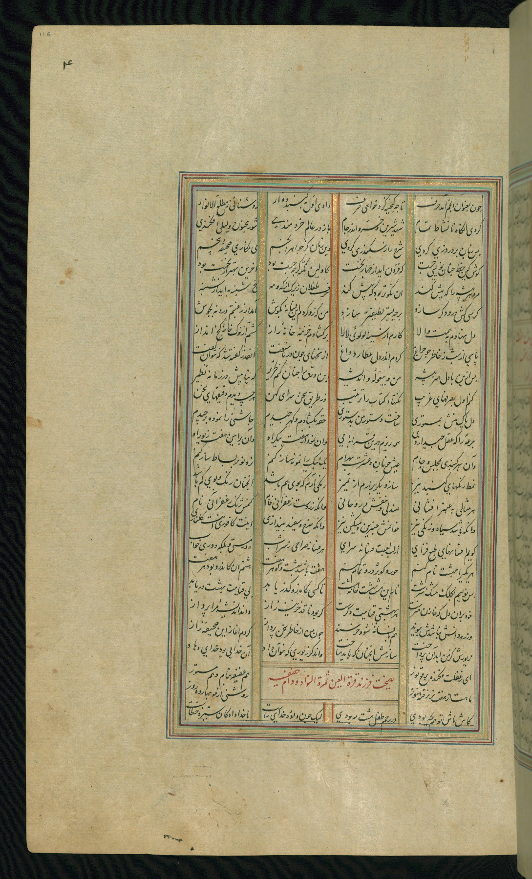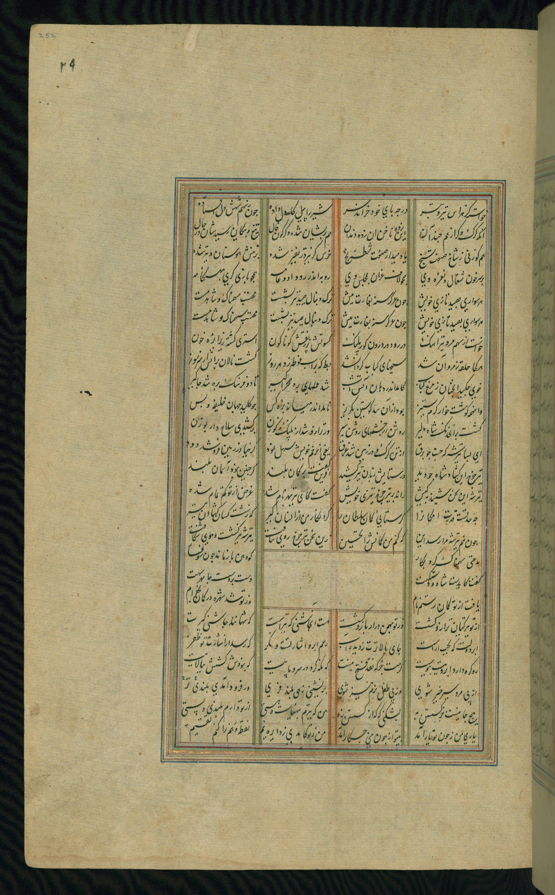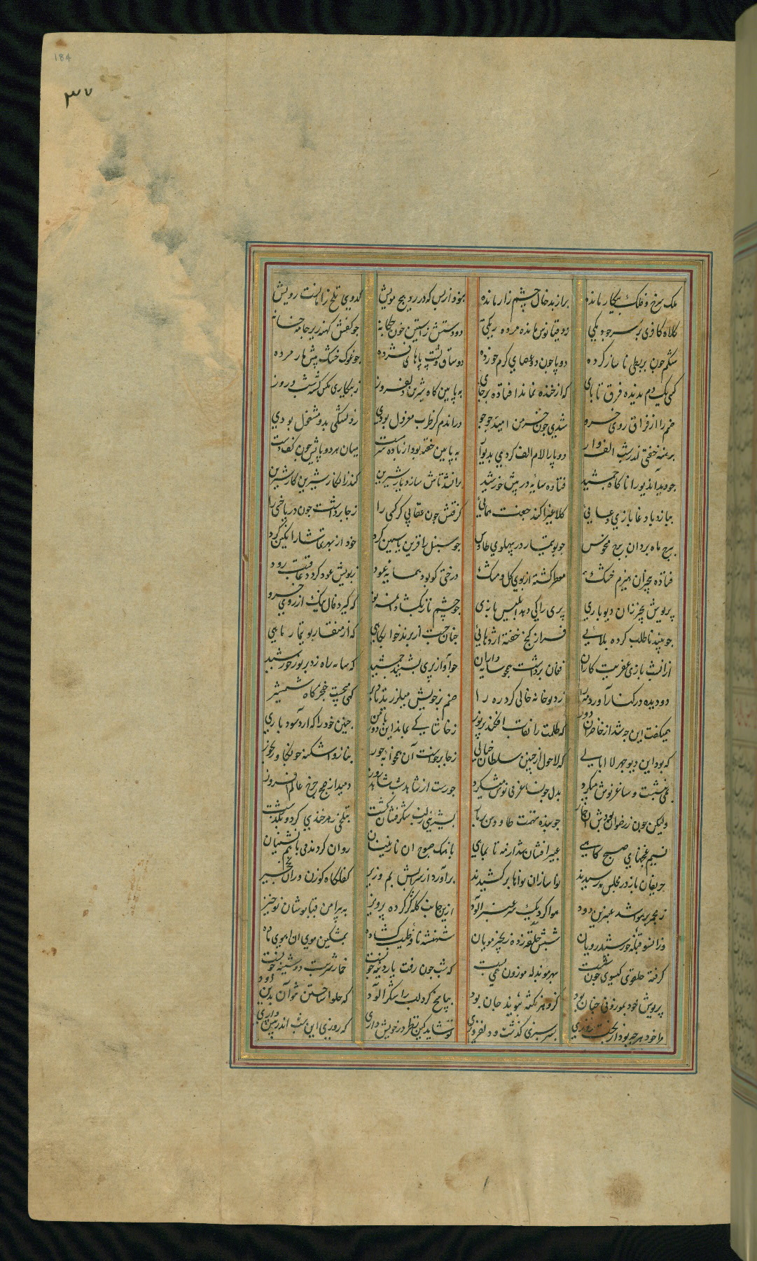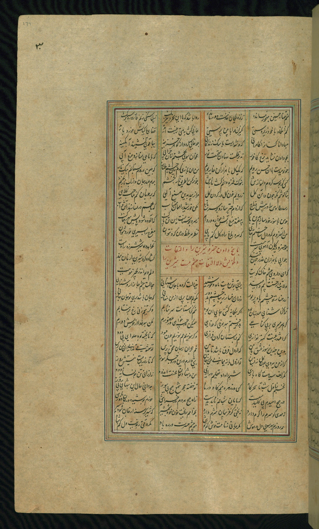 This illuminated and illustrated manuscript contains the Khamsah (quintet) and two historical poems (masnavi), Qirān-i saʿdayn and Nuh sipihr, by Amīr Khusraw Dihlavī (d. 725 AH / 1325 CE). The codex is dated 1017 AH / 1609 CE and was produced in Safavid Iran. All texts are written in black nastaʿlīq script with chapter headings in red. The manuscript opens with an illuminated and illustrated frontispiece of a hunting and court scene in the early Safavid style (fols. 1b-2a). The first text is Khamsah-i Dihlavī (fols. 2b-192a), which is introduced by an illuminated incipit and titlepiece with the title of the first poem of the quintet and the author's name. The second text is Qirān-i saʿdayn, a historical poem (masnavi) about the meeting of Sultan Muʿizz al-Dīn Kayqubād and his father, Nāṣir al-Din Bughrā Khān, on the banks of the Sarjū in Oudh. It is also introduced with an illuminated incipit and titlepiece (fol. 193b). The third text is Nuh sipihr, a historical poem (masnavi) describing the glories of Sultan Quṭb al-Dīn Mubārak Shāh Khaljī’s time, introduced with an illuminated incipit and headpiece (fol. 223b). The dark brown leather binding is original to the manuscript.
